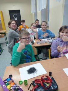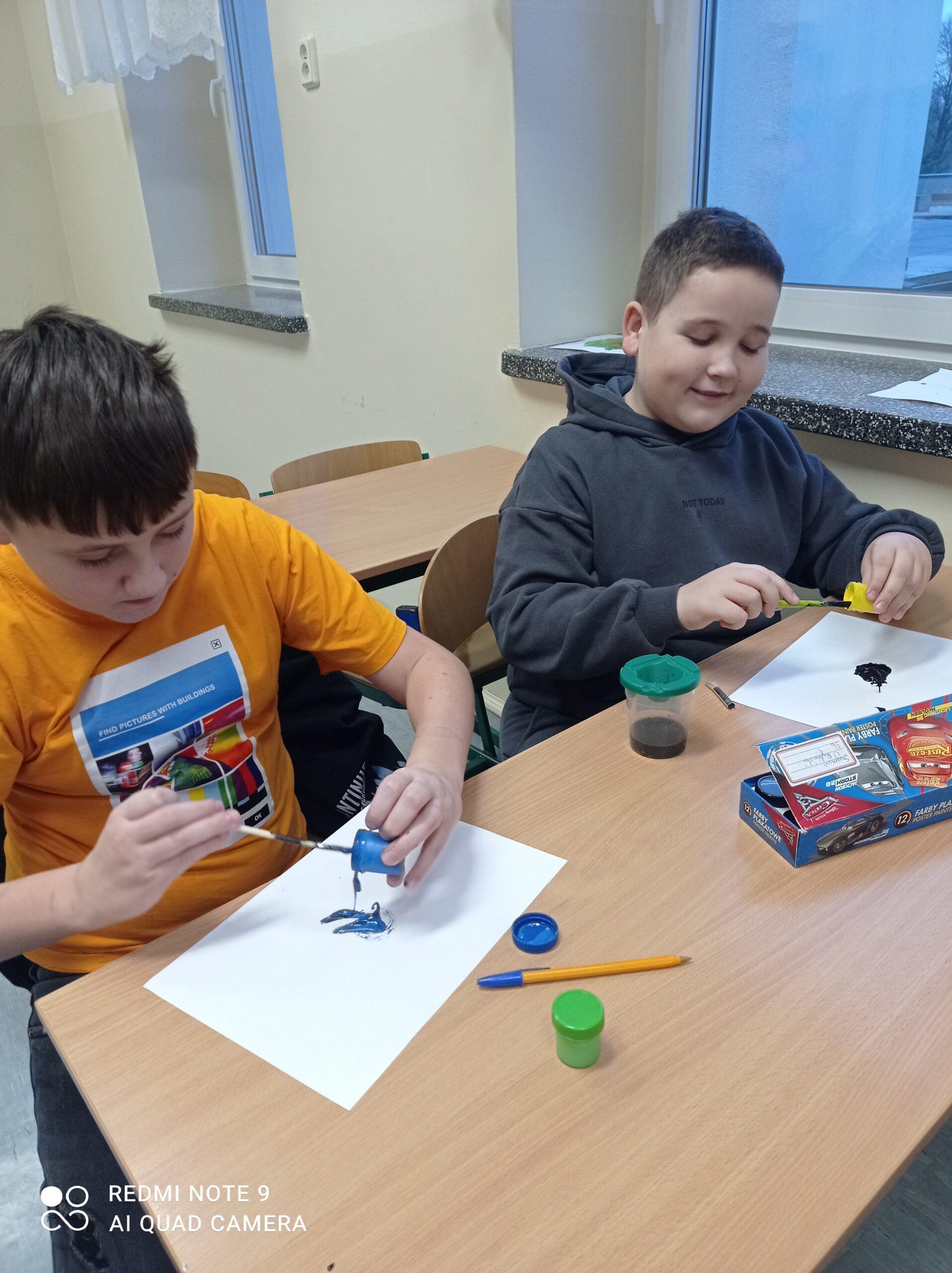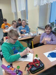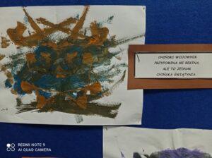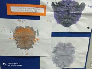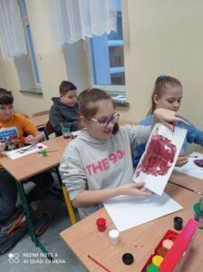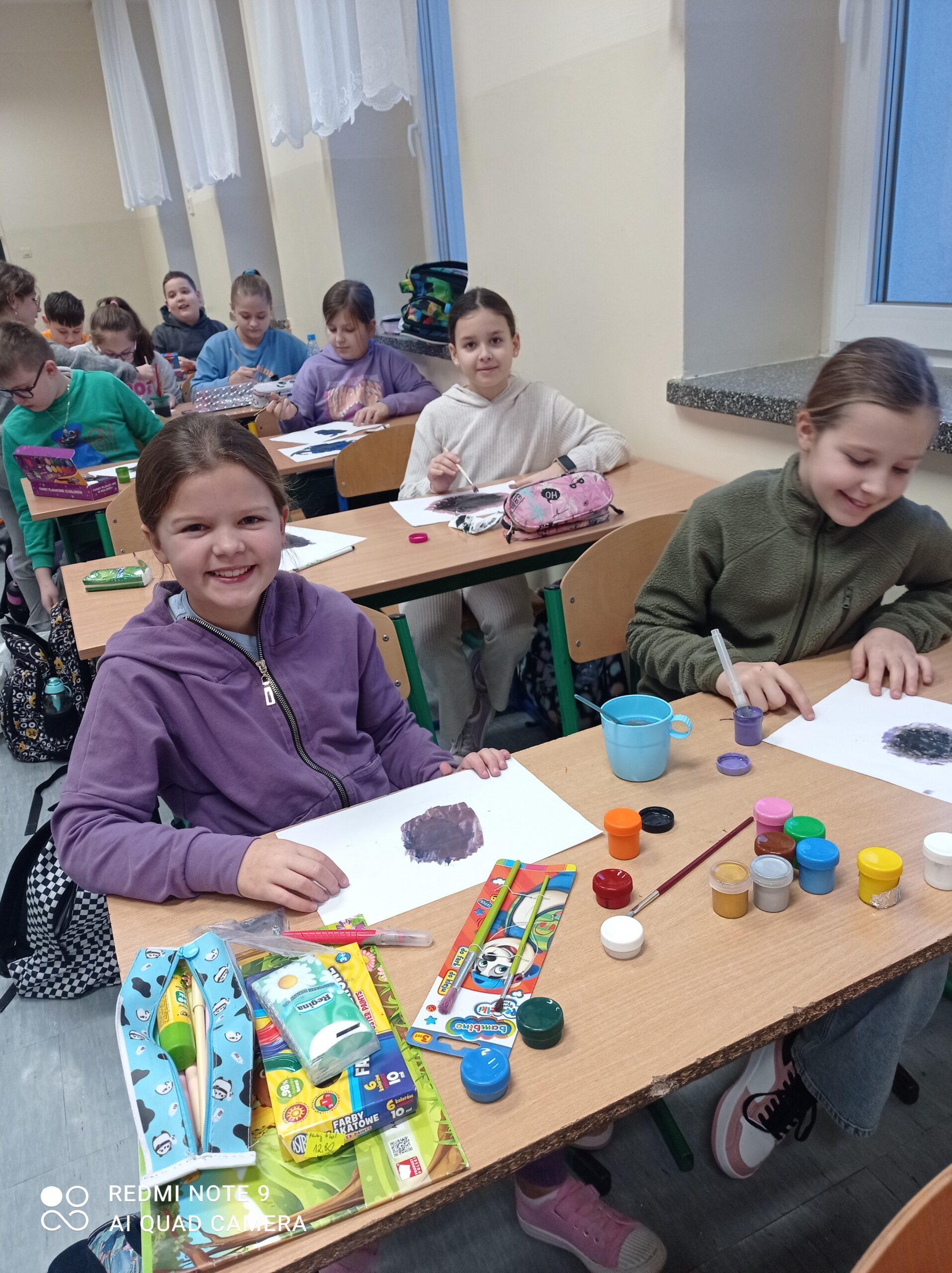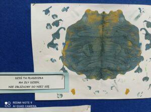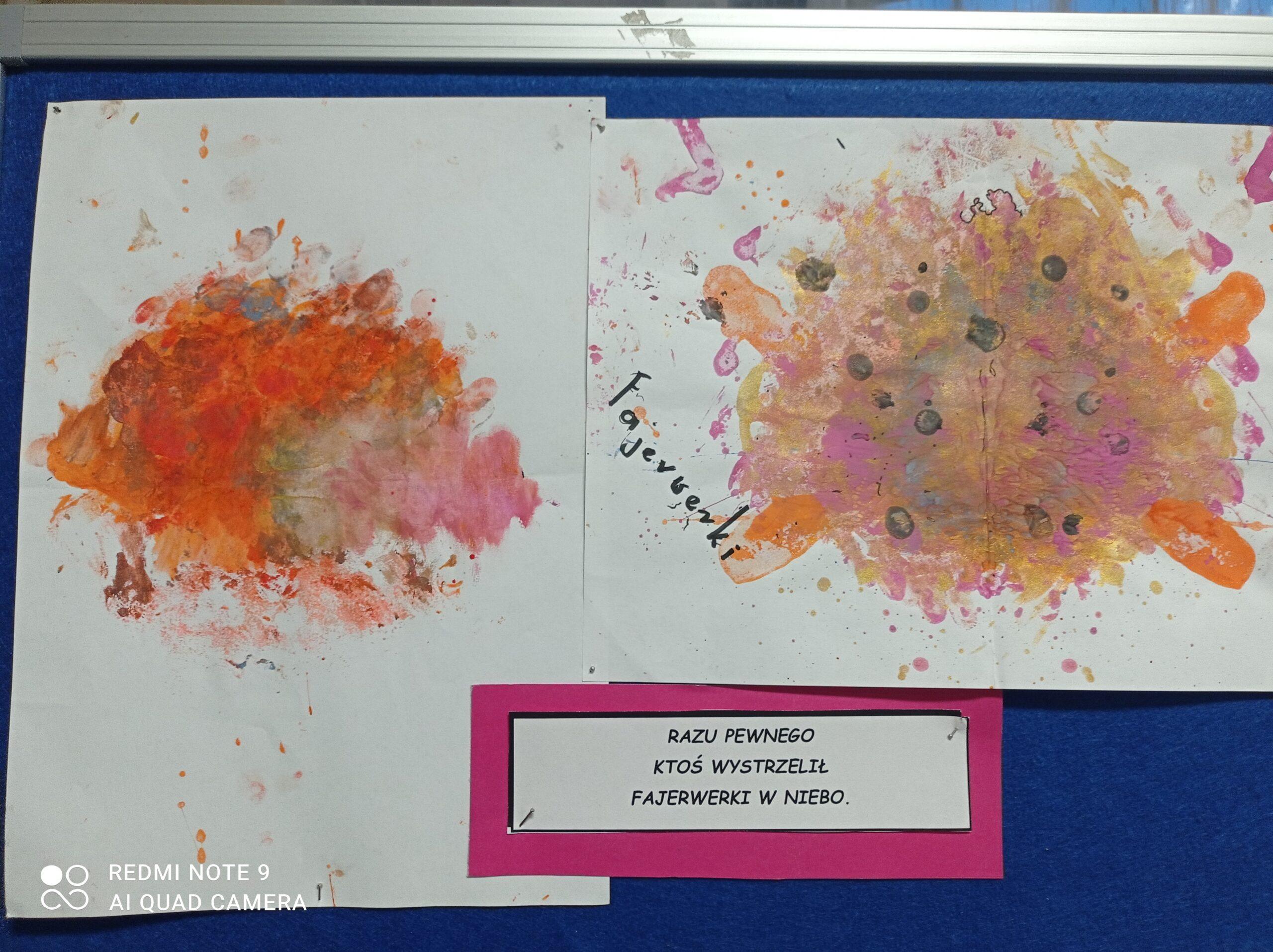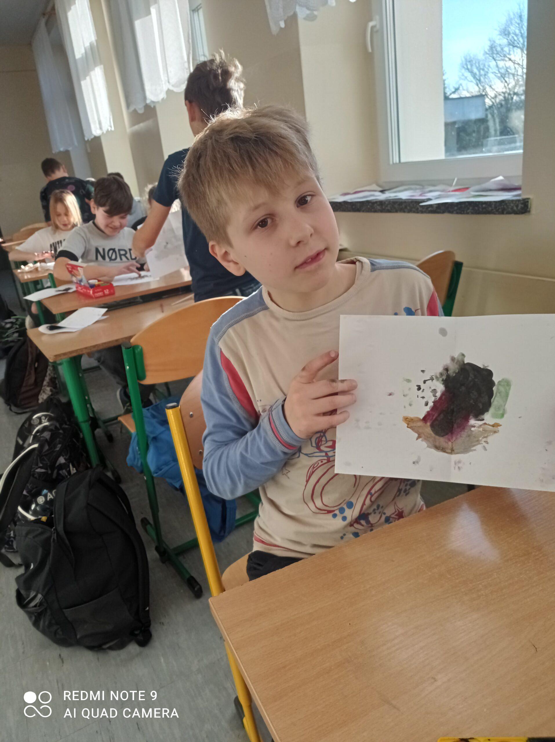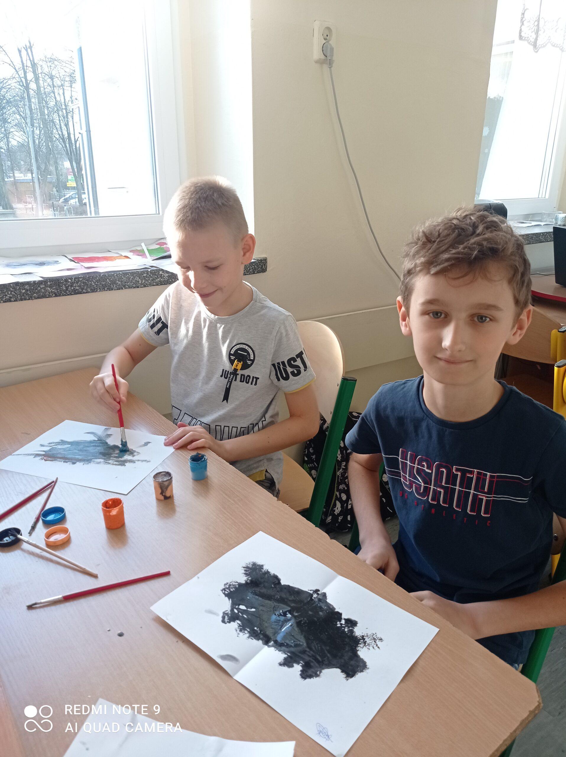 Po odczytaniu fragmentu książki uczniowie sformułowali przepis na kleksa, a następnie zabrali się do pracy. Pod kierunkiem nauczyciela j. polskiego czwartoklasiści wykonali piękne kleksy! Robili je na arkuszu papieru, który następnie składali na połowę i odczytywali różne historie z powstałych w ten sposób obrazków. Do niektórych wymyślali oryginalne rymowanki. Było niezwykle kolorowo i kreatywnie. Warto podkreślić, że każdy uczeń zdał egzamin z kleksografii celująco! Uczniowskie arcydzieła można zobaczyć na zdjęciach:
