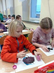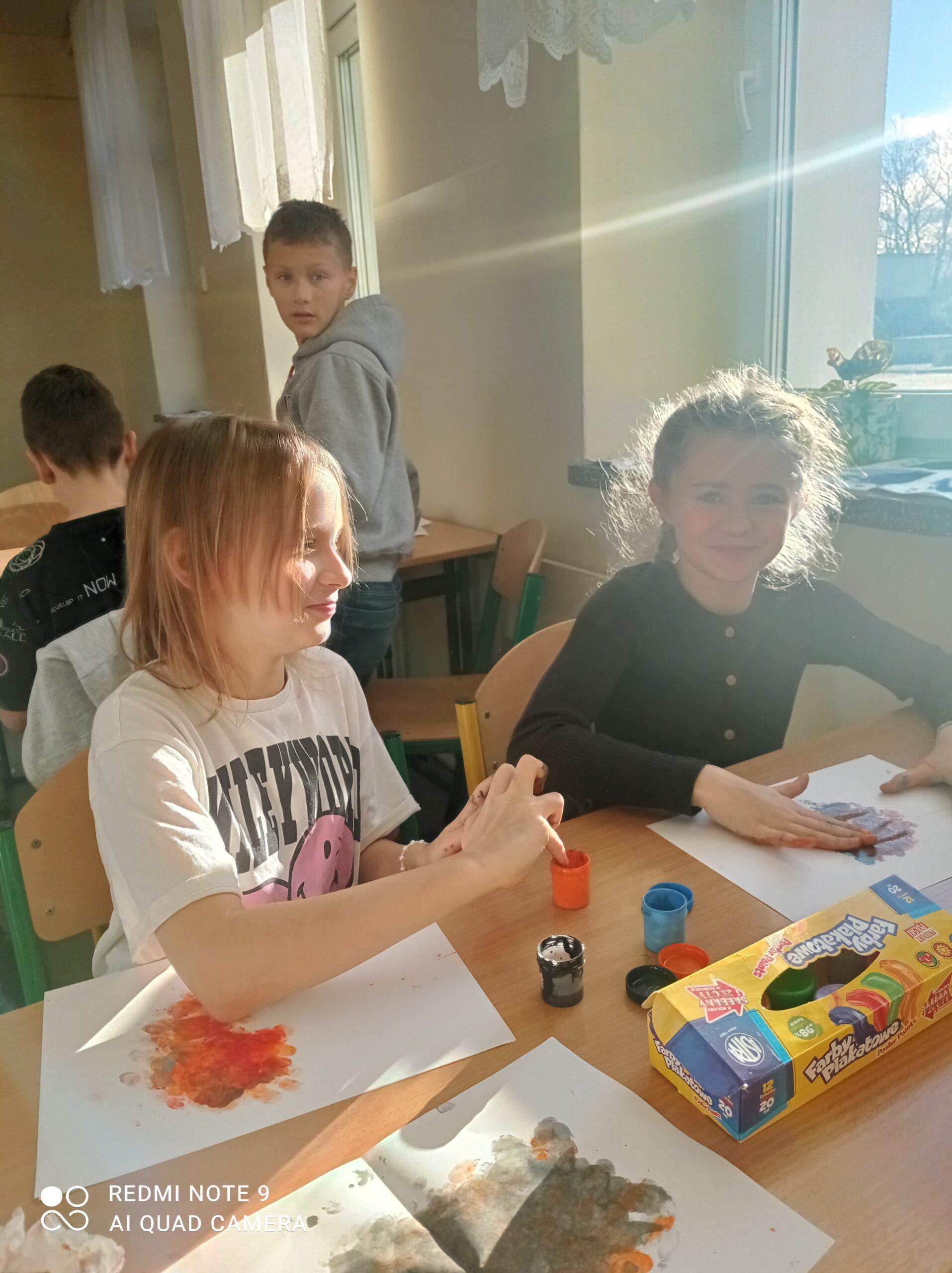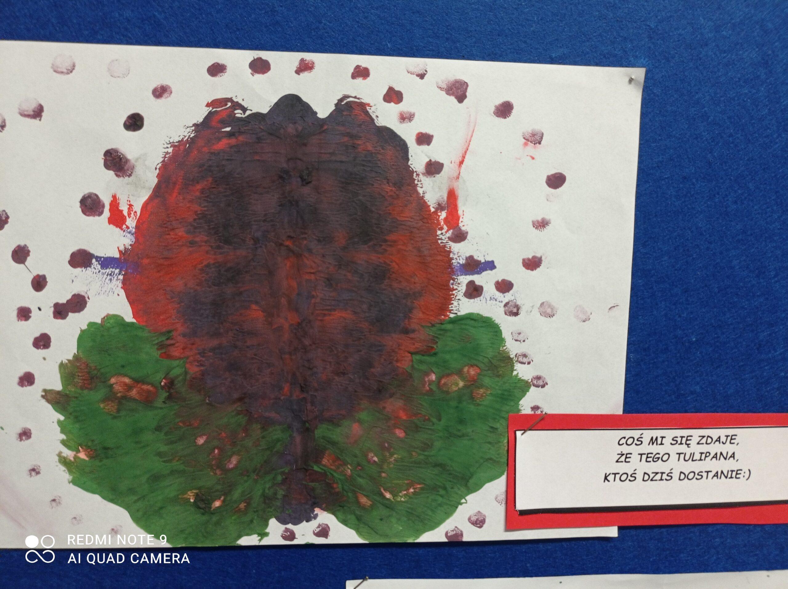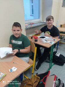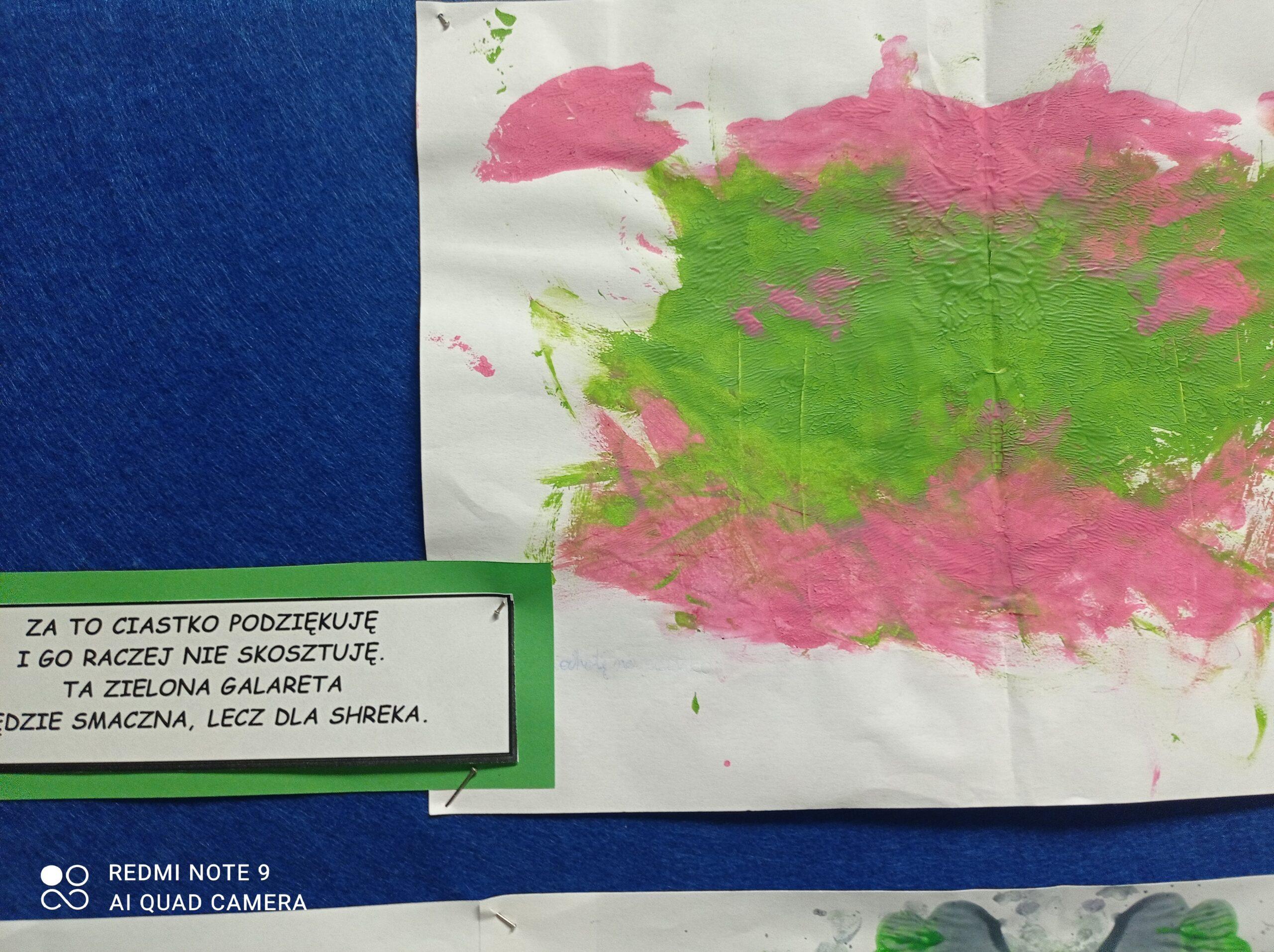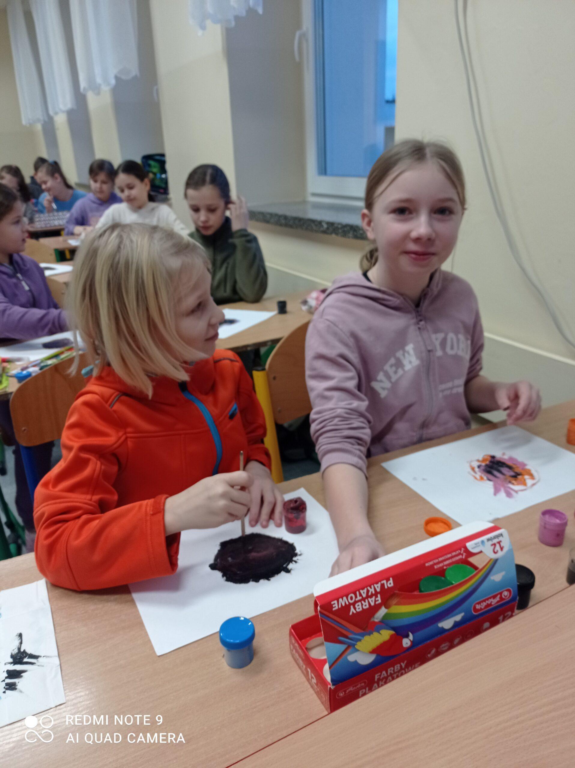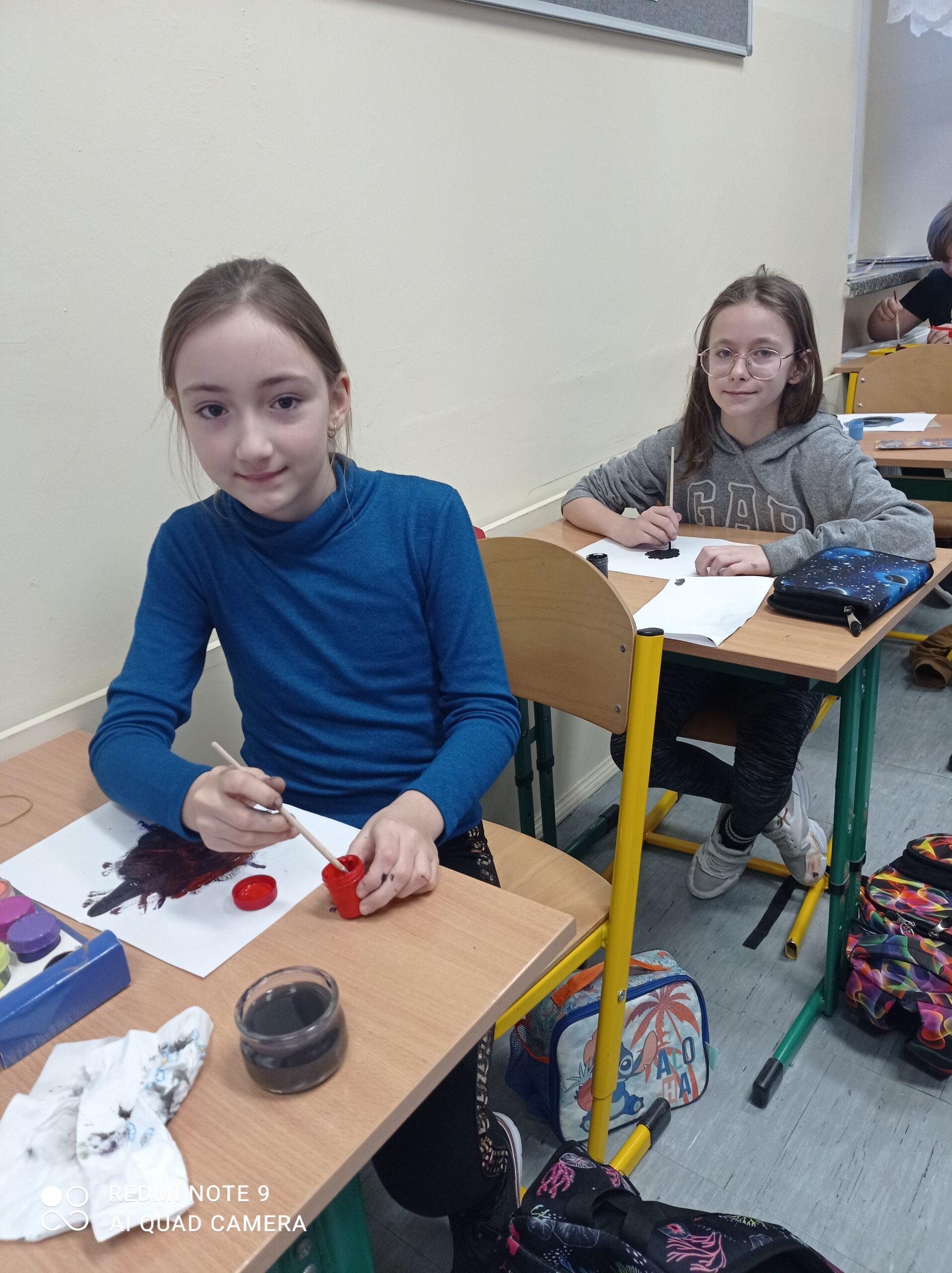 Po odczytaniu fragmentu książki uczniowie sformułowali przepis na kleksa, a następnie zabrali się do pracy. Pod kierunkiem nauczyciela j. polskiego czwartoklasiści wykonali piękne kleksy! Robili je na arkuszu papieru, który następnie składali na połowę i odczytywali różne historie z powstałych w ten sposób obrazków. Do niektórych wymyślali oryginalne rymowanki. Było niezwykle kolorowo i kreatywnie. Warto podkreślić, że każdy uczeń zdał egzamin z kleksografii celująco! Uczniowskie arcydzieła można zobaczyć na zdjęciach: