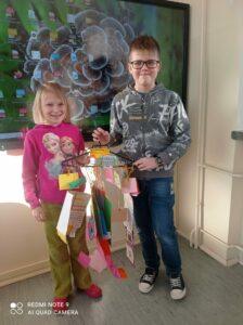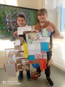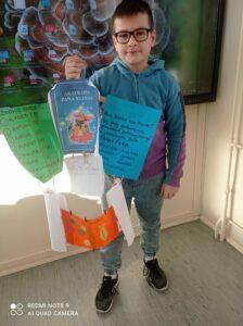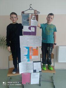 „Lektura na wieszaku” to ciekawa metoda aktywizująca, dzięki której można zebrać informacje o książce (np. o bohaterach, miejscach i czasie akcji, problematyce czy narracji) w nietypowej formie i umieścić je na wieszaku, który staje się dzięki temu „mobilnym” kompendium wiedzy. Podczas realizacji projektu uczniowie wykazali się niezwykłą kreatywnością i zaangażowaniem. Tworzyli teksty, rysunki, krzyżówki, zdjęcia i inne elementy, które umieszczali później na wieszakach. Po wykonaniu ciekawych form czwartoklasiści doskonalili umiejętność wystąpień publicznych, prezentując wszystkim swoje prace. Nowa, innowacyjna formuła omówienia lektury przypadła dzieciom do gustu i zapewne wpłynie na lepsze zapamiętanie problematyki utworu. Zapraszam do galerii niesamowitych prac!