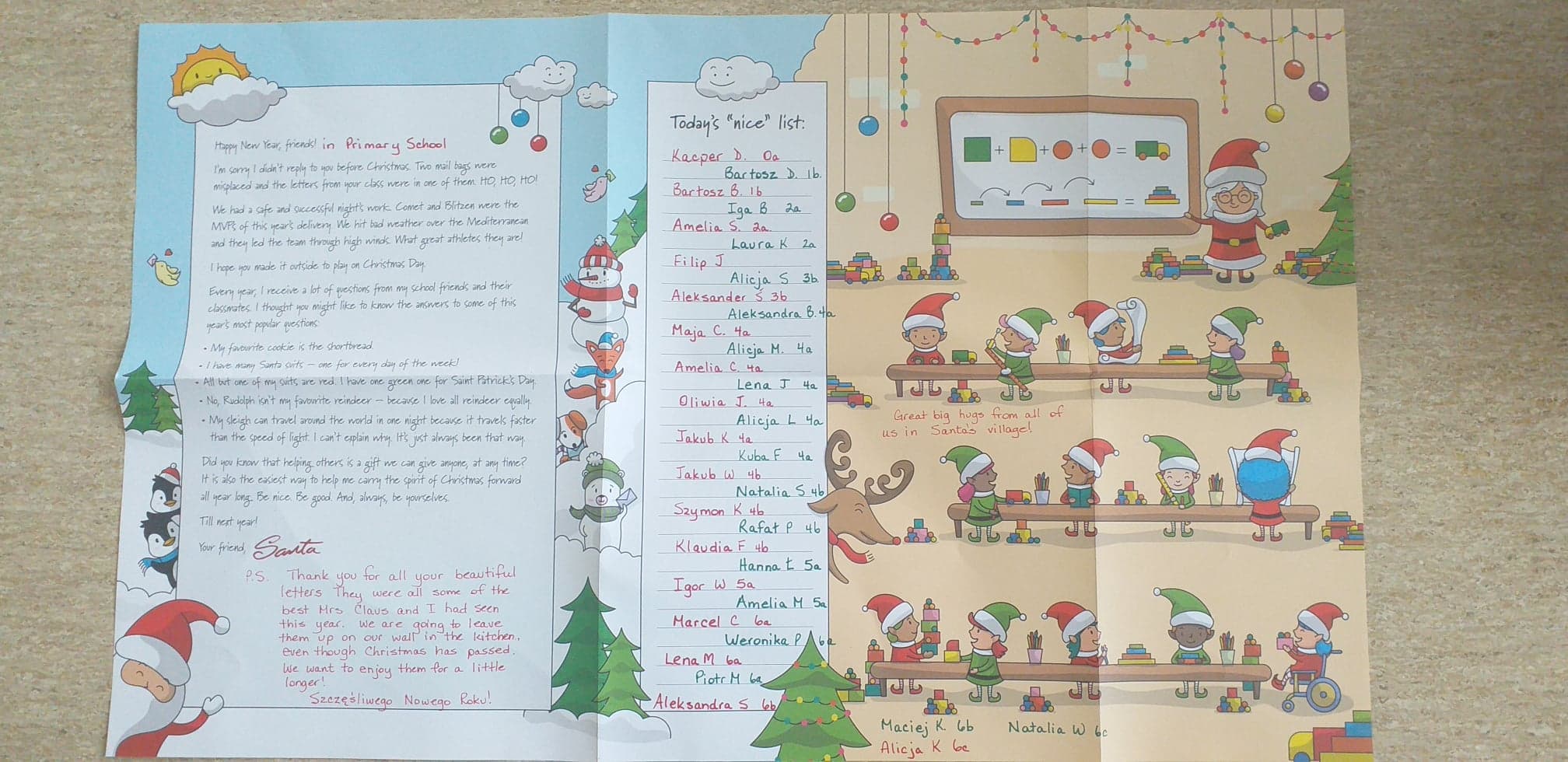 Oto dziś nadeszła wyczekiwana odpowiedz:) Św. Mikołaj podziękował za piękne listy ( podobno nadal zdobią one kuchnię Pani Mikołajowej:), odpowiedział na najczęściej zadawane przez uczniów pytania i życzył nam wszystkim Szczęśliwego Nowego Roku. (Oryginalny list można zobaczyć w gablocie językowej).