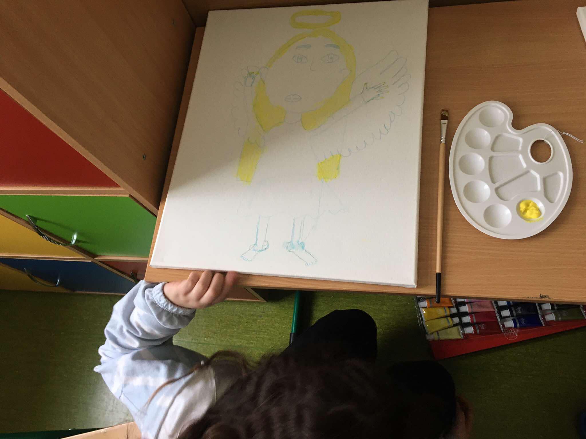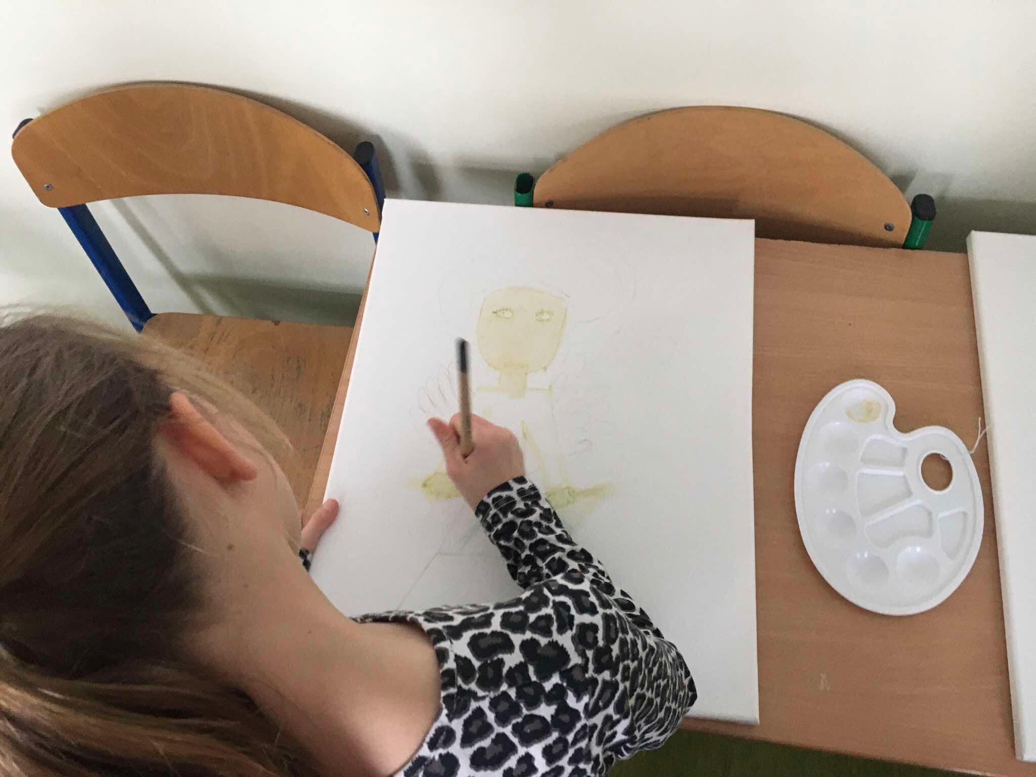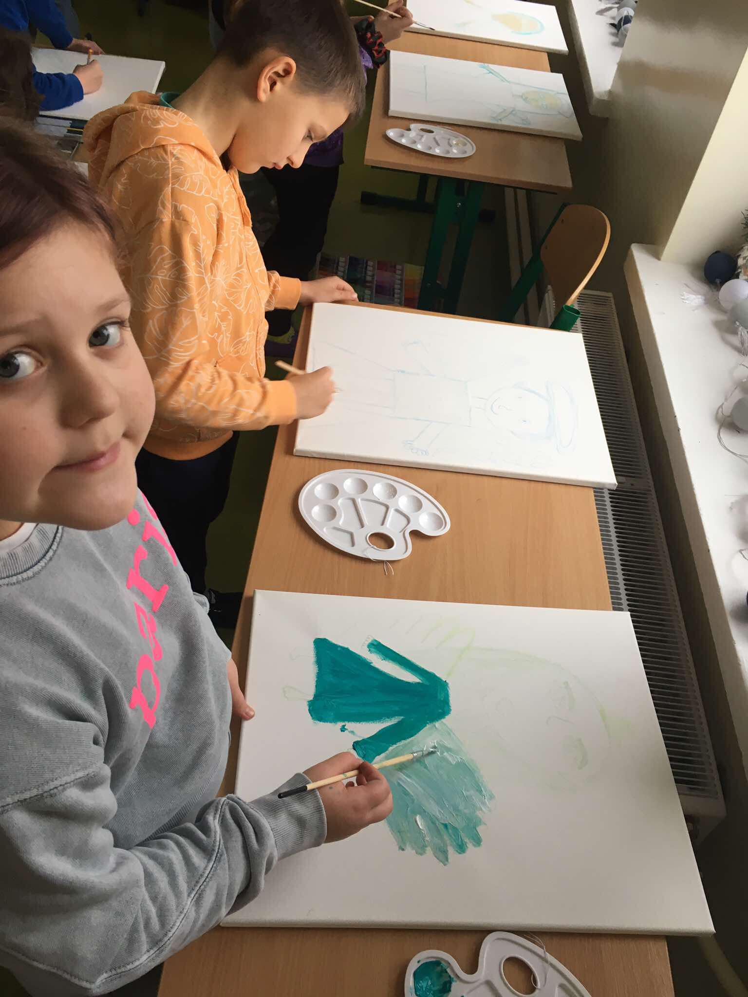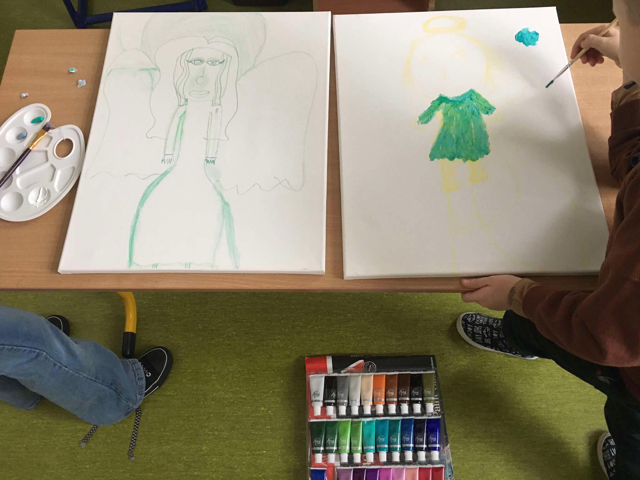 Zwykły dzień na zajęciach rozwijających zainteresowania i uzdolnienia uczniów, plastyka dla klas 1-3. Malarstwo akrylowe na płótnie „Anioł”. Zajęcia prowadzi Ewa Banaszczyk.