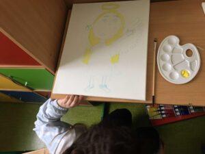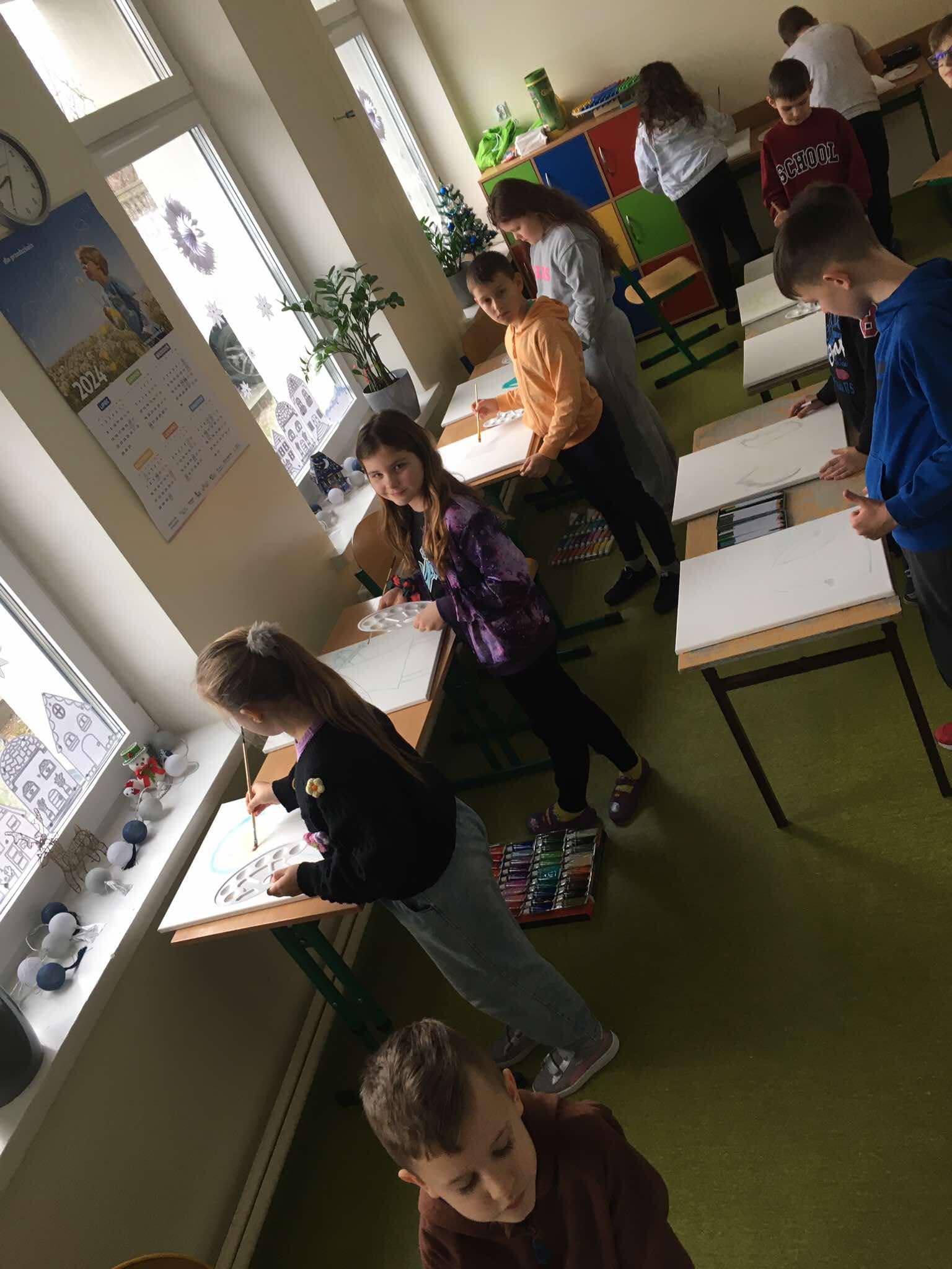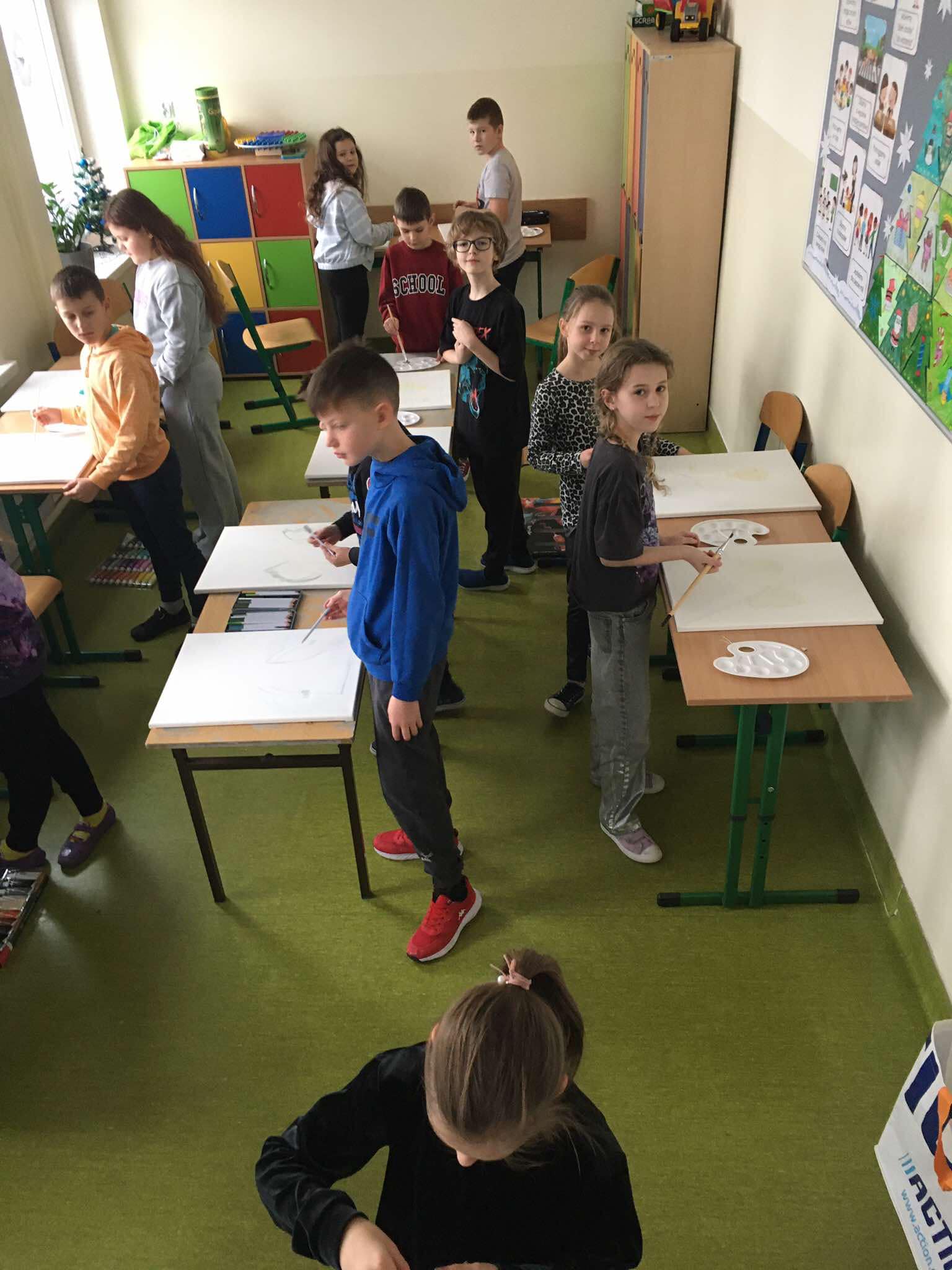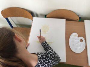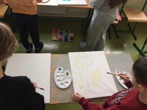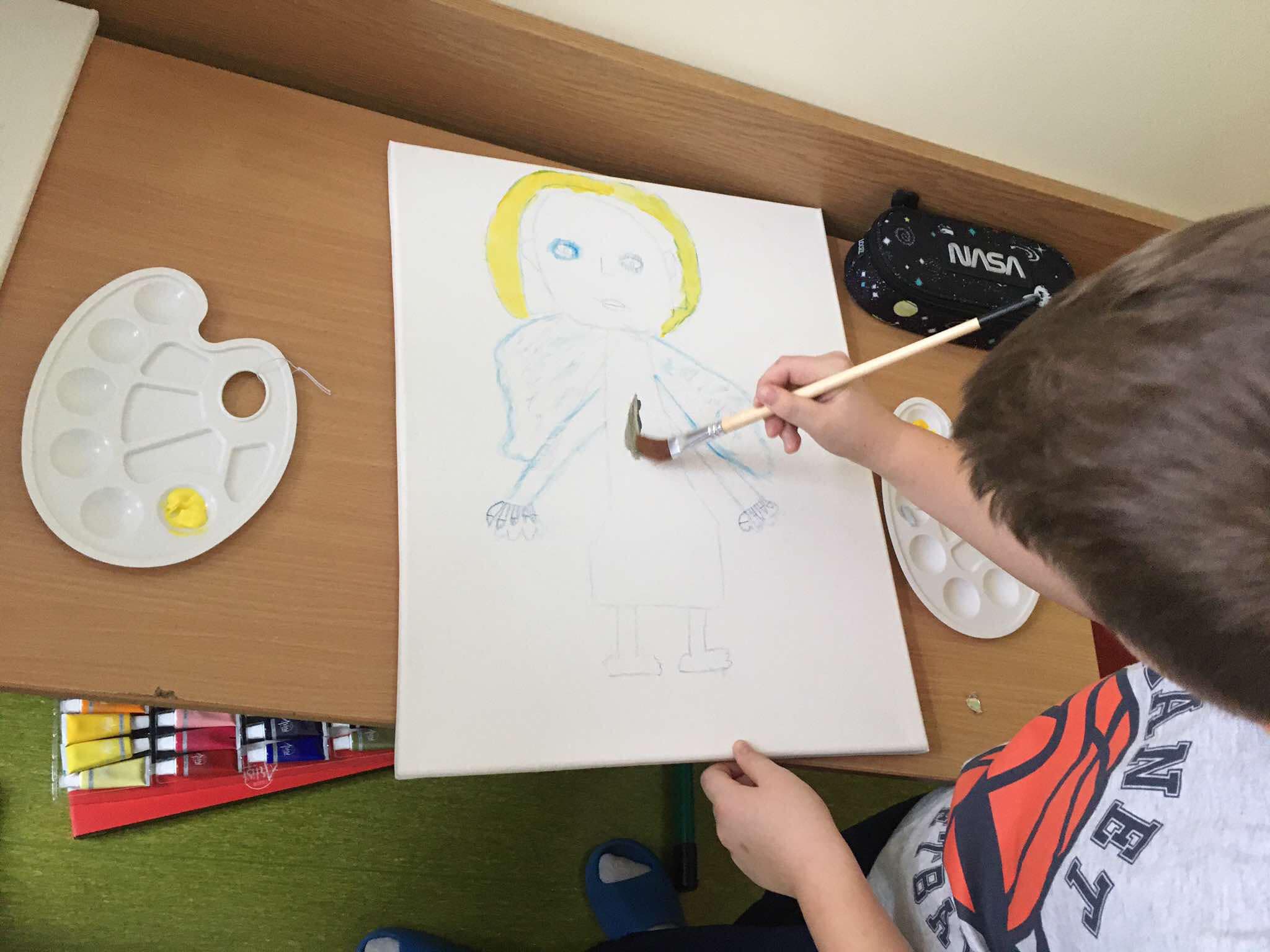 Zwykły dzień na zajęciach rozwijających zainteresowania i uzdolnienia uczniów, plastyka dla klas 1-3. Malarstwo akrylowe na płótnie „Anioł”. Zajęcia prowadzi Ewa Banaszczyk.