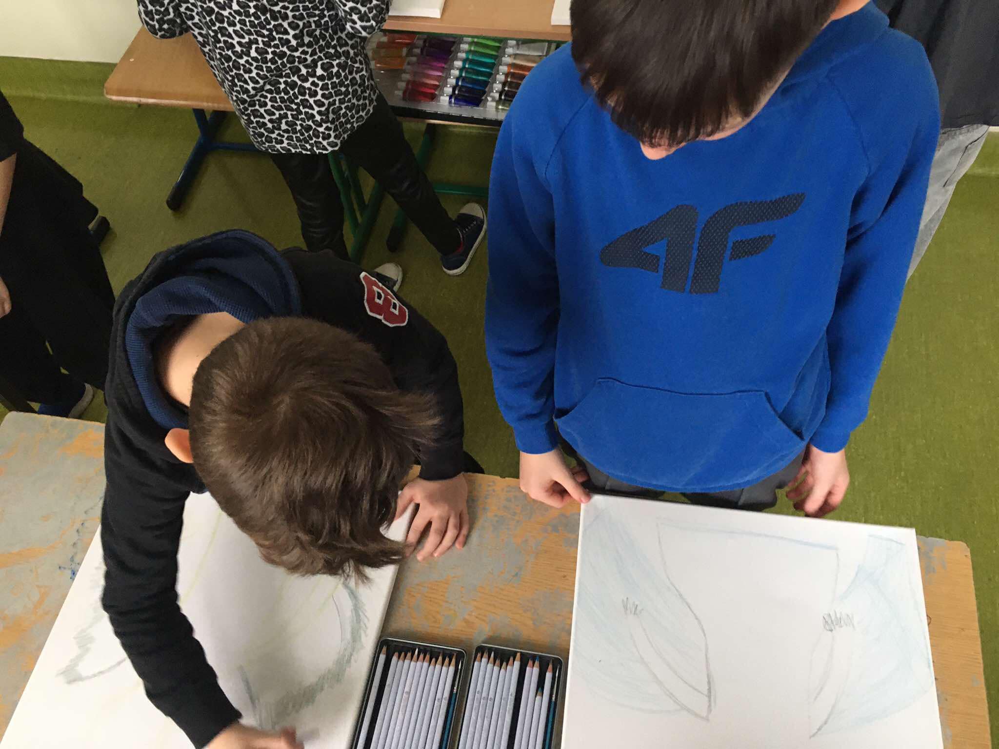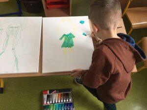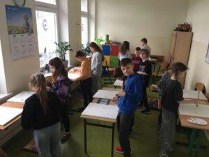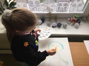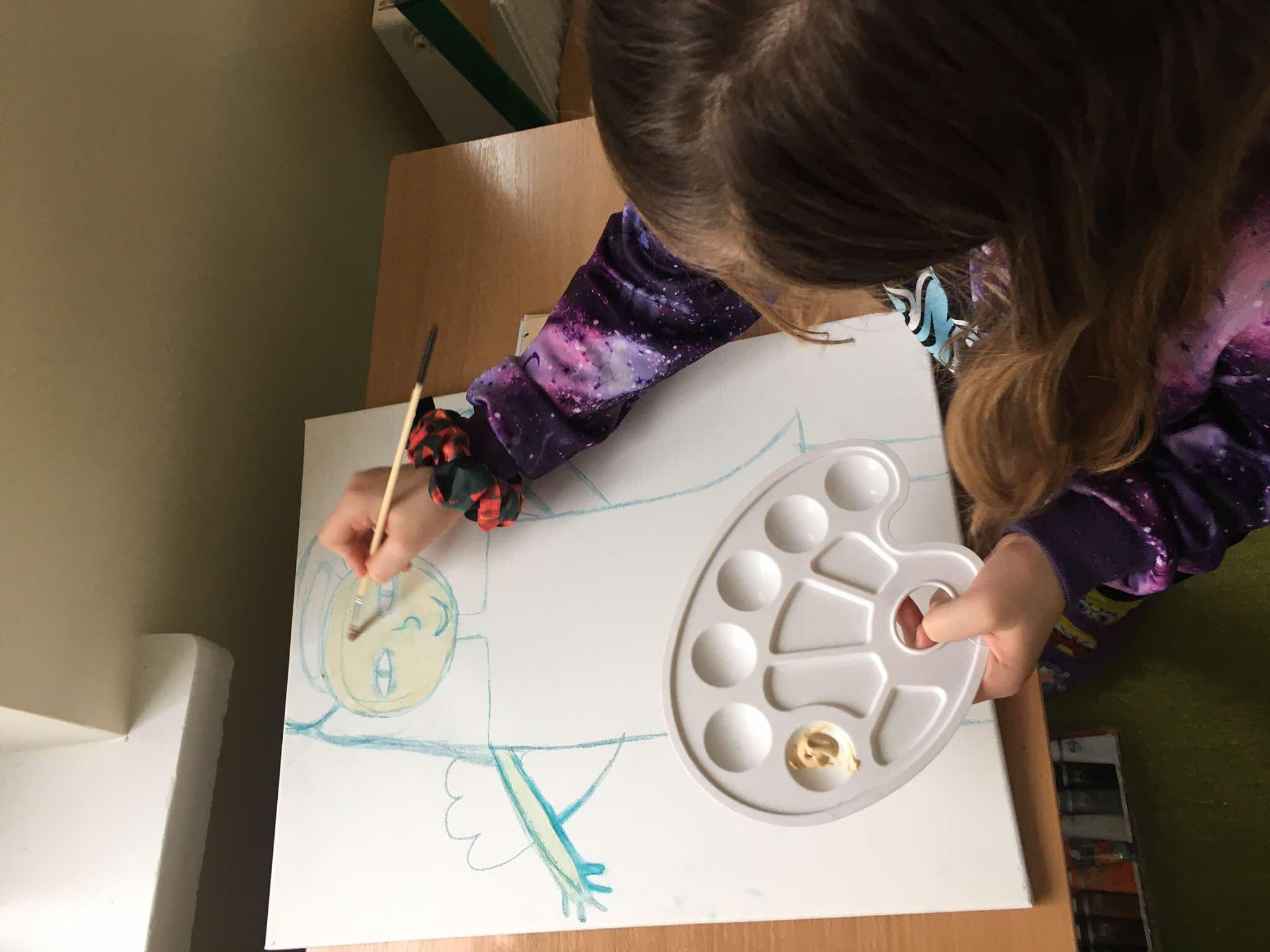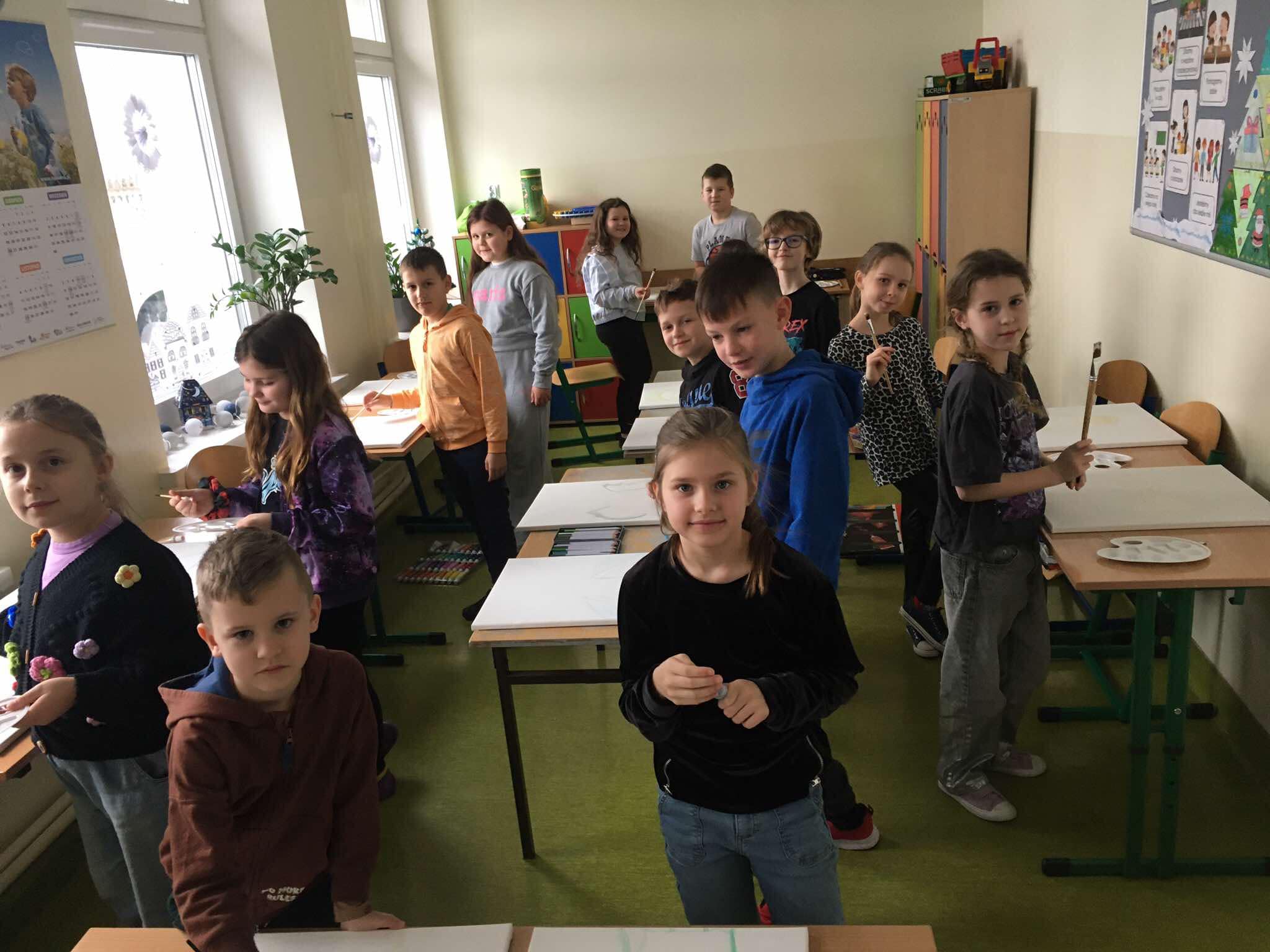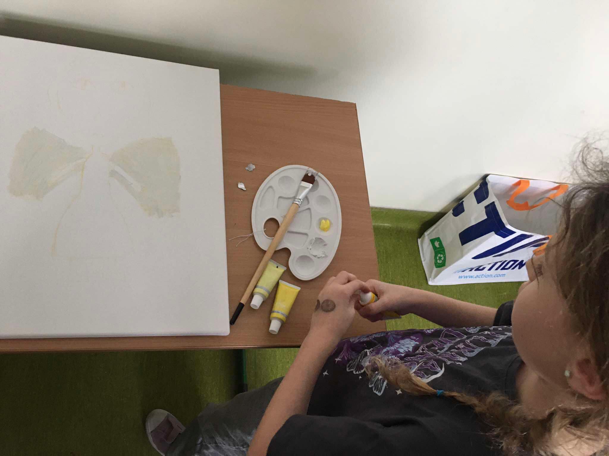 Zwykły dzień na zajęciach rozwijających zainteresowania i uzdolnienia uczniów, plastyka dla klas 1-3. Malarstwo akrylowe na płótnie „Anioł”. Zajęcia prowadzi Ewa Banaszczyk.