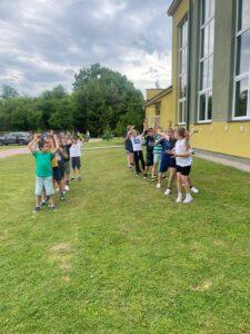 • Rzuty w parach – rzucanie lewą ręką i łapanie prawą, co ćwiczyło orientację i refleks.