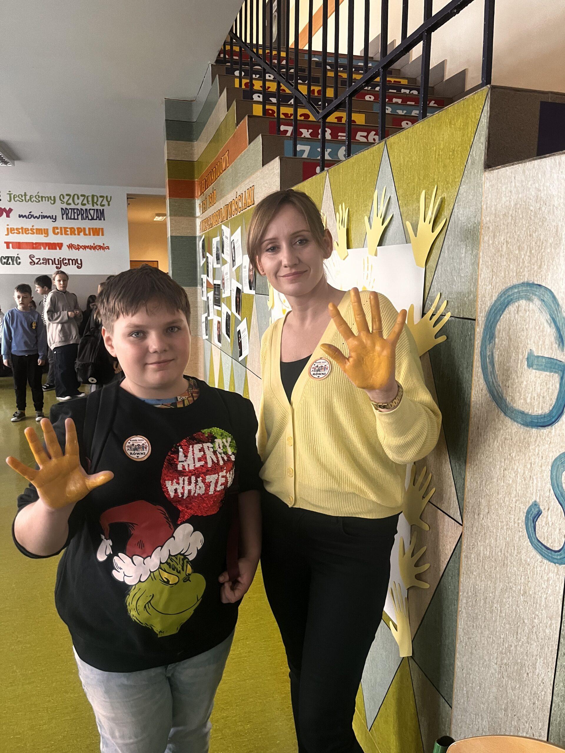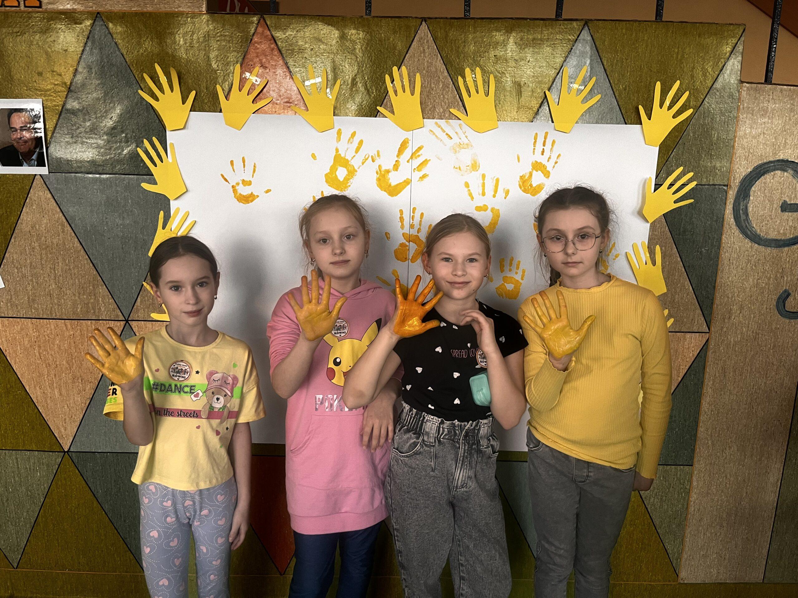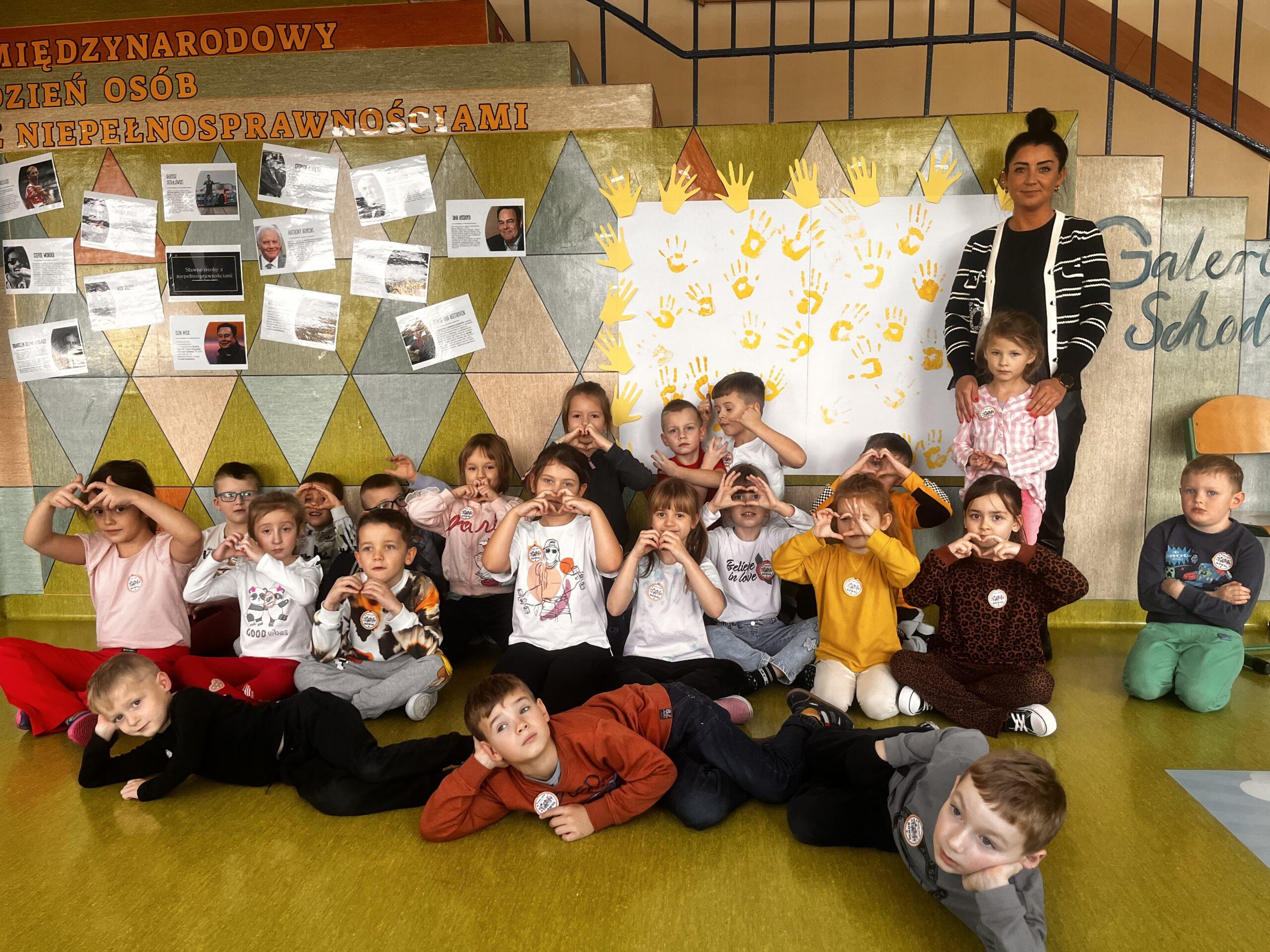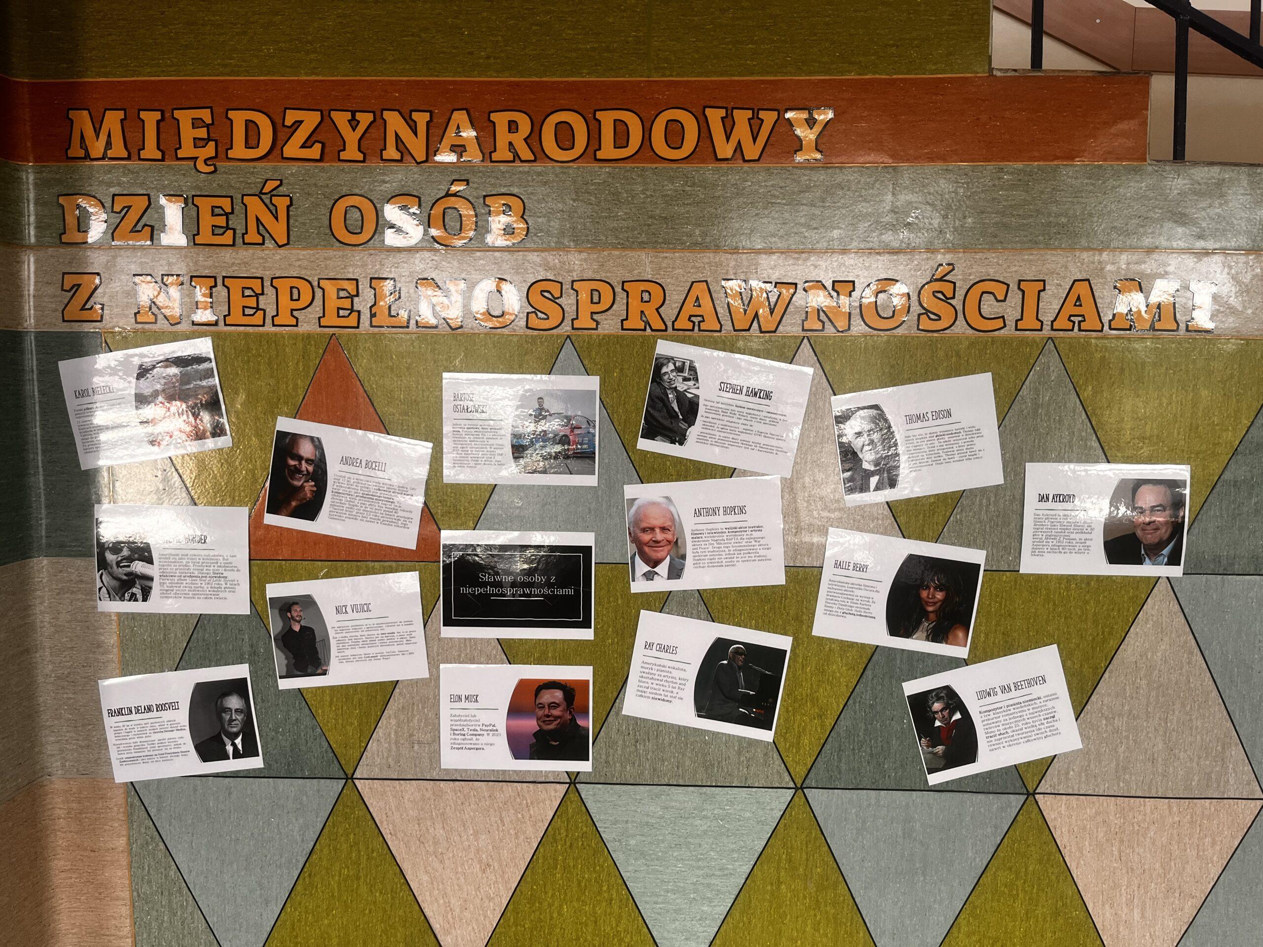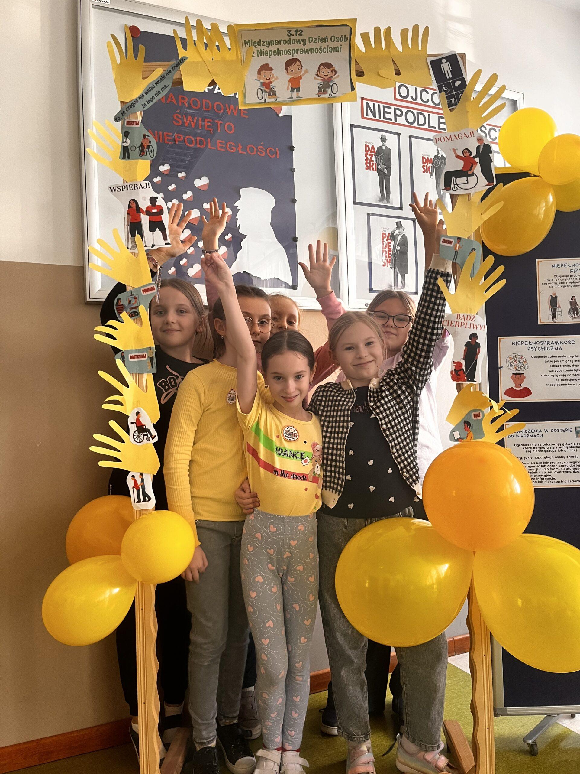 3 grudnia 2024 roku w naszej szkole obchodziliśmy Międzynarodowy Dzień Osób Niepełnosprawnych. Z tej okazji nauczyciele współorganizujący przygotowali na szkolnym korytarzu kolorową gazetkę informacyjną. Znalazły się w niej fakty, dotyczące znanych oraz wybitnych osób niepełnosprawnych, które miały wpływ na naukę, sztukę, kulturę oraz rozwój inżynierii. Uczniowie mogli zapoznać się z ciekawostkami na temat wybranych osób, a następnie w duchu solidarności kolorowali obrazki o tematyce związanej z tym dniem. Wraz z nauczycielami odciskali na brystolu swoje dłonie w kolorze żółtym na znak wsparcia i akceptacji wobec osób z niepełnosprawnościami.