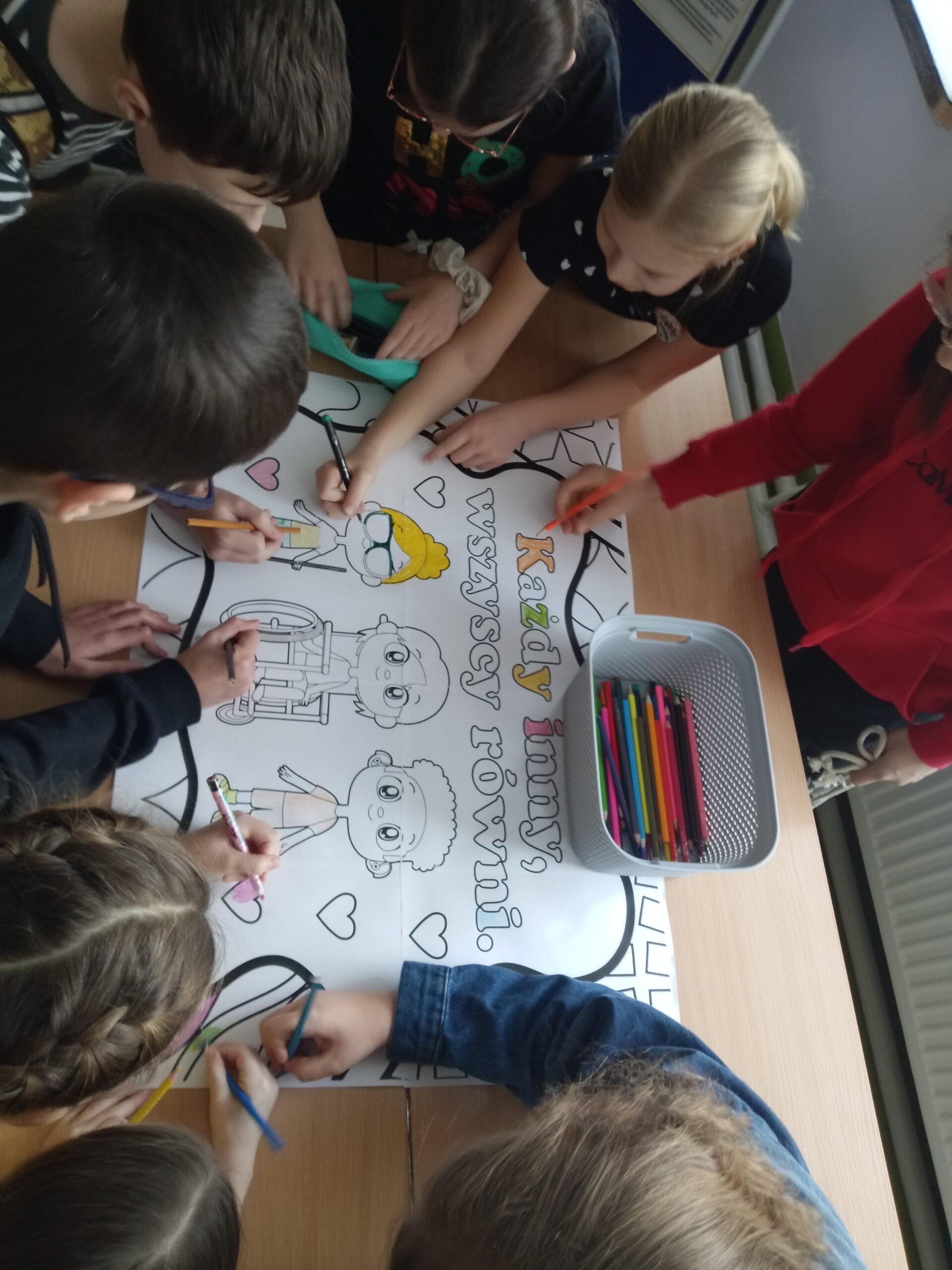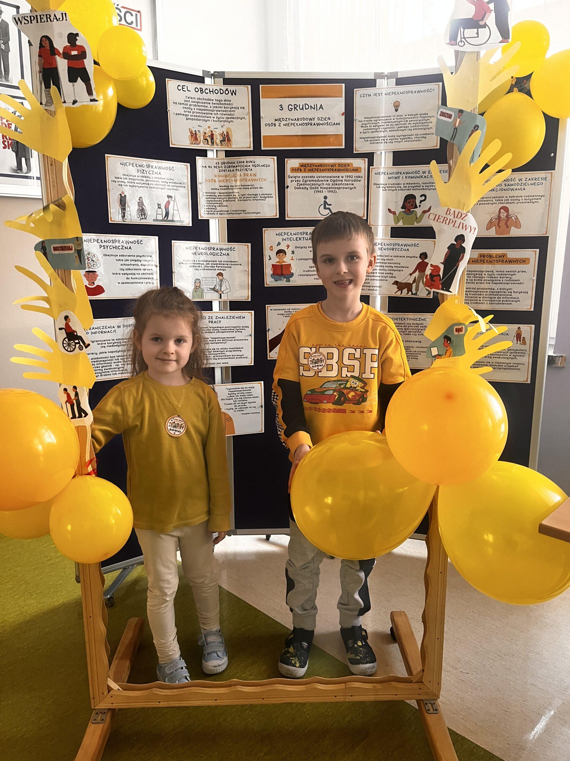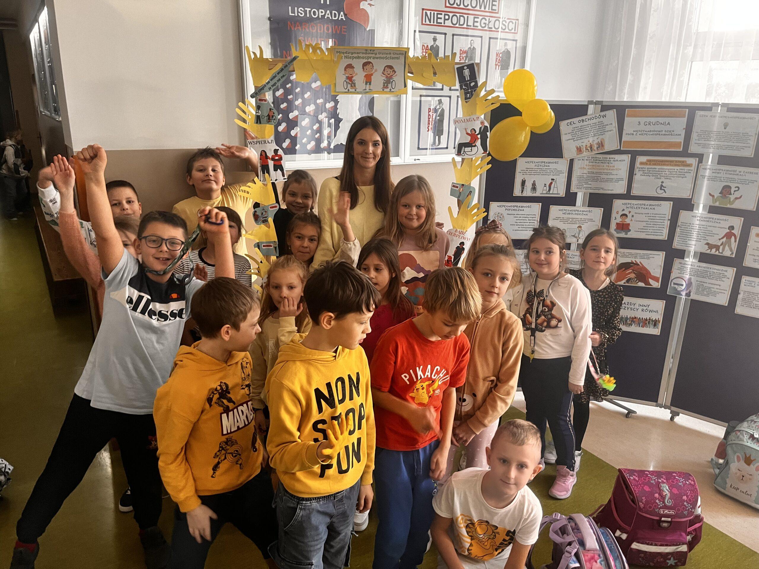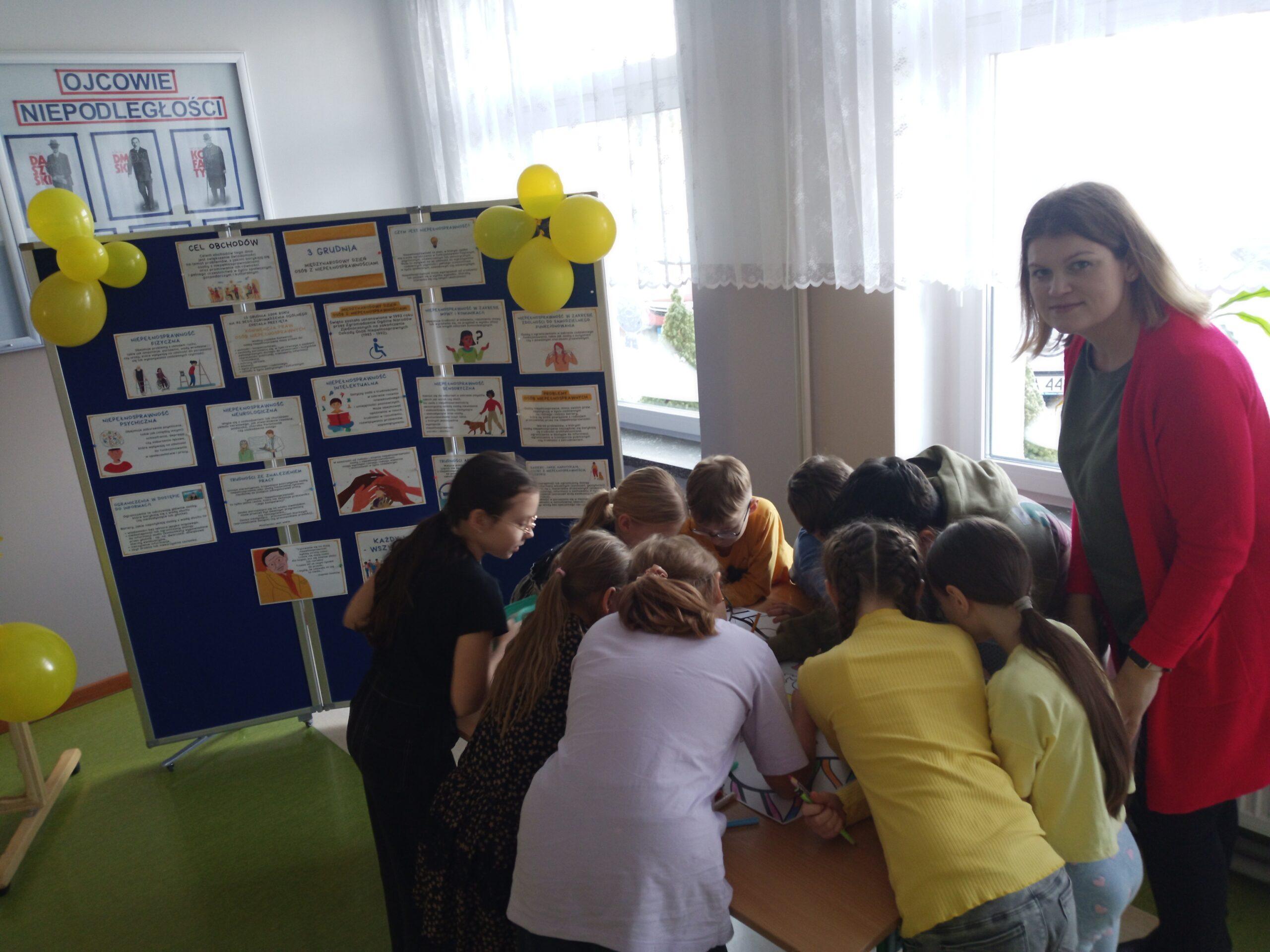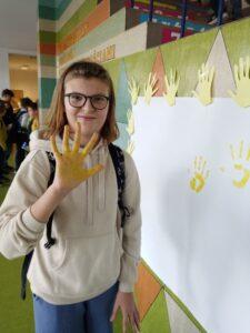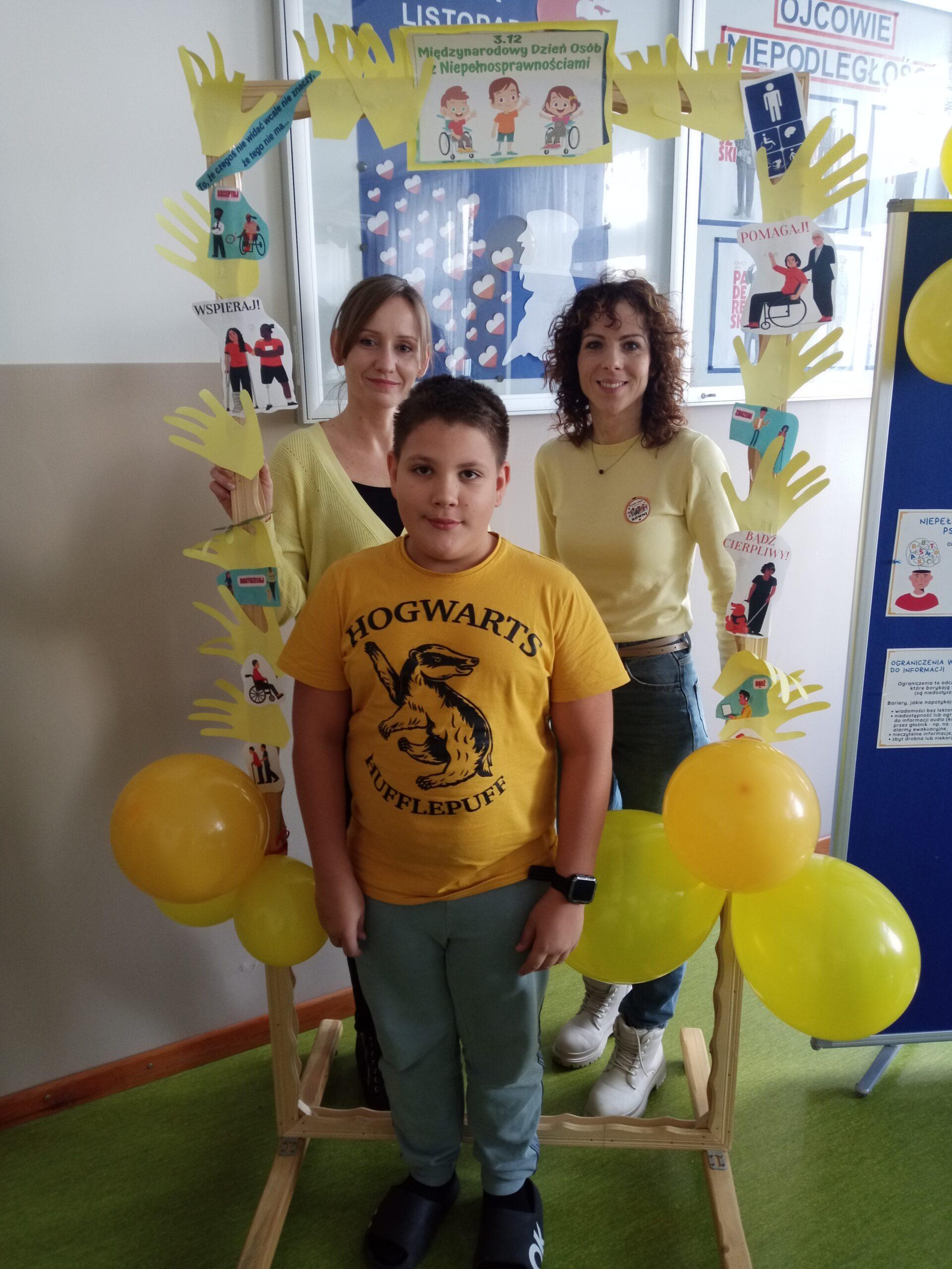 3 grudnia 2024 roku w naszej szkole obchodziliśmy Międzynarodowy Dzień Osób Niepełnosprawnych. Z tej okazji nauczyciele współorganizujący przygotowali na szkolnym korytarzu kolorową gazetkę informacyjną. Znalazły się w niej fakty, dotyczące znanych oraz wybitnych osób niepełnosprawnych, które miały wpływ na naukę, sztukę, kulturę oraz rozwój inżynierii. Uczniowie mogli zapoznać się z ciekawostkami na temat wybranych osób, a następnie w duchu solidarności kolorowali obrazki o tematyce związanej z tym dniem. Wraz z nauczycielami odciskali na brystolu swoje dłonie w kolorze żółtym na znak wsparcia i akceptacji wobec osób z niepełnosprawnościami.