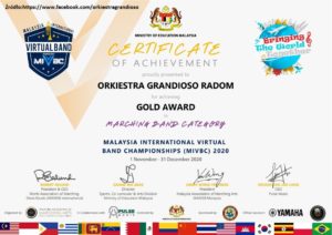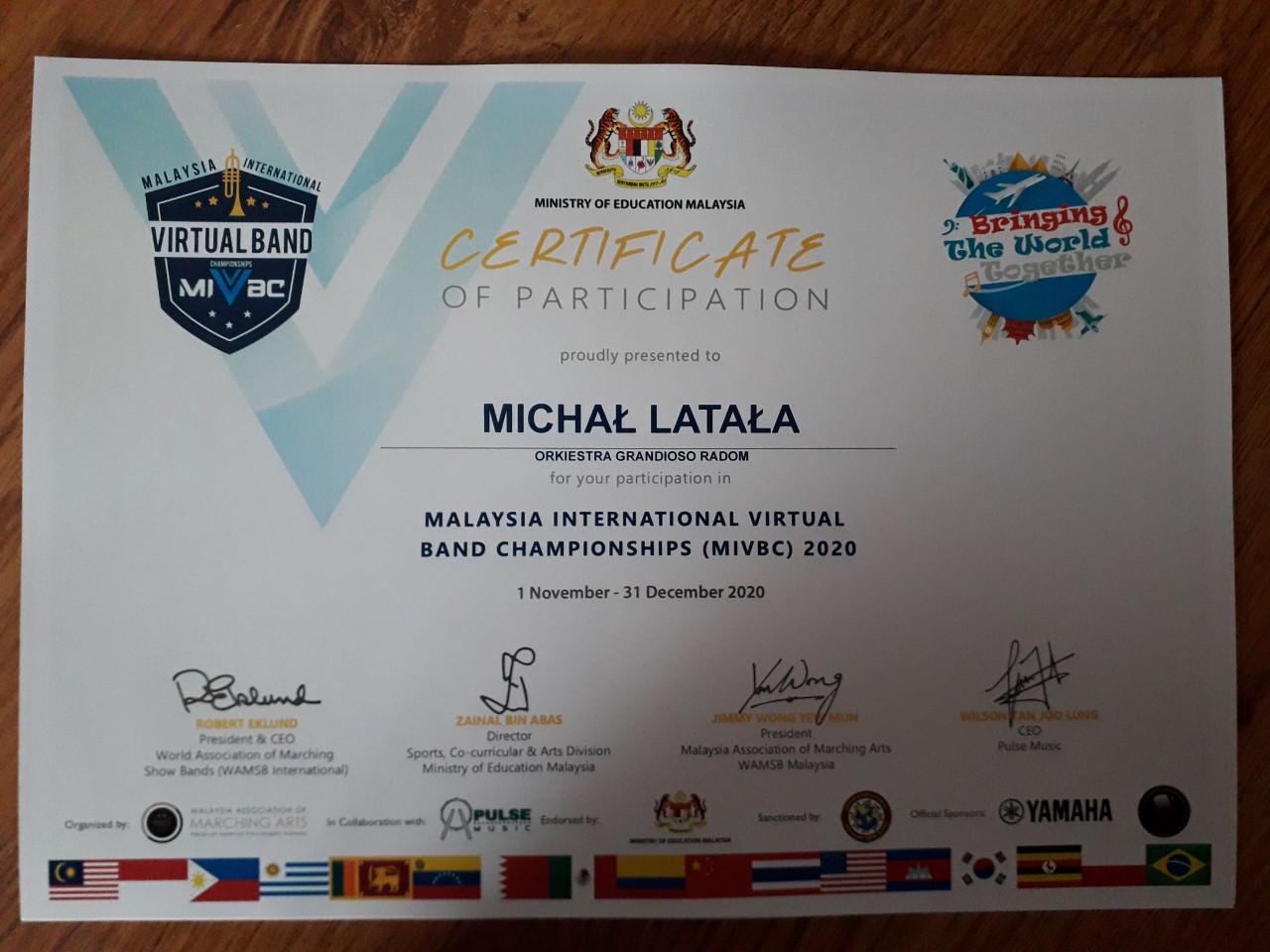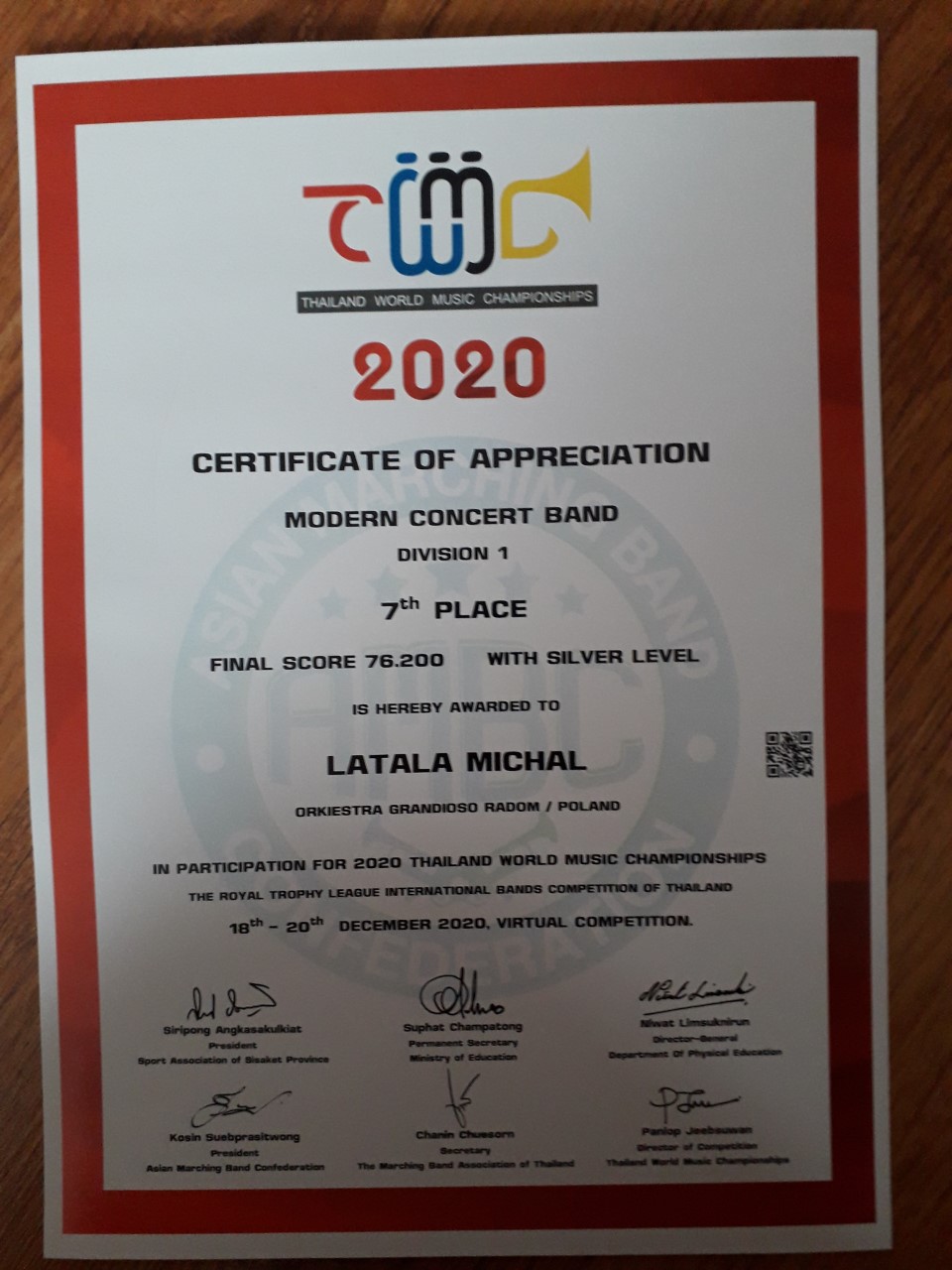 Miło nam poinformować, że uczeń klasy VIII a- Michał Latała wraz z orkiestrą „Grandioso” zdobył srebrny medal w Mistrzostwach Świata Orkiestr Dętych w Tajlandii oraz złoty medal w Międzynarodowym Konkursie Orkiestr Dętych w Malezji.