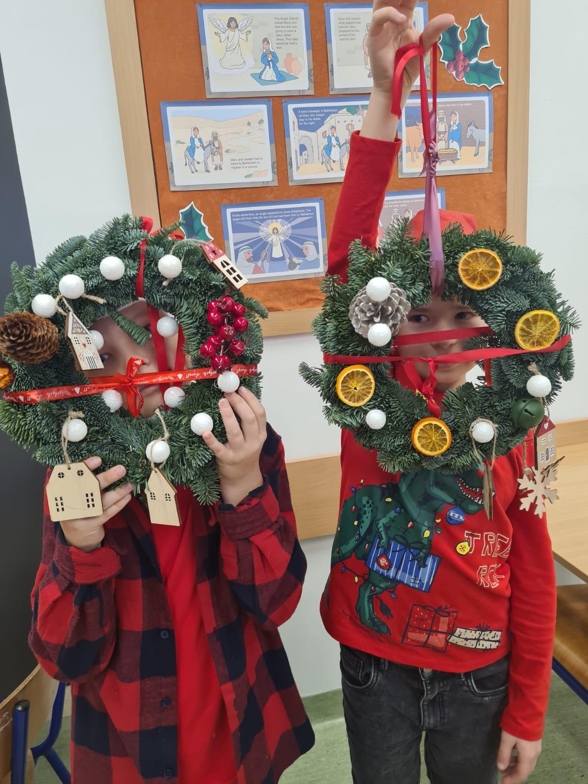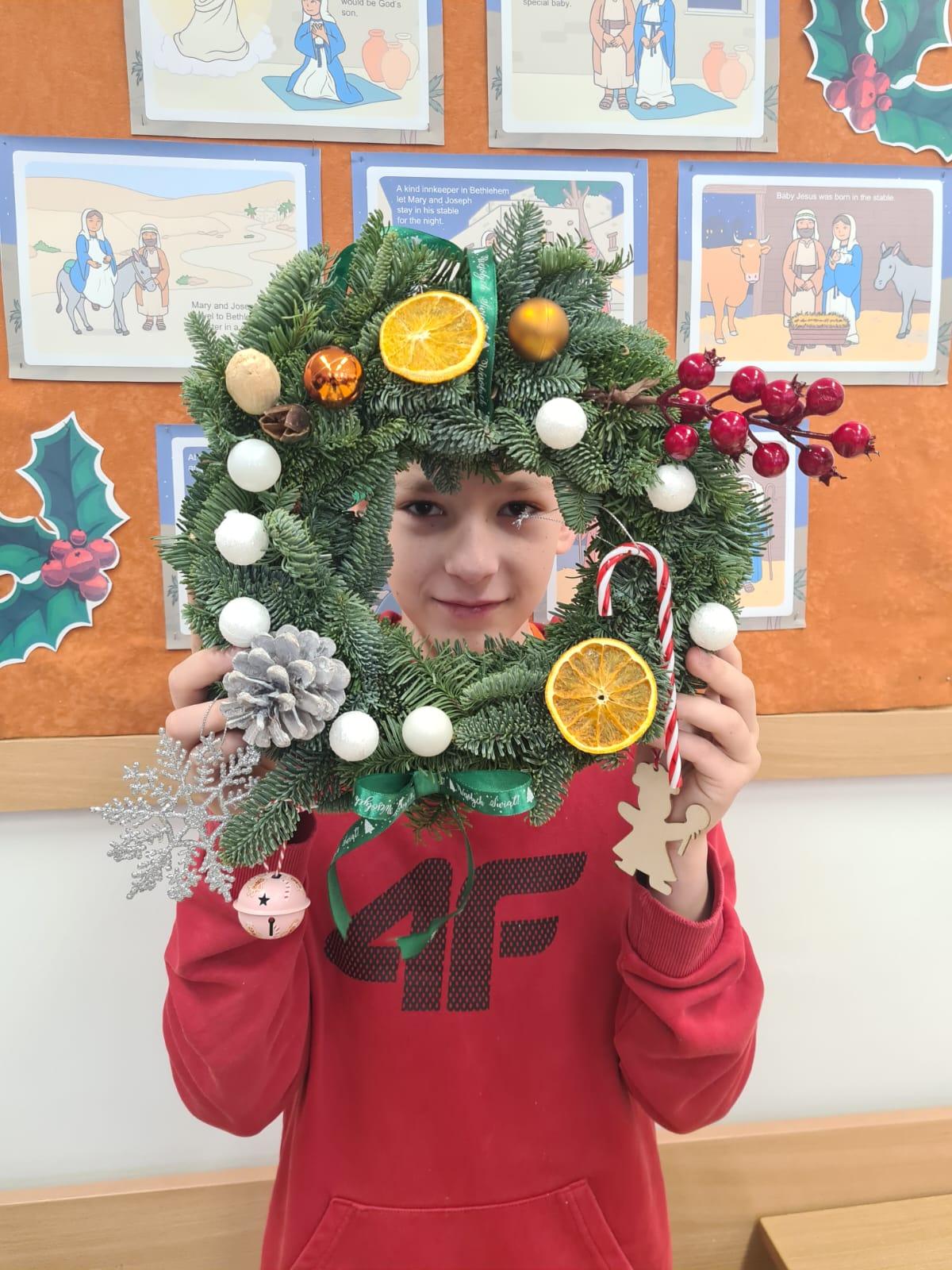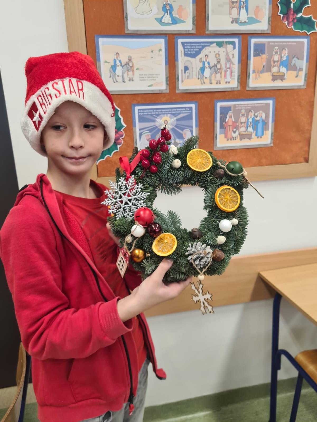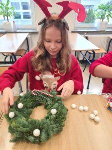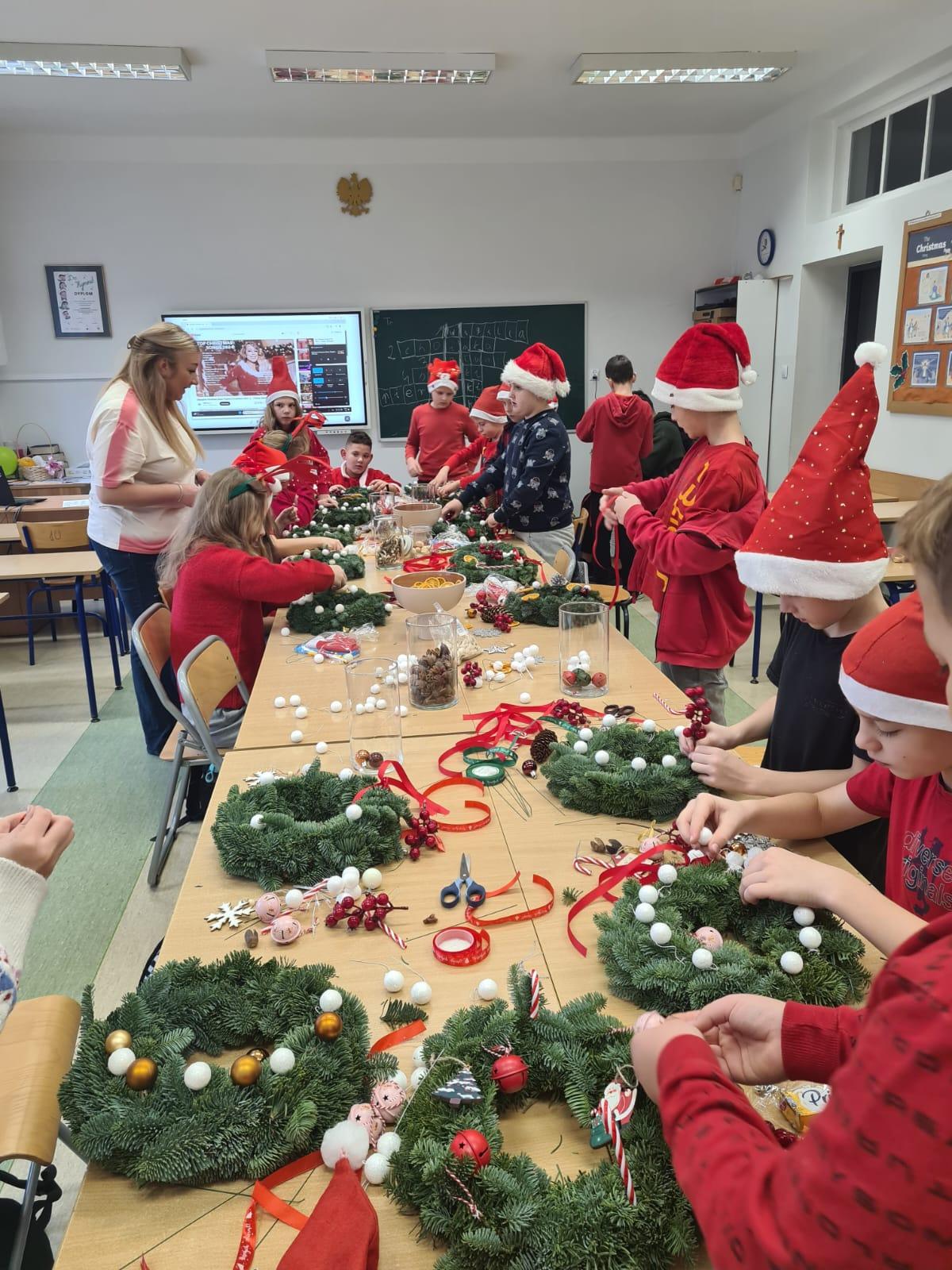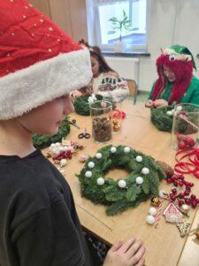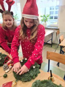 Podczas warsztatów uczniowie z zaangażowaniem i kreatywnością tworzyli własne dekoracje, używając różnorodnych materiałów – od suszonych pomarańczy, przez wstążki, aż po błyszczące ozdoby i kolorowe bombki. Każdy wianek był niepowtarzalny, odzwierciedlając indywidualny gust i pomysłowość jego twórcy.