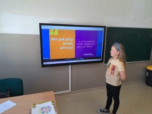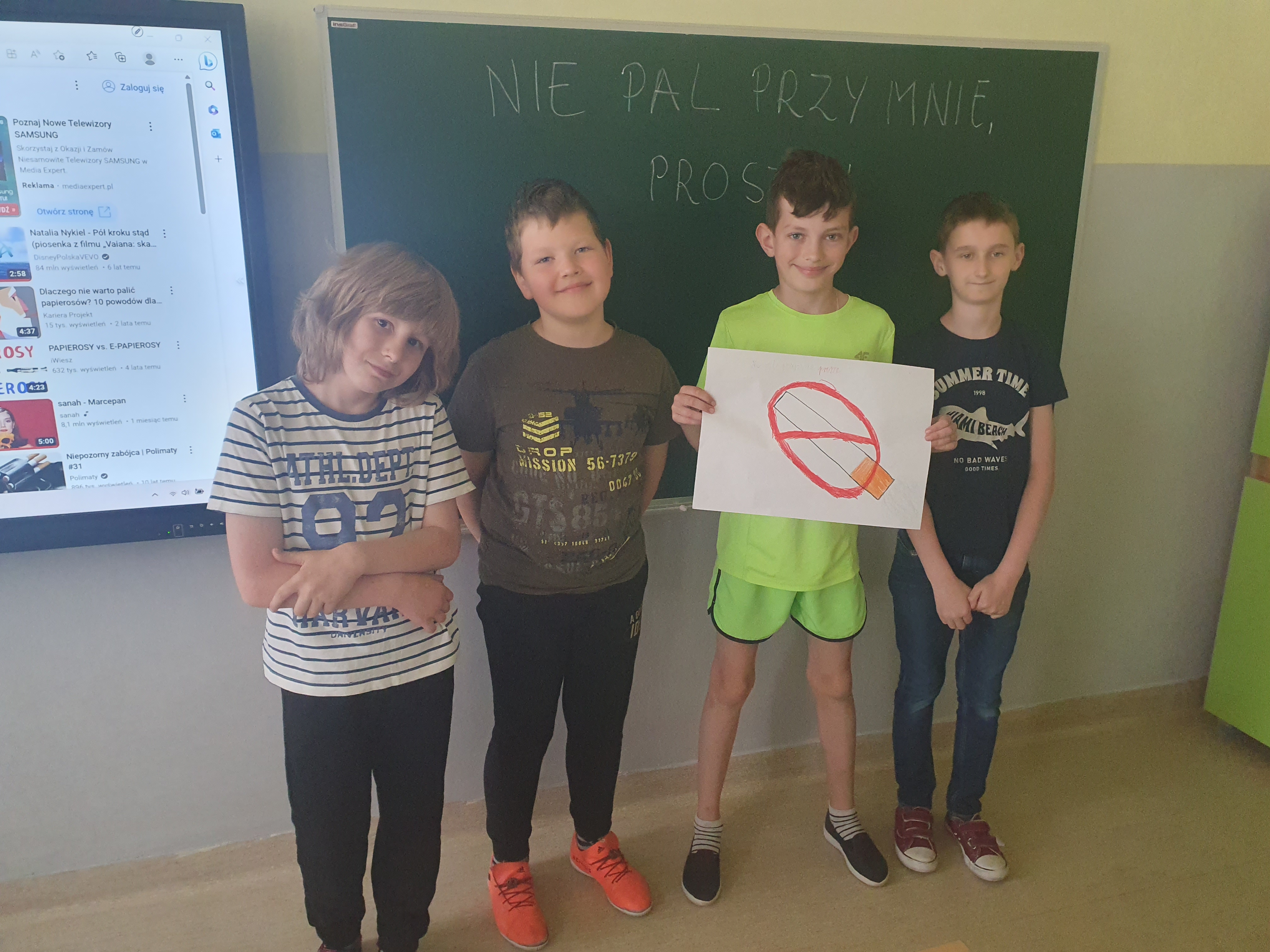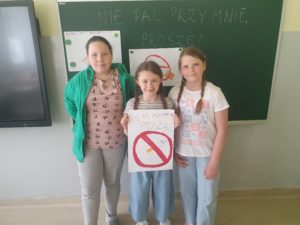 W naszej szkole został zrealizowany program edukacji antytytoniowej „Nie pal przy mnie, proszę!”, który był adresowany do uczniów klas I – III. Jego celem było zmniejszenie narażenia dzieci na bierne palenie tytoniu, zwiększenie wiedzy w zakresie odpowiedzialności za własne zdrowie oraz kształtowanie postaw asertywnych związanych z unikaniem czynnego i biernego palenia tytoniu. Założeniem programu było przeprowadzenie zajęć w formie warsztatowej w oparciu o następujące tematy: