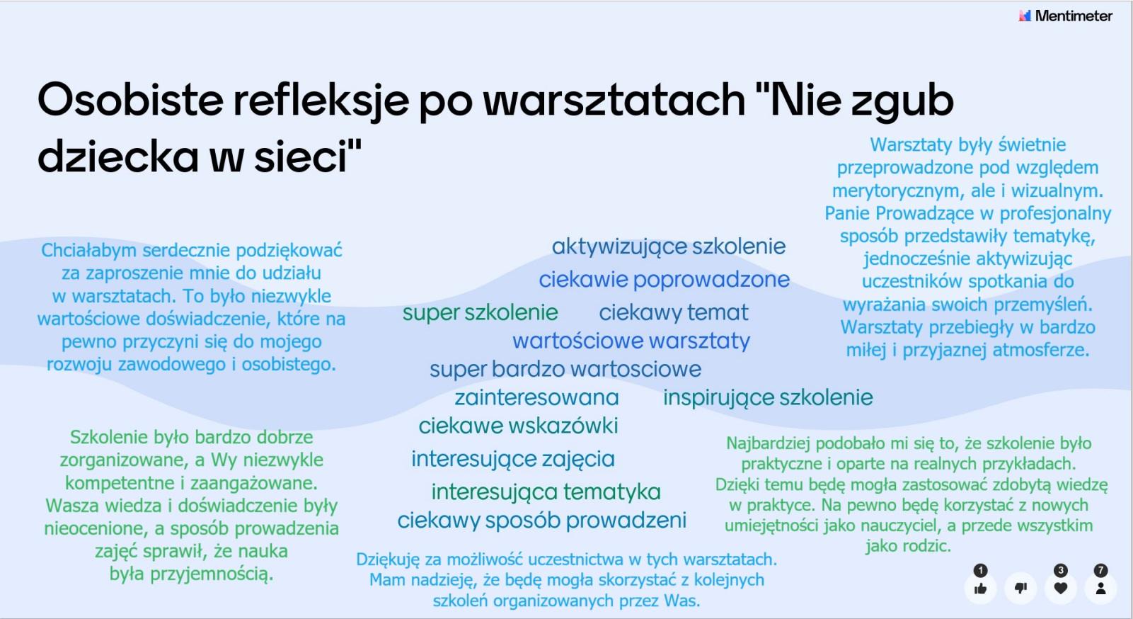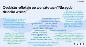 Nowe technologie są nieodzownym elementem naszego codziennego życia, w tym również i życia naszych dzieci. W związku z tym stoi przez nami – dorosłymi wyzwanie, jak nauczyć dziecko rozważnego korzystania z sieci.Wychodząc naprzeciw oczekiwaniom rodziców oraz napotykanym trudnościom z właściwym korzystaniem z Internetu, dnia 24.04.24r. zostały zorganizowane warsztaty o higienie cyfrowej pt. “Nie zgub dziecka w sieci”. W trakcie spotkania wspólnie zastanawialiśmy się: Jak jest? Dlaczego tak jest? Jak powinno być? Te trzy kluczowe pytania pozwoliły nam stworzyć zasady higieny cyfrowej, która pozwoli w sposób odpowiedzialny używać zasobów sieci tak, aby było ono miejscem rozwoju, a nie niebezpieczną pułapką.
