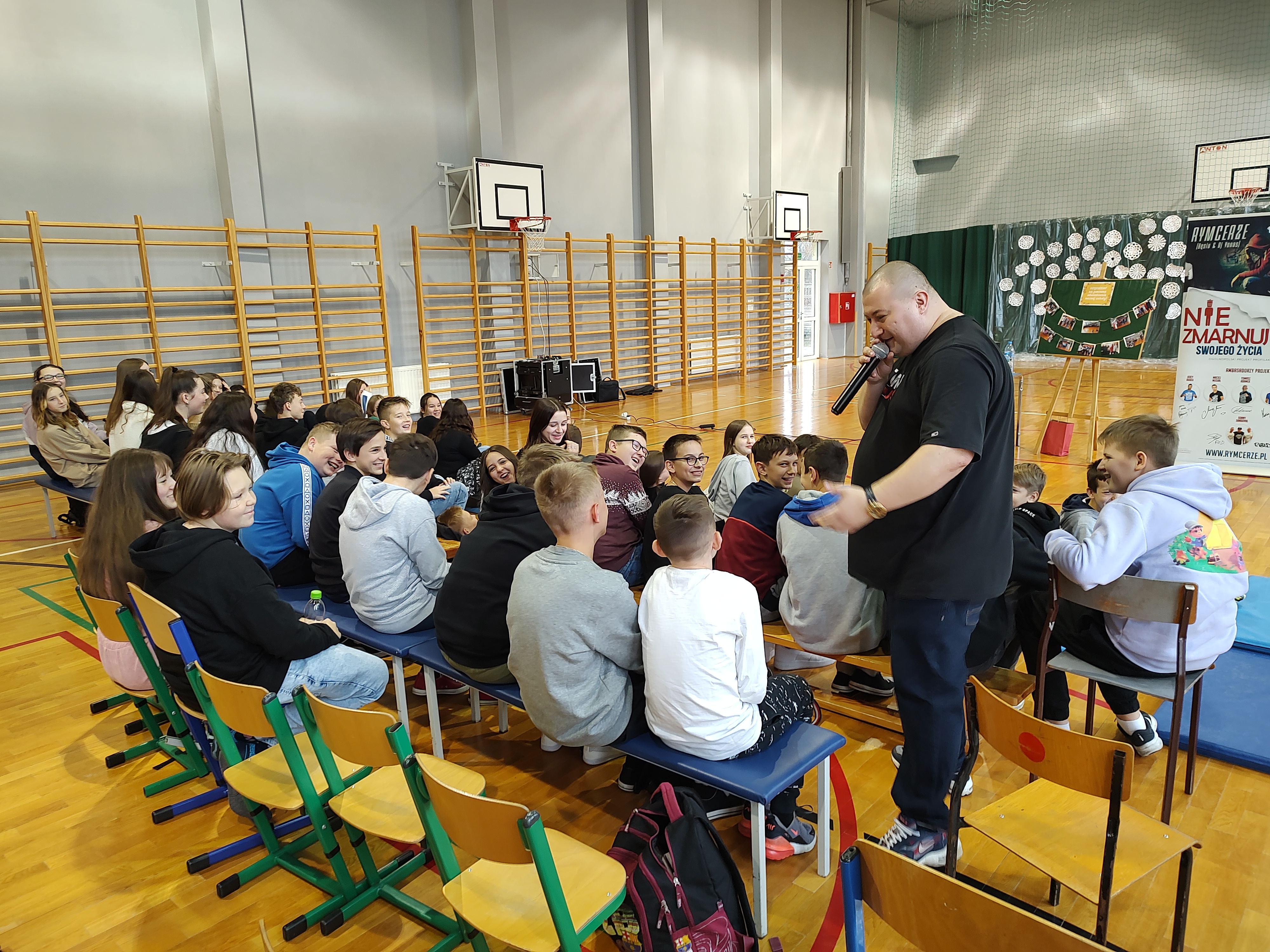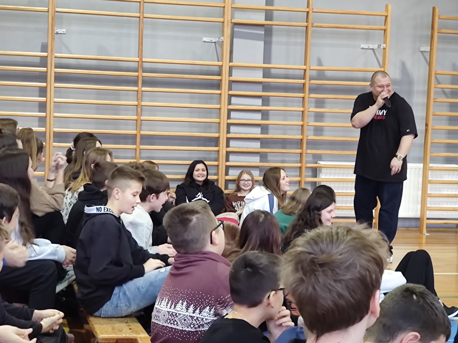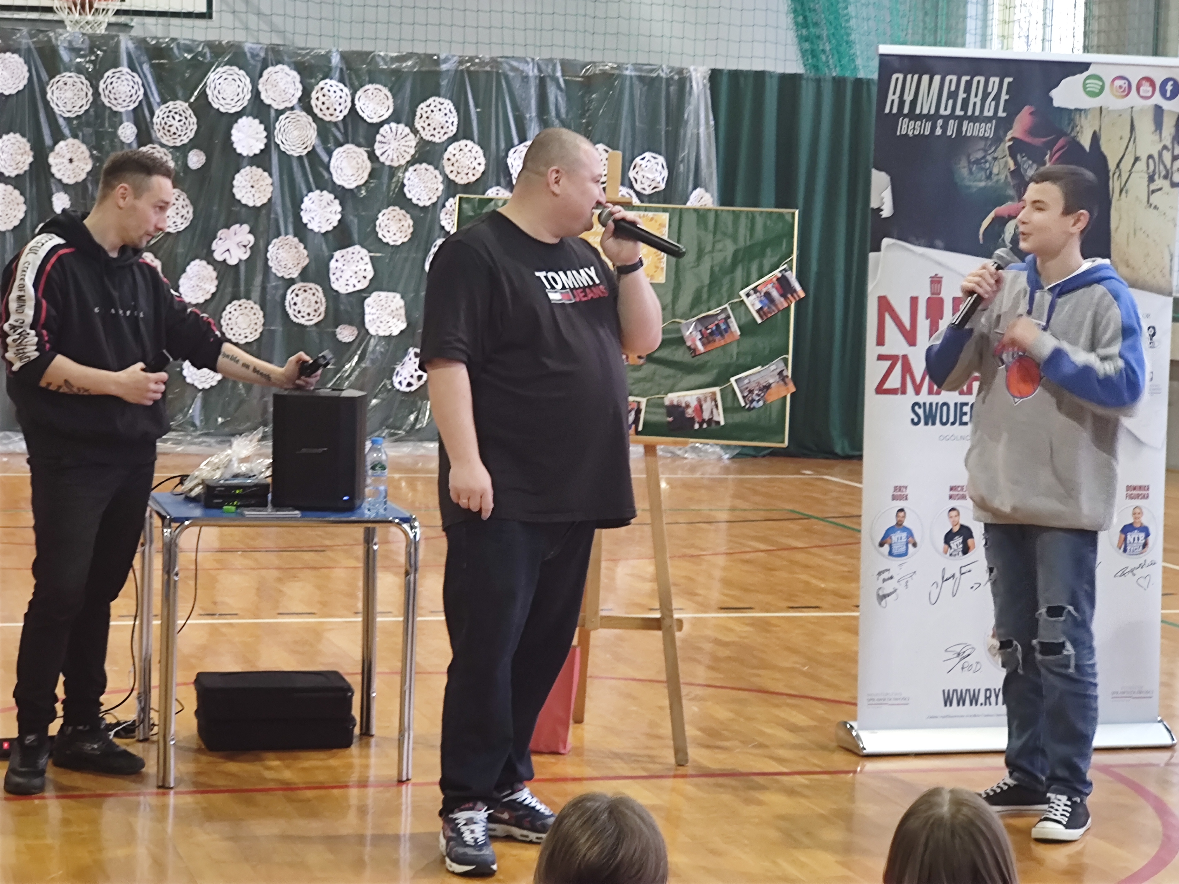 W niecodziennej lekcji profilaktyki wzięli udział uczniowie klas 7, którzy z zainteresowaniem i skupieniem słuchali przesłania oraz aktywnie brali udział w projekcie. Raperzy „językiem młodzieży” przekazali treści profilaktyczne i pozytywne komunikaty z wykorzystaniem własnych doświadczeń życiowych oraz swojej twórczości muzycznej. Była to doskonała alternatywa dla typowych zajęć profilaktycznych, która trafiła wprost do naszych młodych odbiorców oraz zmusiła do refleksji nad sensem życia.