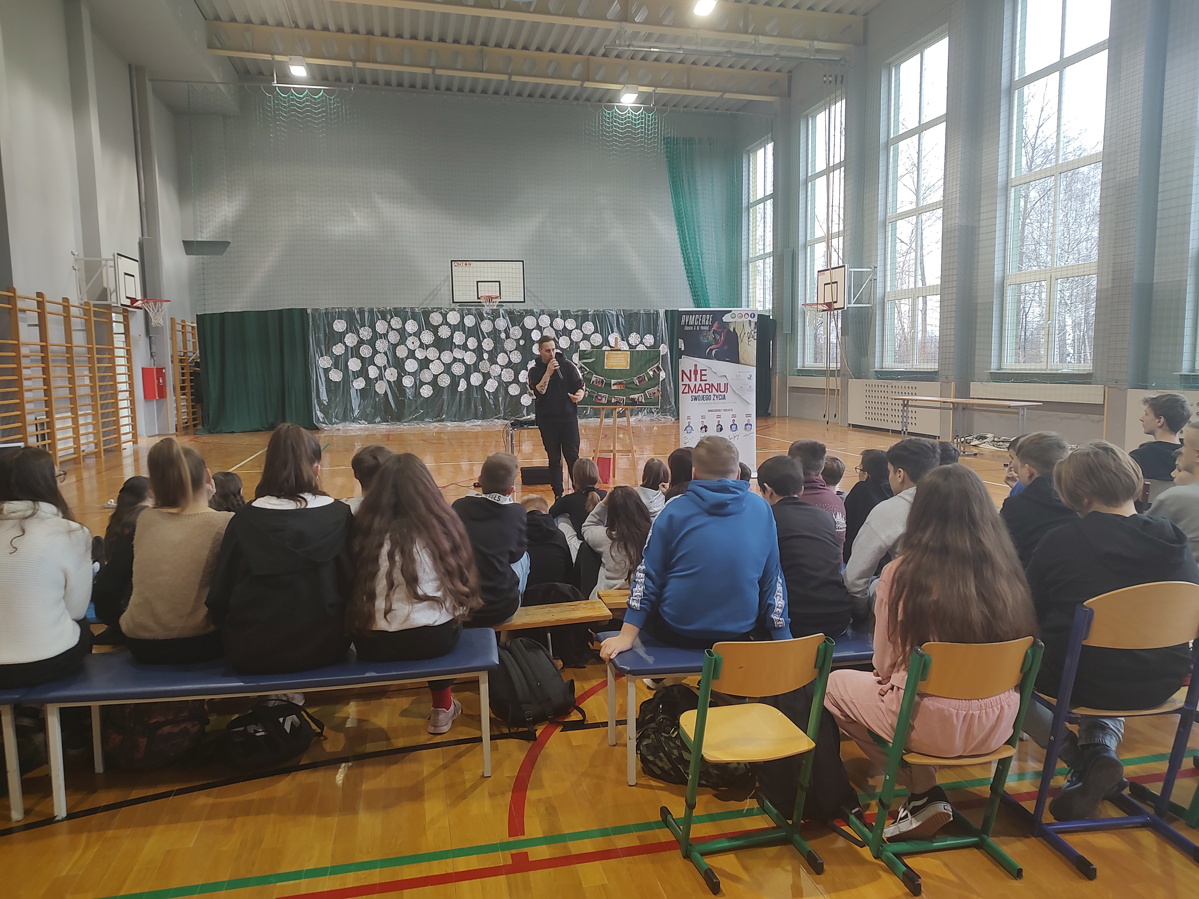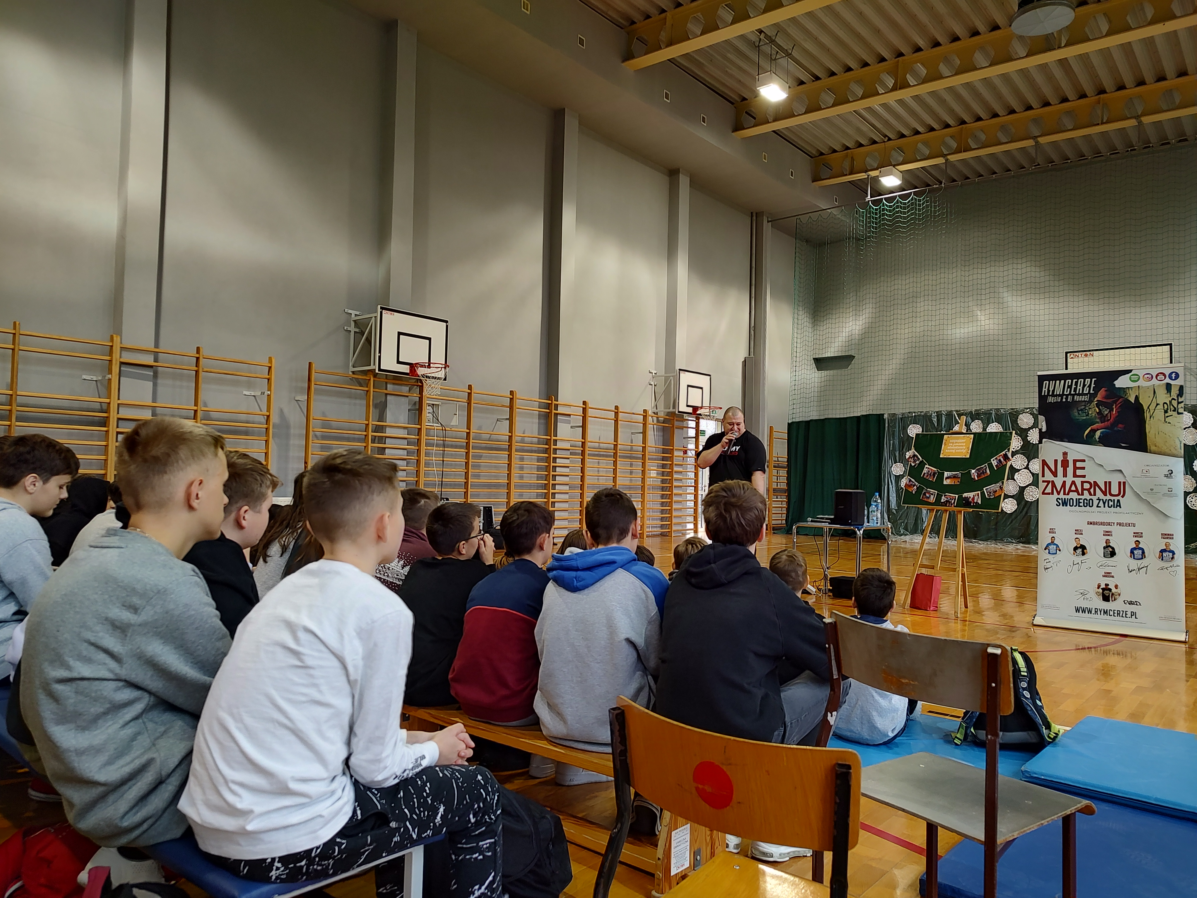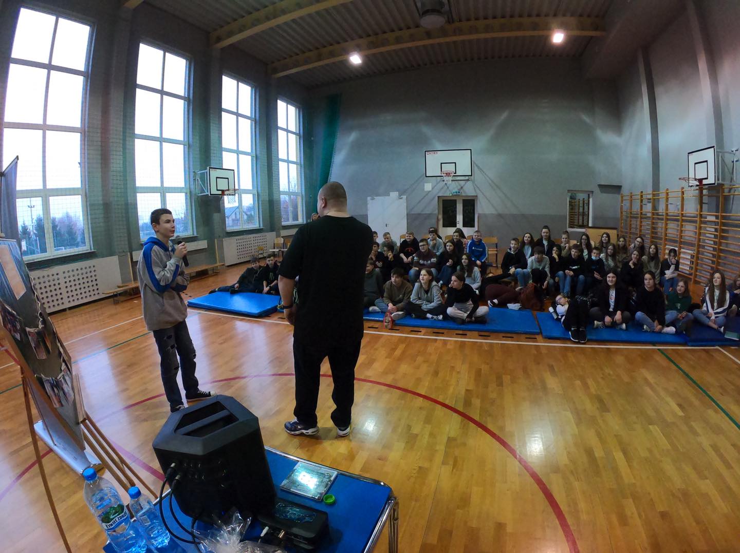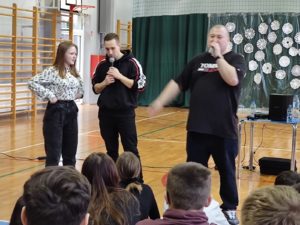 W niecodziennej lekcji profilaktyki wzięli udział uczniowie klas 7, którzy z zainteresowaniem i skupieniem słuchali przesłania oraz aktywnie brali udział w projekcie. Raperzy „językiem młodzieży” przekazali treści profilaktyczne i pozytywne komunikaty z wykorzystaniem własnych doświadczeń życiowych oraz swojej twórczości muzycznej. Była to doskonała alternatywa dla typowych zajęć profilaktycznych, która trafiła wprost do naszych młodych odbiorców oraz zmusiła do refleksji nad sensem życia.