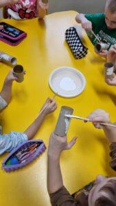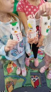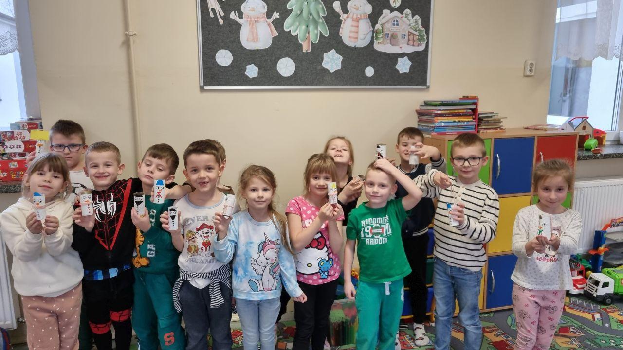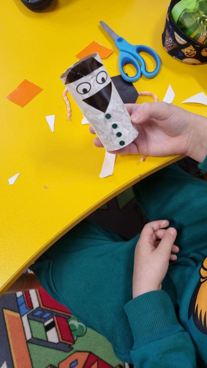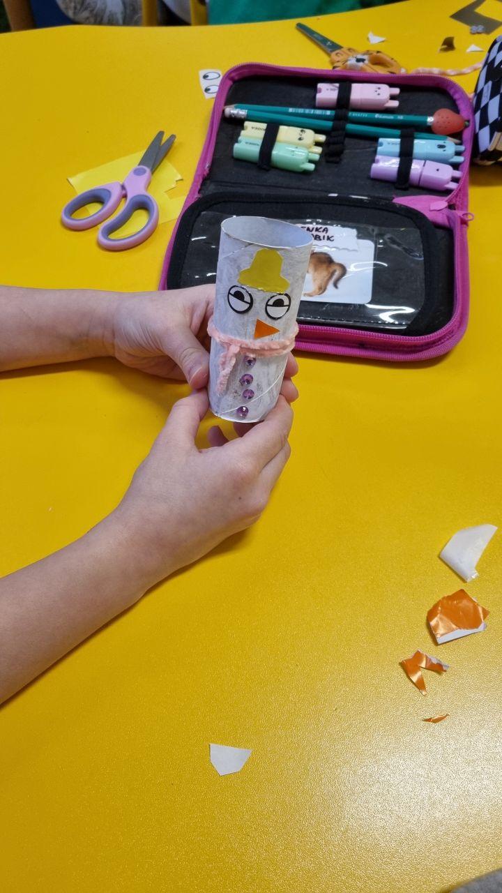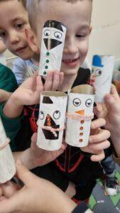 Brak śniegu nie powstrzymał zerówkowiczów z grupy 0a przed zrobieniem bałwana. Podczas pobytu w świetlicy powstał nie jeden, a kilkanaście małych bałwanków! Wystarczyły rolki po papierze, trochę białej farby, a także kreatywność dzieci. Każdy bałwanek zyskał czapeczkę, błyszczące guziczki, a nawet szalik z włóczki. Dzieci bardzo chętnie podjęły się tego zadania i dumnie prezentowały swoje prace.