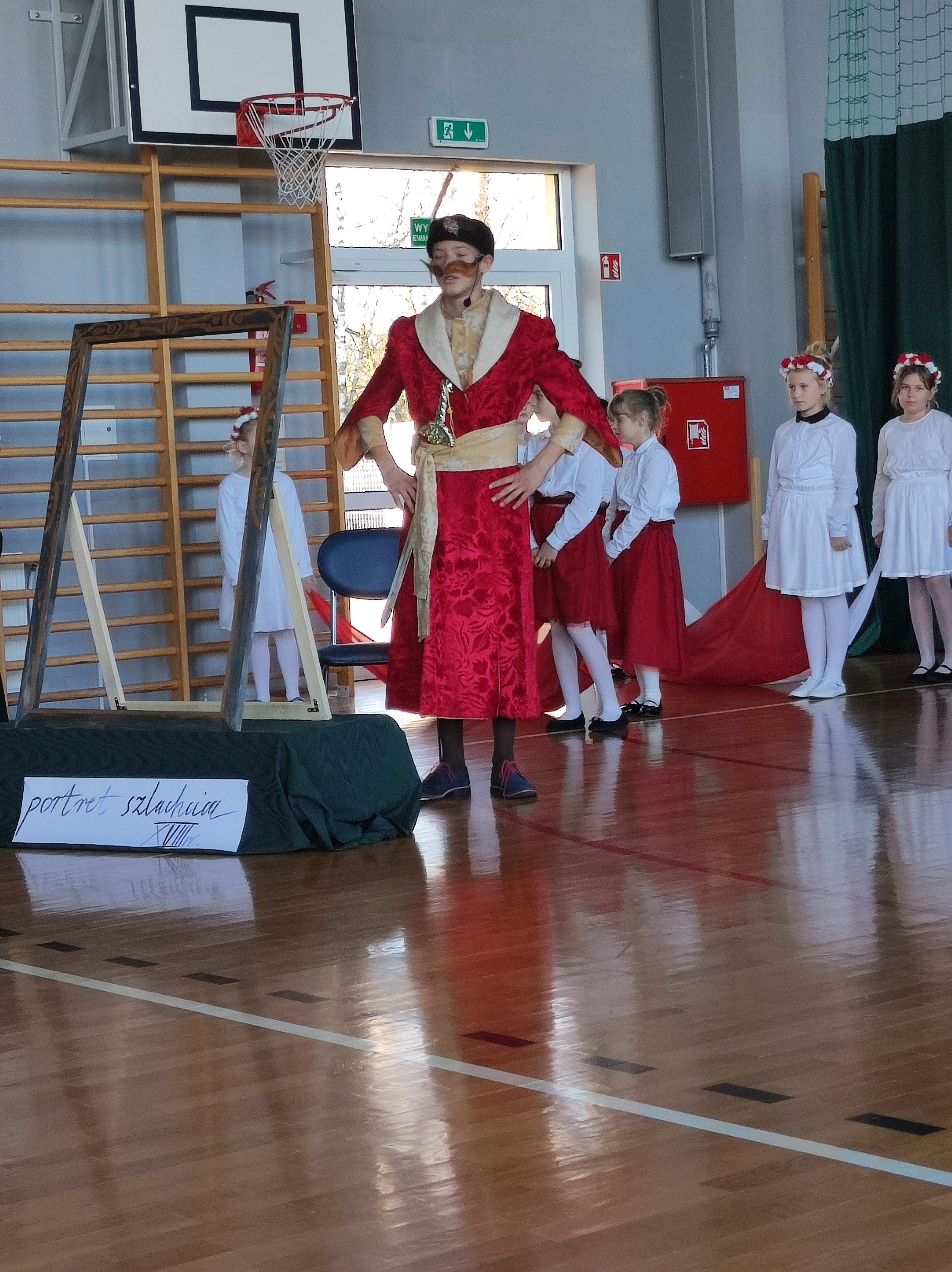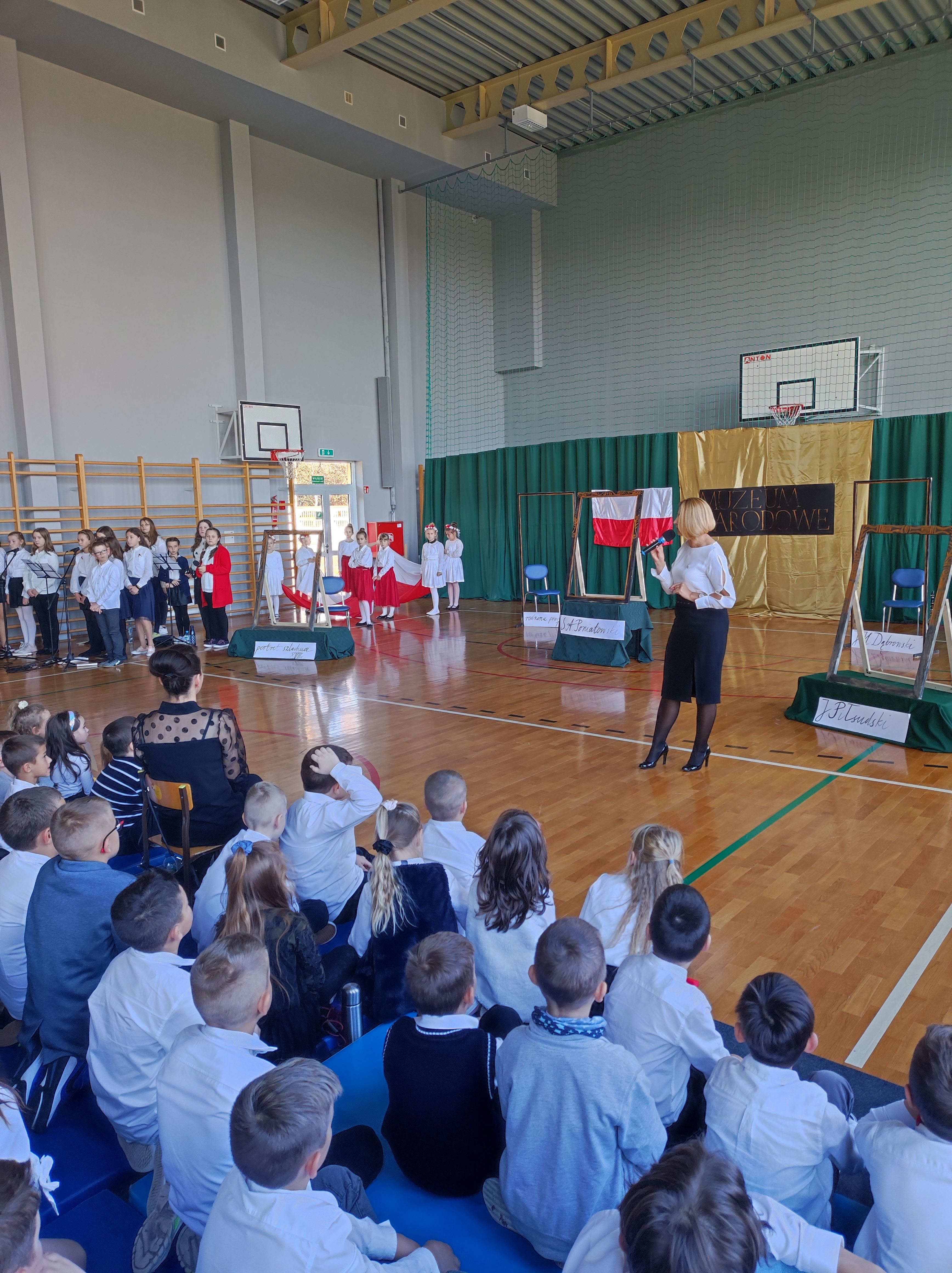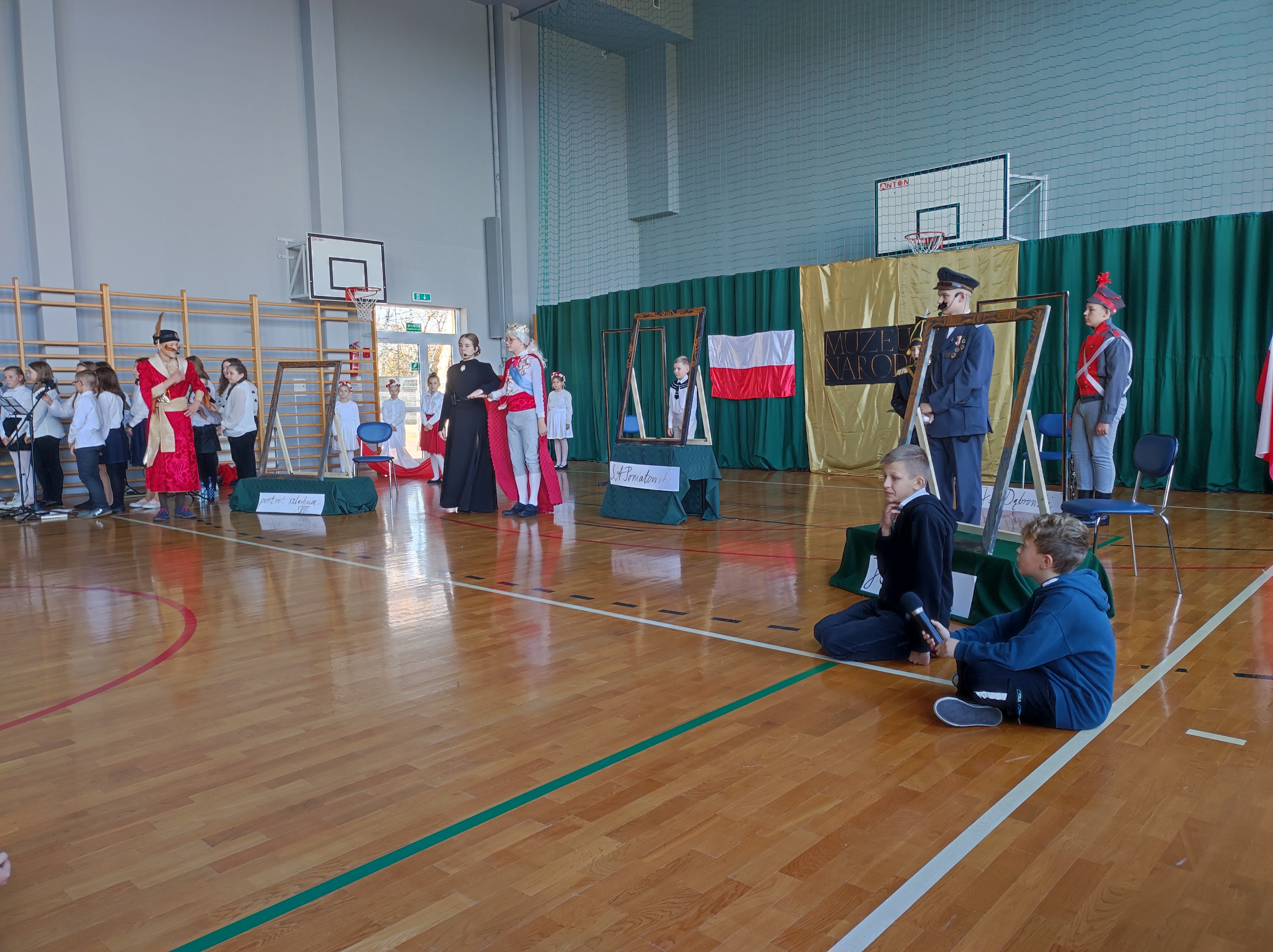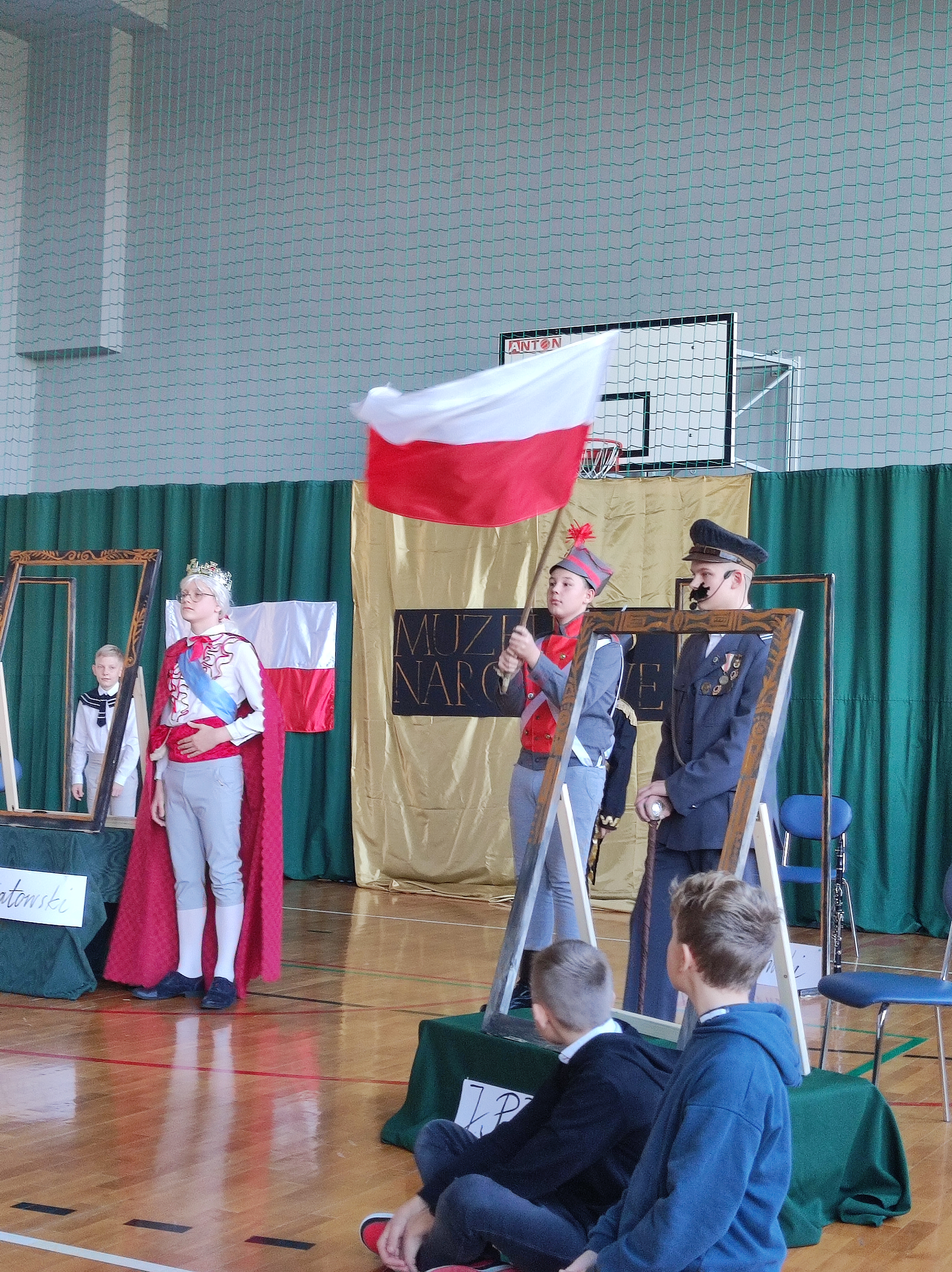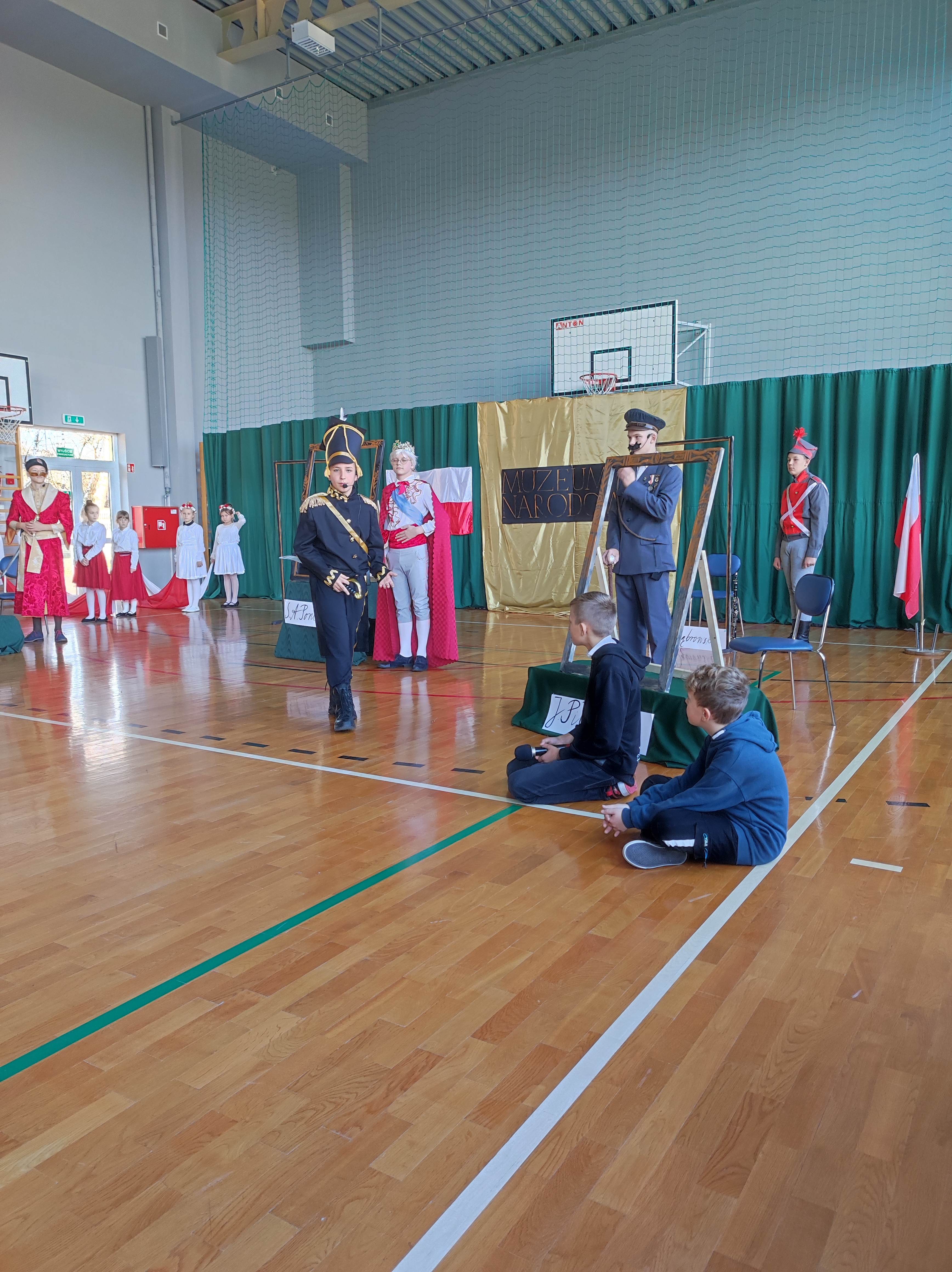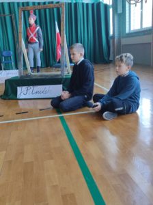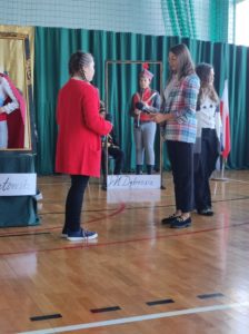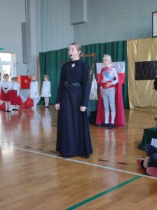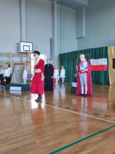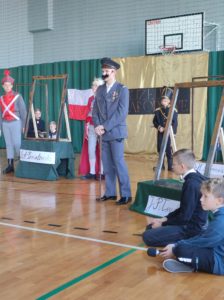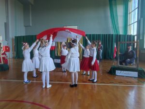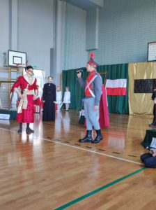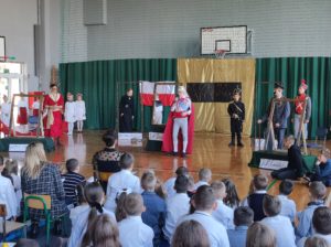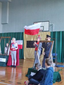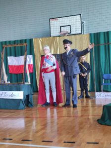 Następnie uczniowie klas IV a, VI a i VIII a pod kierunkiem Pań Marty Karasińskiej- Zawiszy i Anety Urbańskiej zaprezentowali przedstawienie pt. „Noc w muzeum” poświęcone dążeniom Polaków do odzyskania niepodległości. Imponująca scenografia przygotowana przez Panią Ewę Banaszczyk oraz uczniów klas ósmych, piękna muzyka w wykonaniu naszego szkolnego chóru pod opieką pani Izabeli Tracz, wzruszający taniec dziewcząt z zespołu „Gracja”, nad którym pieczę sprawuje Pani Paulina Pyzara oraz bogate stroje i duże zaangażowanie wszystkich występujących sprawiły, że spektakl został bardzo ciepło przyjęty przez publiczność.