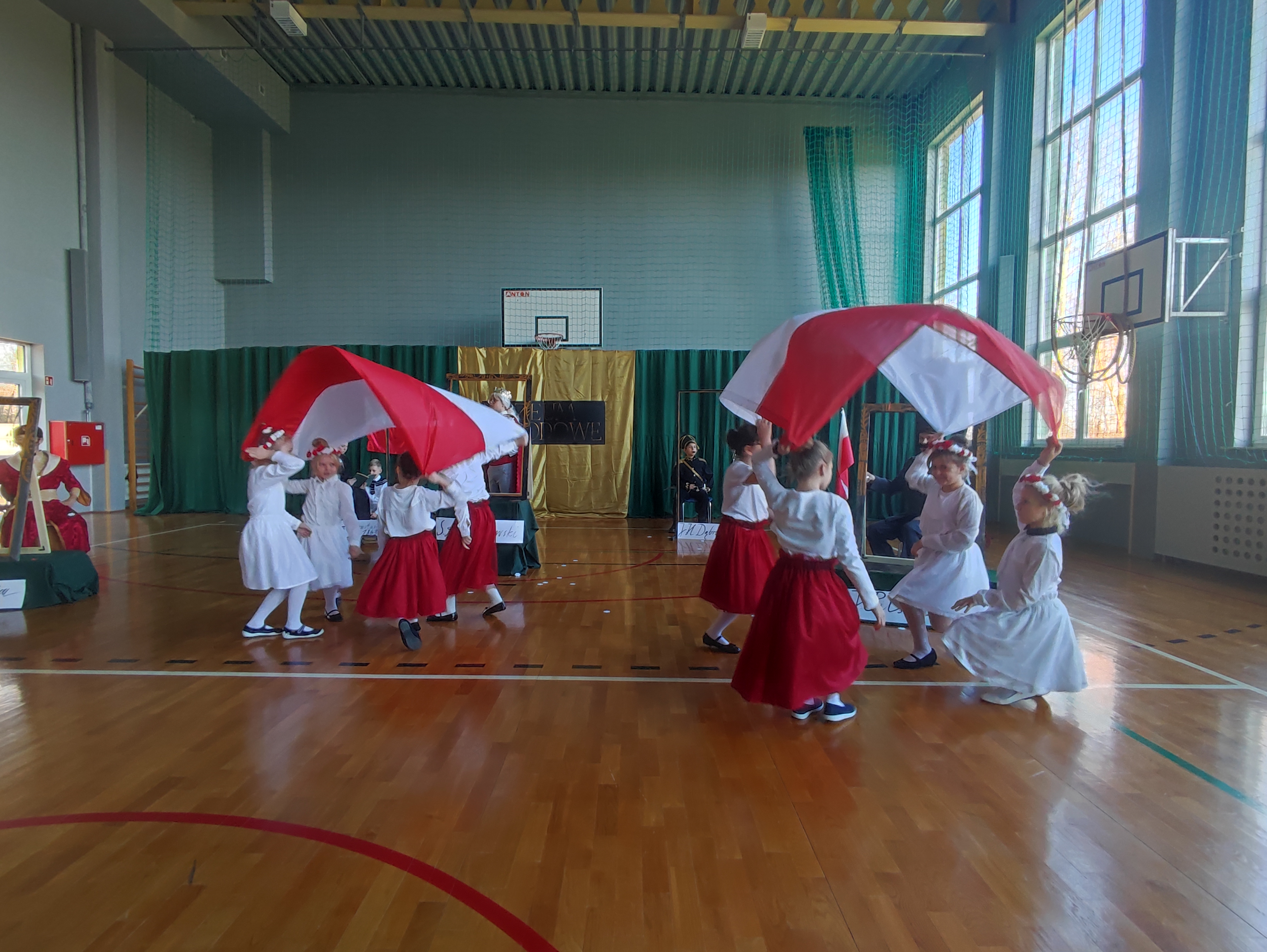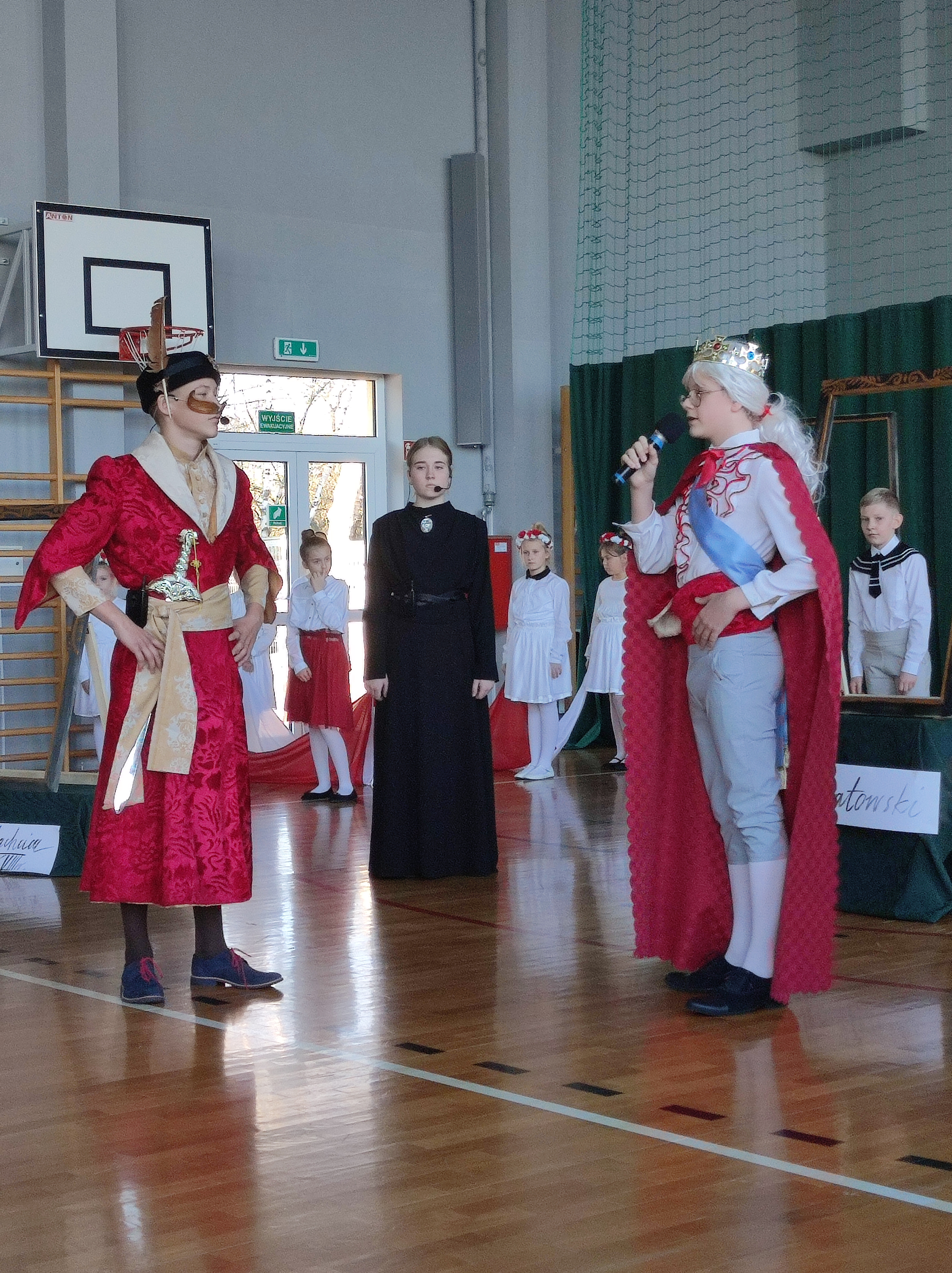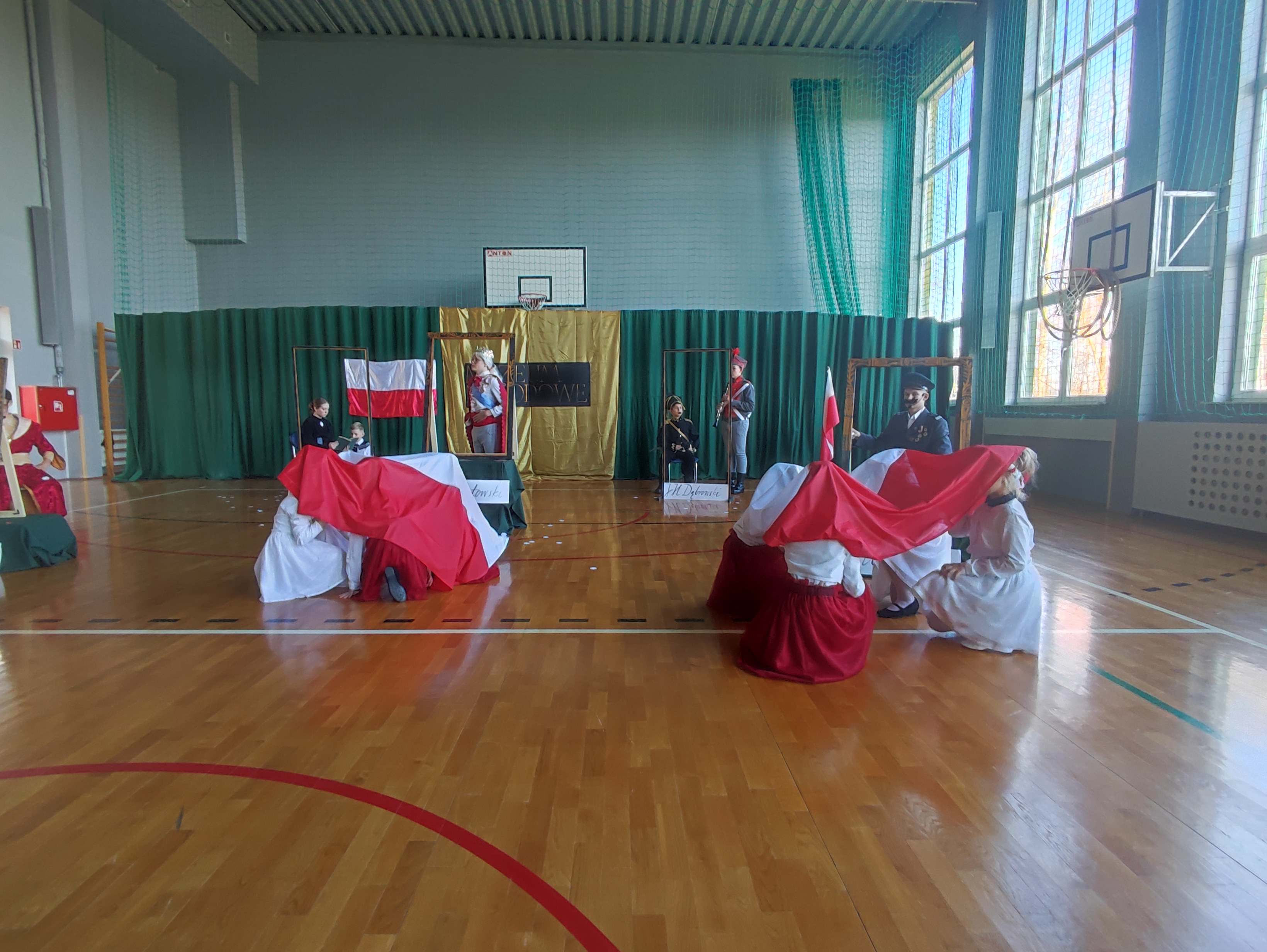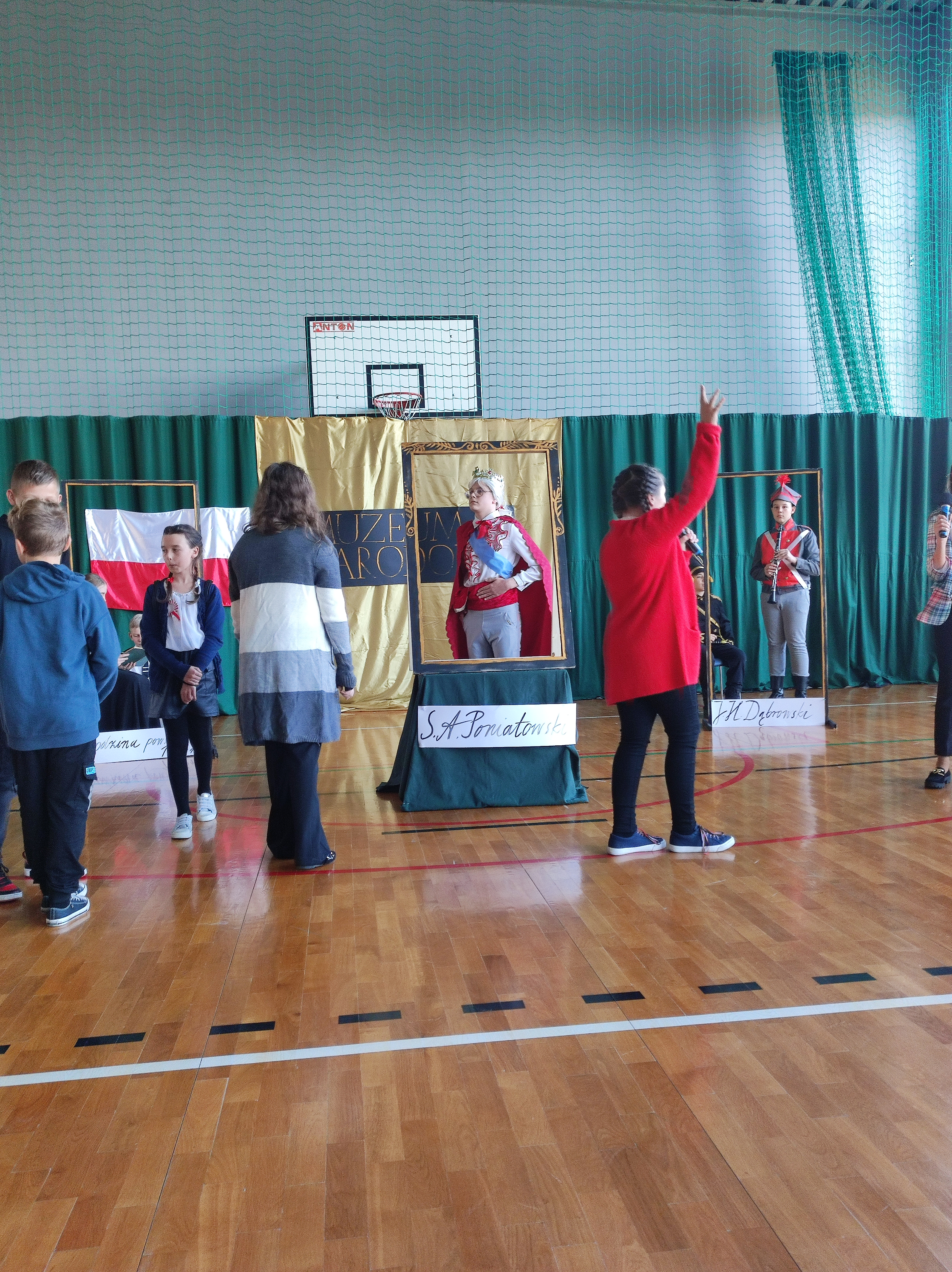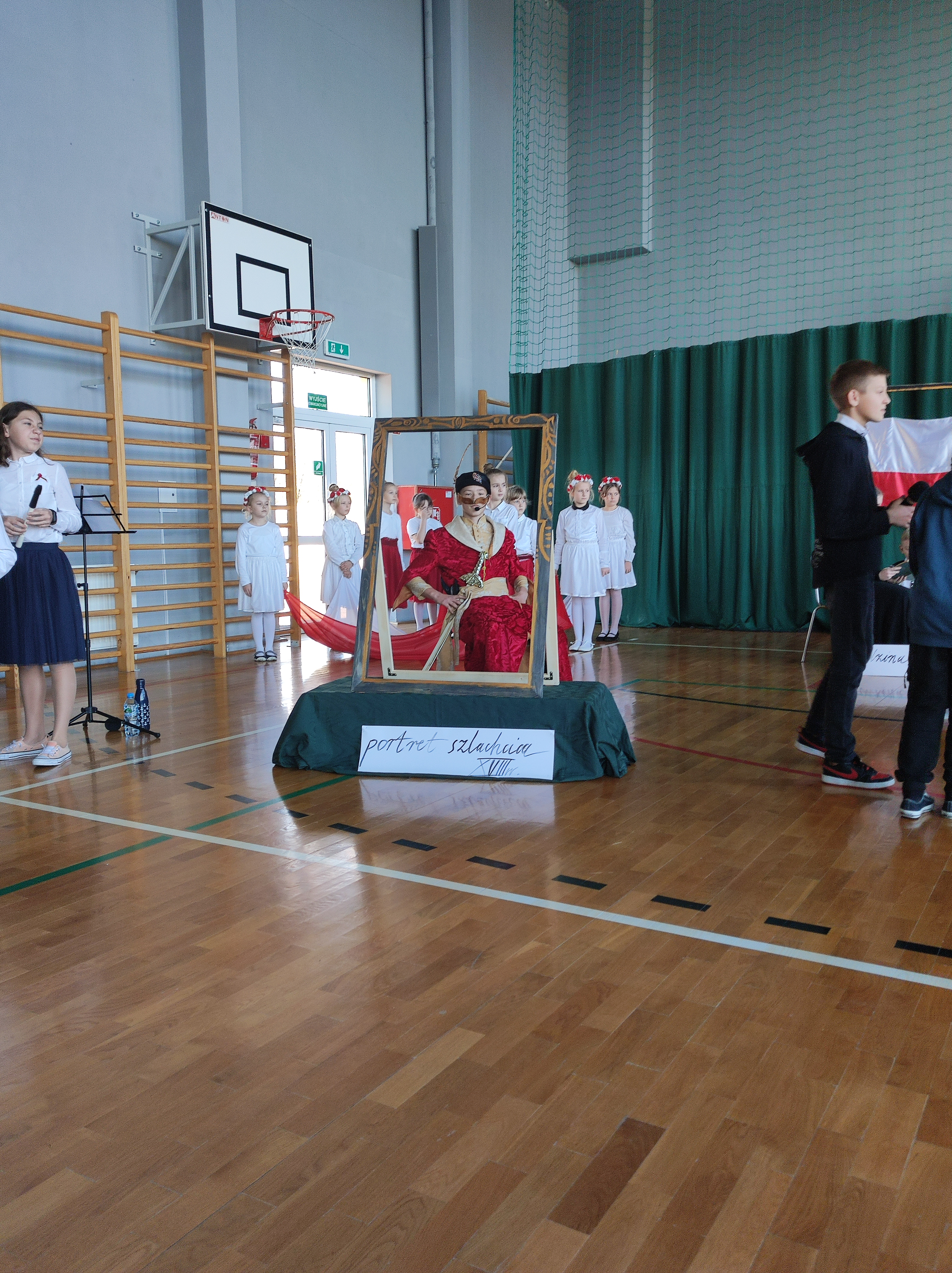 Następnie uczniowie klas IV a, VI a i VIII a pod kierunkiem Pań Marty Karasińskiej- Zawiszy i Anety Urbańskiej zaprezentowali przedstawienie pt. „Noc w muzeum” poświęcone dążeniom Polaków do odzyskania niepodległości. Imponująca scenografia przygotowana przez Panią Ewę Banaszczyk oraz uczniów klas ósmych, piękna muzyka w wykonaniu naszego szkolnego chóru pod opieką pani Izabeli Tracz, wzruszający taniec dziewcząt z zespołu „Gracja”, nad którym pieczę sprawuje Pani Paulina Pyzara oraz bogate stroje i duże zaangażowanie wszystkich występujących sprawiły, że spektakl został bardzo ciepło przyjęty przez publiczność.