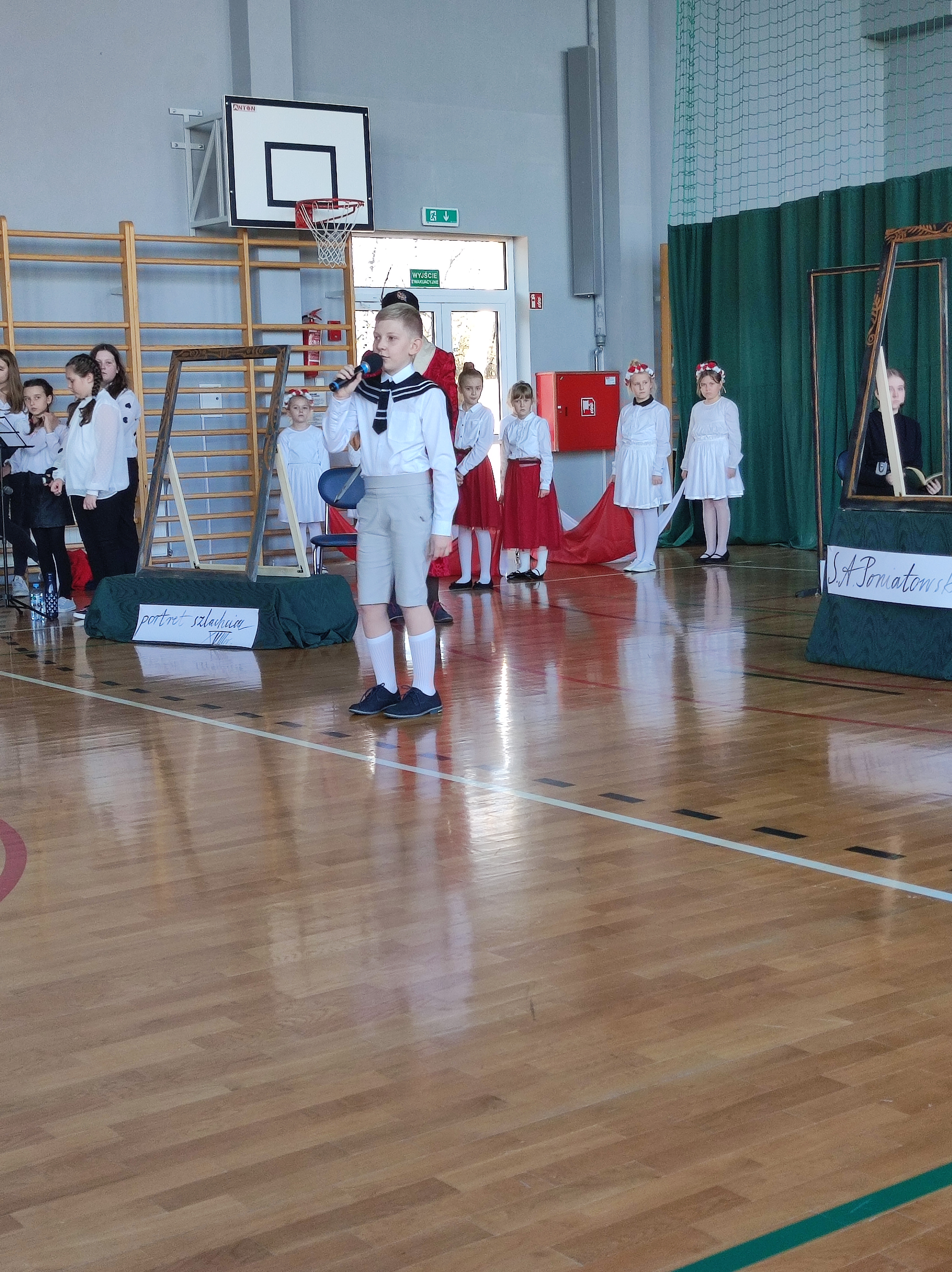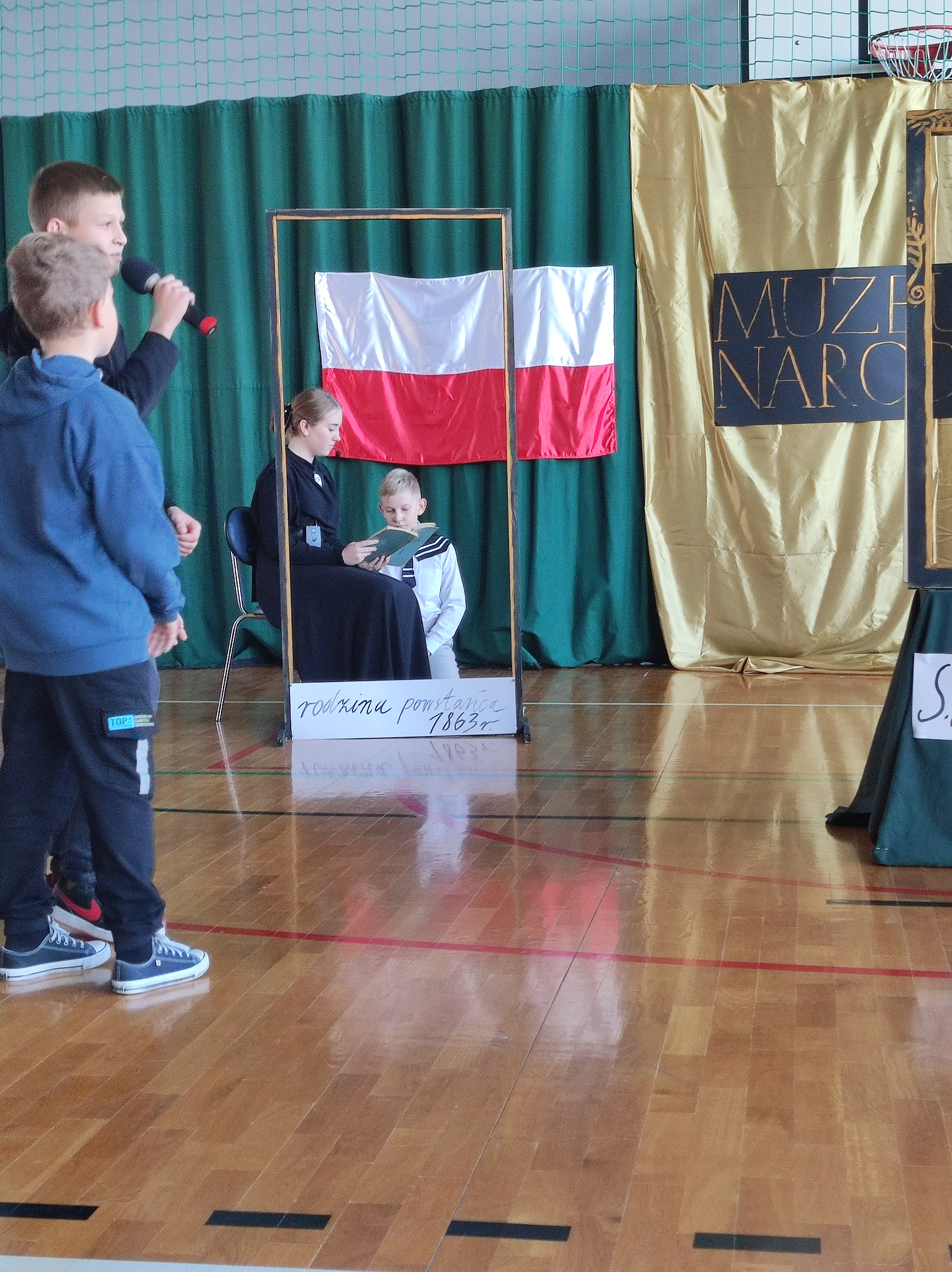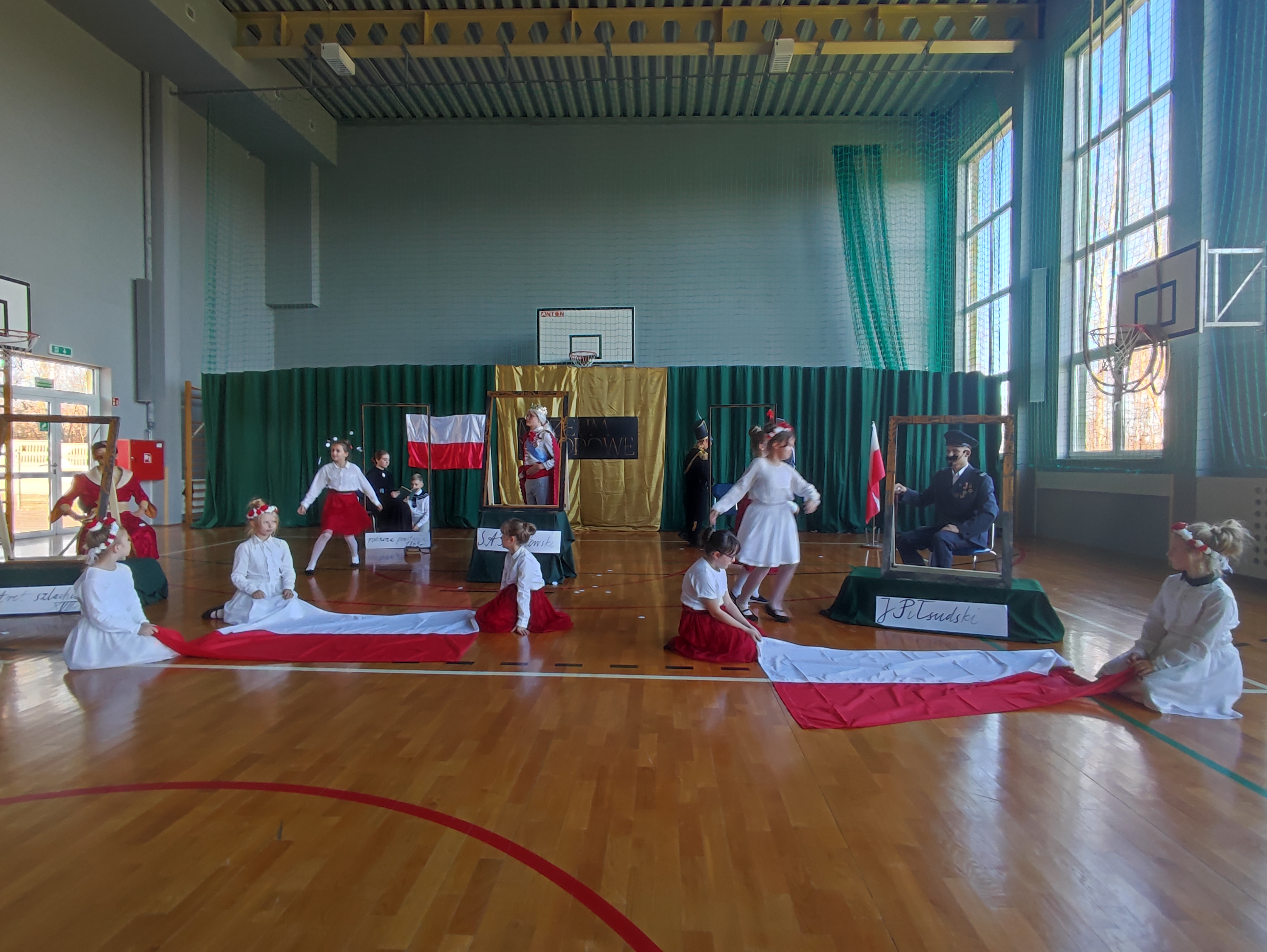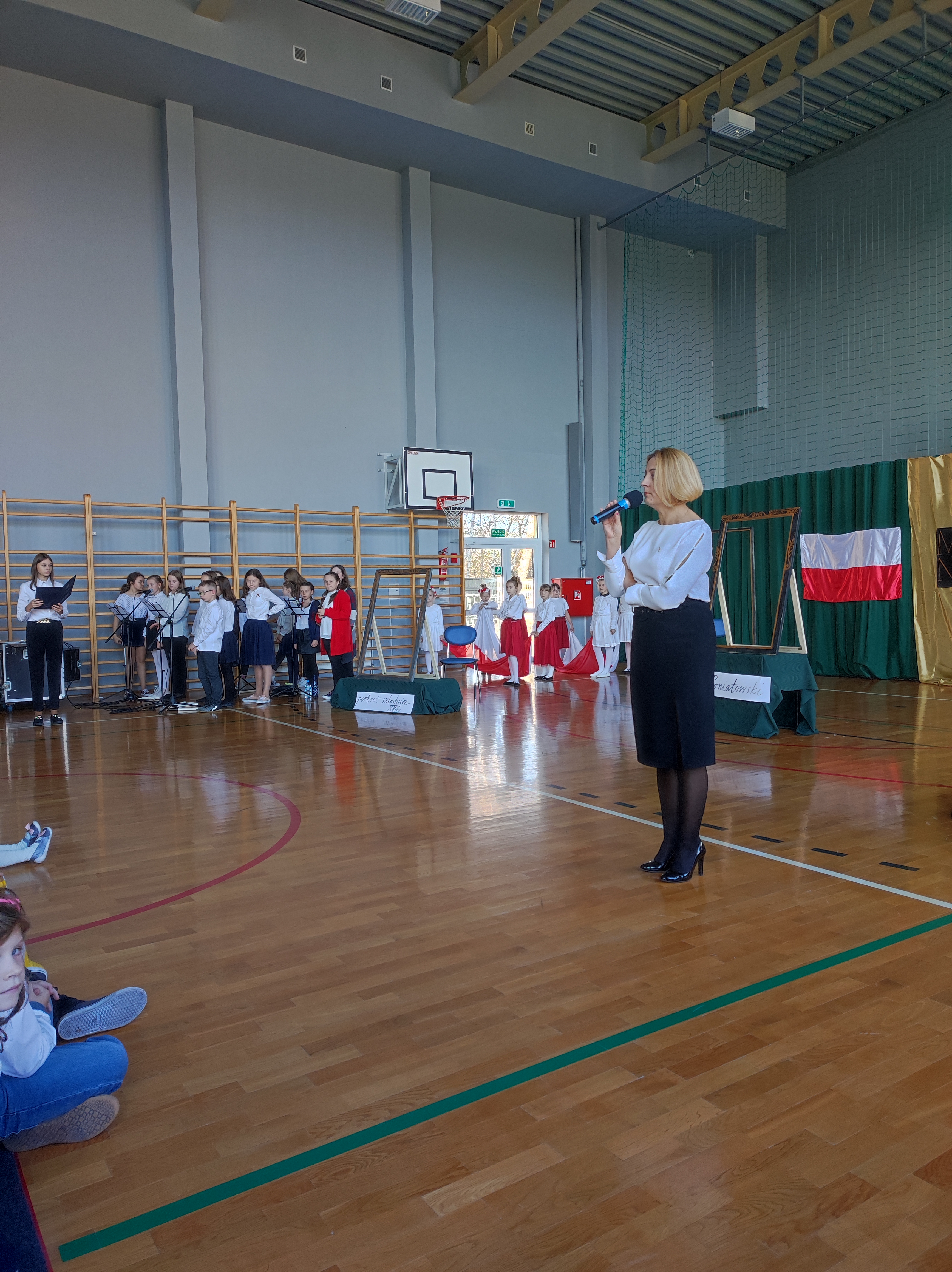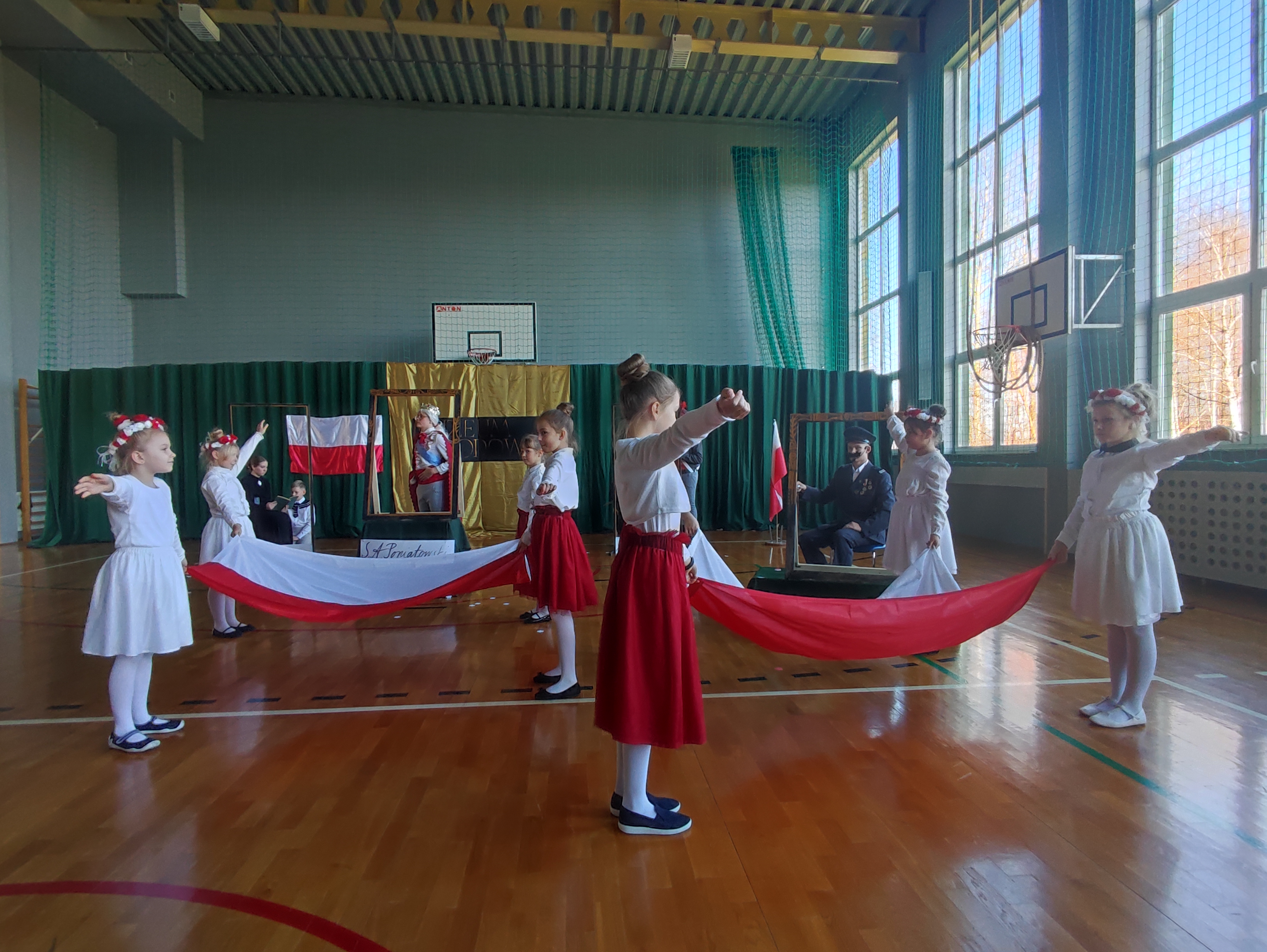 Następnie uczniowie klas IV a, VI a i VIII a pod kierunkiem Pań Marty Karasińskiej- Zawiszy i Anety Urbańskiej zaprezentowali przedstawienie pt. „Noc w muzeum” poświęcone dążeniom Polaków do odzyskania niepodległości. Imponująca scenografia przygotowana przez Panią Ewę Banaszczyk oraz uczniów klas ósmych, piękna muzyka w wykonaniu naszego szkolnego chóru pod opieką pani Izabeli Tracz, wzruszający taniec dziewcząt z zespołu „Gracja”, nad którym pieczę sprawuje Pani Paulina Pyzara oraz bogate stroje i duże zaangażowanie wszystkich występujących sprawiły, że spektakl został bardzo ciepło przyjęty przez publiczność.