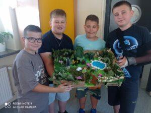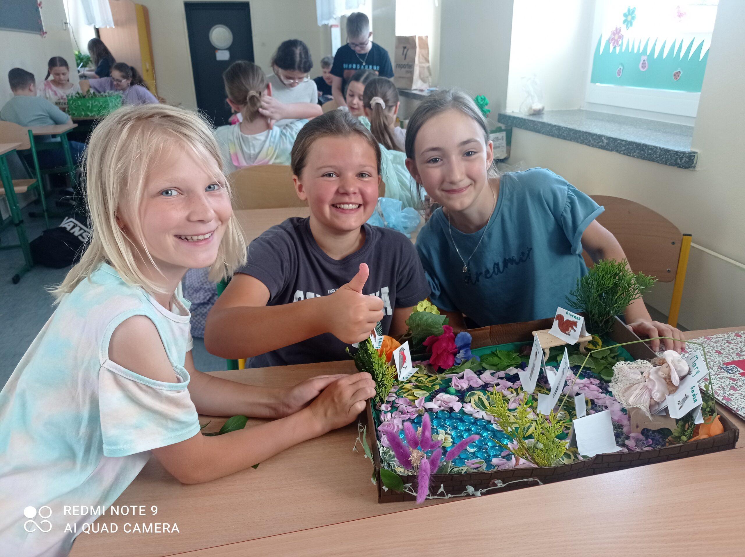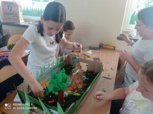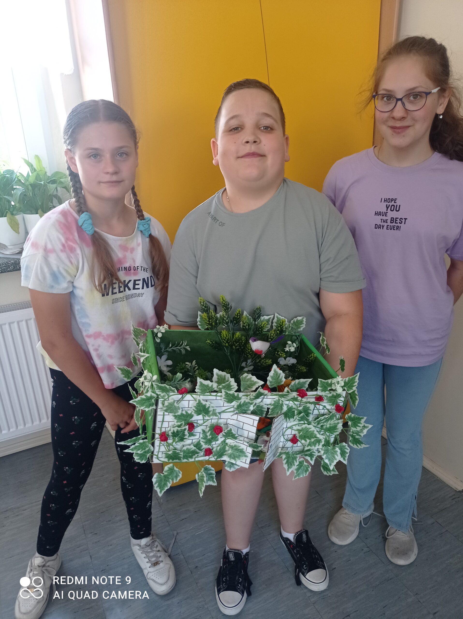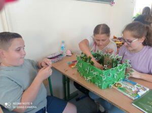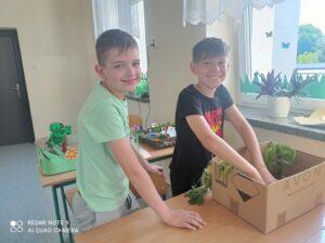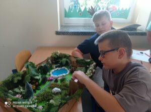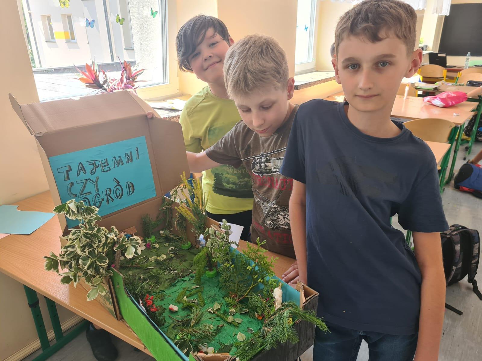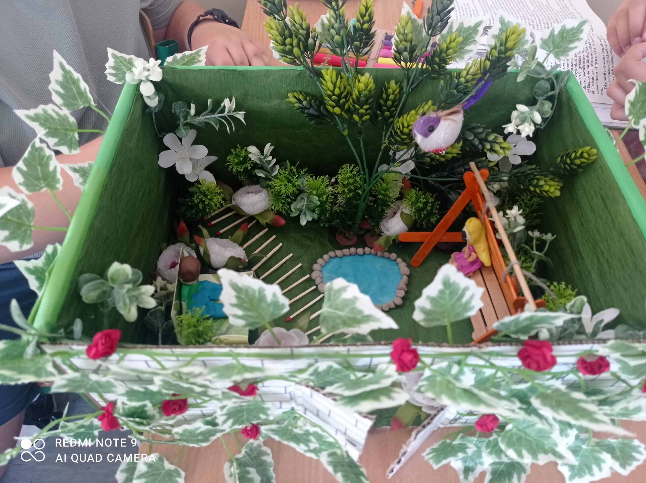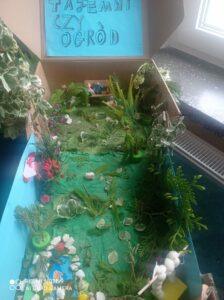 Uczniowie kl. IV a i kl. IV b na zajęciach języka polskiego wykonali barwne przestrzenne makiety tajemniczego ogrodu. Inspiracją była powieść F. H. Burnett pt. „Tajemniczy ogród”. Do zrobienia makiet wykorzystali pudełka, bibułę, papier kolorowy, kamyki, piasek, żywe kwiaty, patyki, plastelinę, gałązki, gąbki, plastikowe figurki itp. Czwartoklasiści z wielkim zaangażowaniem i pasją wykonywali własne oryginalne projekty tajemniczego ogrodu, wykazując się niezwykłą kreatywnością i pomysłowością. Na prostokątnych podkładkach budowali wysoki mur, którym otoczone było to niezwykłe miejsce. Nie zapomnieli o bluszczu i różach, które pięły się po ogrodzeniu, a także o furtce, która została zamknięta na klucz po śmierci pani Craven. Ogród stał się uroczym, bajkowym i magicznym zakątkiem. Pośród zieleni stały kamienne ławeczki, znajdowały się tam również altany oraz szczególne miejsce – drzewo z ławeczką pani Lilias Craven. O tych wszystkich szczegółach i jeszcze wielu innych nie zapomnieli młodzi projektanci. Na koniec liderzy poszczególnych zespołów prezentowali swoje makiety, starannie dobierając słowa i dbając o to, aby ich opis był wyjątkowy. Uczniowie opowiedzieli nie tylko o pracy nad wykonaniem makiet, odnieśli się też do treści lektury i jej bohaterów. Niecodzienna lekcja języka polskiego dostarczyła uczniom niezwykłych wrażeń. Poczuli się jak wielcy architekci. Na uwagę zasługuje zgodna praca zespołowa. Zajęcia cieszyły się ogromnym zainteresowaniem. Prace były przygotowywane w ramach innowacji pedagogicznej „Lektury nie muszą być nudne – twórcze spotkania z lekturami”.