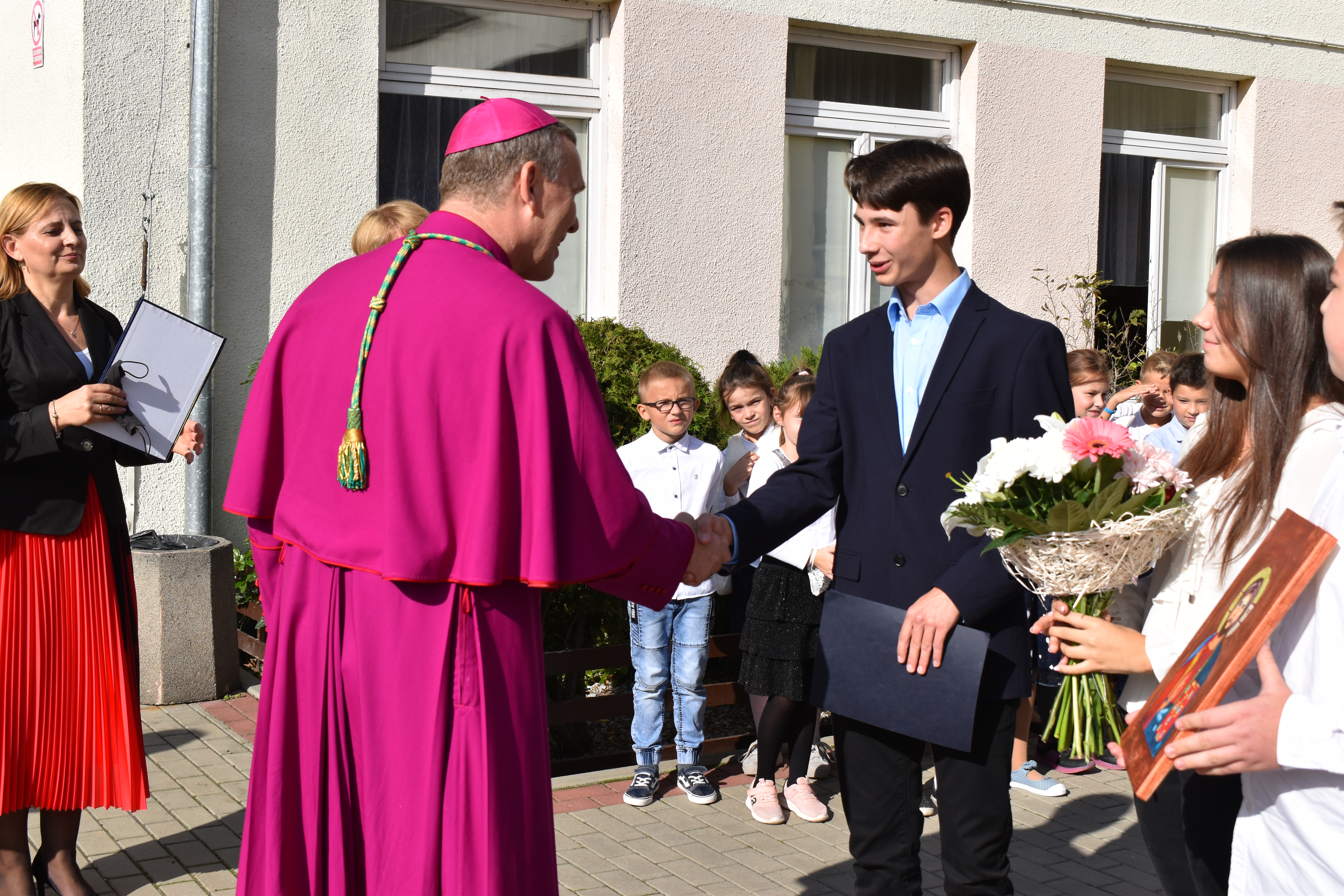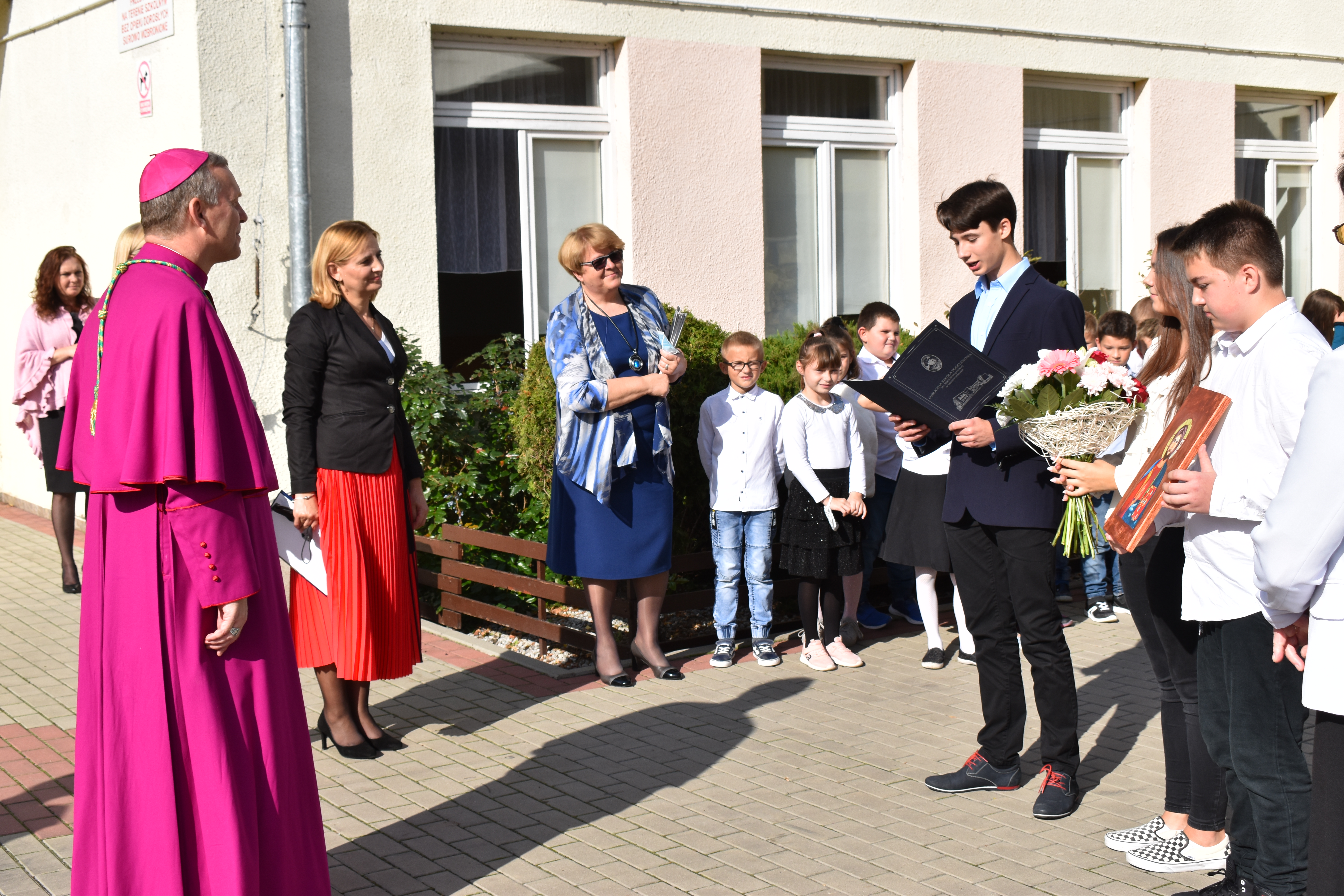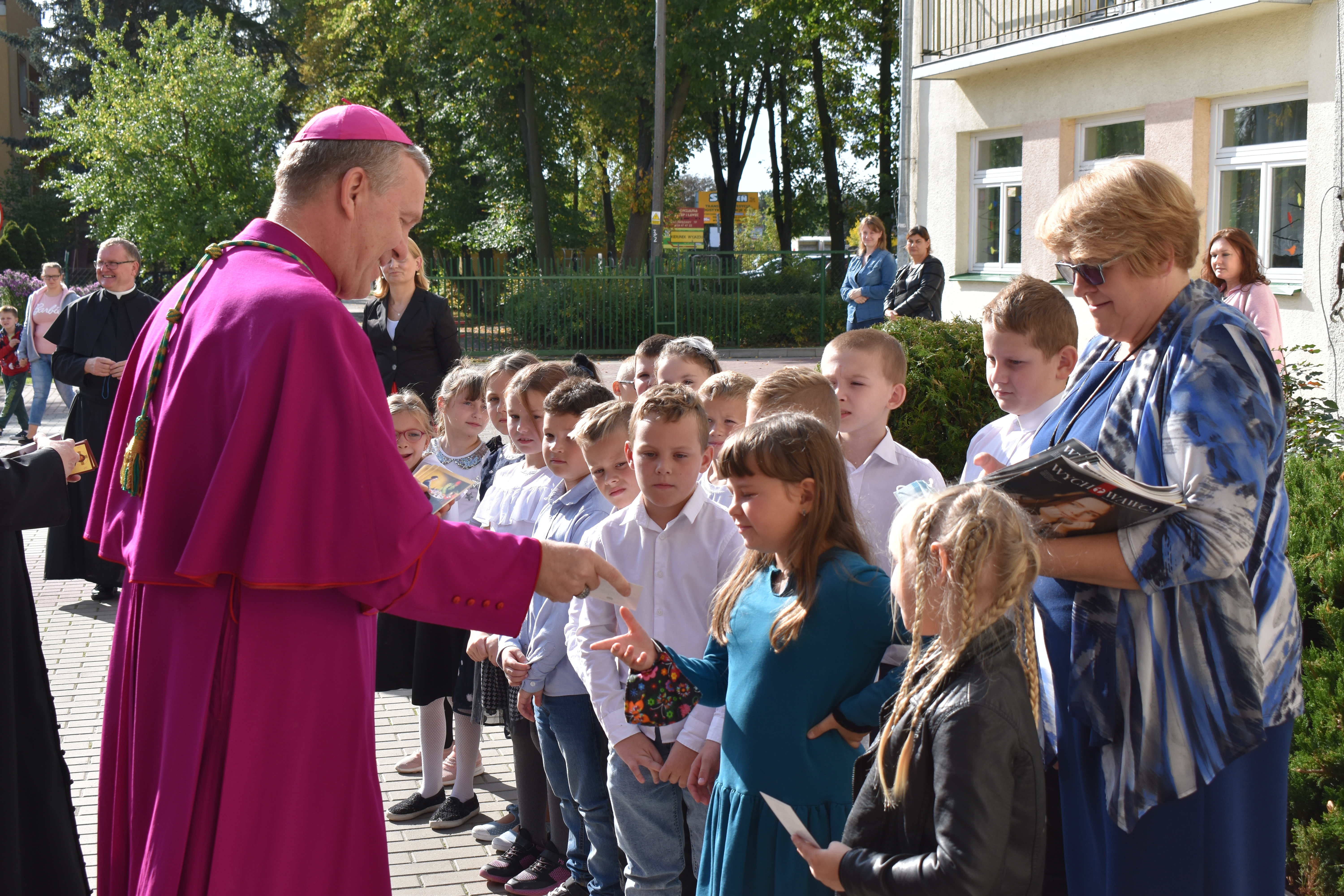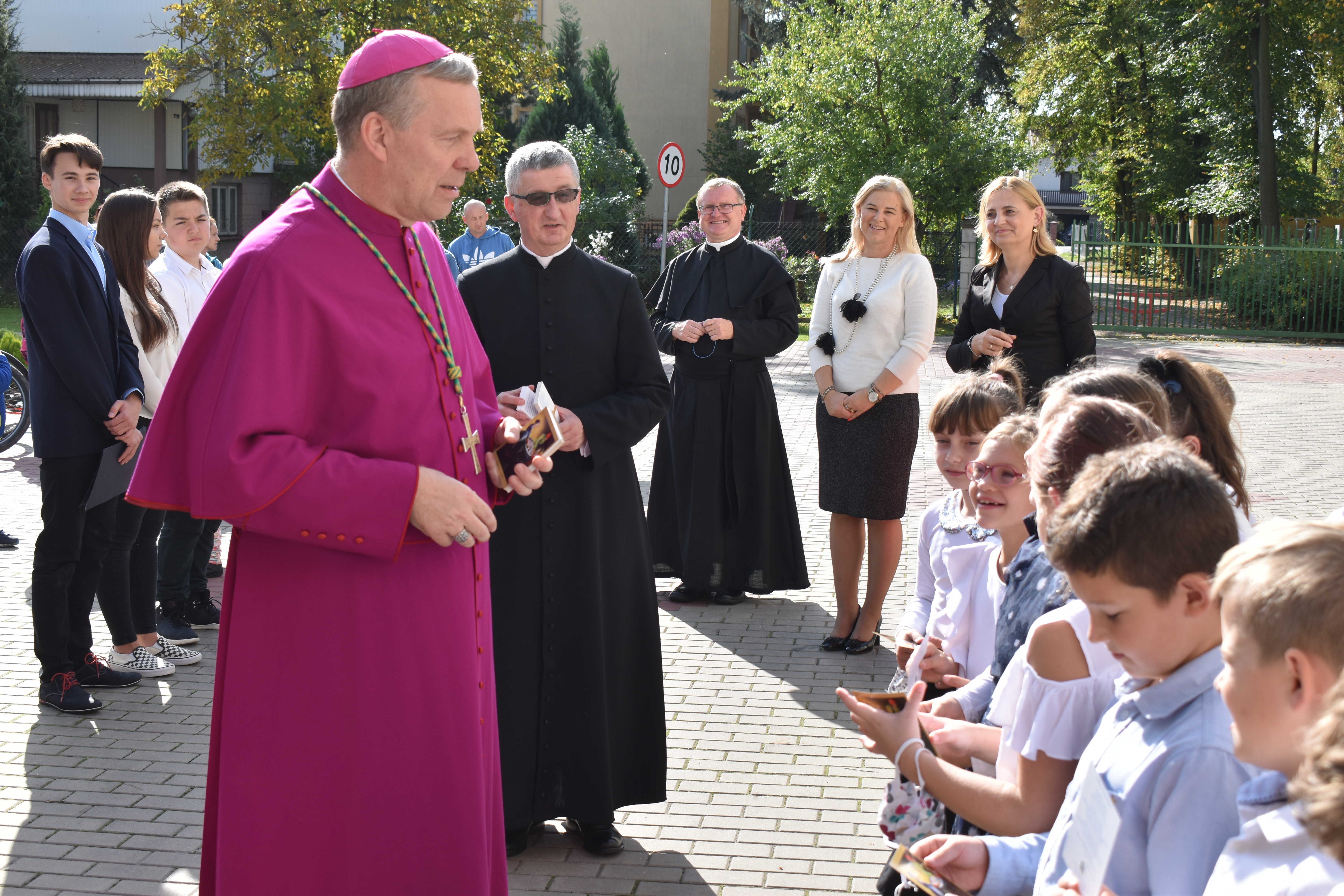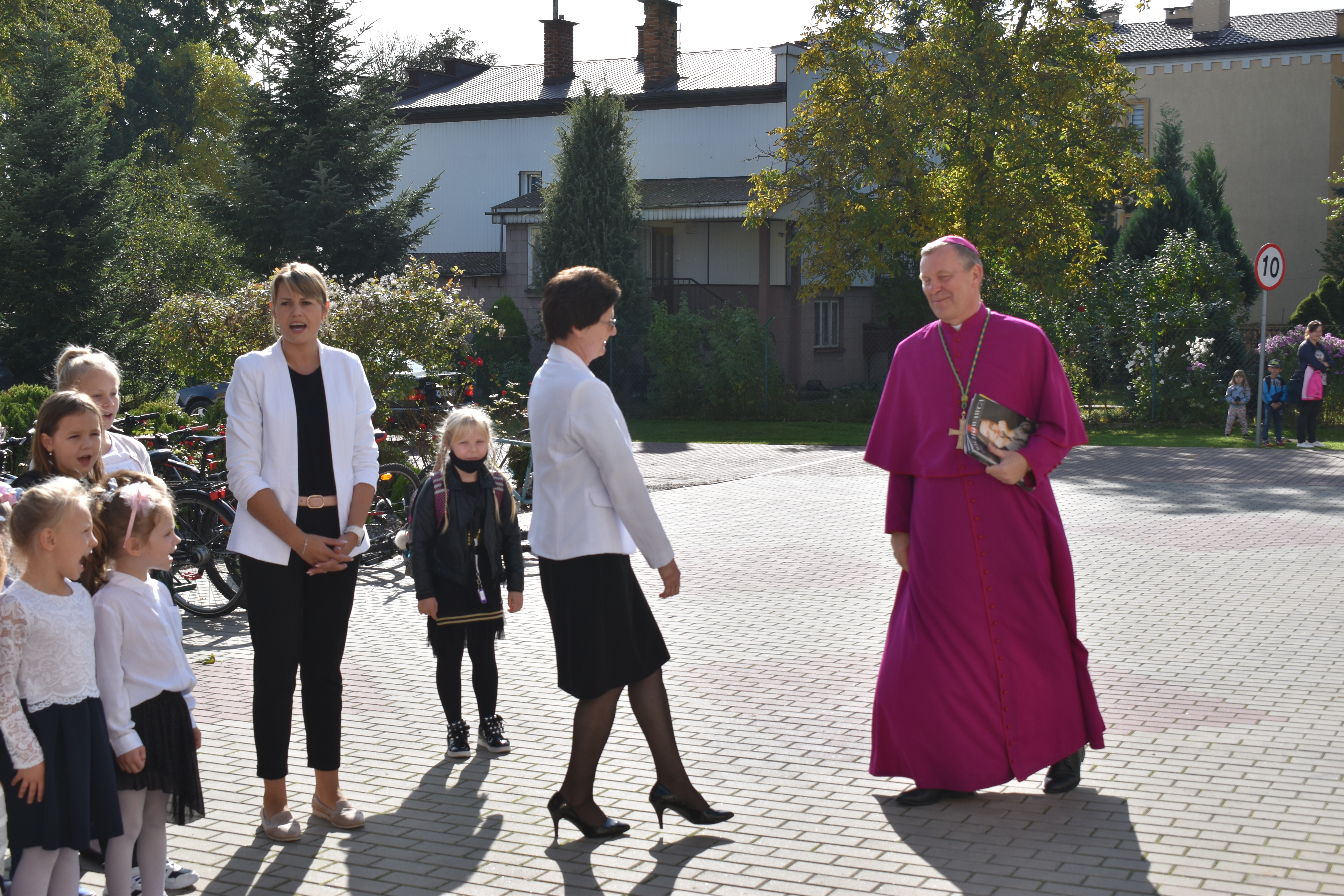 Wyjątkowego gościa, w wielką radością i w promieniach jesiennego słońca, powitali uczniowie klasy 8- Bartosz Pszczółka, Maja Machnio oraz Albert Stankowski, który wręczył Jego Ekscelencji, przygotowaną, pod opieką Pani Ewy Banaszczyk, przepiękną ikonę. Następnie, w imieniu całej społeczności szkolnej, księdza biskupa powitała Pani Dyrektor Małgorzata Trelka, a tuż po niej, kilka słów skierowali do Gościa najmłodsi uczniowie z oddziału przedszkolnego. Po powitaniu ksiądz biskup skierował do wszystkich zgromadzonych ciepłe i pouczające słowa. Podkreślił, jak ważne w dzisiejszych czasach jest wychowanie i uczenie młodego pokolenia wiary, tradycji oraz miłości do Ojczyzny i drugiego człowieka. Nauczycielom podziękował za stwarzanie klimatu życzliwości dla obecności Kościoła w szkole oraz jego zadań duszpasterskich. Spotkanie zakończyło się udzieleniem pasterskiego błogosławieństwa dla całej społeczności szkolnej. Swoją otwartością i pogodą ducha ksiądz biskup zyskał wiele sympatii wśród uczniów naszej szkoły, którzy niezwykle spontanicznie okazywali swoją radość i zadowolenie z odwiedzin zacnego Gościa.