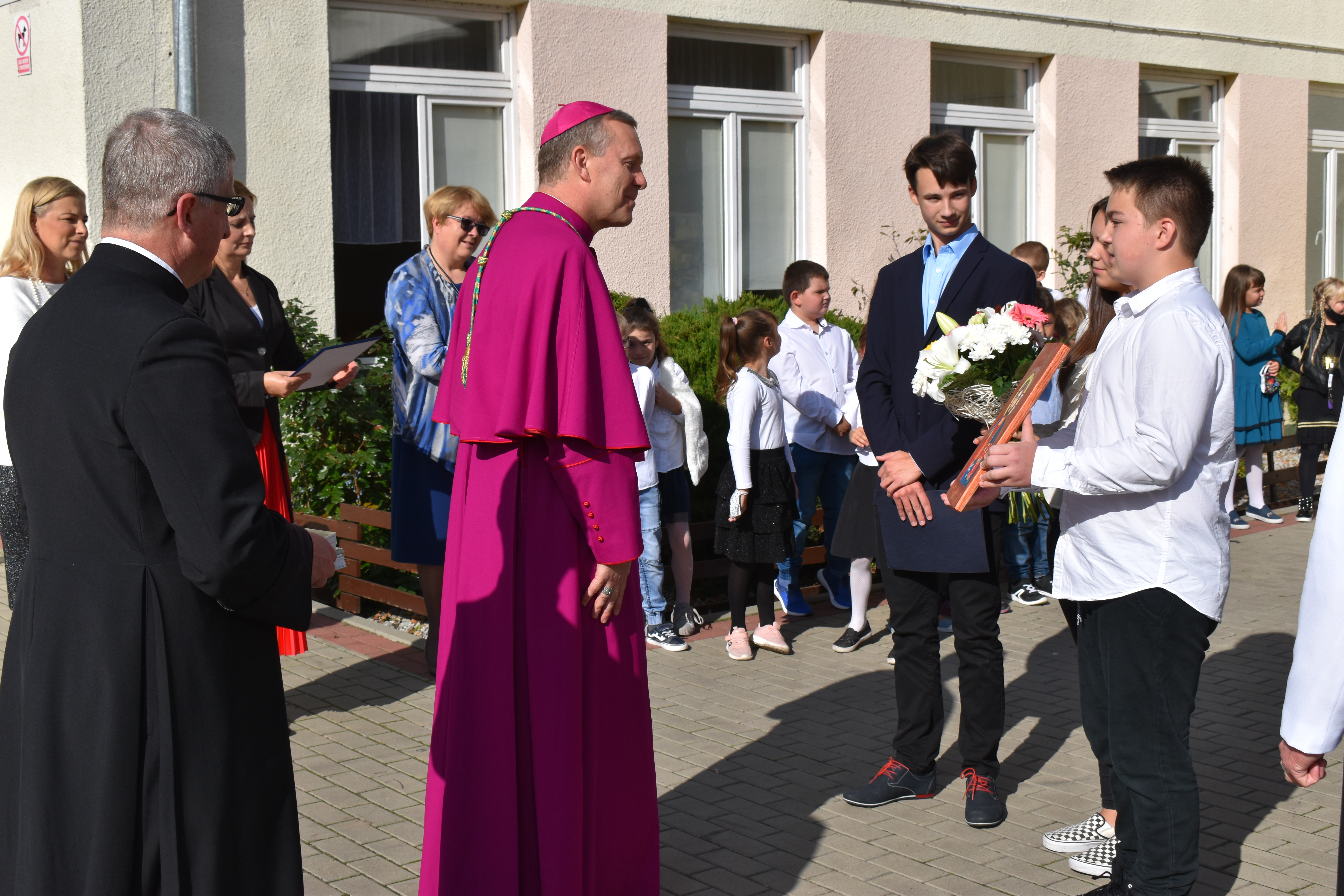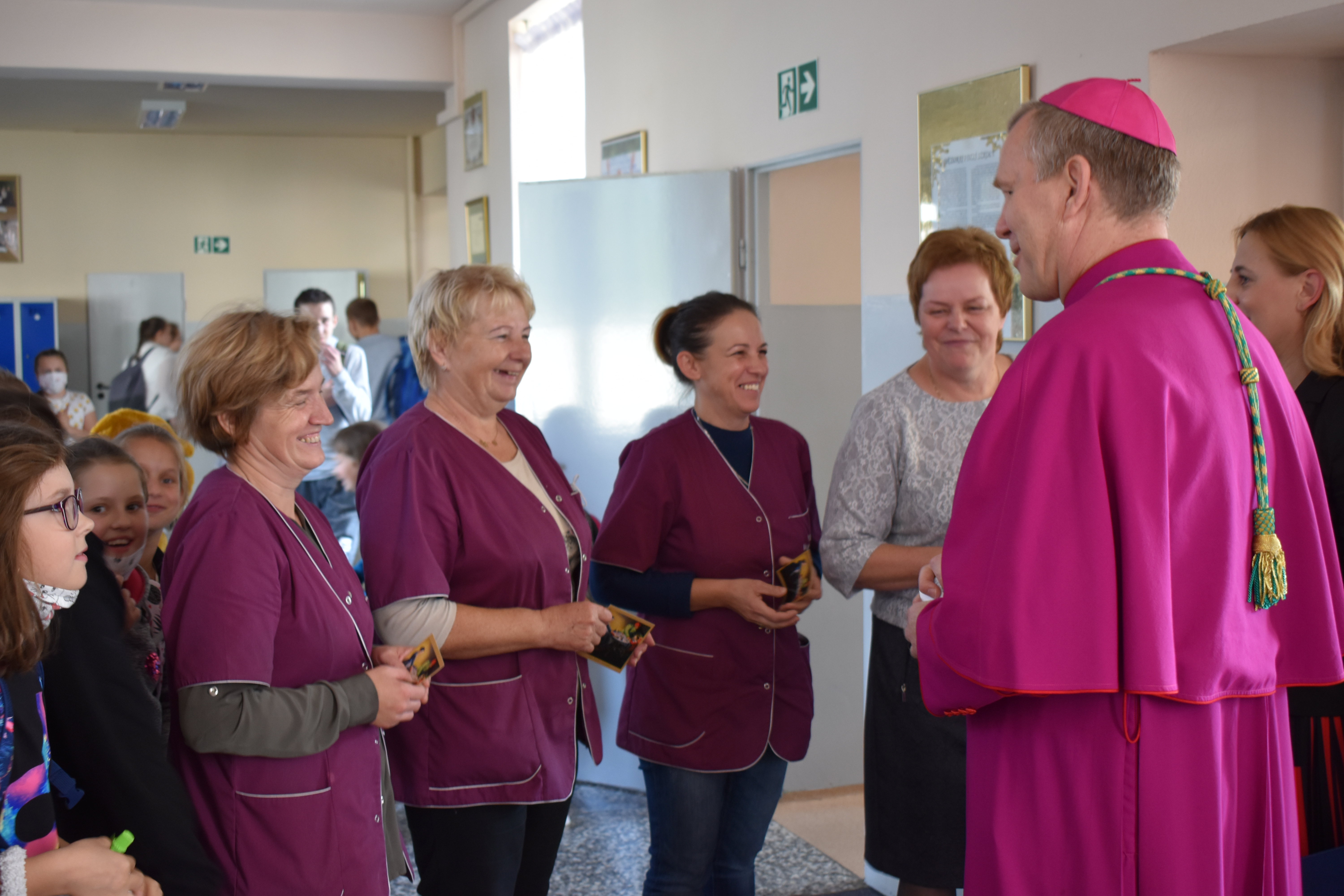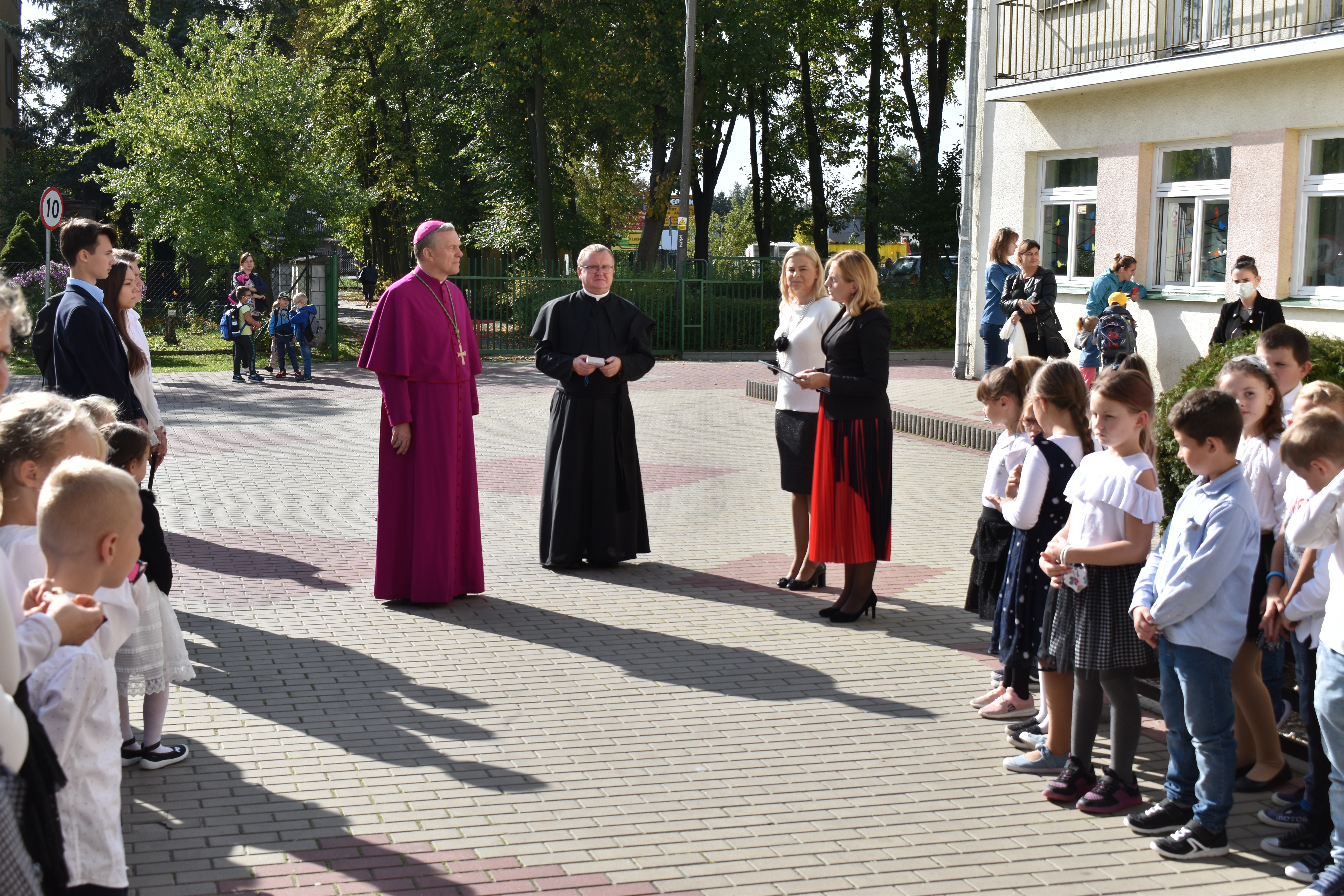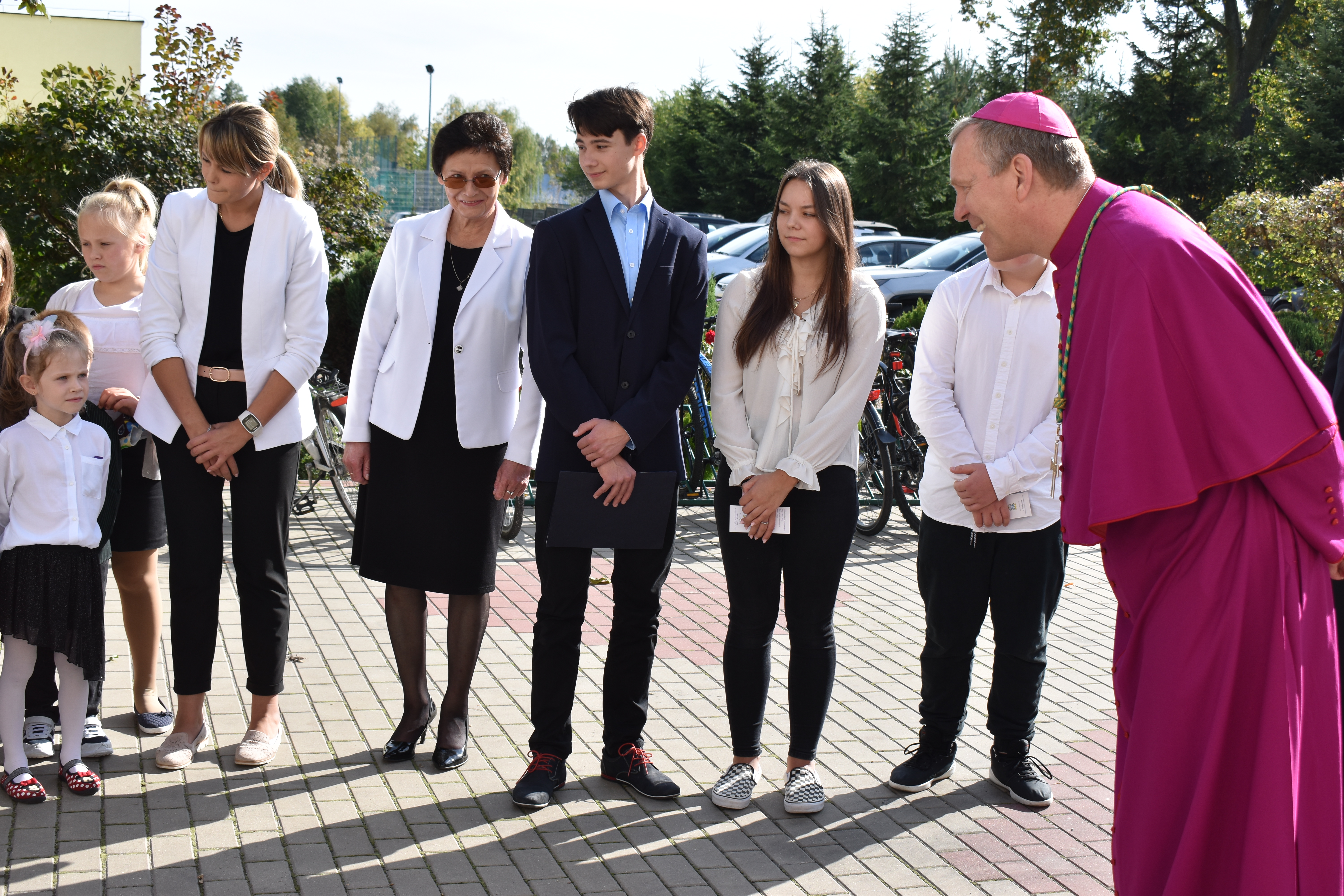 Wyjątkowego gościa, w wielką radością i w promieniach jesiennego słońca, powitali uczniowie klasy 8- Bartosz Pszczółka, Maja Machnio oraz Albert Stankowski, który wręczył Jego Ekscelencji, przygotowaną, pod opieką Pani Ewy Banaszczyk, przepiękną ikonę. Następnie, w imieniu całej społeczności szkolnej, księdza biskupa powitała Pani Dyrektor Małgorzata Trelka, a tuż po niej, kilka słów skierowali do Gościa najmłodsi uczniowie z oddziału przedszkolnego. Po powitaniu ksiądz biskup skierował do wszystkich zgromadzonych ciepłe i pouczające słowa. Podkreślił, jak ważne w dzisiejszych czasach jest wychowanie i uczenie młodego pokolenia wiary, tradycji oraz miłości do Ojczyzny i drugiego człowieka. Nauczycielom podziękował za stwarzanie klimatu życzliwości dla obecności Kościoła w szkole oraz jego zadań duszpasterskich. Spotkanie zakończyło się udzieleniem pasterskiego błogosławieństwa dla całej społeczności szkolnej. Swoją otwartością i pogodą ducha ksiądz biskup zyskał wiele sympatii wśród uczniów naszej szkoły, którzy niezwykle spontanicznie okazywali swoją radość i zadowolenie z odwiedzin zacnego Gościa.