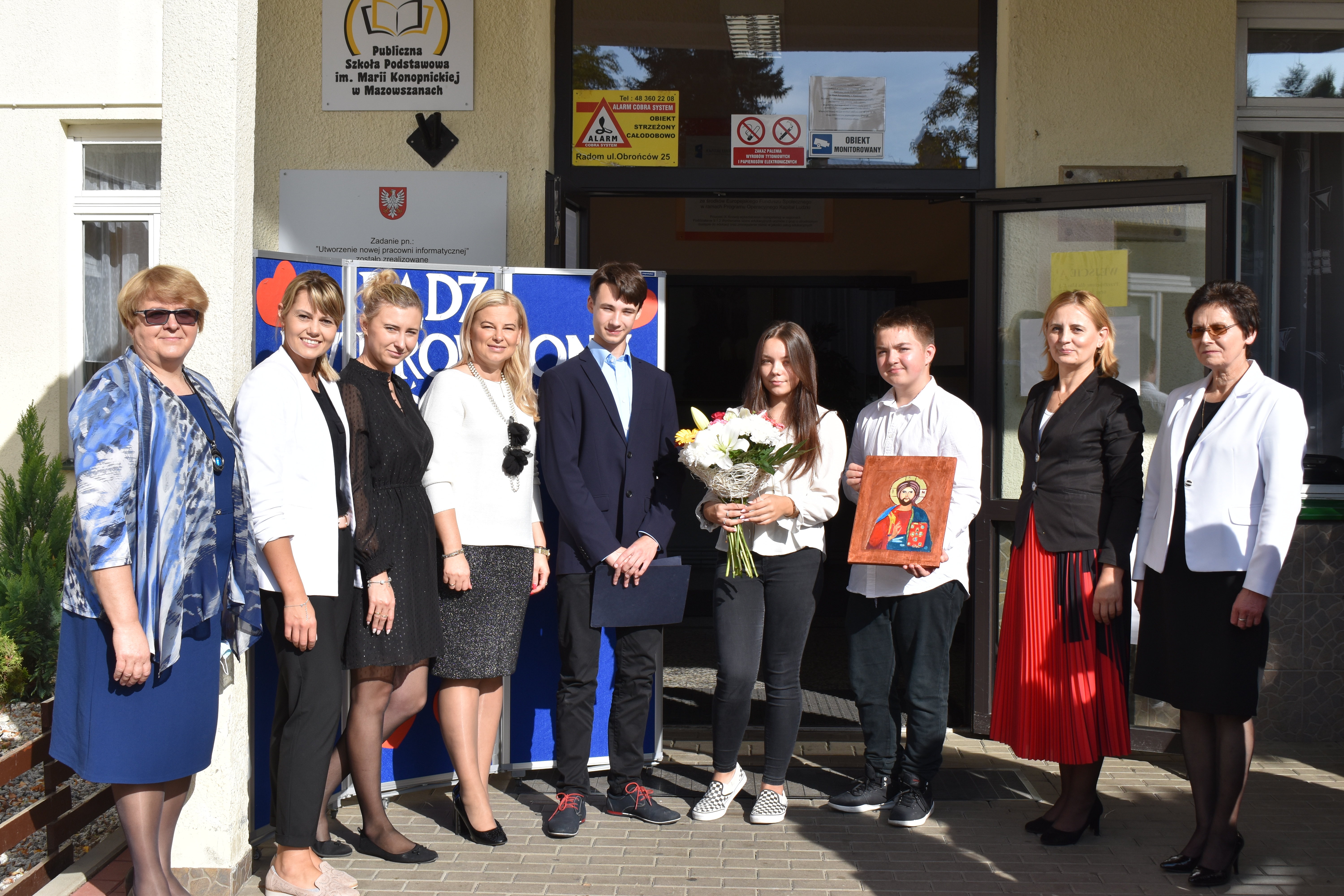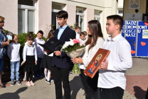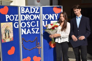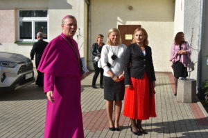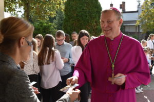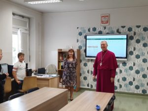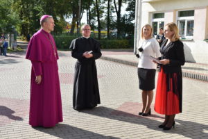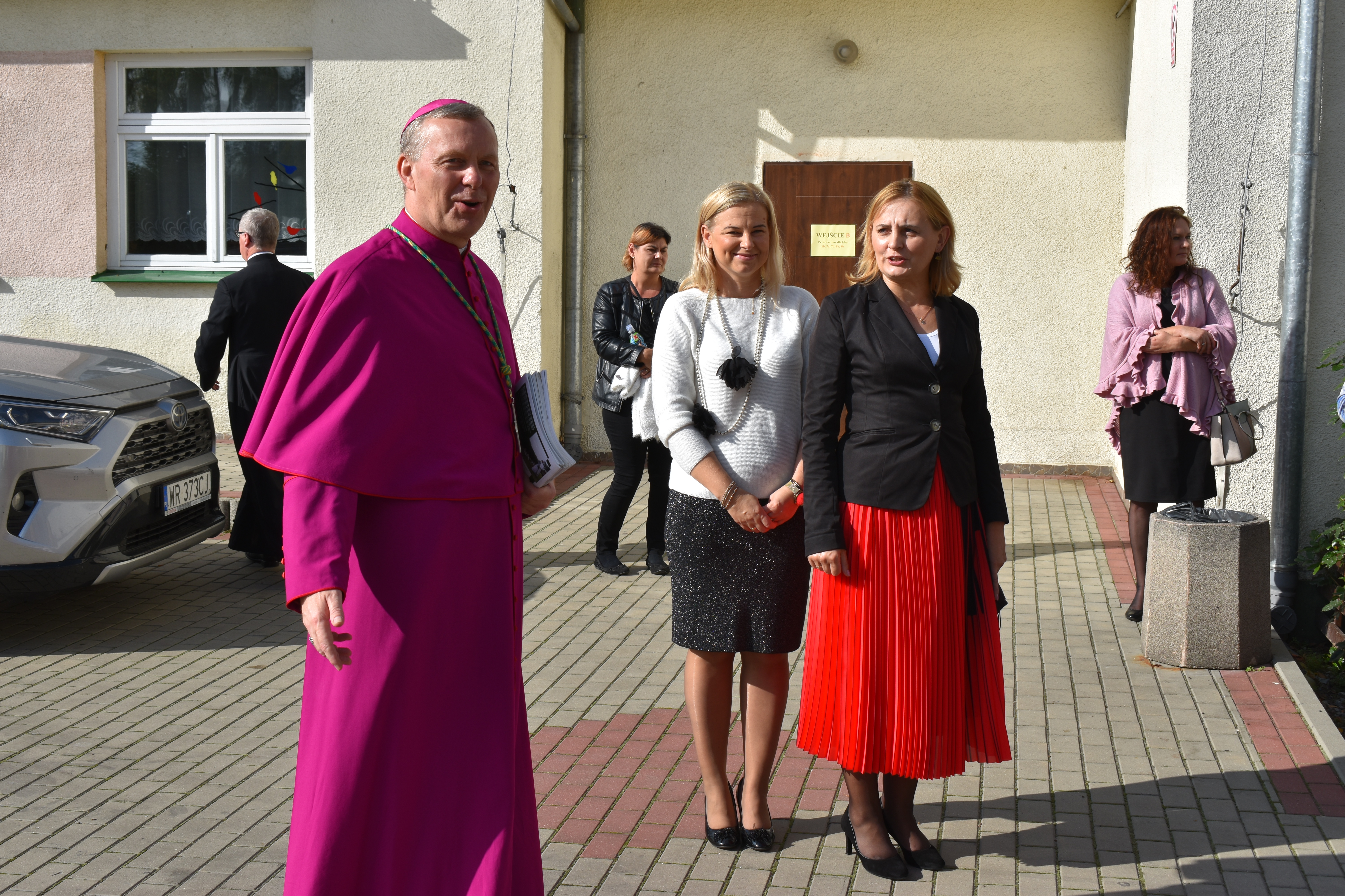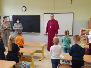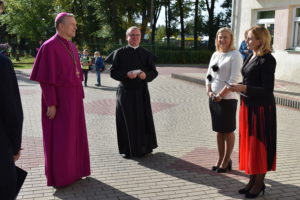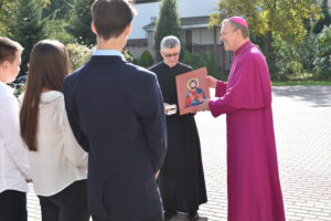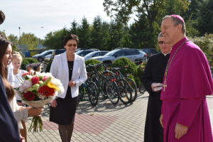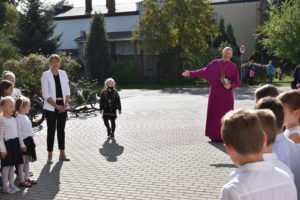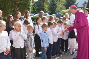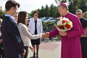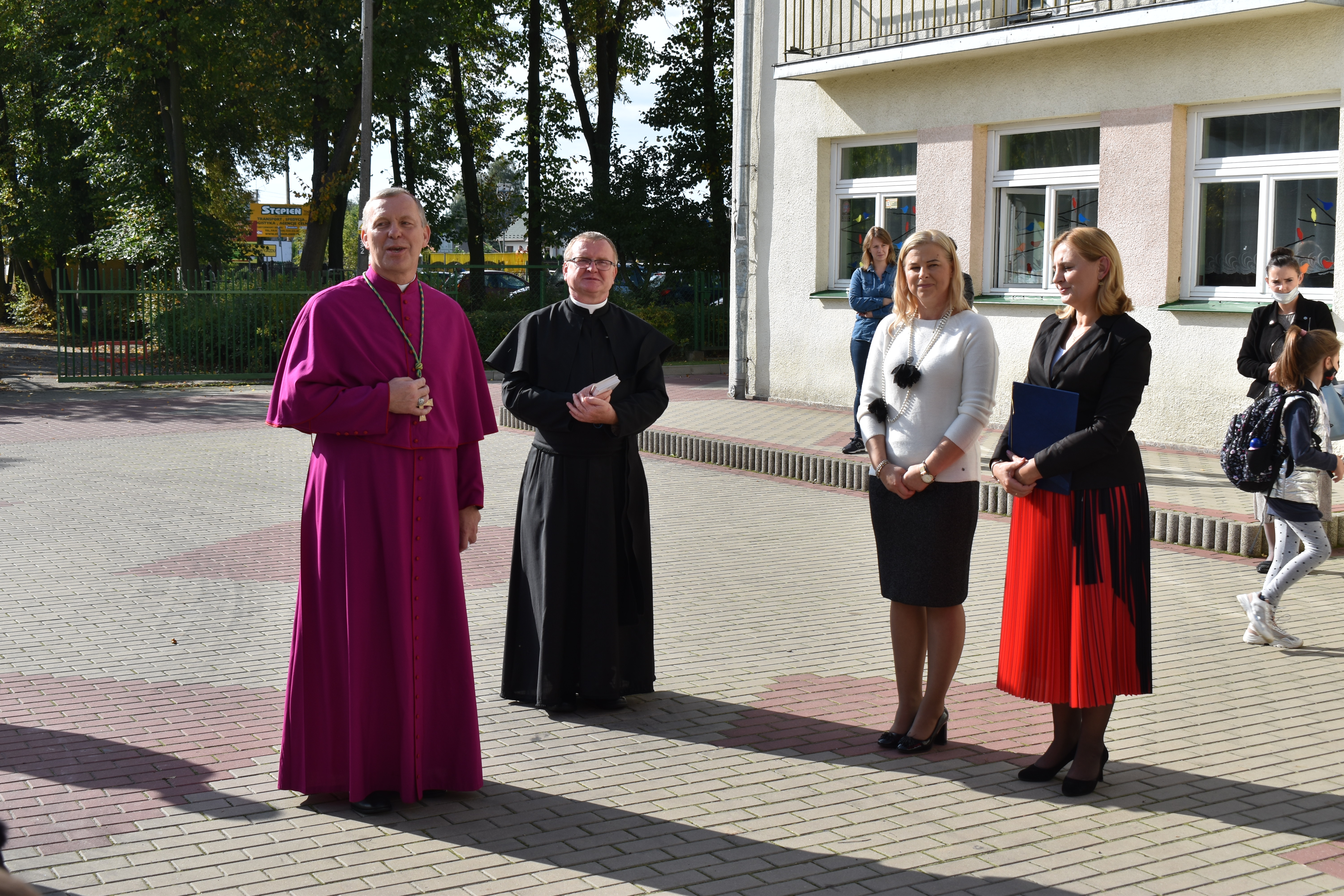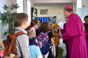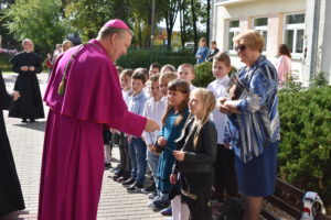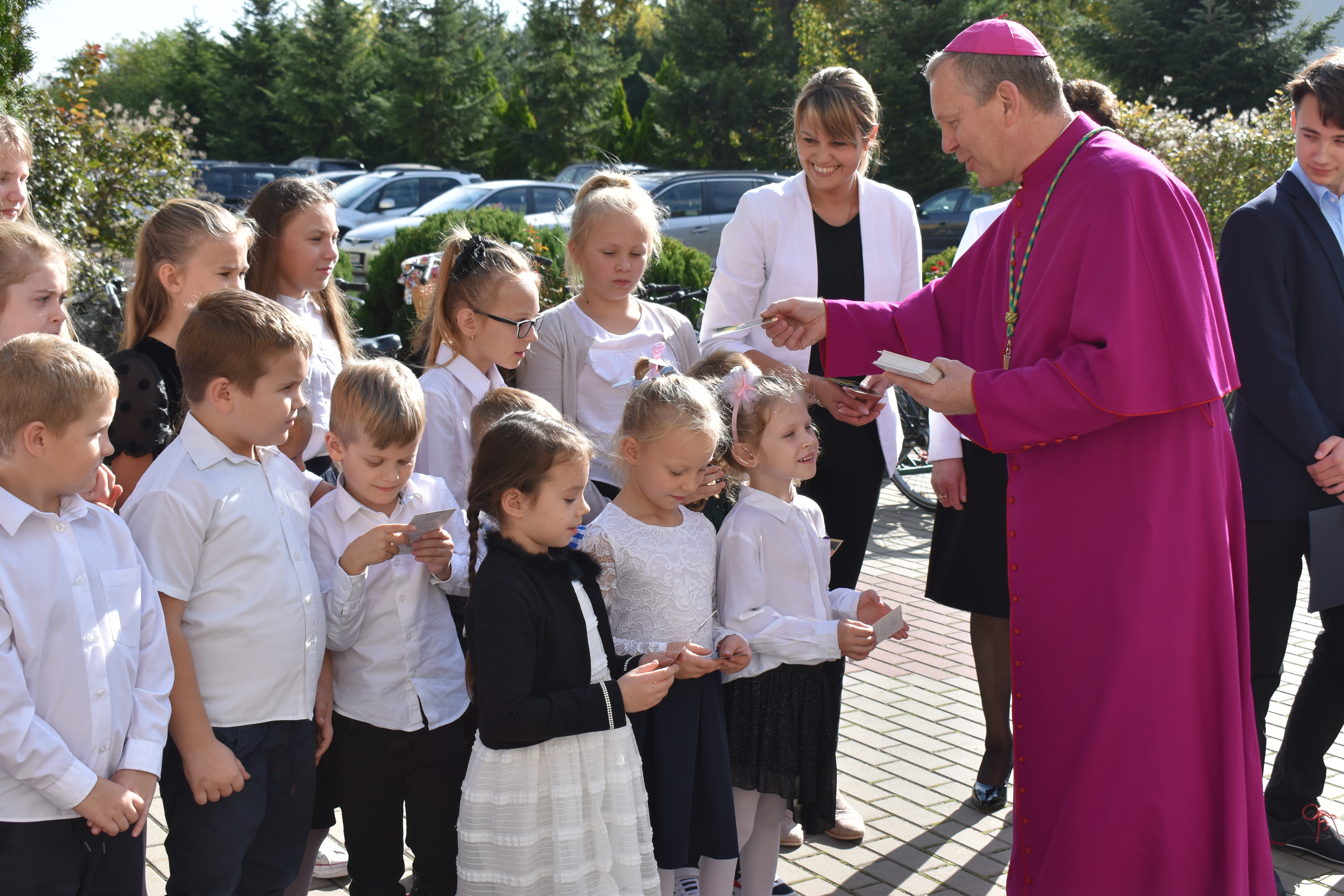Wyjątkowego gościa, w wielką radością i w promieniach jesiennego słońca, powitali uczniowie klasy 8- Bartosz Pszczółka, Maja Machnio oraz Albert Stankowski, który wręczył Jego Ekscelencji, przygotowaną, pod opieką Pani Ewy Banaszczyk, przepiękną ikonę. Następnie, w imieniu całej społeczności szkolnej, księdza biskupa powitała Pani Dyrektor Małgorzata Trelka, a tuż po niej, kilka słów skierowali do Gościa najmłodsi uczniowie z oddziału przedszkolnego. Po powitaniu ksiądz biskup skierował do wszystkich zgromadzonych ciepłe i pouczające słowa. Podkreślił, jak ważne w dzisiejszych czasach jest wychowanie i uczenie młodego pokolenia wiary, tradycji oraz miłości do Ojczyzny i drugiego człowieka. Nauczycielom podziękował za stwarzanie klimatu życzliwości dla obecności Kościoła w szkole oraz jego zadań duszpasterskich. Spotkanie zakończyło się udzieleniem pasterskiego błogosławieństwa dla całej społeczności szkolnej. Swoją otwartością i pogodą ducha ksiądz biskup zyskał wiele sympatii wśród uczniów naszej szkoły, którzy niezwykle spontanicznie okazywali swoją radość i zadowolenie z odwiedzin zacnego Gościa.