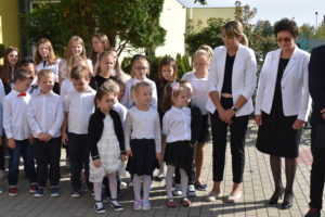 Na powitanie zabrzmiała piosenka „Bądź pozdrowiony Gościu nasz” w wykonaniu licznie zebranego Szkolnego Koła Wolontariatu oraz dzieci z klas Ob i II b.