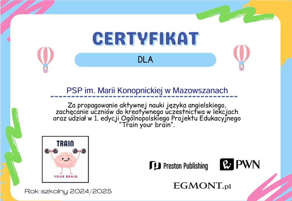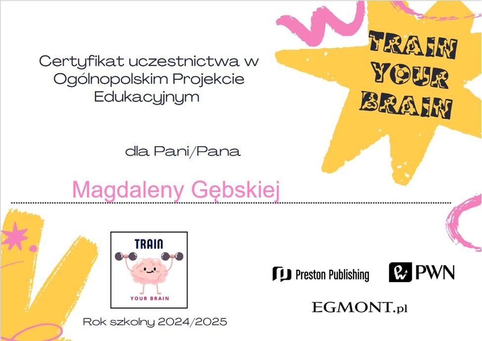W roku szkolnym 2024/2025 uczniowie klasy 4a, pod opieką p. M. Gębskiej, aktywnie uczestniczyli w Ogólnopolskim Projekcie Edukacyjnym „Train your brain”, którego głównym celem było rozwijanie kompetencji językowych poprzez kreatywne i angażujące działania edukacyjne. Projekt zakładał regularne ćwiczenie języka angielskiego w sposób dostosowany do wieku i możliwości uczniów, z naciskiem na zabawę, współpracę i myślenie logiczne.
