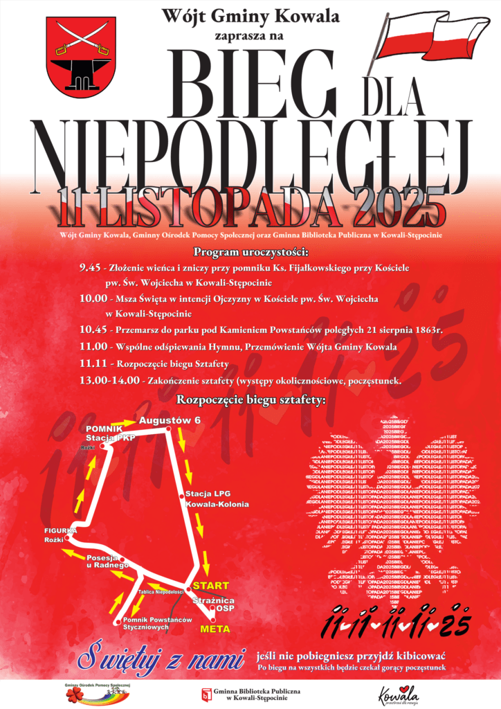 Zapraszamy do czynnego udziału w „Biegu dla Niepodległej”, organizowanym w ramach obchodów Narodowego Święta Niepodległości w dniu 11 listopada 2025 roku na terenie Gminy Kowala.