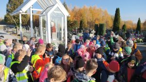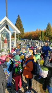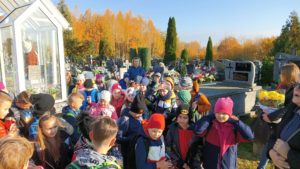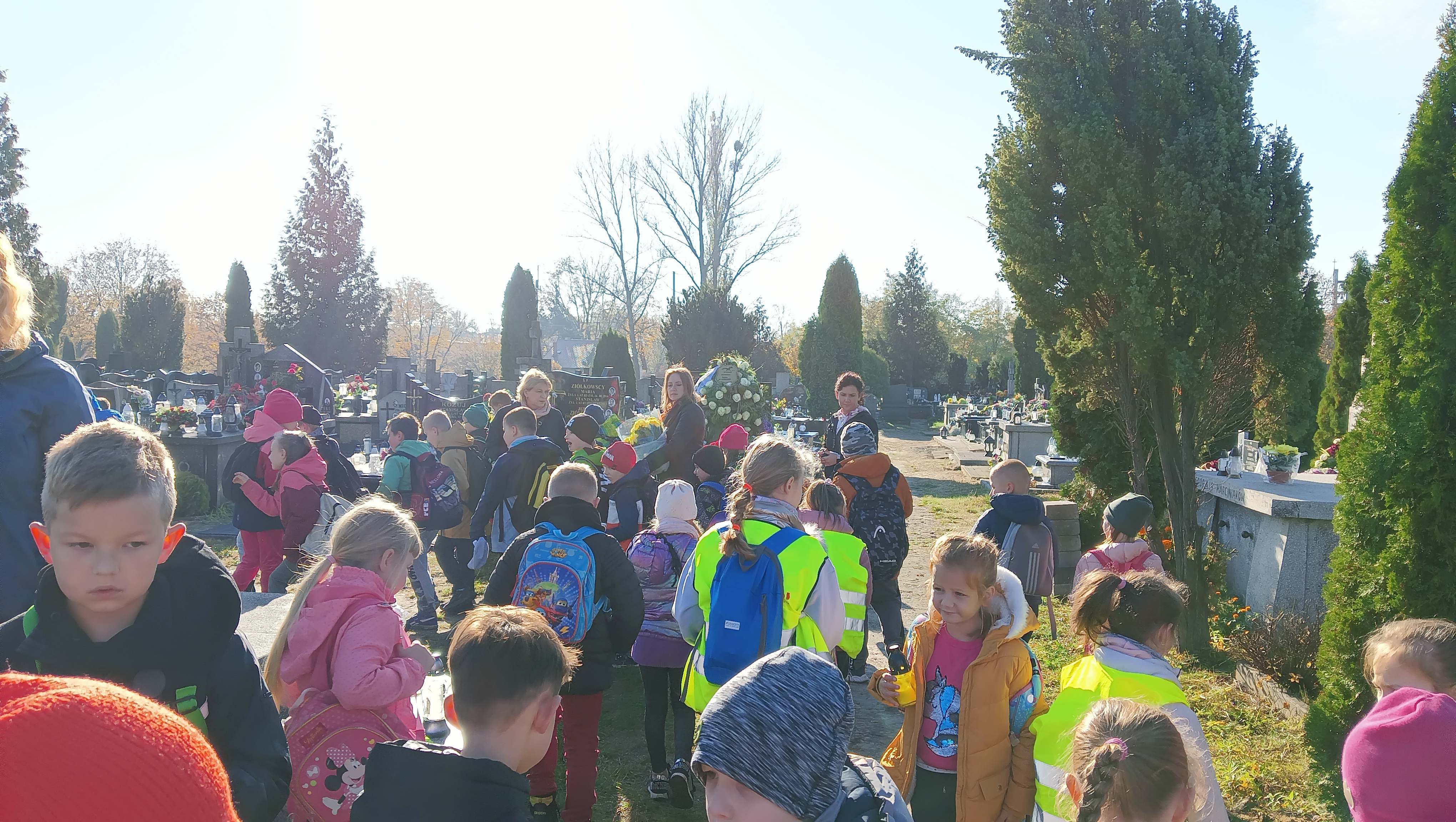 Dzieci wspólnie z paniami pomodliły się i zapaliły znicze przy grobach zmarłych nauczycieli i pracowników naszej szkoły. Spacer alejkami cmentarza był dla dzieci ogromnym przeżyciem. W czasie wycieczki dzieci poznawały tradycje i zwyczaje związane ze świętem zmarłych w naszej kulturze i religii. Zrozumiały też jak należy się zachowywać na cmentarzu, by oddać należyty hołd zmarłym i nie zakłócać spokoju osób odwiedzających to miejsce.