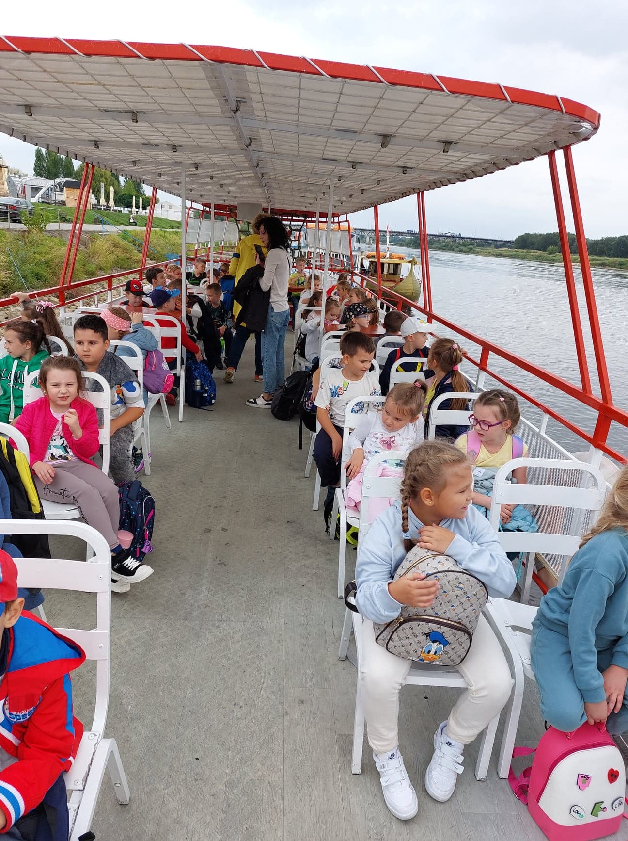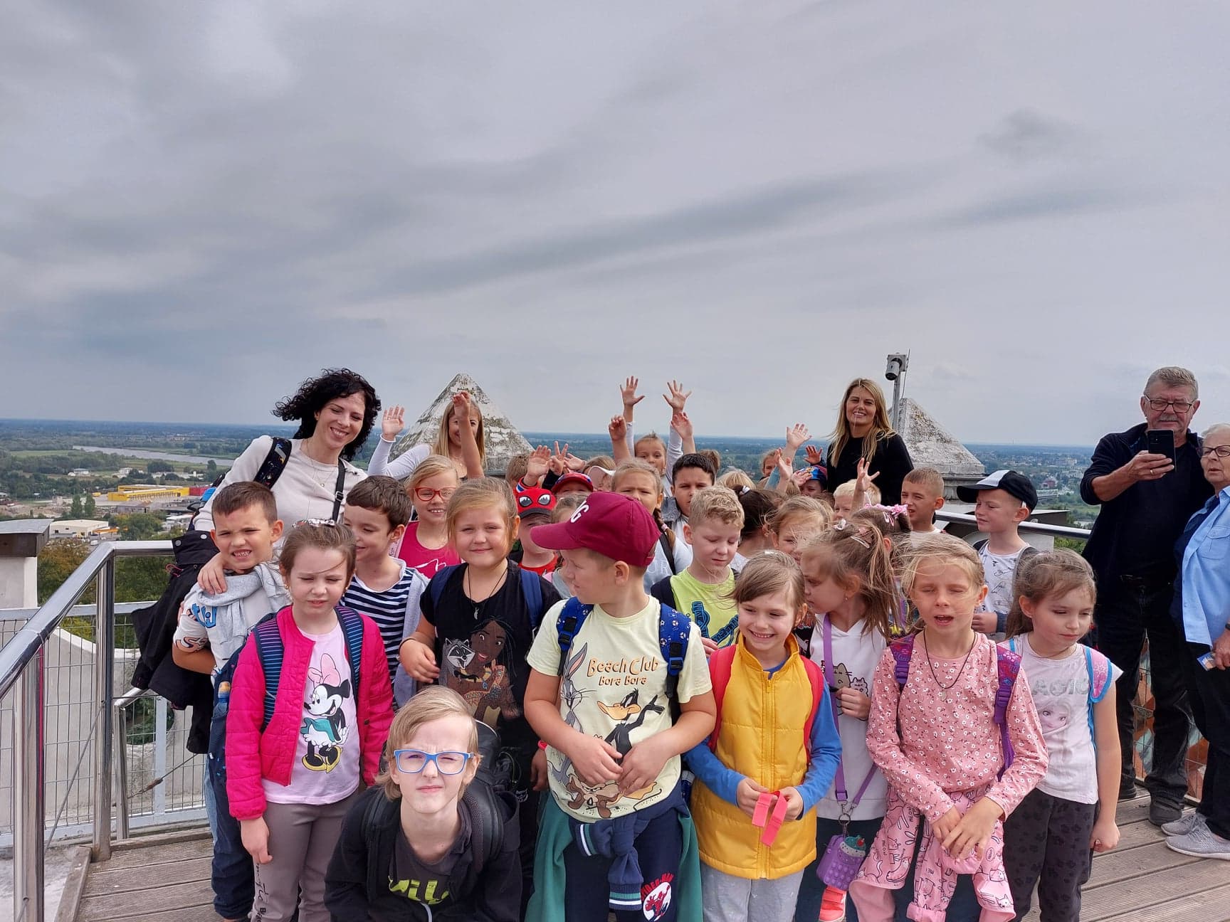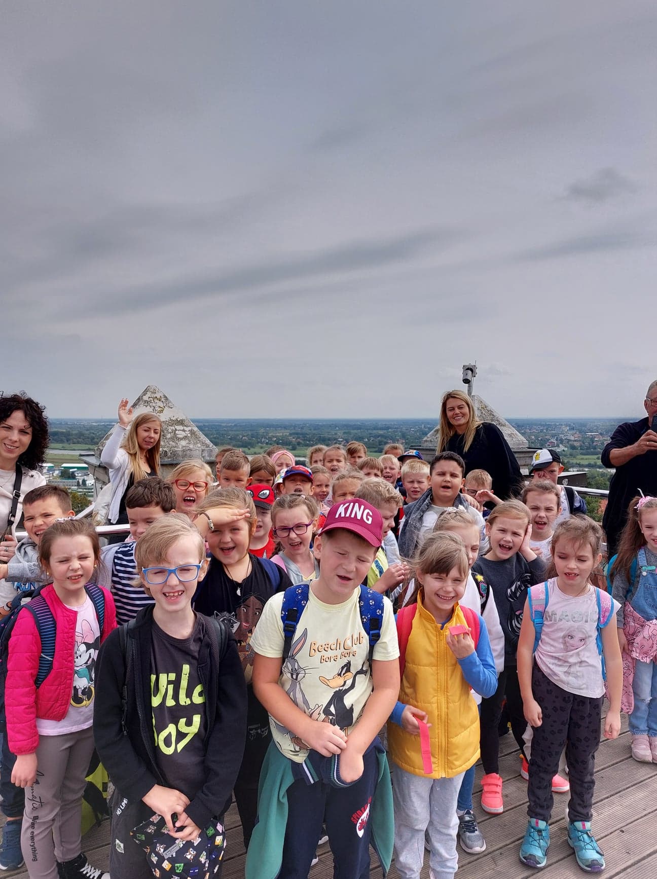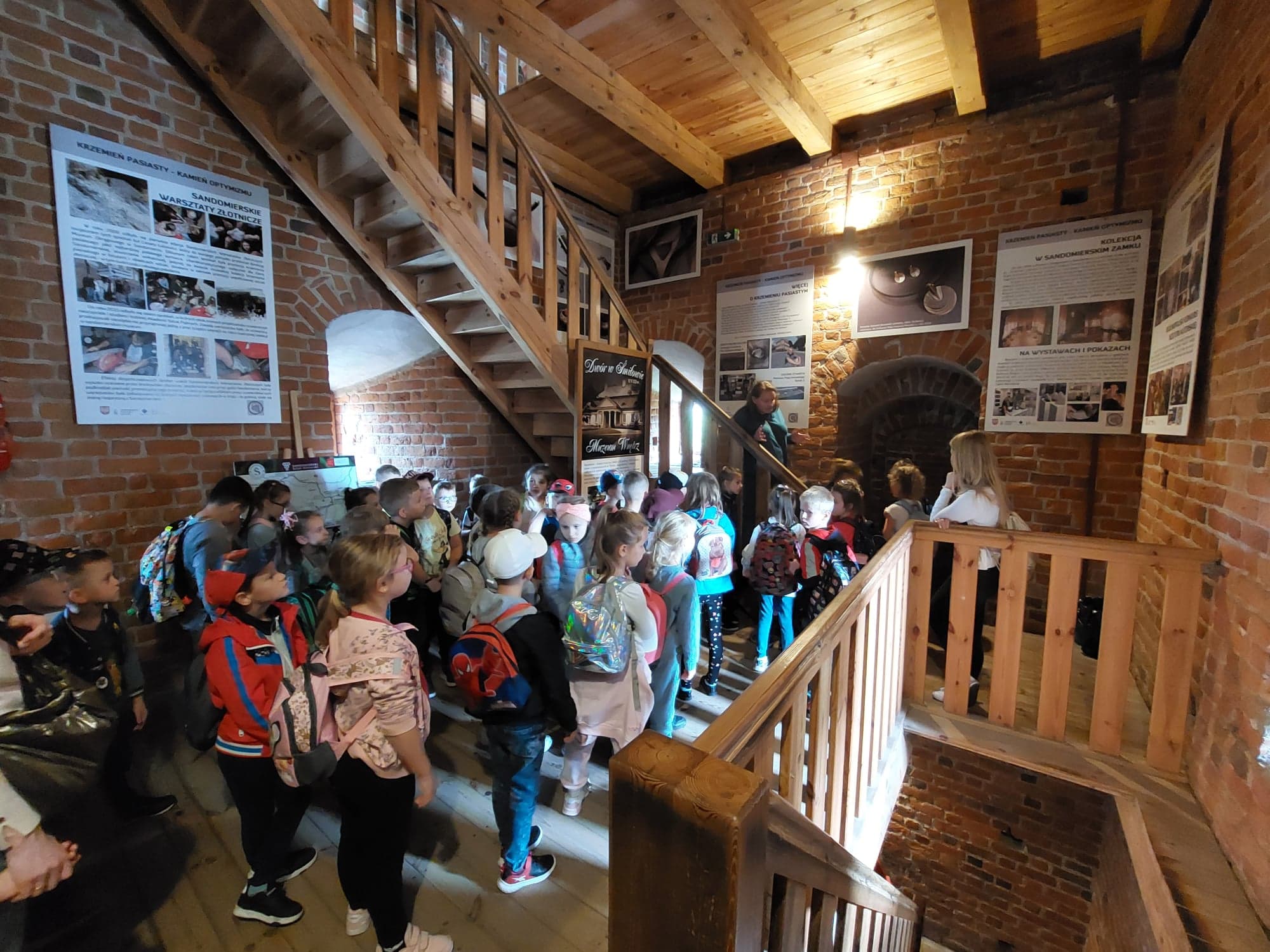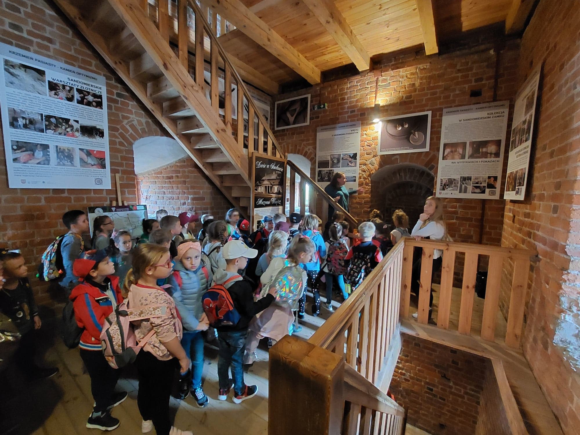 Za nami pierwsza wycieczka. Byliśmy w pięknym nadwiślańskim mieście – Sandomierzu. W czasie podróży podziwialiśmy krajobraz Wyżyny Sandomierskiej i widoczne pasmo Gór Świętokrzyskich. Sandomierz powitał nas piękną pogodą. Pani przewodnik opowiedziała nam różne fakty z historii Sandomierza. Powędrowaliśmy do Zbrojowni. Tam przeżywaliśmy chwile wielkiej radości, poznając dzieje miasta. Potem mogliśmy założyć stroje pochodzące z dawnych czasów. Niezapomniane wrażenia były w Podziemnej Trasie Turystycznej, na Bramie Opatowskiej, podczas własnoręcznego wybijania monety. Po zakupie pamiątek czekał nas pyszny obiad . Wycieczkę zakończył rejs statkiem po Wiśle pod okiem kapitana.