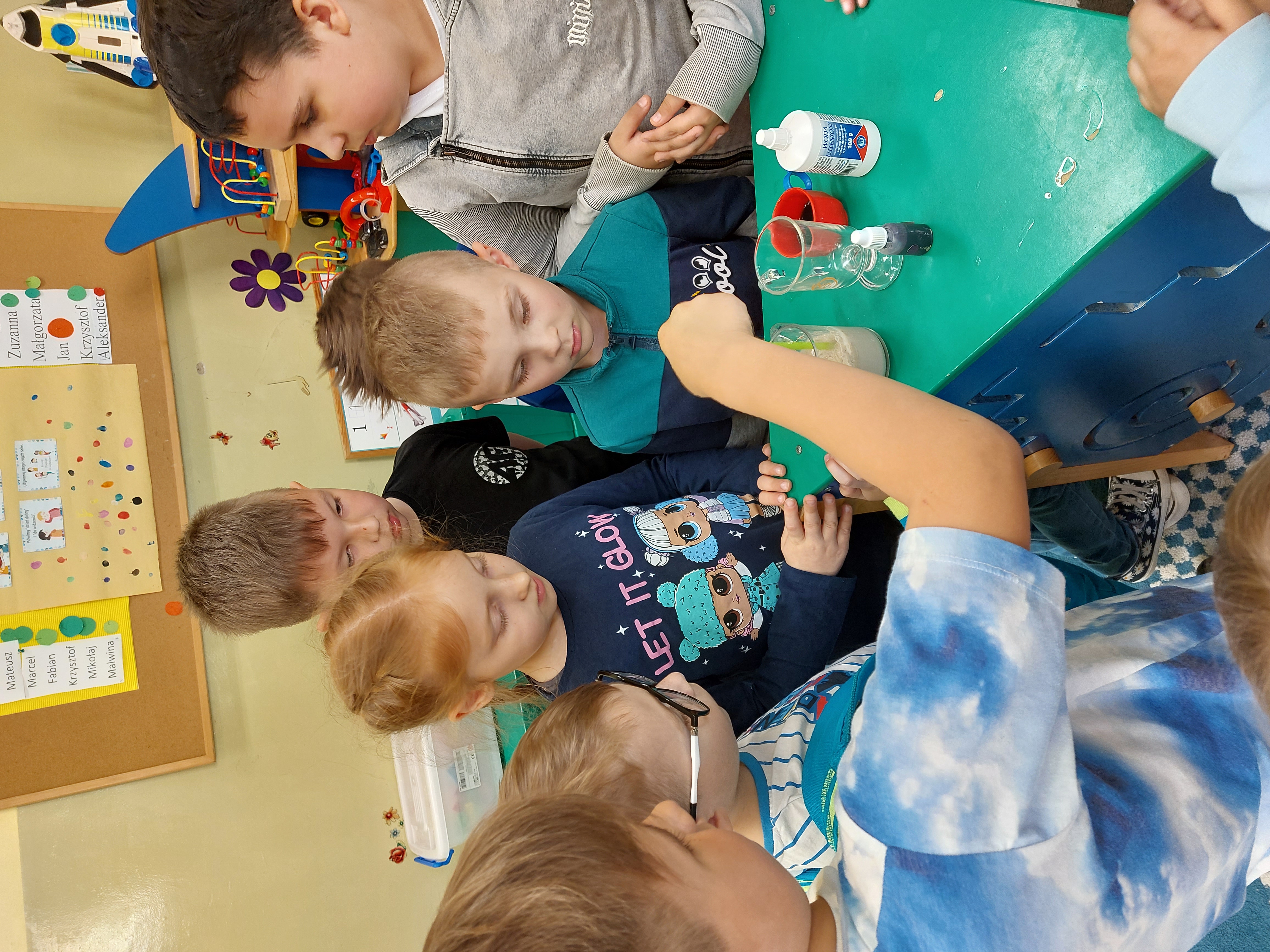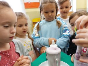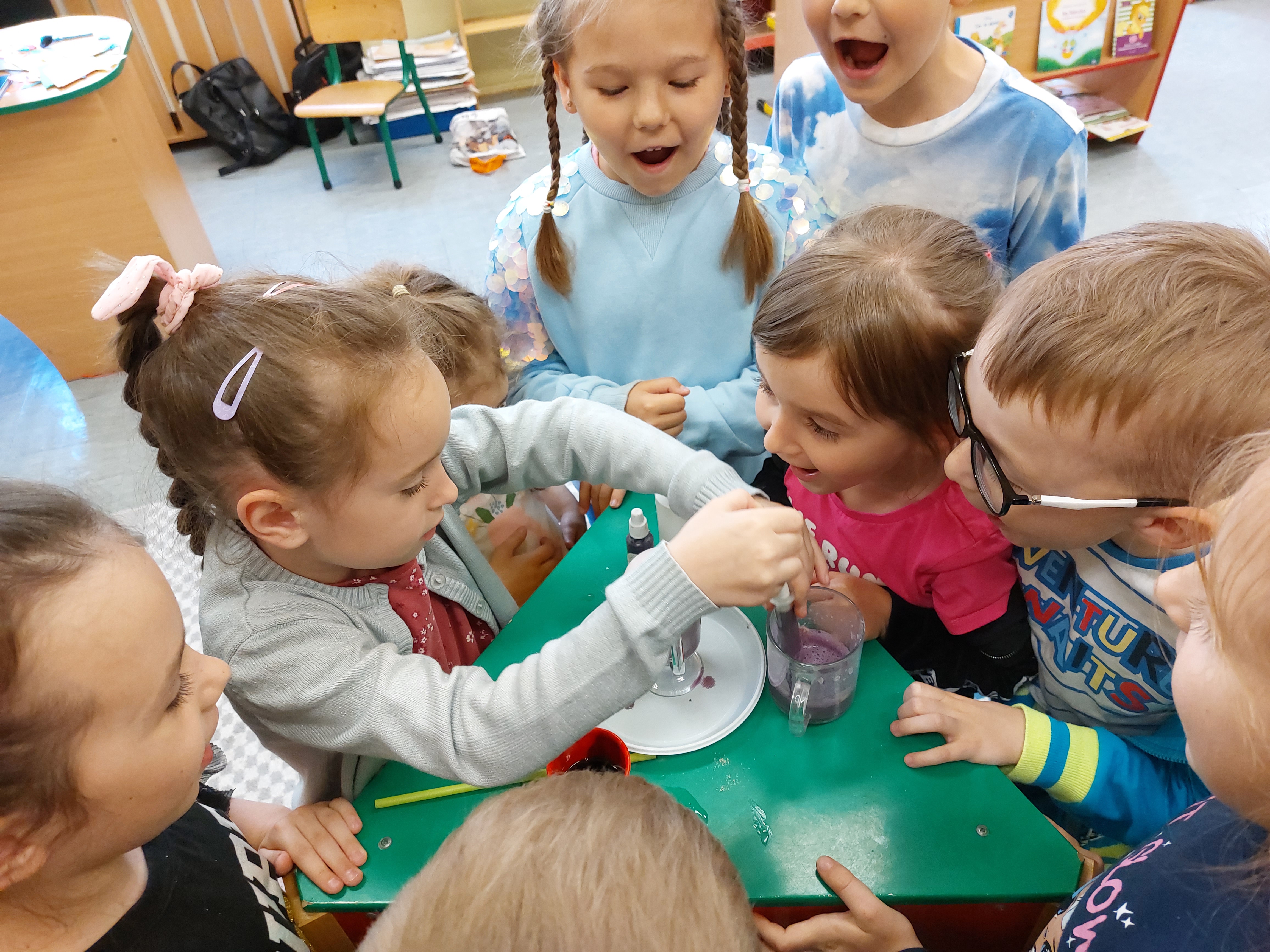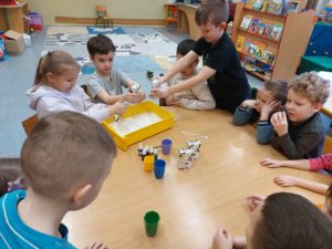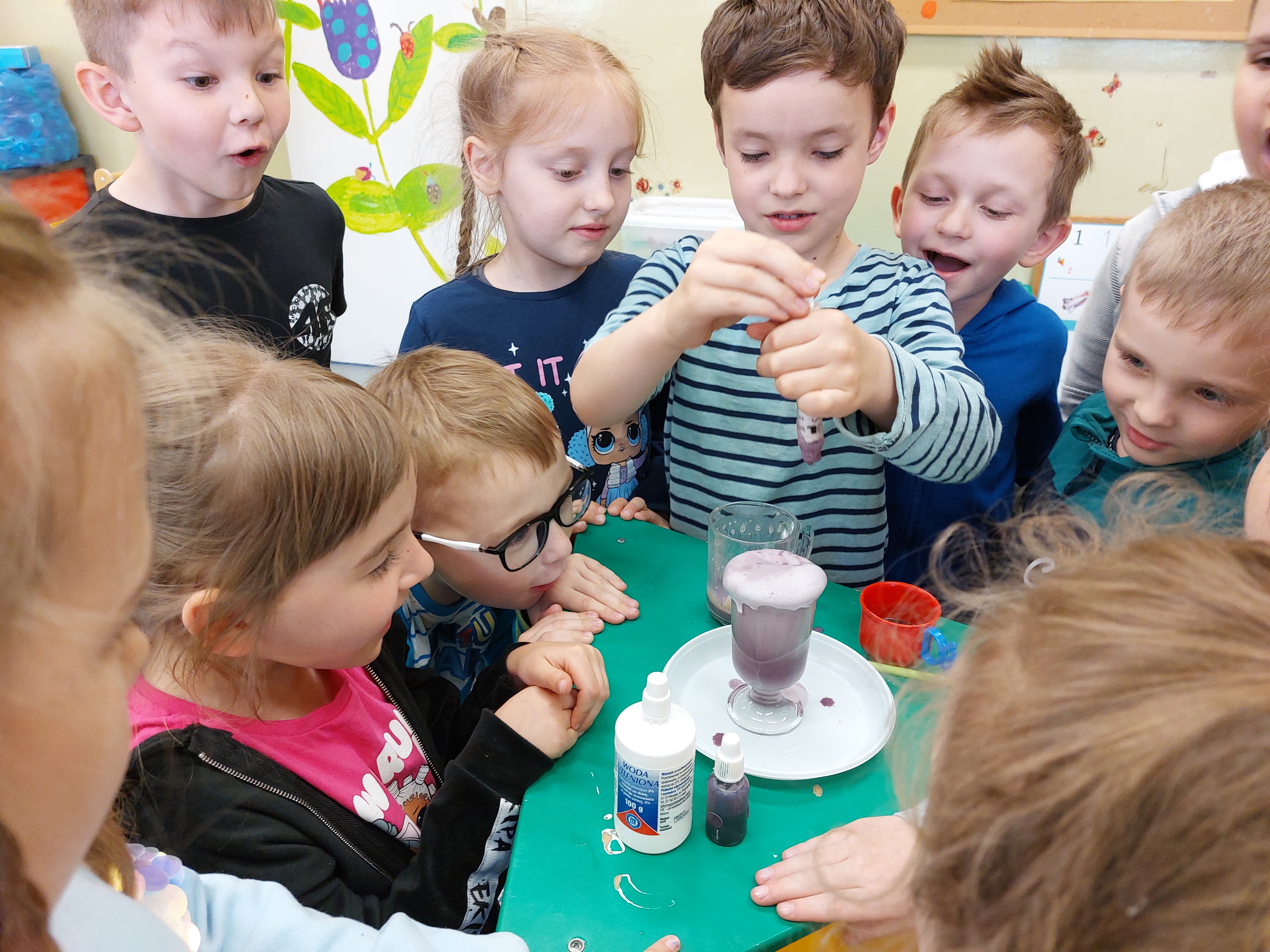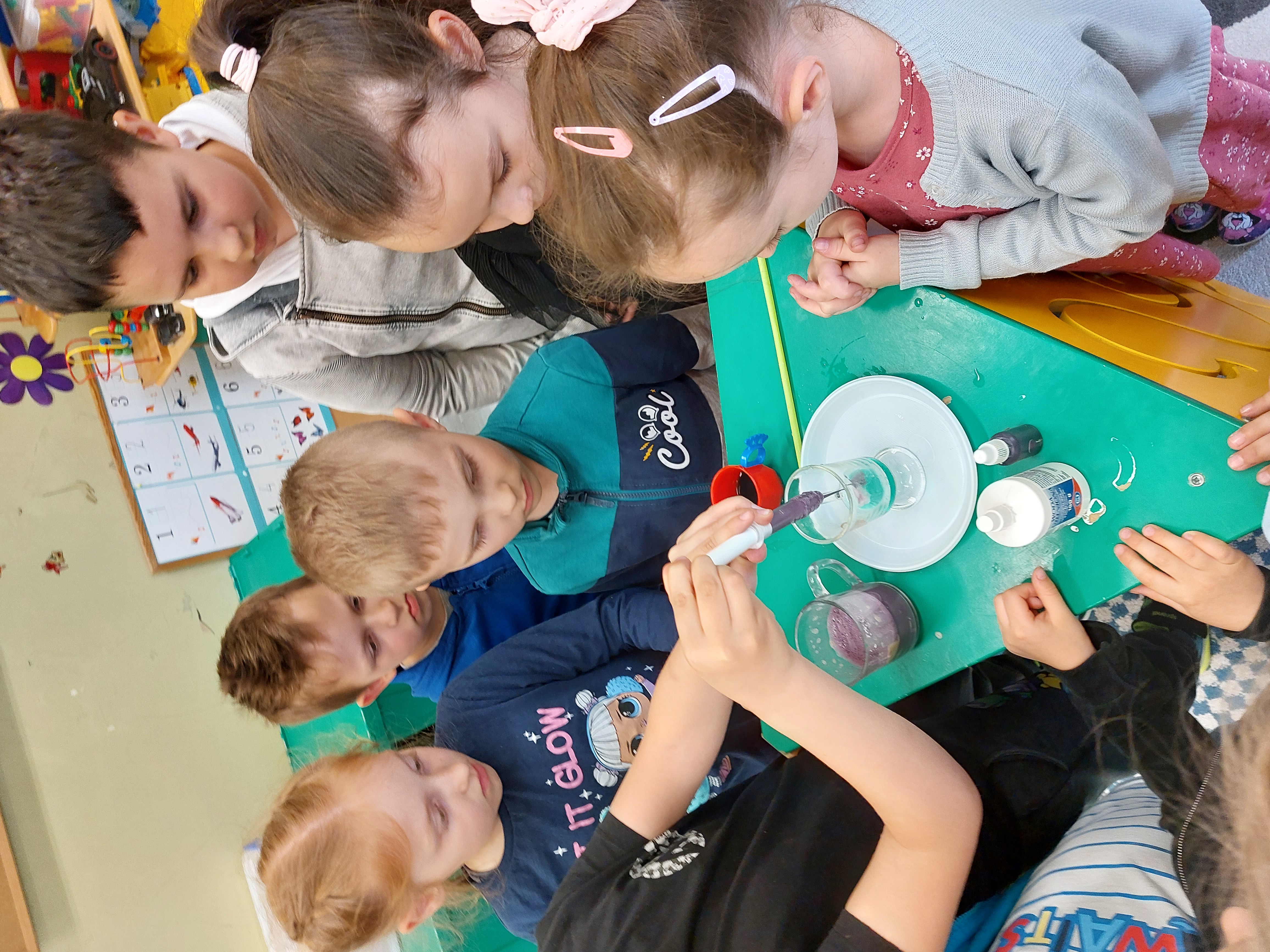 Dobiegły końca działania innowacyjne przedszkolaków z grupy 0b, które były krokiem w kierunku zaszczepienia wśród nich „mody na eksperymentowanie” i próbą rozbudzenia pasji naukowych i badawczych. Ogromny wpływ zabaw badawczych na rozwój i wychowanie dziecka związany jest z faktem, iż każda zabawa tego rodzaju niesie ze sobą ładunek pozytywnych emocji, co wspiera proces uczenia się. Najlepiej, bowiem zapamiętujemy to, co nam się miło kojarzy. Zabawy badawcze, doświadczenia, eksperymenty są też świetną okazją do kształtowania się w umyśle dziecka nowych operacji umysłowych takich jak: analiza, synteza, porównywanie i uogólnianie. Przy okazji można doskonalić wytrwałość, koncentrację uwagi i spostrzegawczość. To, co dzieci dotknęły, zobaczyły i samodzielnie wykonały, na długo zostanie w ich pamięci.