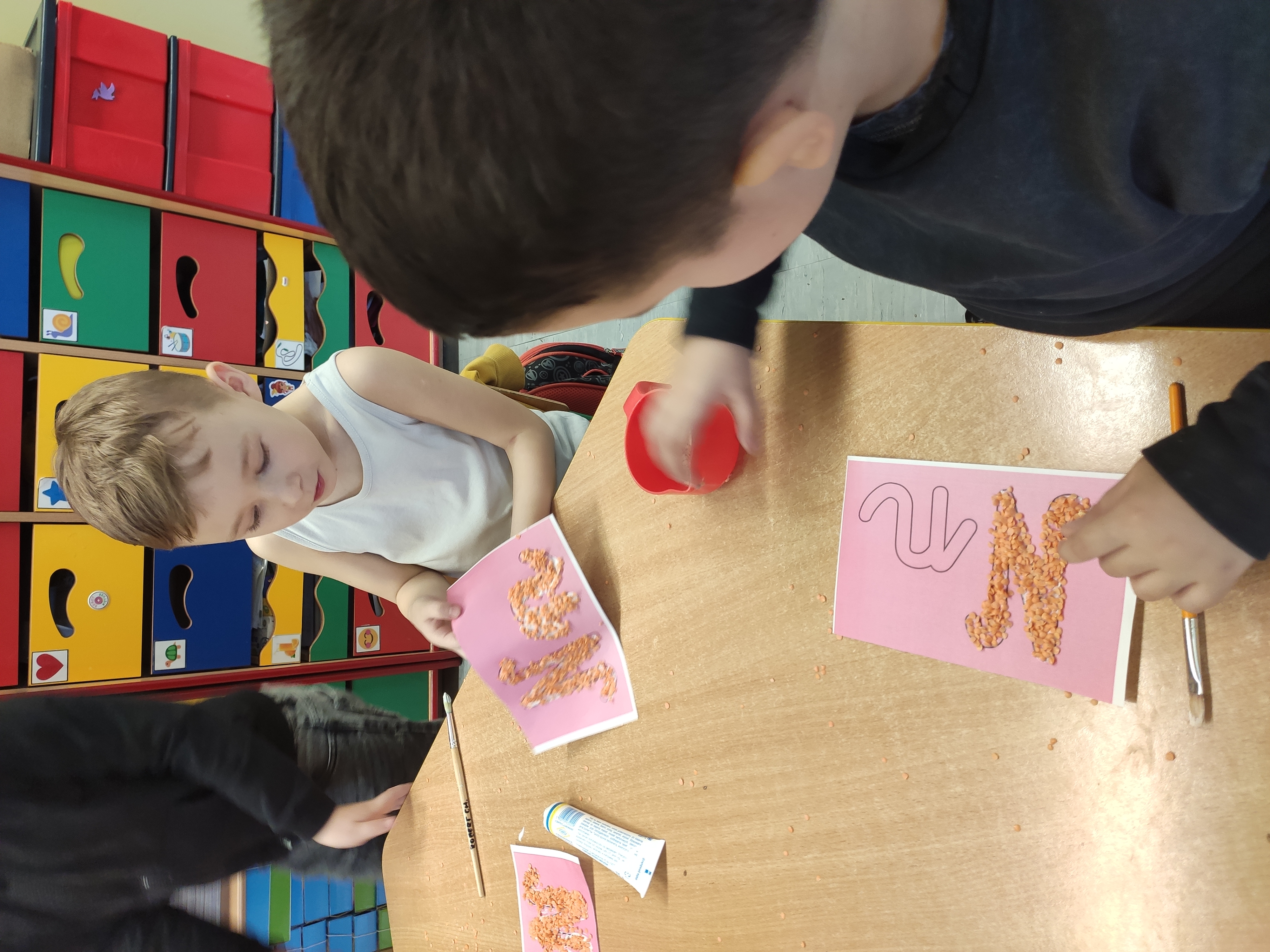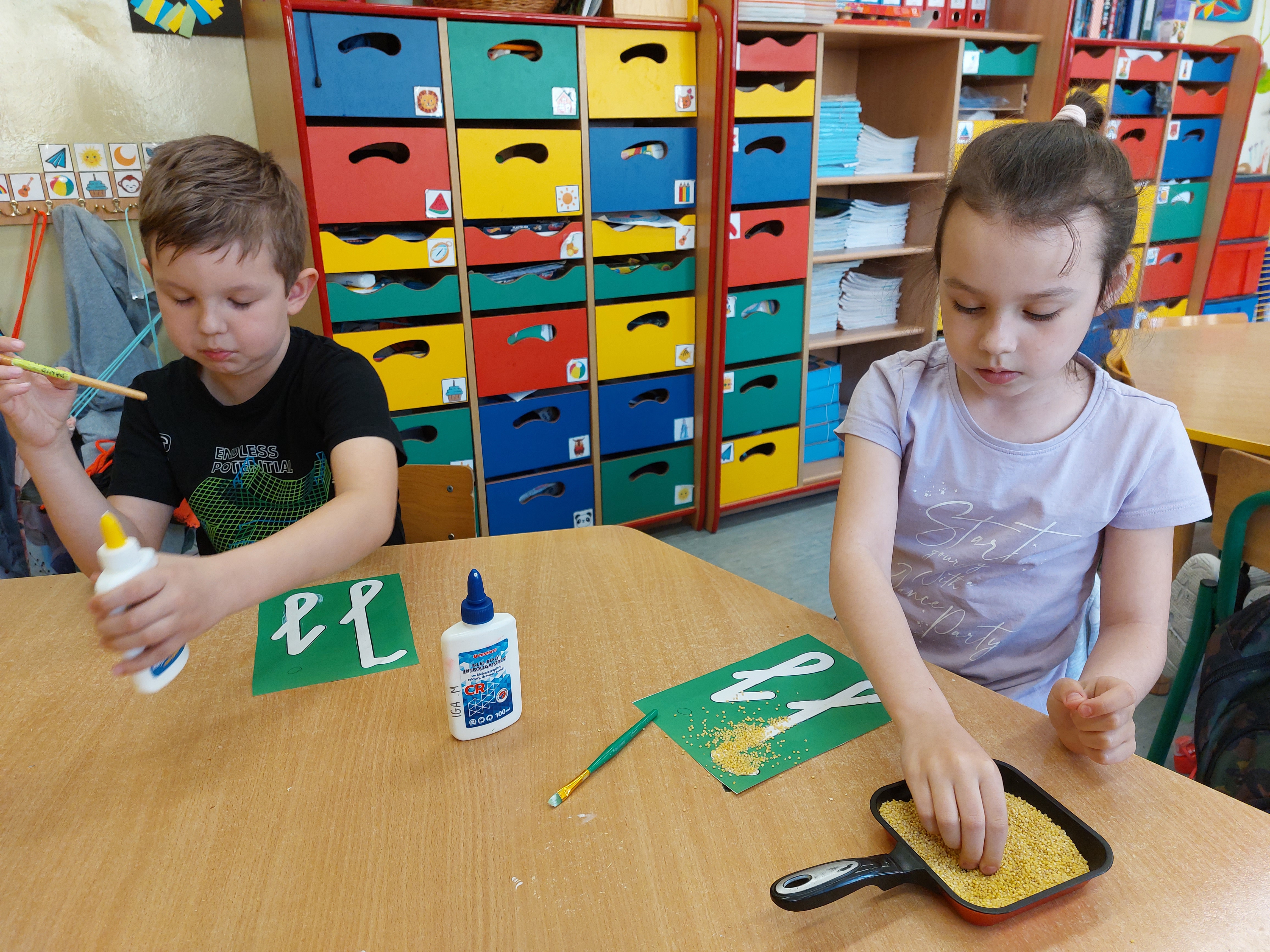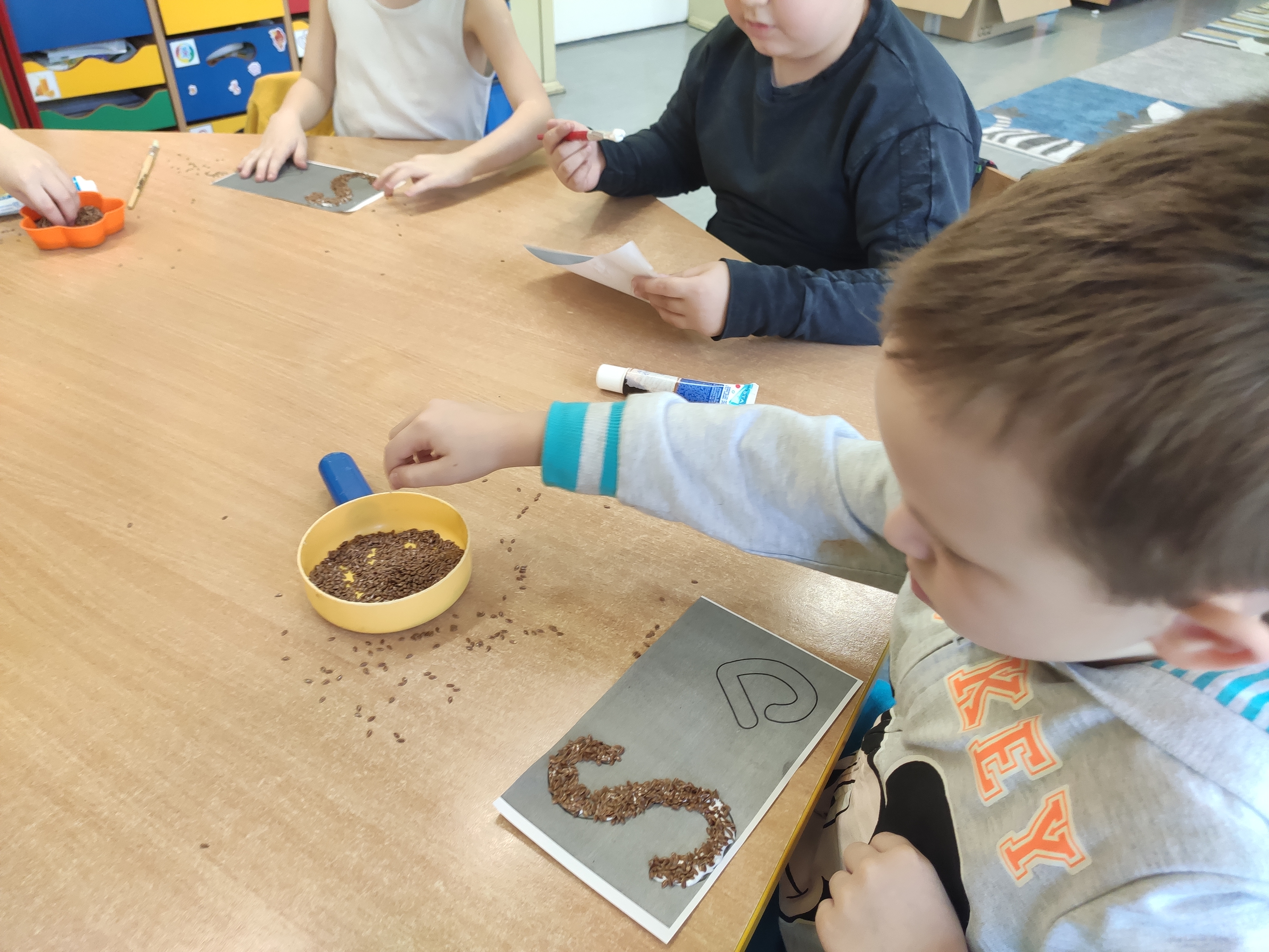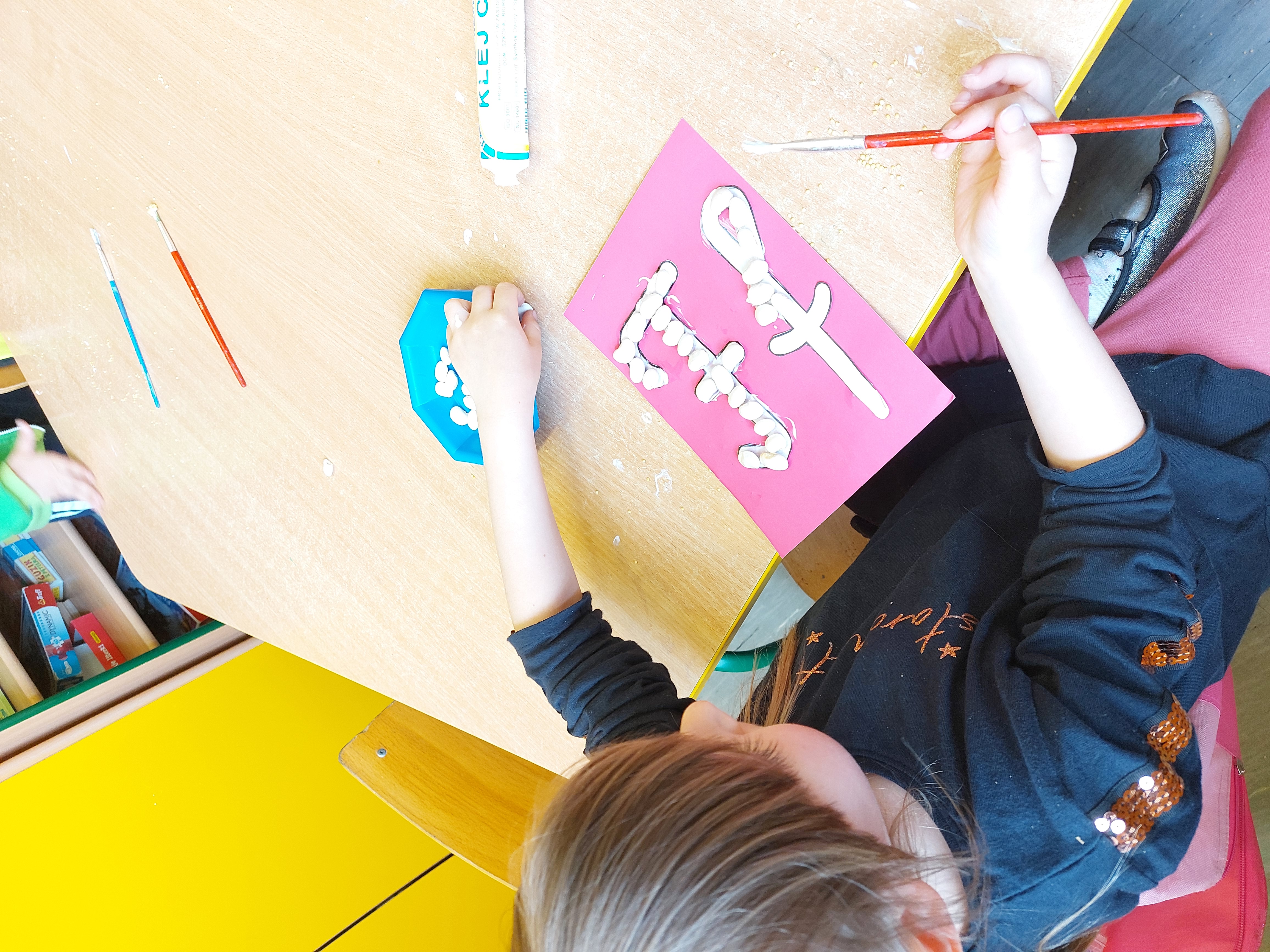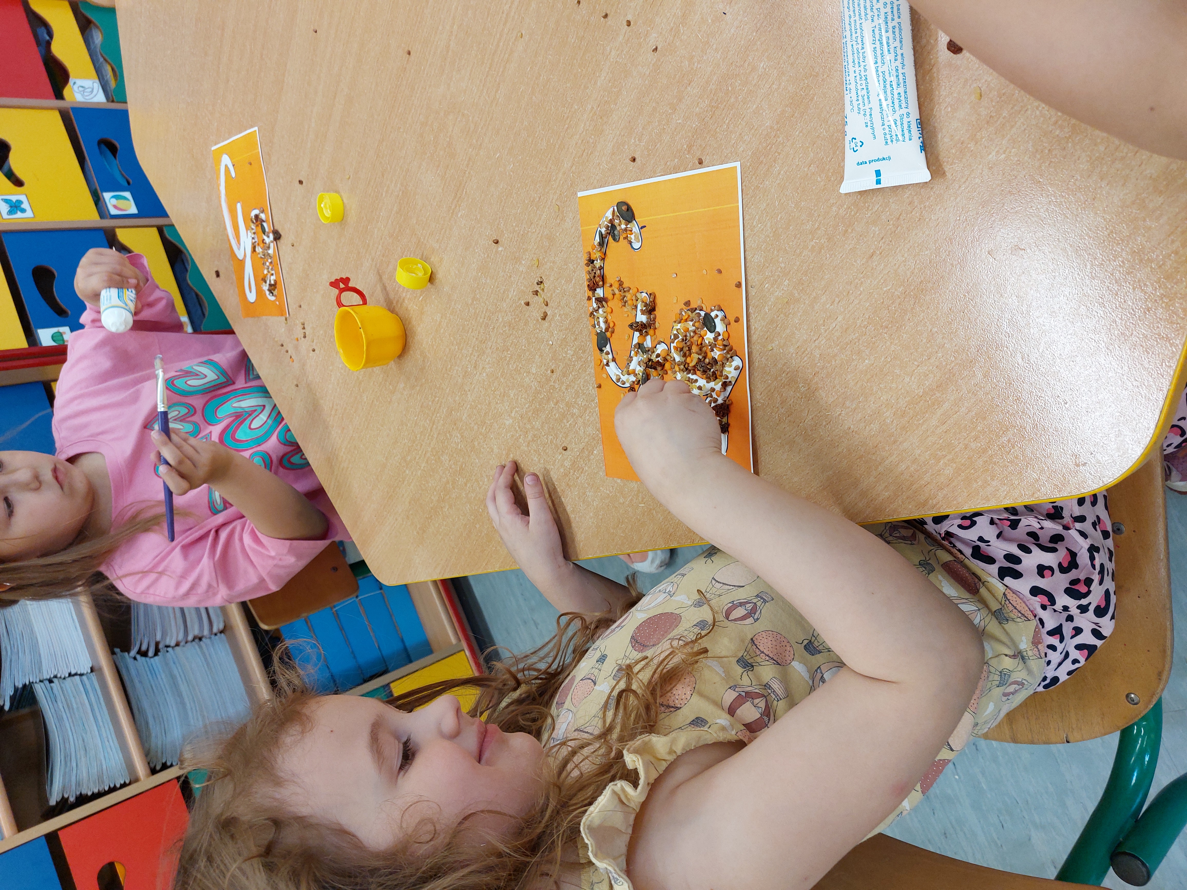 W celu wzmocnienia efektu wielozmysłowego uczenia się dzieci wyklejały litery materiałami o różnej fakturze i barwie np.: koralikami, guzikami, sznurowadłem, plasteliną, kaszą. Potem odtwarzały litery, wodząc palcem po wzorze. Pracując w ten sposób z dziećmi, wykorzystywałyśmy cały ich potencjał płynący z wielu zmysłów aktywowanych jednocześnie, co wzmacniało pamięć i pozwalało w krótkim czasie dobrze zakodować obraz graficzny liter, a jest to bardzo ważny krok w nauce czytania i pisania.