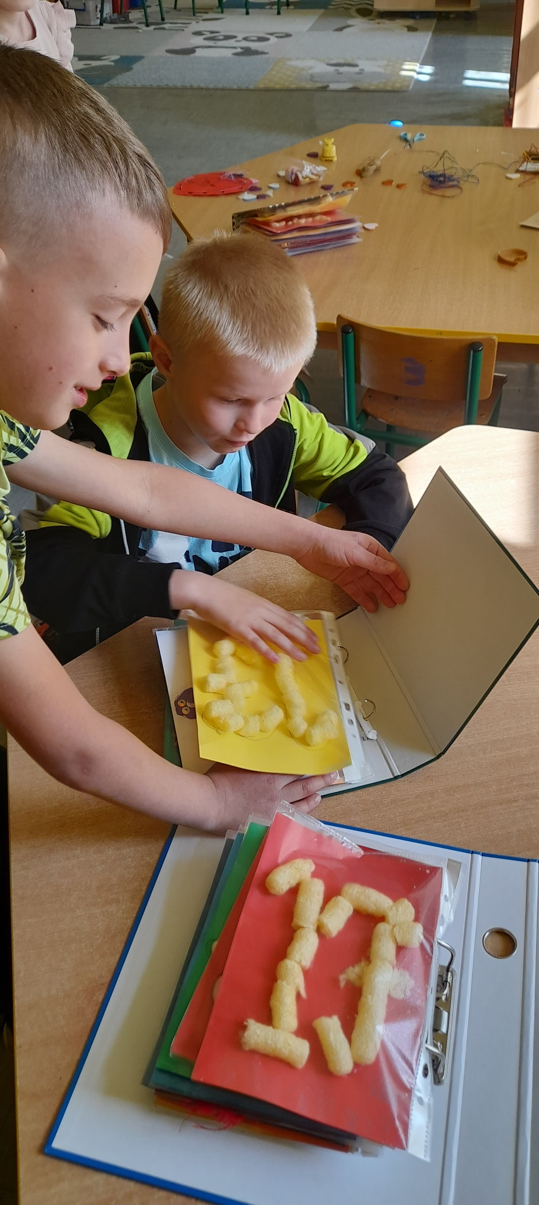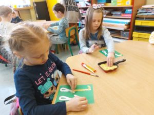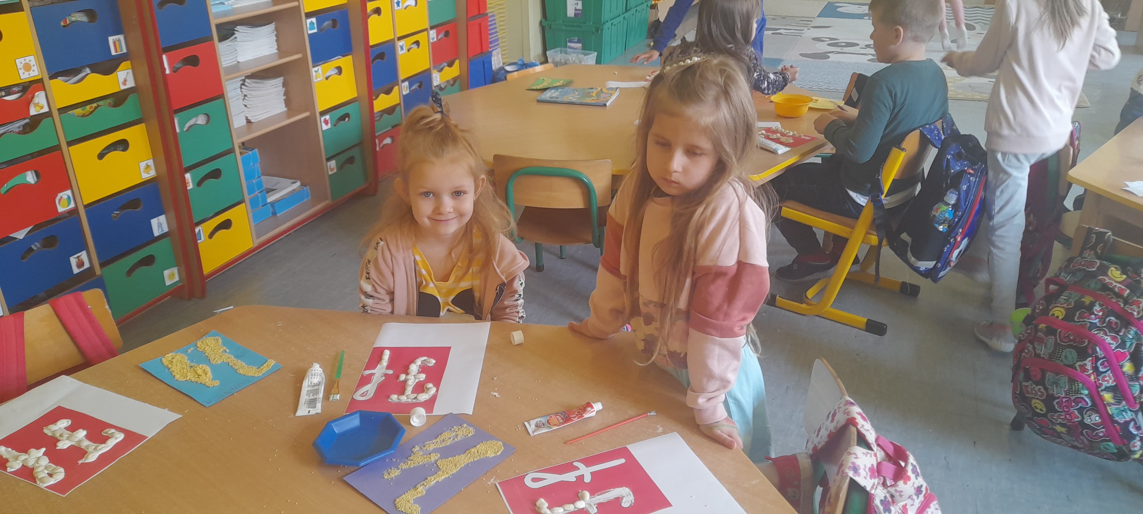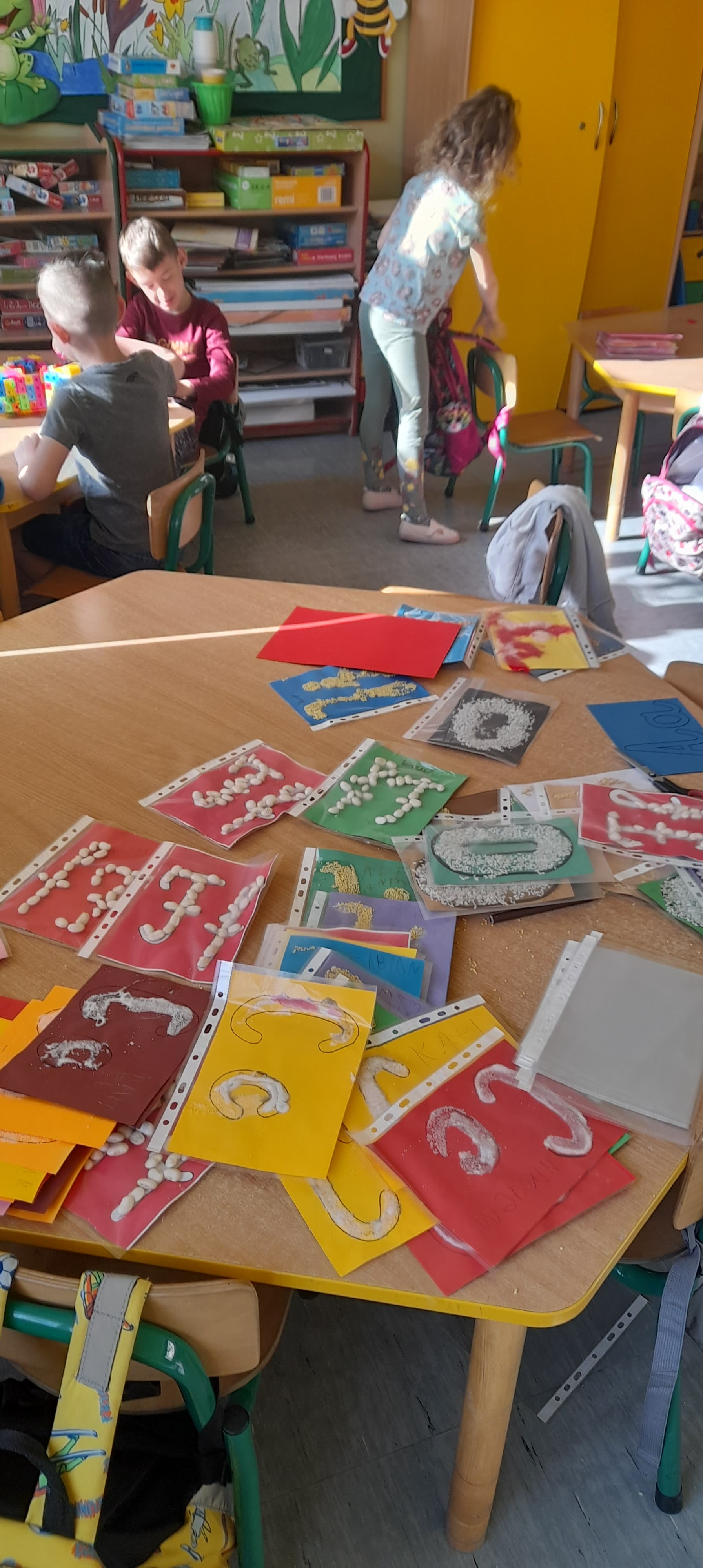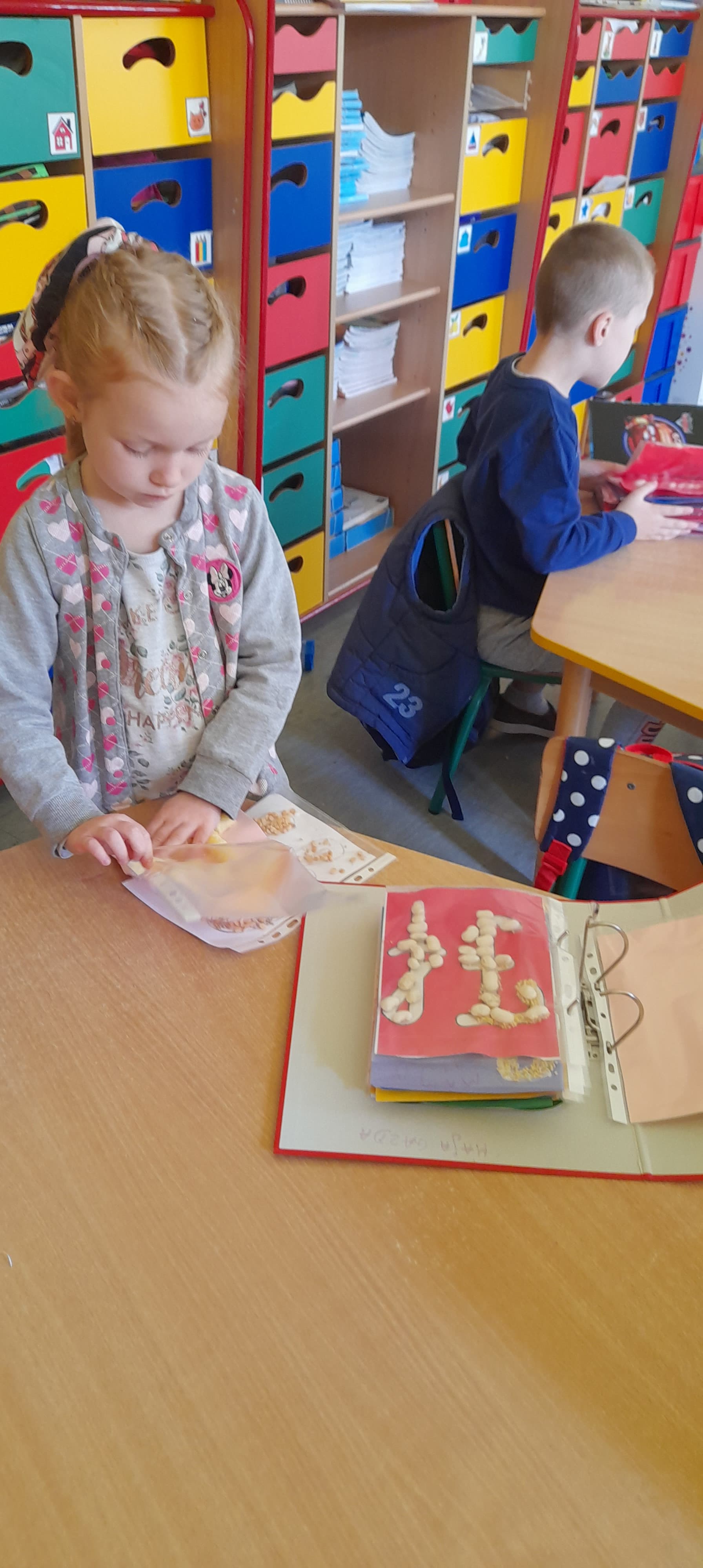 W celu wzmocnienia efektu wielozmysłowego uczenia się dzieci wyklejały litery materiałami o różnej fakturze i barwie np.: koralikami, guzikami, sznurowadłem, plasteliną, kaszą. Potem odtwarzały litery, wodząc palcem po wzorze. Pracując w ten sposób z dziećmi, wykorzystywałyśmy cały ich potencjał płynący z wielu zmysłów aktywowanych jednocześnie, co wzmacniało pamięć i pozwalało w krótkim czasie dobrze zakodować obraz graficzny liter, a jest to bardzo ważny krok w nauce czytania i pisania.