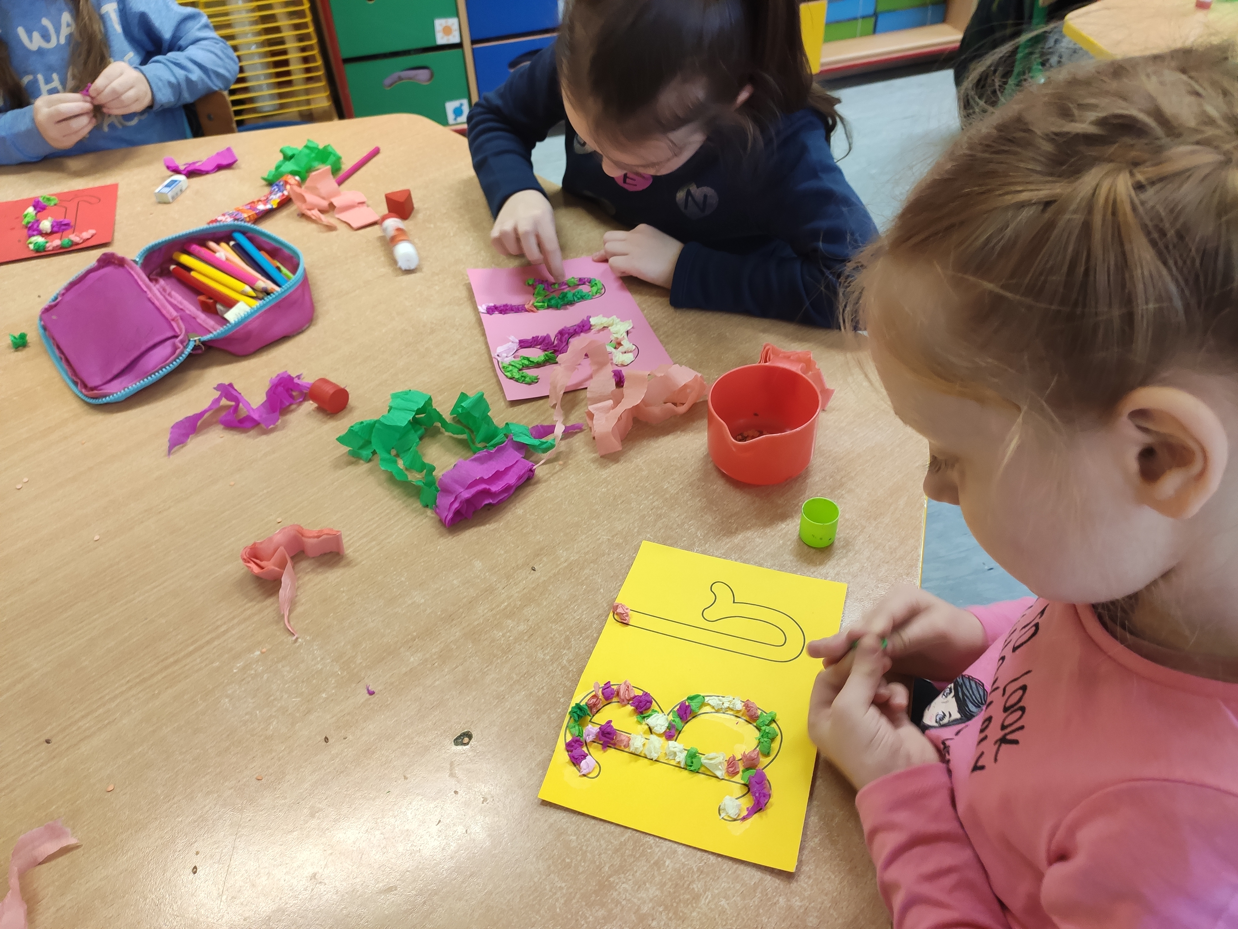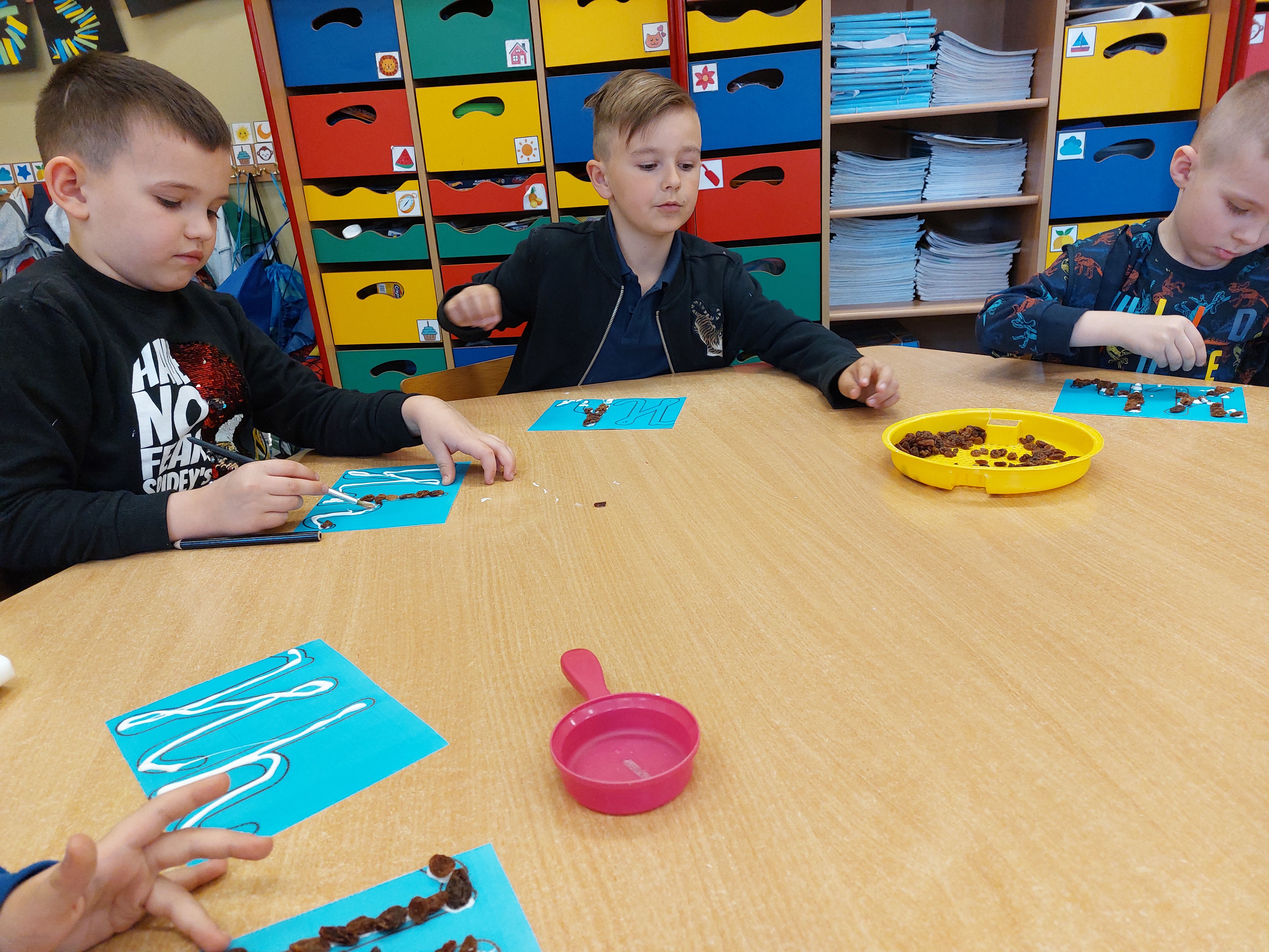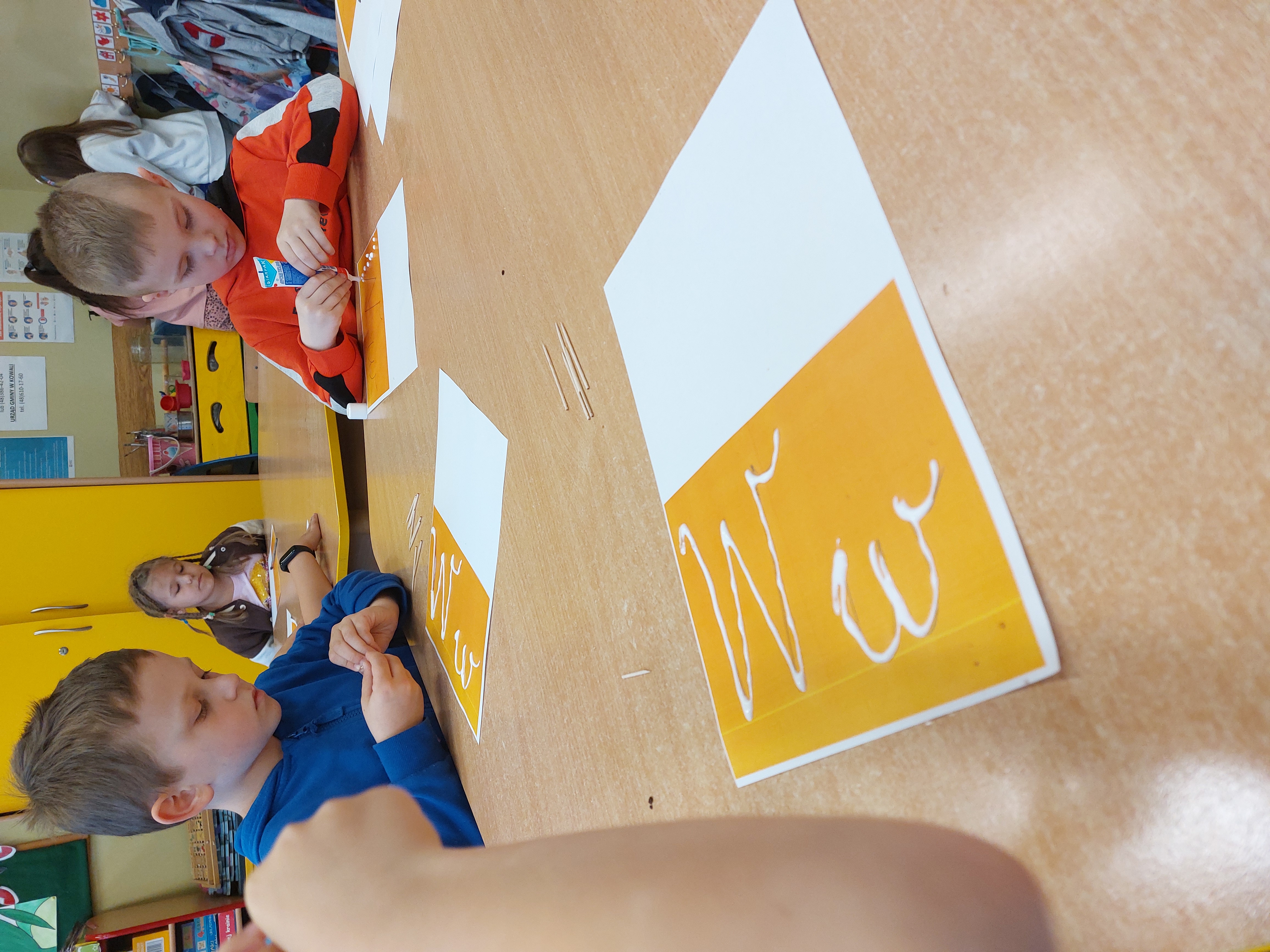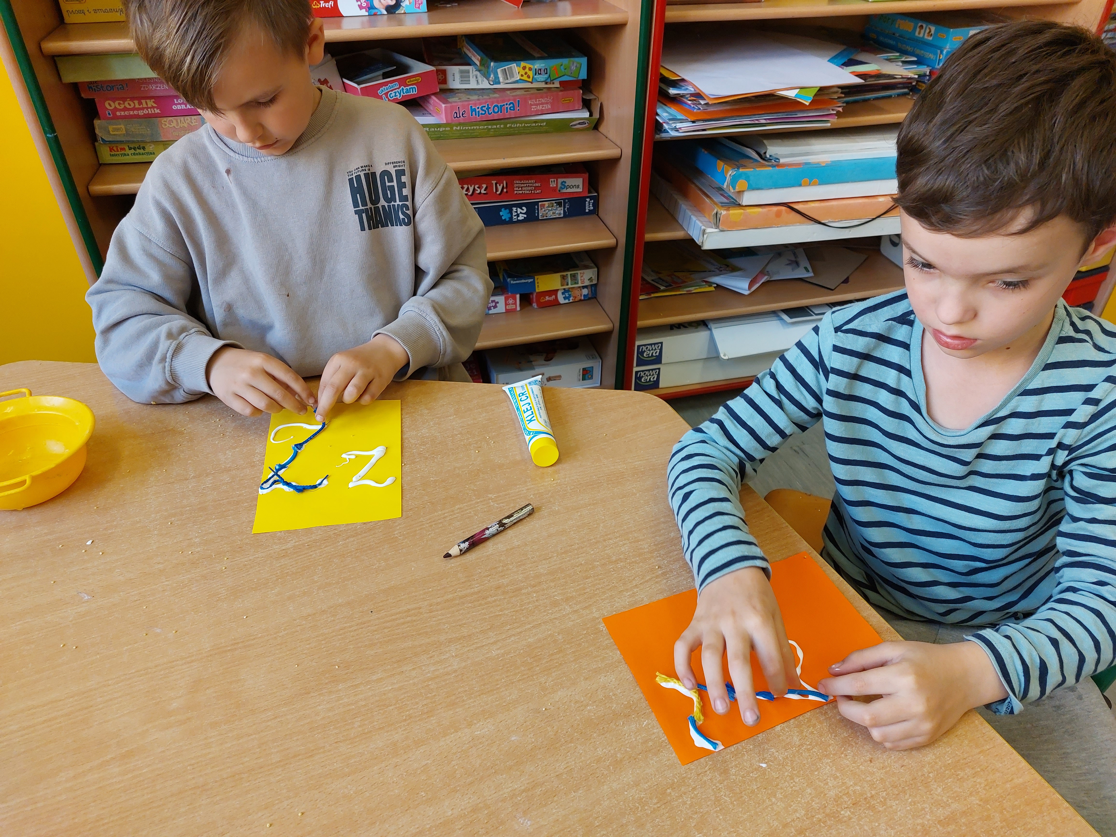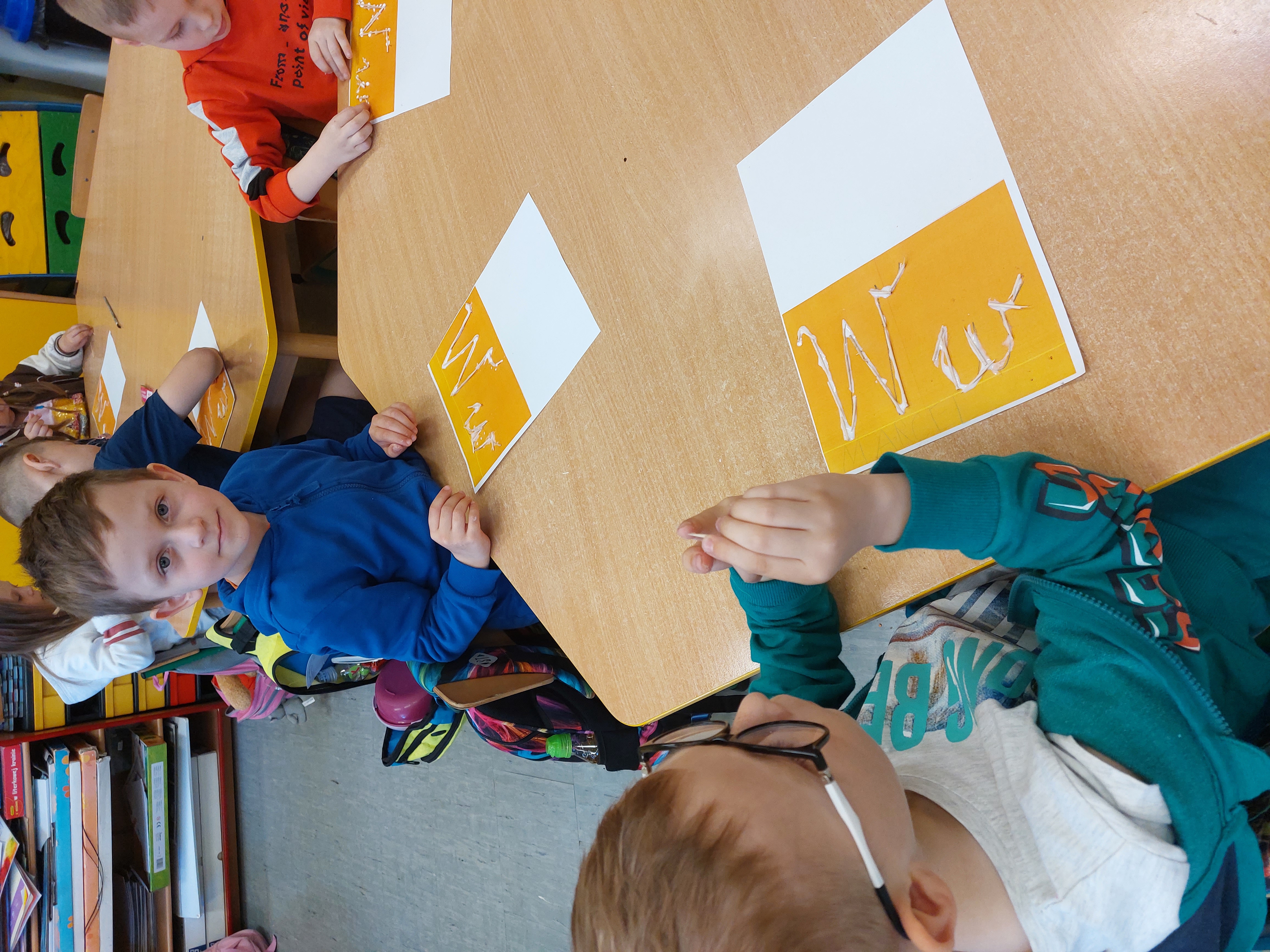W celu wzmocnienia efektu wielozmysłowego uczenia się dzieci wyklejały litery materiałami o różnej fakturze i barwie np.: koralikami, guzikami, sznurowadłem, plasteliną, kaszą. Potem odtwarzały litery, wodząc palcem po wzorze. Pracując w ten sposób z dziećmi, wykorzystywałyśmy cały ich potencjał płynący z wielu zmysłów aktywowanych jednocześnie, co wzmacniało pamięć i pozwalało w krótkim czasie dobrze zakodować obraz graficzny liter, a jest to bardzo ważny krok w nauce czytania i pisania.