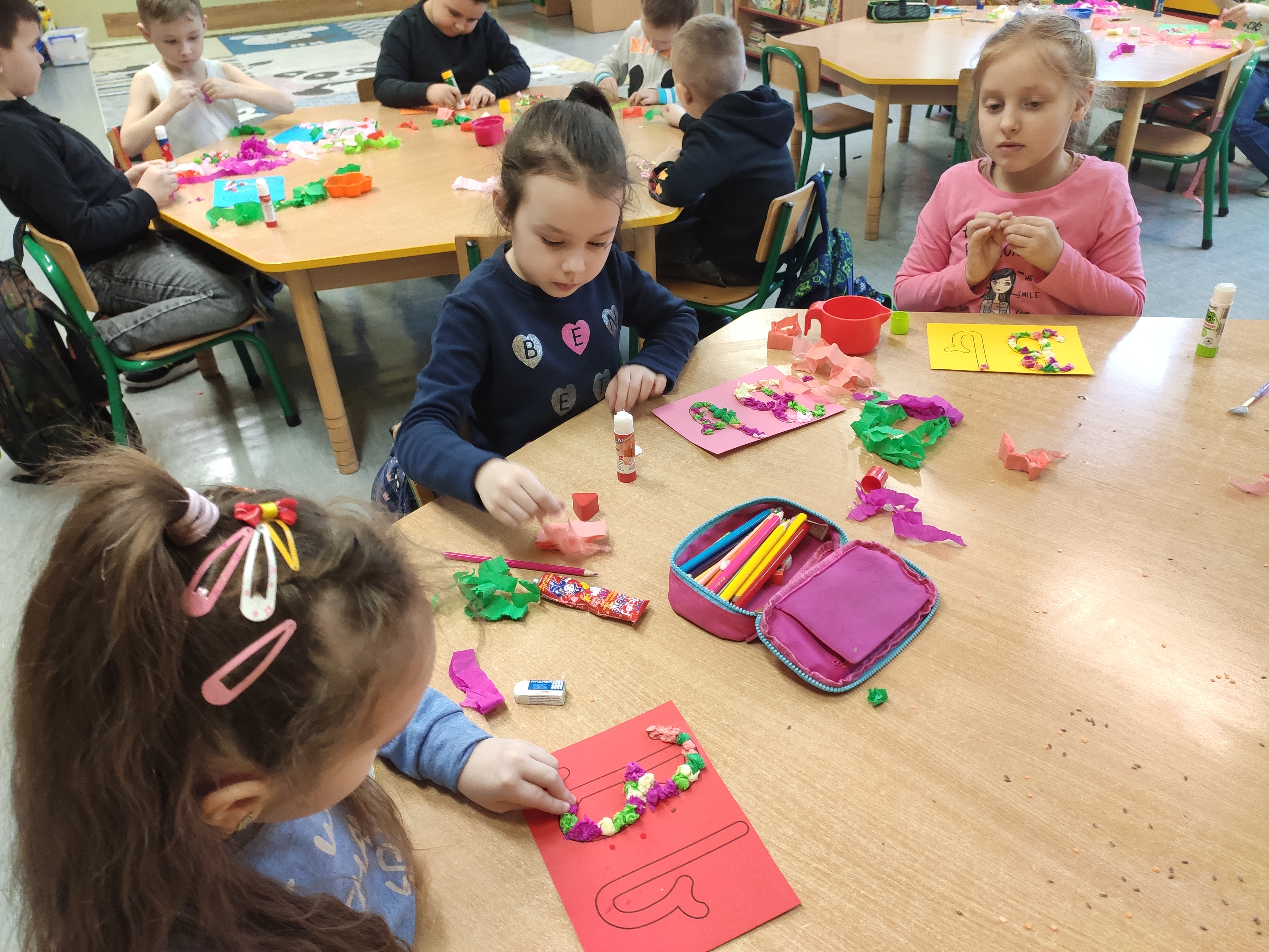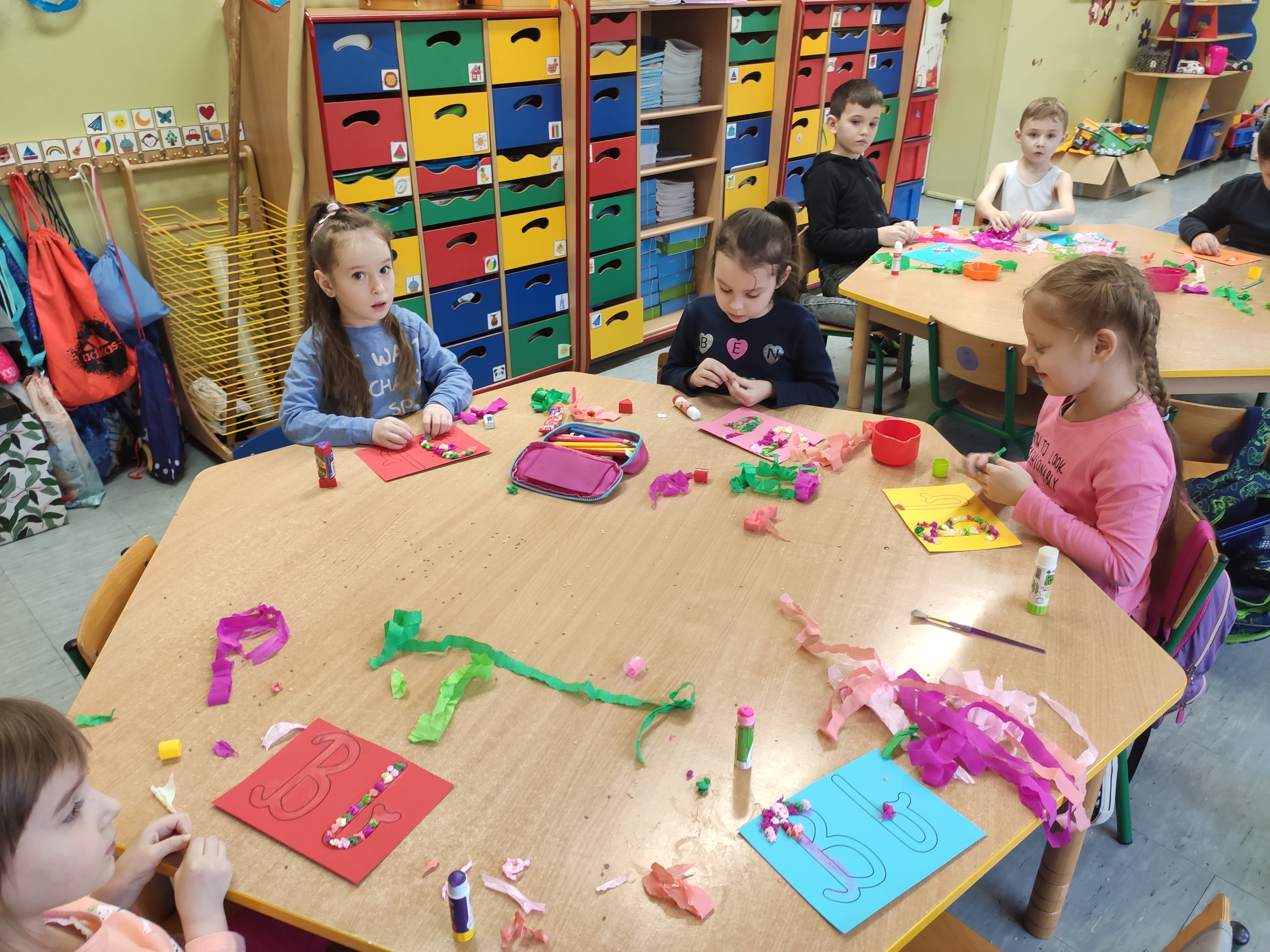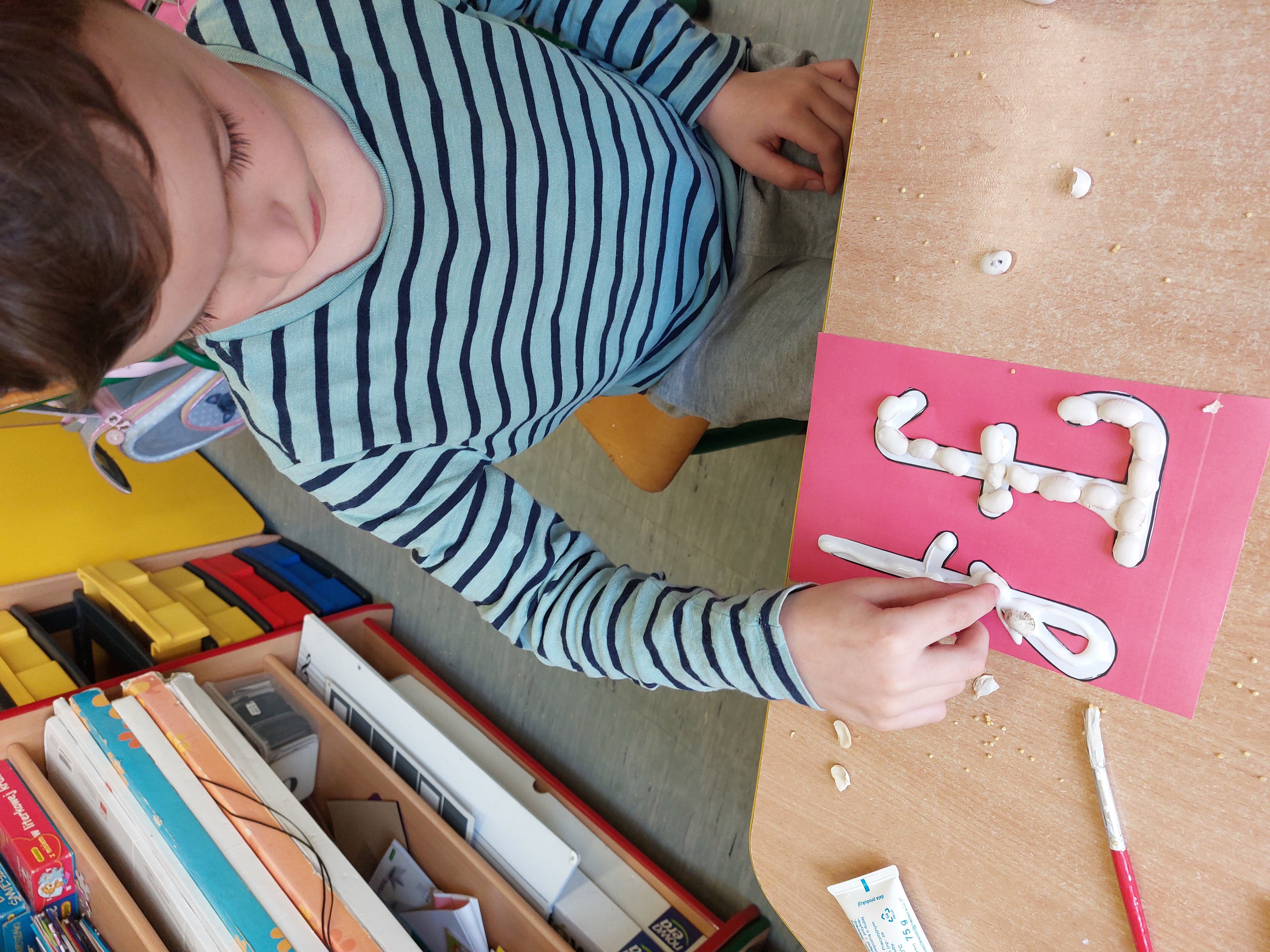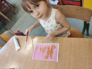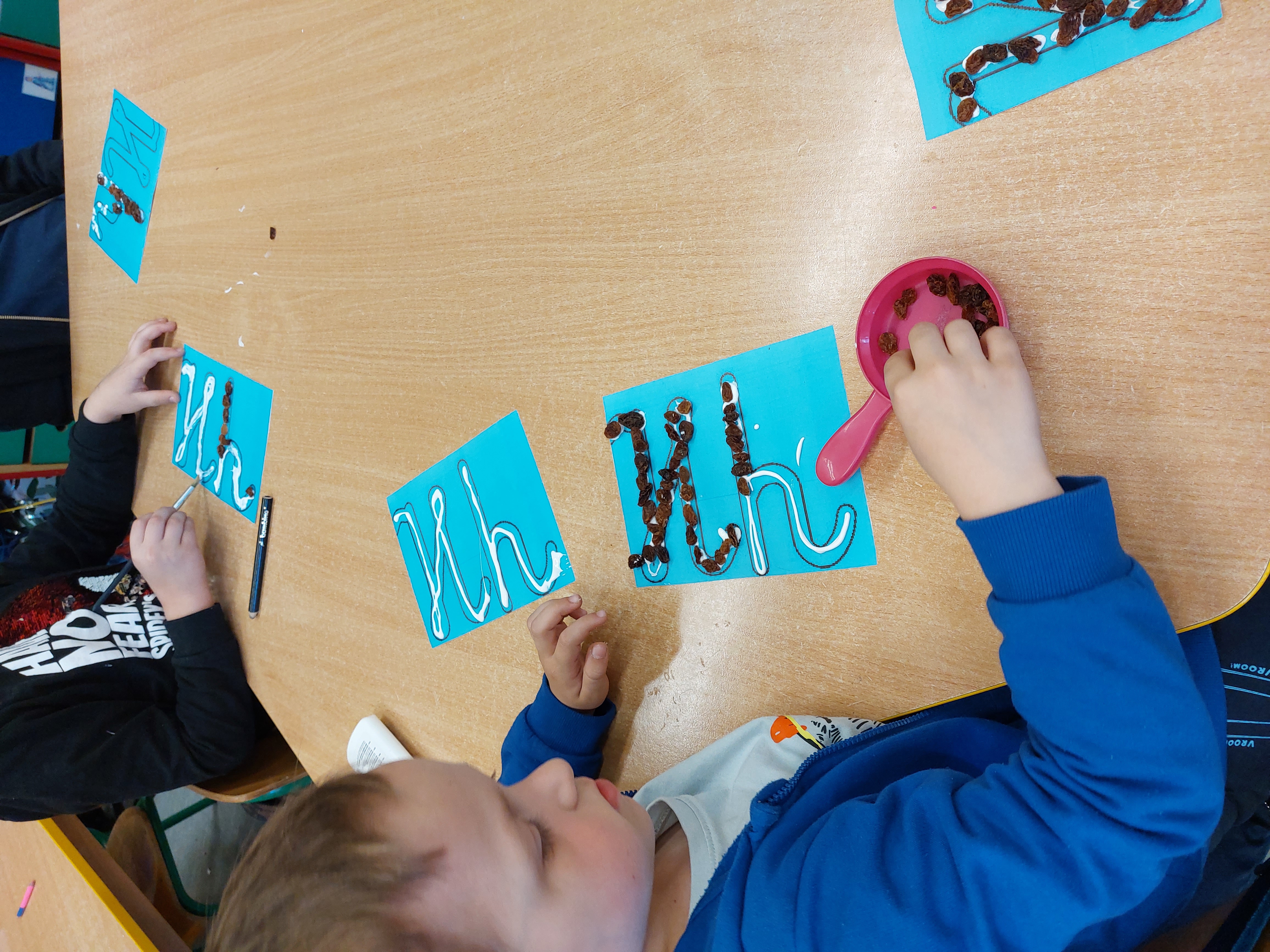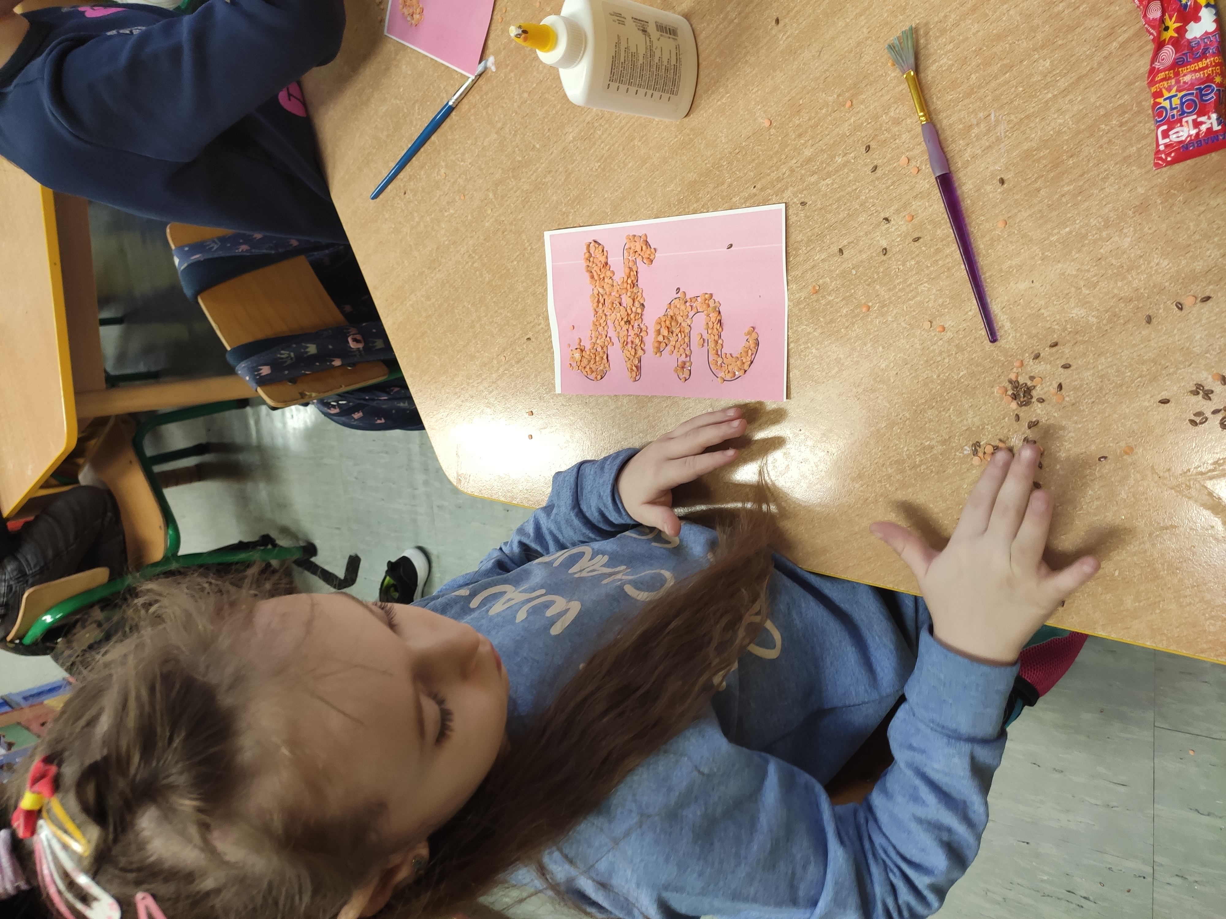 W celu wzmocnienia efektu wielozmysłowego uczenia się dzieci wyklejały litery materiałami o różnej fakturze i barwie np.: koralikami, guzikami, sznurowadłem, plasteliną, kaszą. Potem odtwarzały litery, wodząc palcem po wzorze. Pracując w ten sposób z dziećmi, wykorzystywałyśmy cały ich potencjał płynący z wielu zmysłów aktywowanych jednocześnie, co wzmacniało pamięć i pozwalało w krótkim czasie dobrze zakodować obraz graficzny liter, a jest to bardzo ważny krok w nauce czytania i pisania.