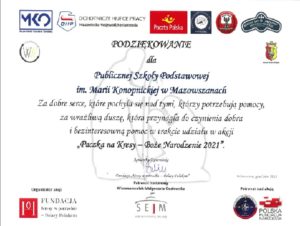 Nasza szkoła otrzymała podziękowanie za udział w akcji „Paczka na Kresy – Boże Narodzenie 2021” organizowaną przez Fundację „Kresy w potrzebie – Polacy Polakom”.
