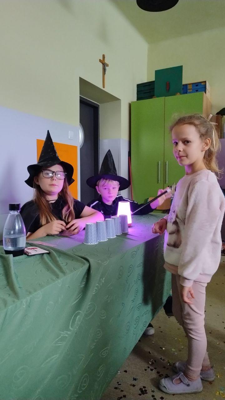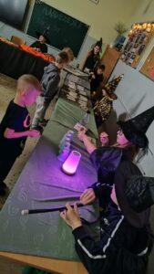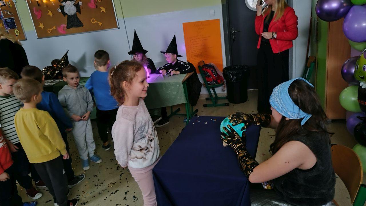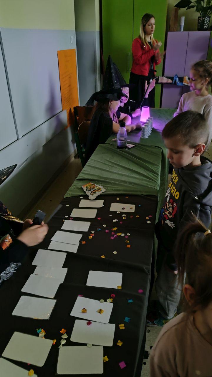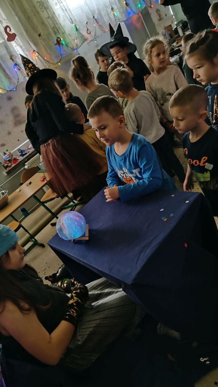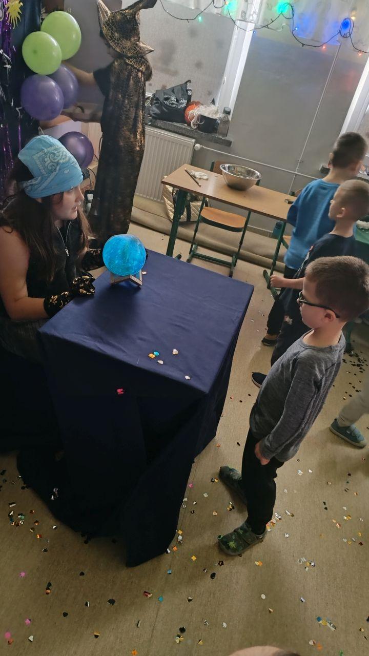 Dzień rozpoczęliśmy od filmu edukacyjnego, dzięki któremu dzieci dowiedziały się, jakie święto będziemy obchodzić. Następnie zostaliśmy zaproszeni do pokoju wróż, przygotowanego przez starszych kolegów i koleżanki z klas trzecich. Tam czekały na nas niezwykłe atrakcje: wróżby z kuli i kart, lanie wosku, wspólne zdjęcia, a także długo wyczekiwany słodki stół, gdzie każdy mógł wybrać coś dla siebie.