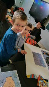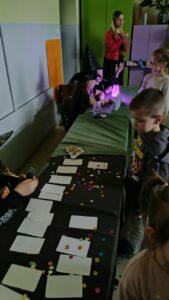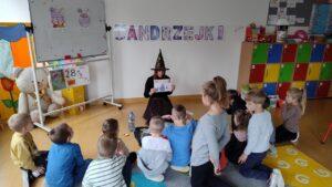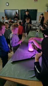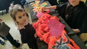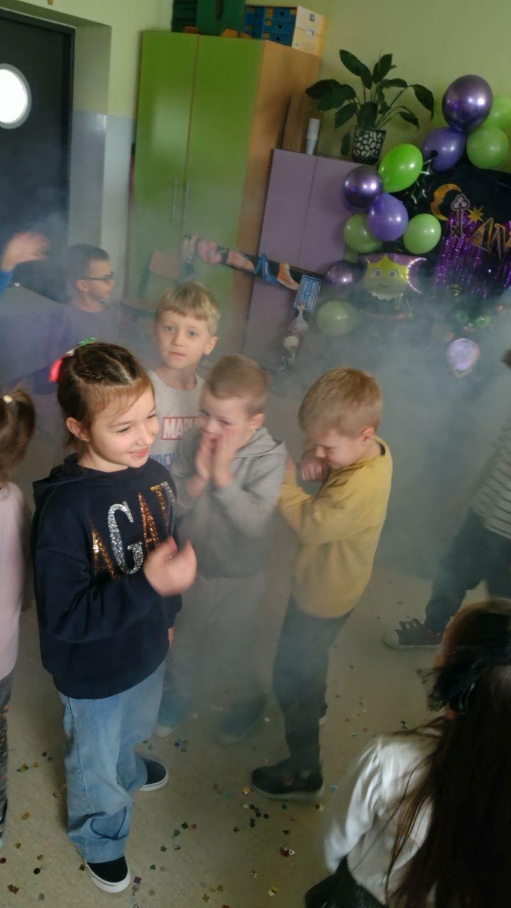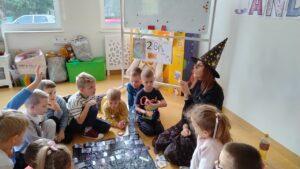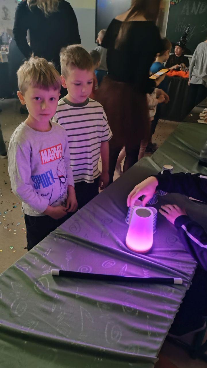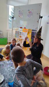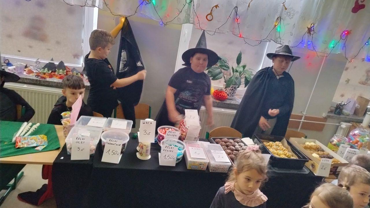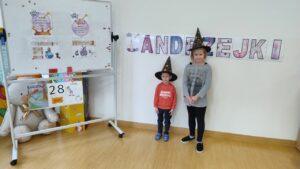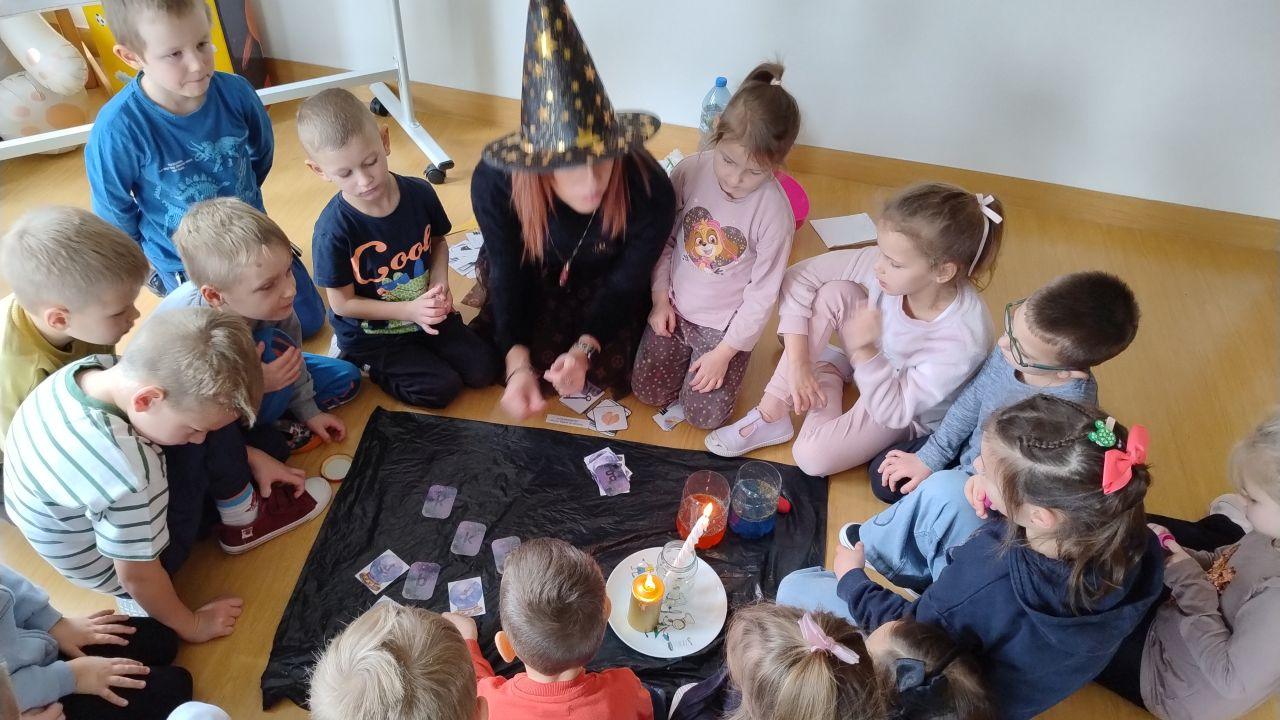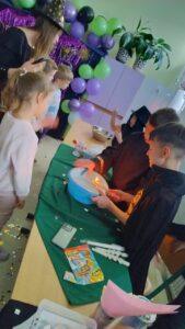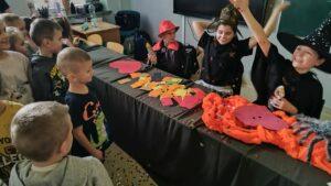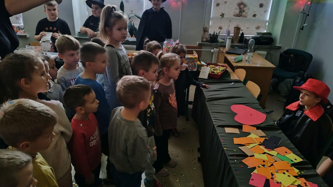 Dzień rozpoczęliśmy od filmu edukacyjnego, dzięki któremu dzieci dowiedziały się, jakie święto będziemy obchodzić. Następnie zostaliśmy zaproszeni do pokoju wróż, przygotowanego przez starszych kolegów i koleżanki z klas trzecich. Tam czekały na nas niezwykłe atrakcje: wróżby z kuli i kart, lanie wosku, wspólne zdjęcia, a także długo wyczekiwany słodki stół, gdzie każdy mógł wybrać coś dla siebie.