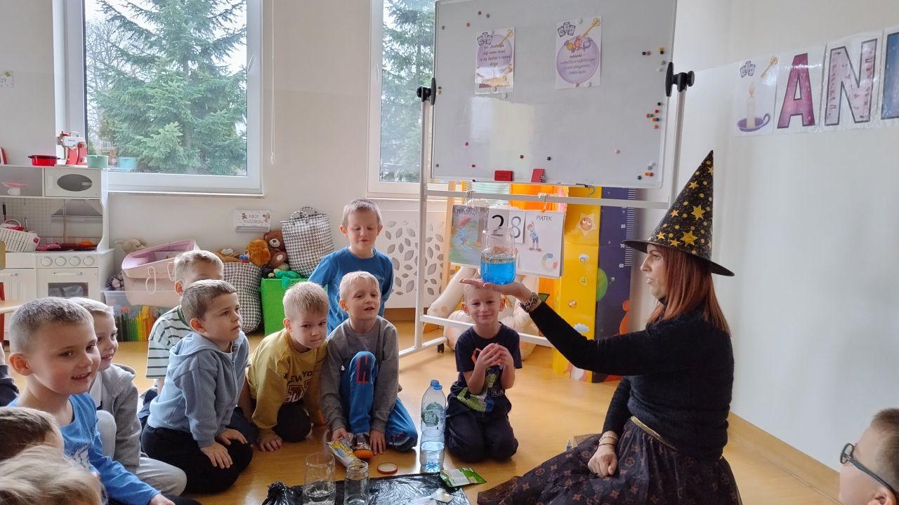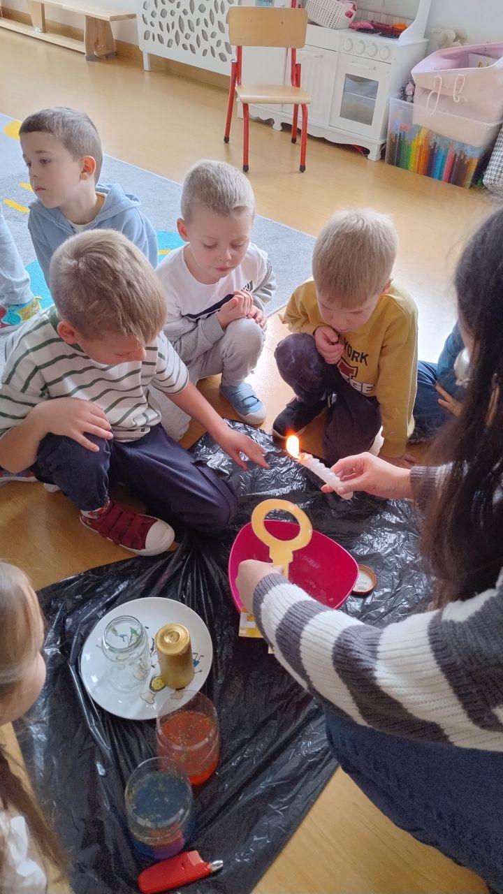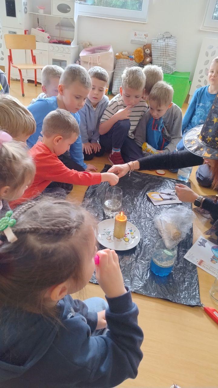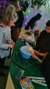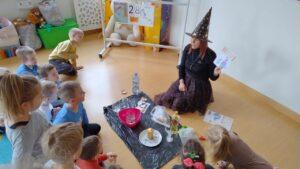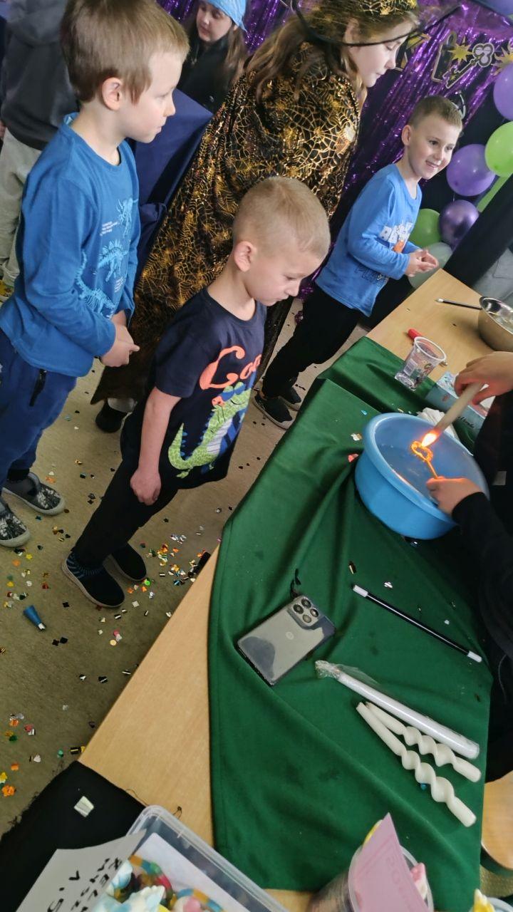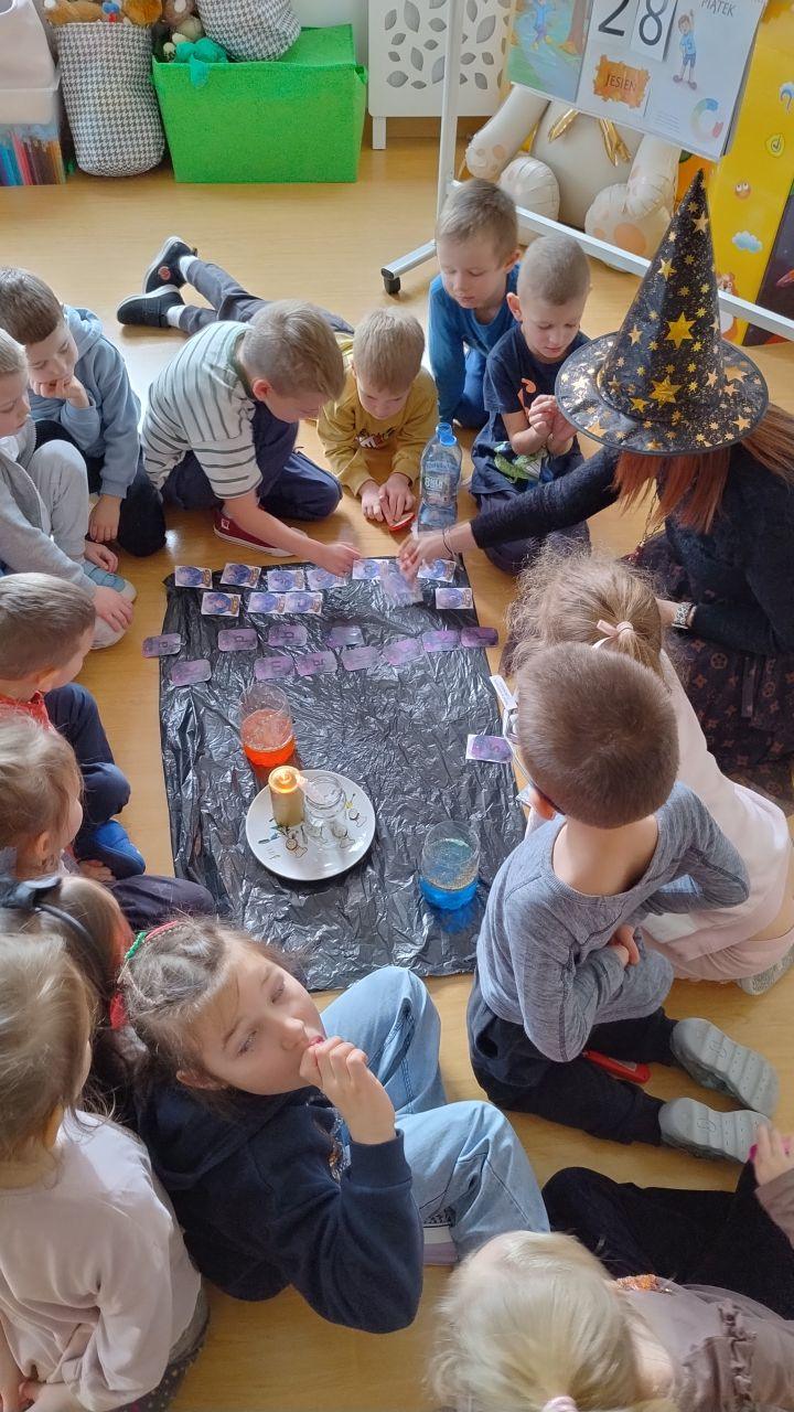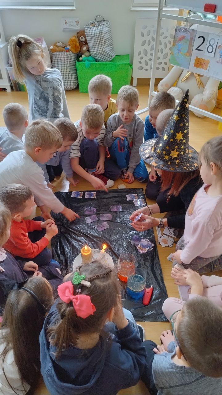 Po powrocie do naszej sali zabawa trwała dalej. Dzieci częstowały się ciasteczkami z wróżbą, ponownie lały wosk przez klucz, a także przygotowały własne eliksiry miłości i szczęścia. Śmiech, radość i ciekawość towarzyszyły nam przez cały dzień, a wszystkie te wyjątkowe chwile zostały uwiecznione na zdjęciach.