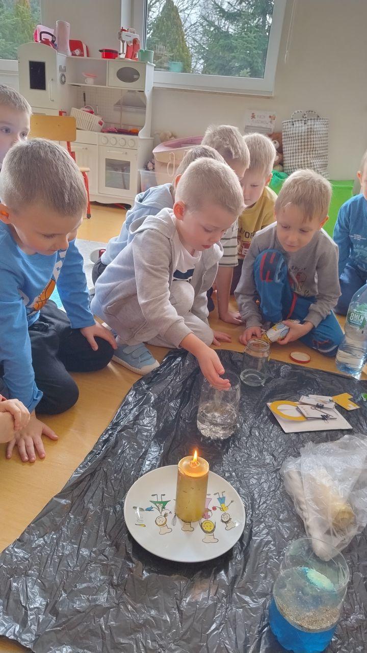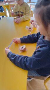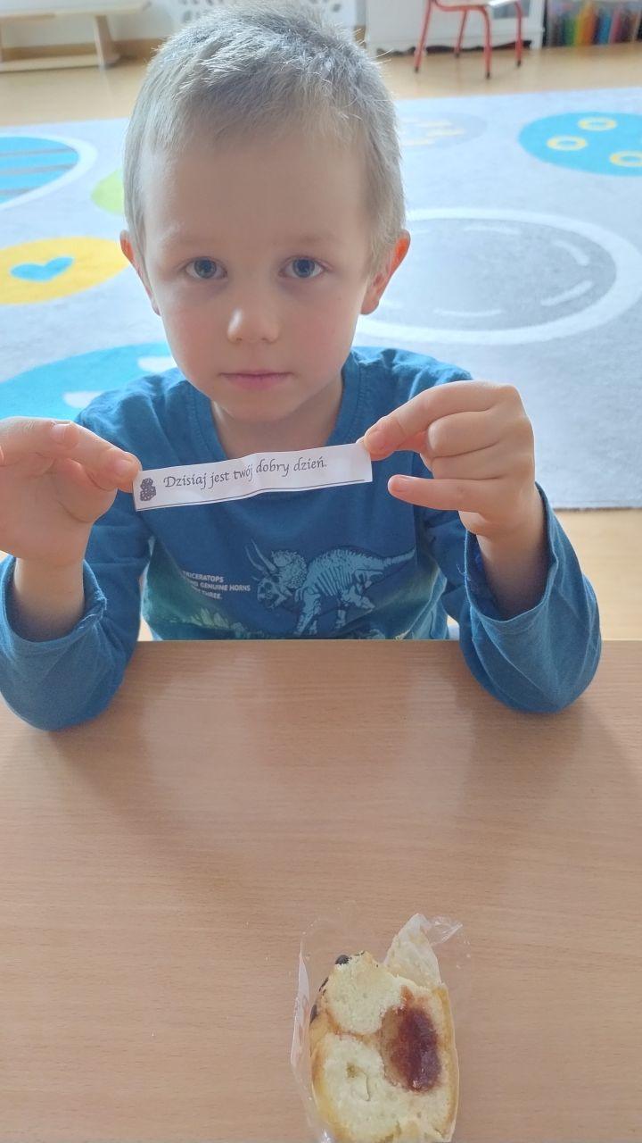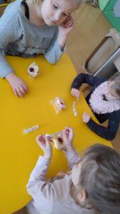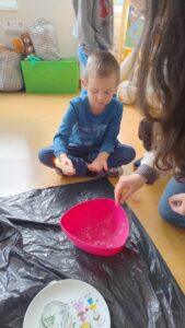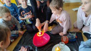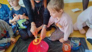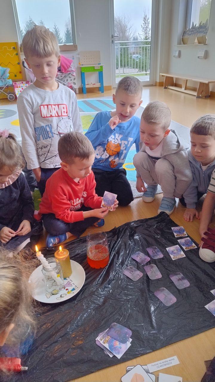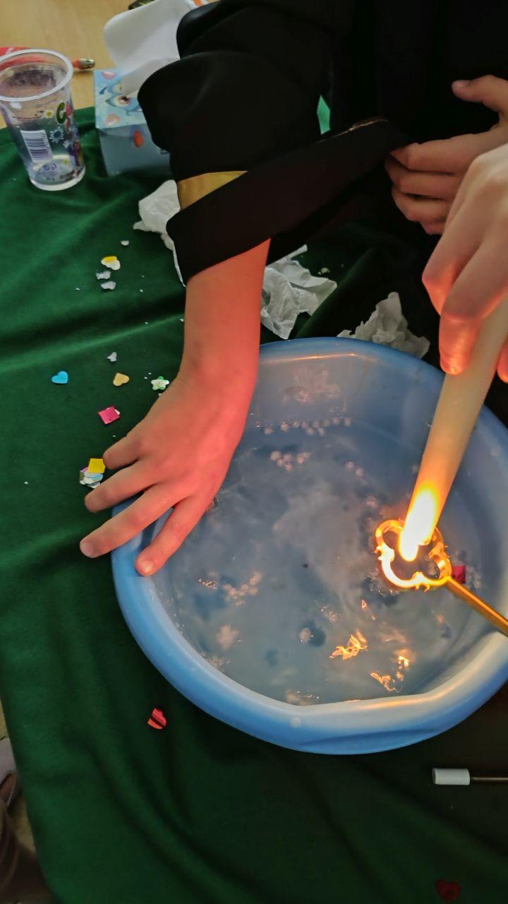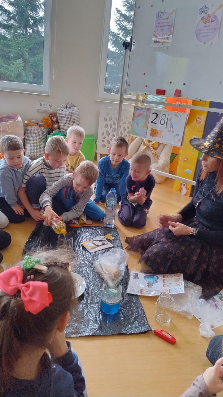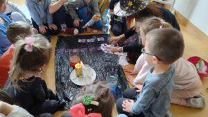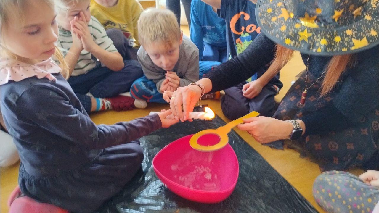 Po powrocie do naszej sali zabawa trwała dalej. Dzieci częstowały się ciasteczkami z wróżbą, ponownie lały wosk przez klucz, a także przygotowały własne eliksiry miłości i szczęścia. Śmiech, radość i ciekawość towarzyszyły nam przez cały dzień, a wszystkie te wyjątkowe chwile zostały uwiecznione na zdjęciach.