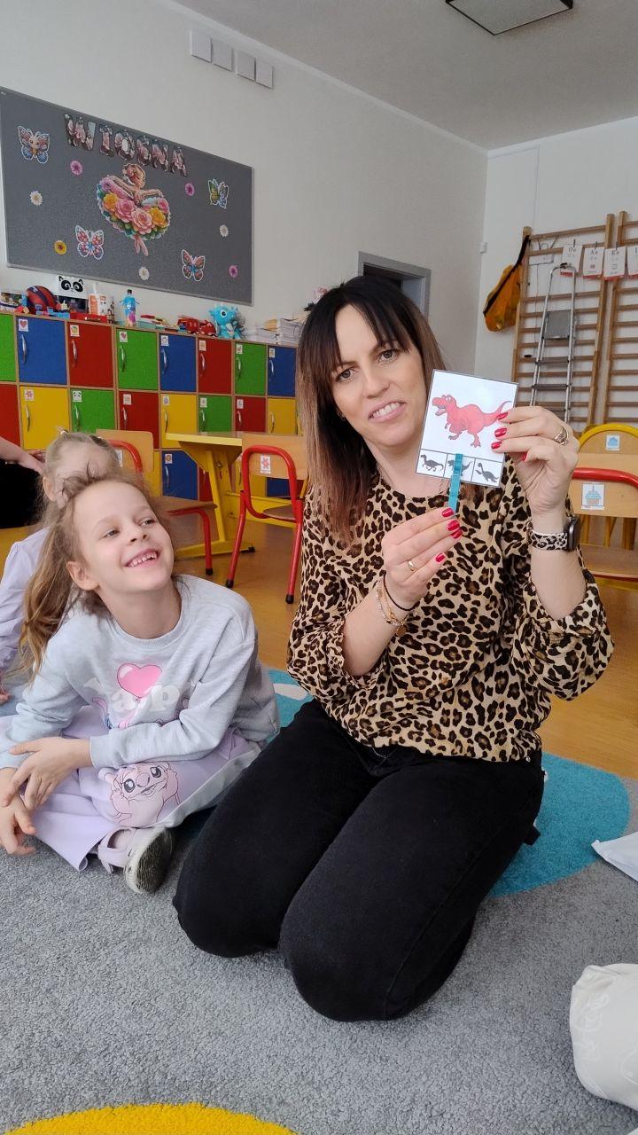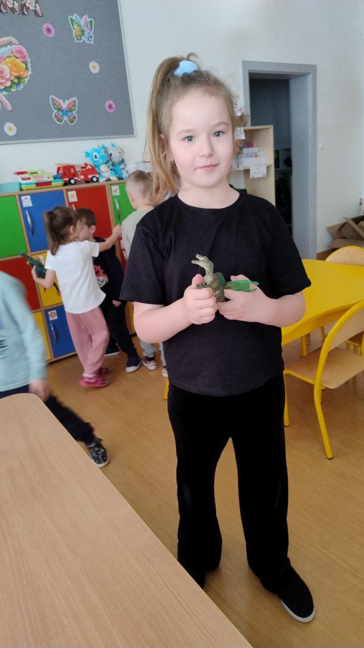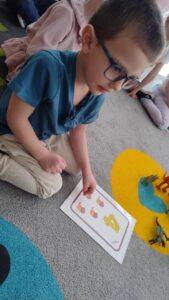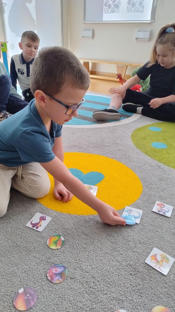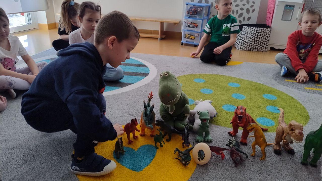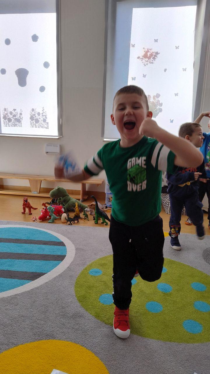 W ciągu dnia odbyły się także zajęcia matematyczne, podczas których dzieci przeliczały dinozaury, rozwijając umiejętności logicznego myślenia. Dużo radości przyniosły poszukiwania dinozaurów ukrytych w sali – zadanie, które połączyło spostrzegawczość z ruchem i świetną zabawą.