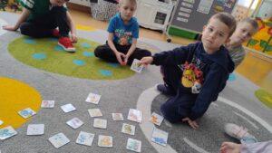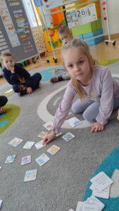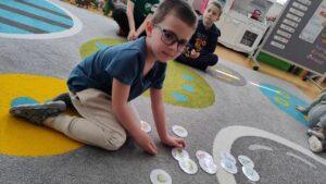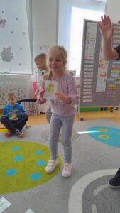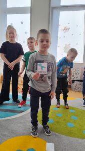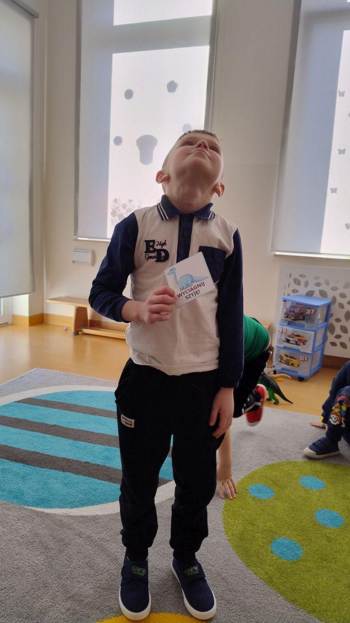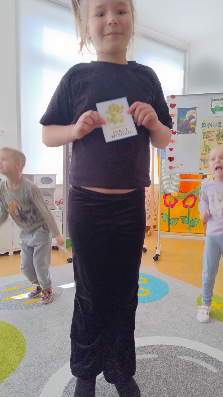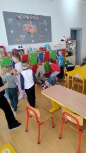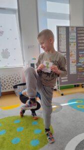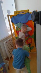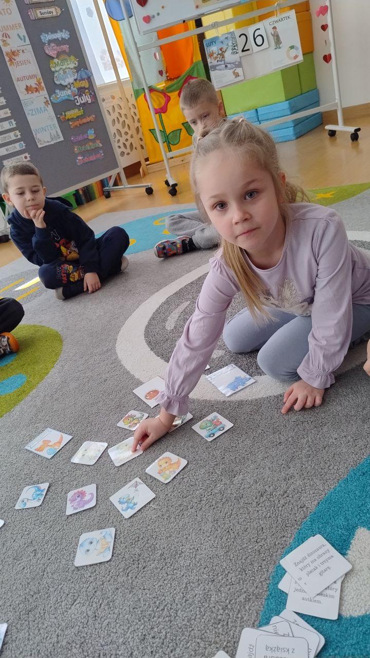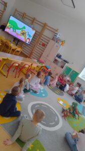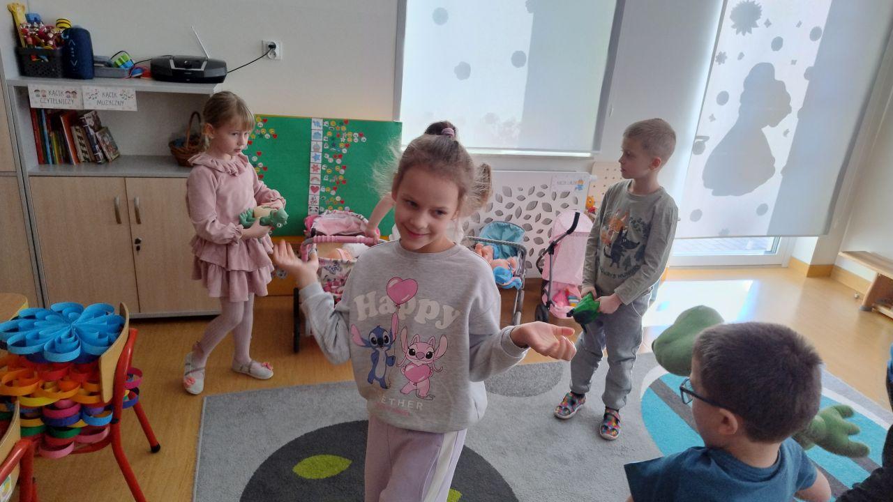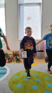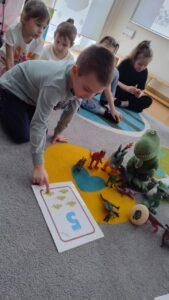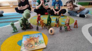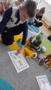 W ciągu dnia odbyły się także zajęcia matematyczne, podczas których dzieci przeliczały dinozaury, rozwijając umiejętności logicznego myślenia. Dużo radości przyniosły poszukiwania dinozaurów ukrytych w sali – zadanie, które połączyło spostrzegawczość z ruchem i świetną zabawą.