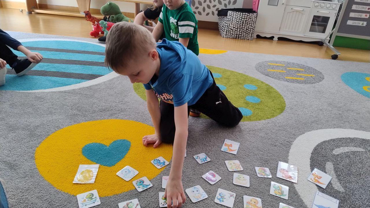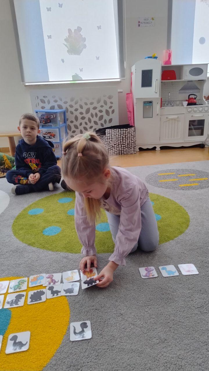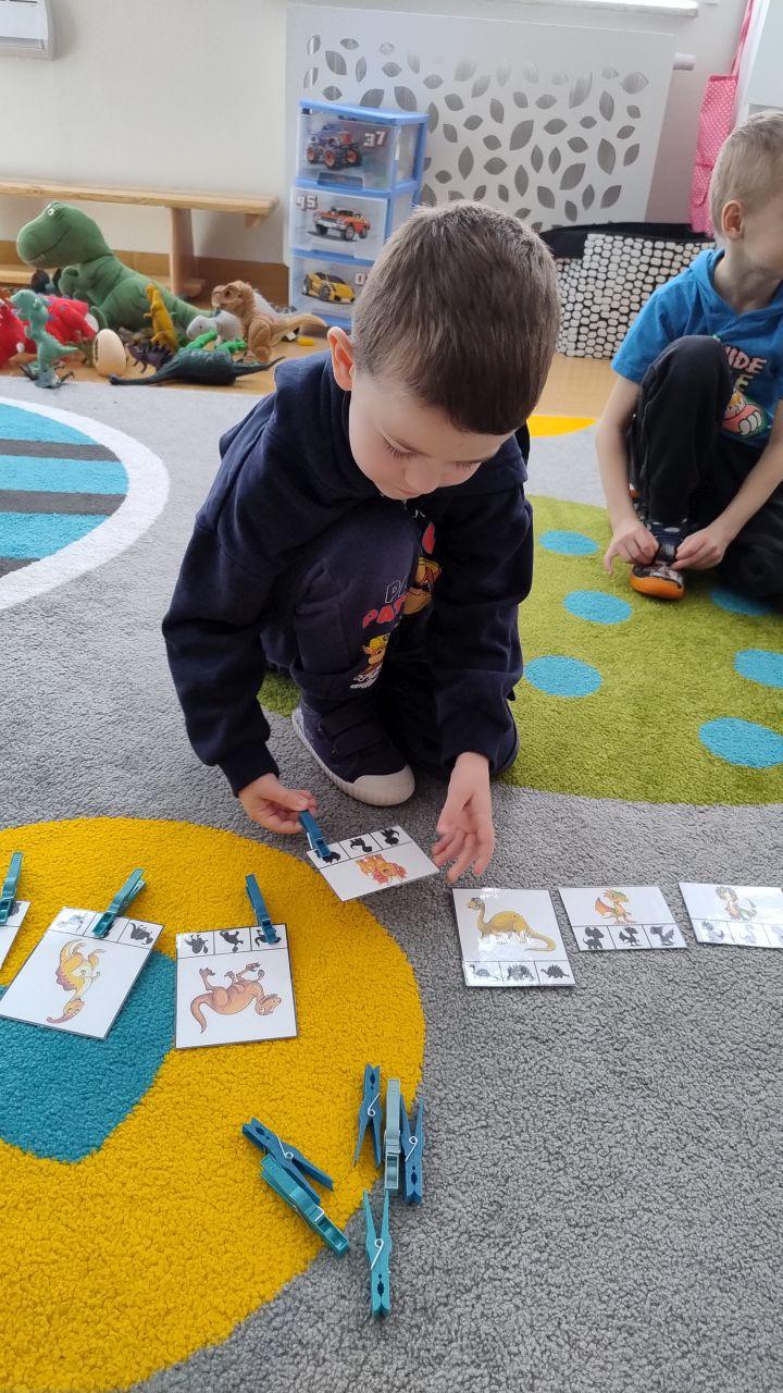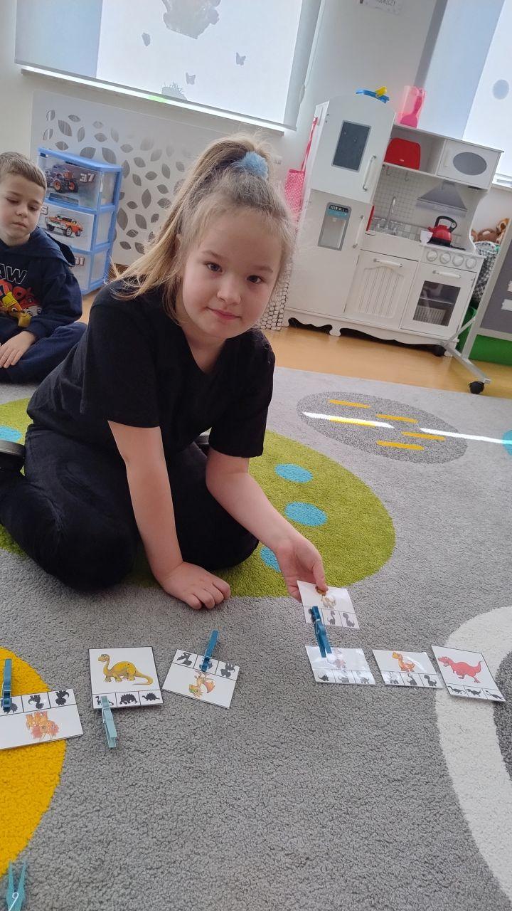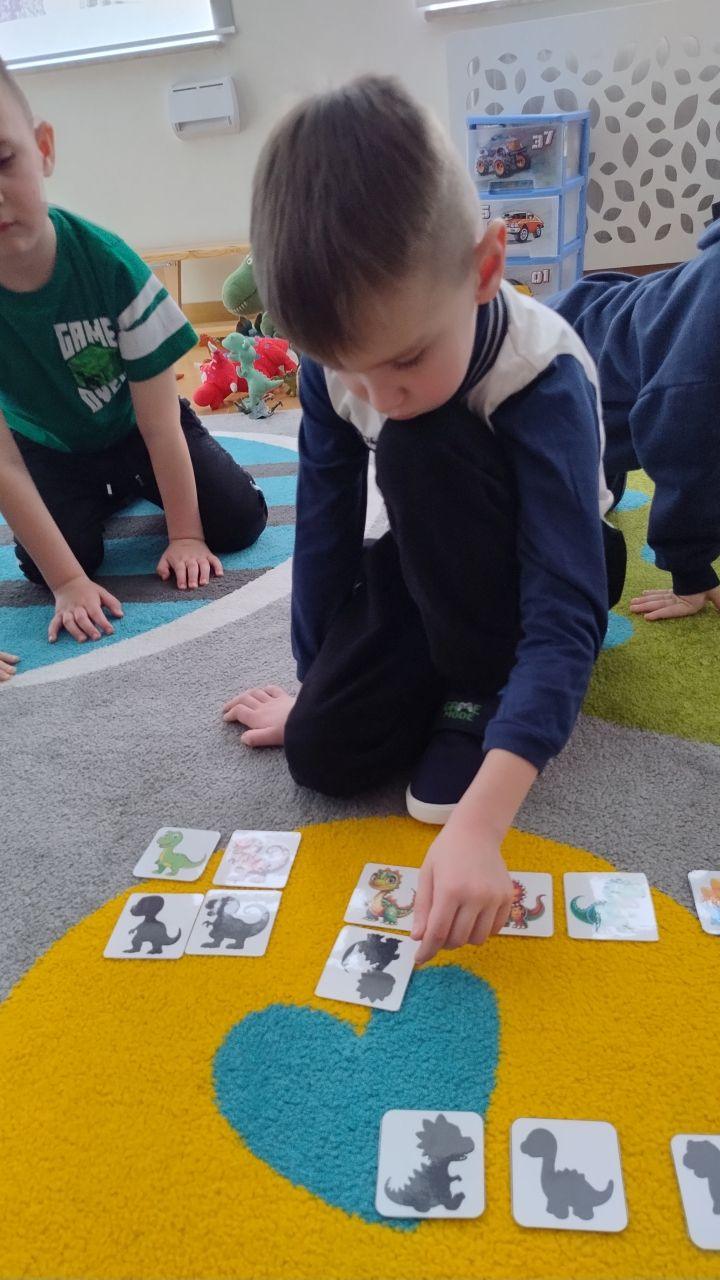 Nie zabrakło aktywności ruchowych oraz zadań rozwijających myślenie, takich jak odnajdywanie dinozaurów ukrytych w grochu – była to wyjątkowa zabawa sensoryczna. Dzieci dopasowywały również cienie dinozaurów, układały puzzle oraz wykonały pracę plastyczno‑techniczną przedstawiającą dinozaura wyklutego z jaja.