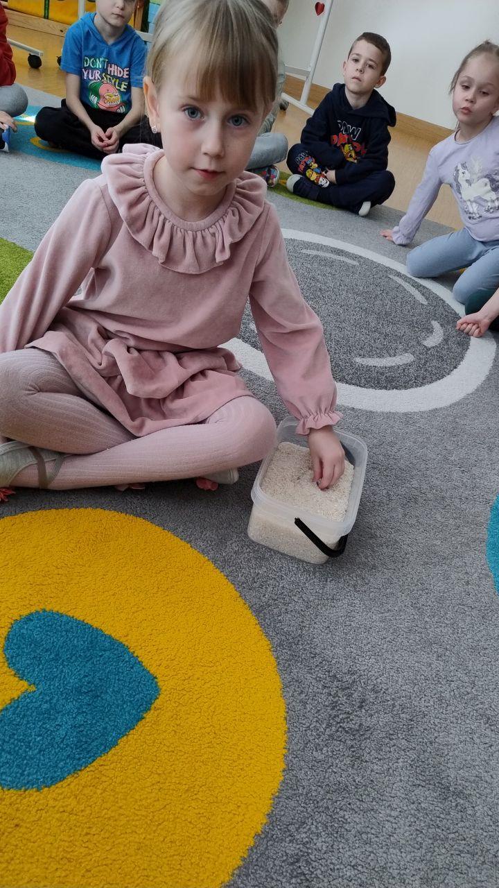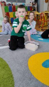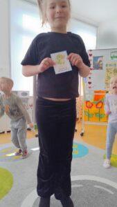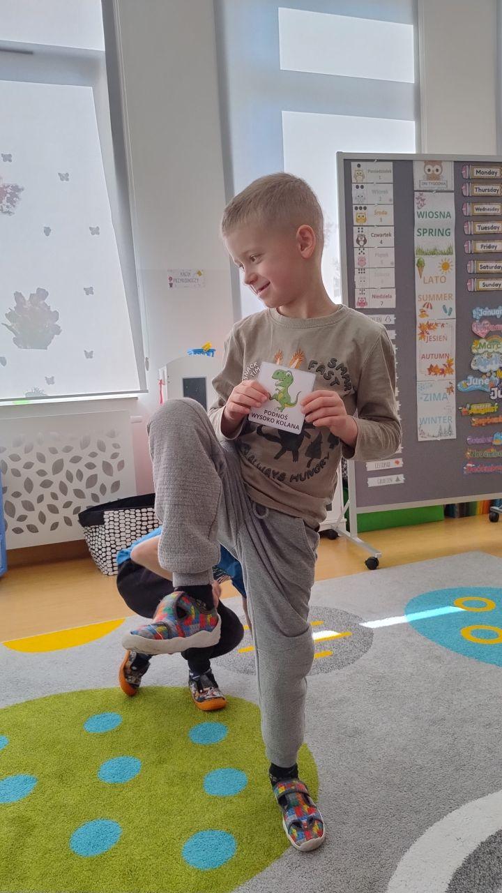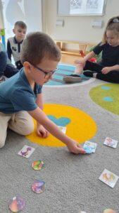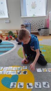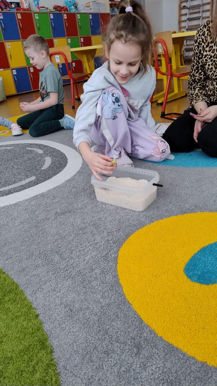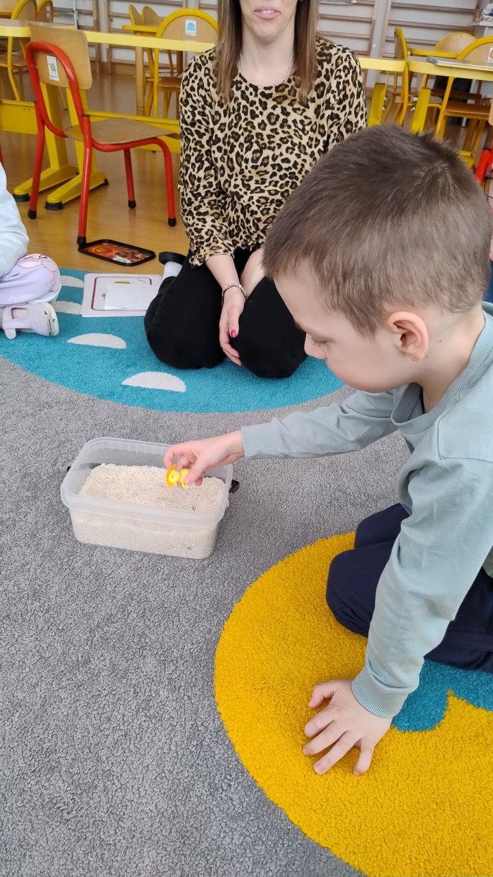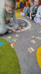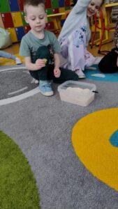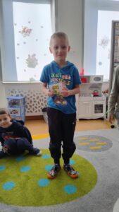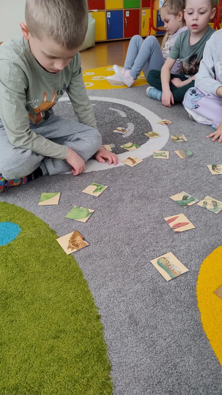 Nie zabrakło aktywności ruchowych oraz zadań rozwijających myślenie, takich jak odnajdywanie dinozaurów ukrytych w grochu – była to wyjątkowa zabawa sensoryczna. Dzieci dopasowywały również cienie dinozaurów, układały puzzle oraz wykonały pracę plastyczno‑techniczną przedstawiającą dinozaura wyklutego z jaja.