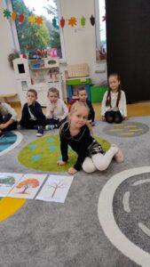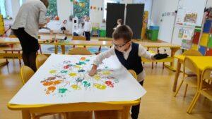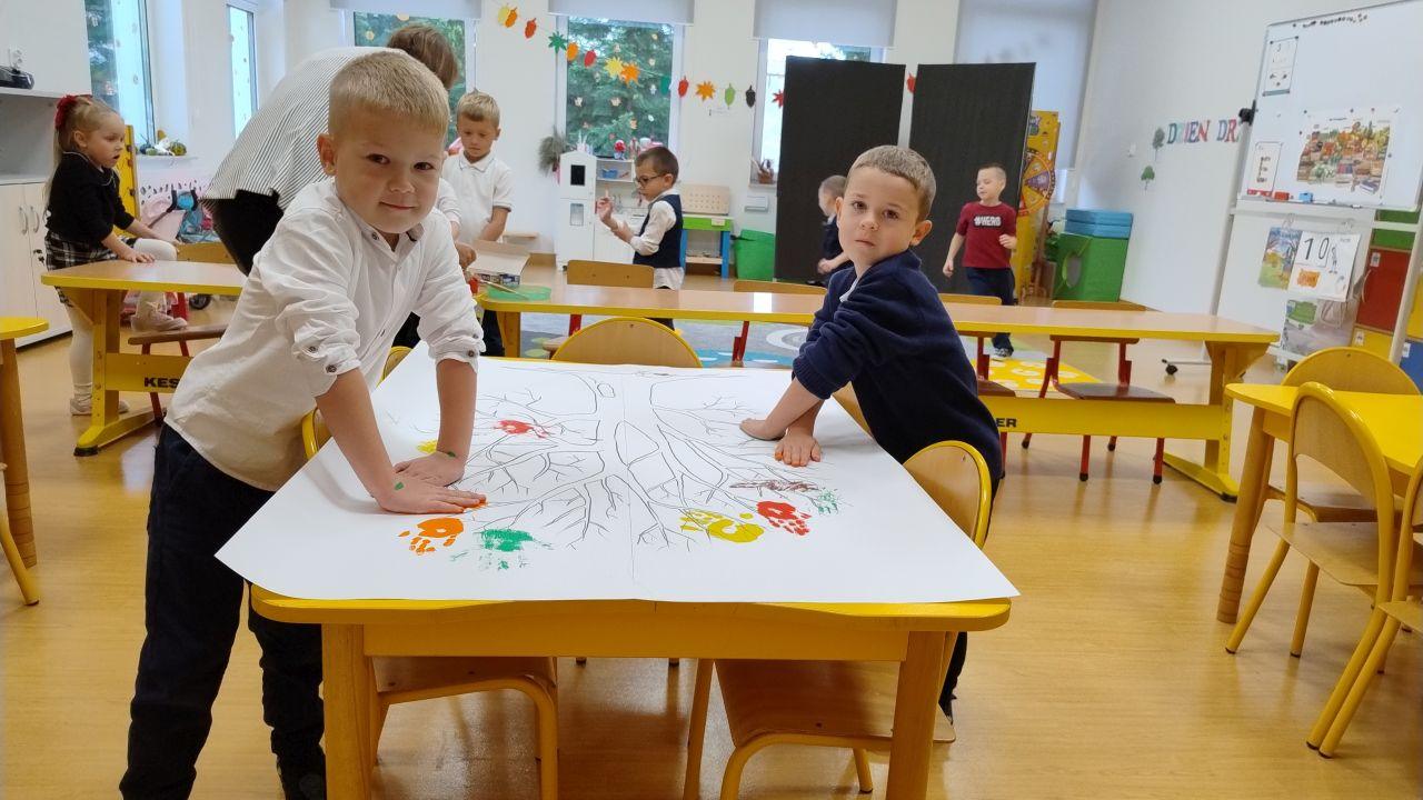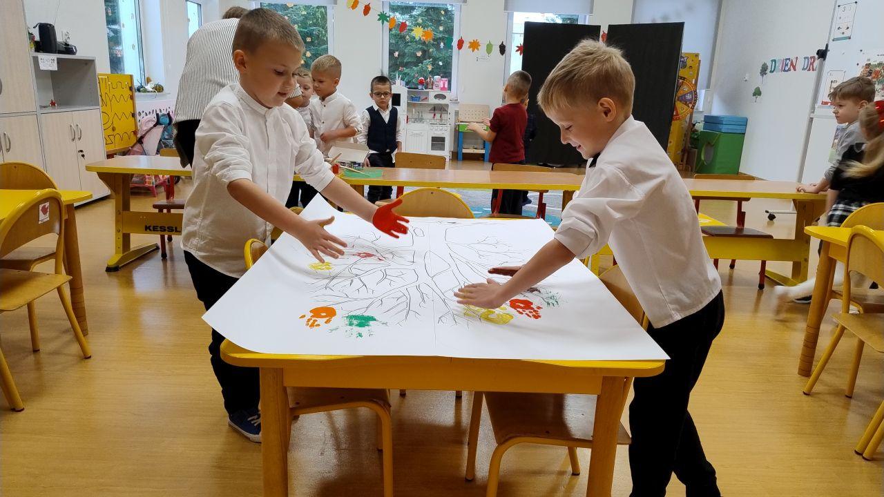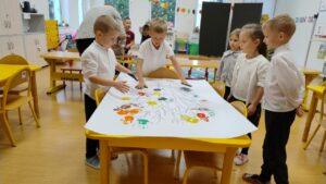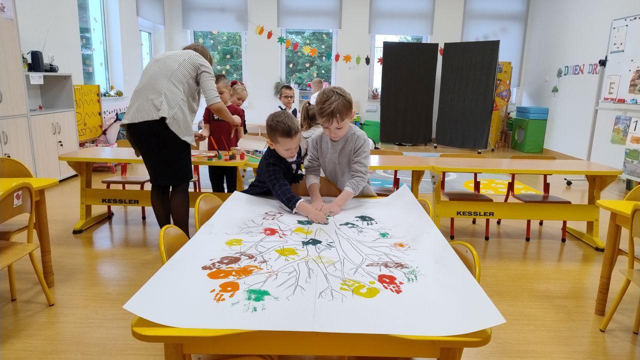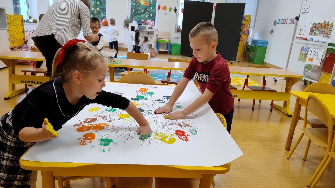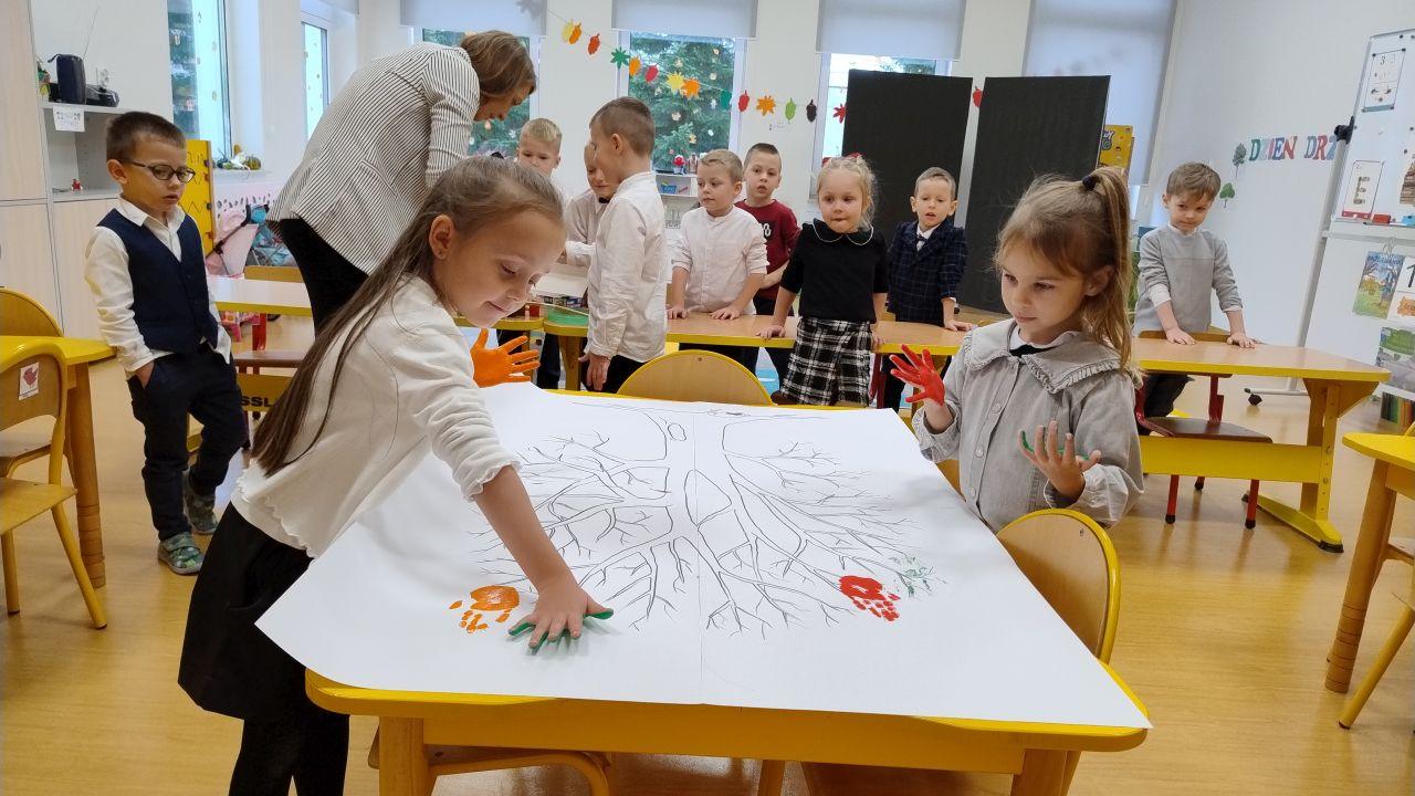 • wykonały kreatywną pracę plastyczno-techniczną: duże jesienne drzewo, którego liście powstały z odbitych, kolorowych rączek dzieci.