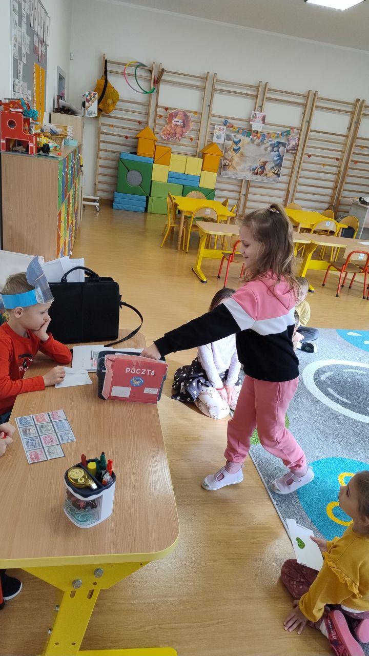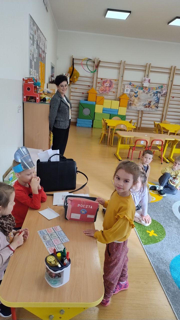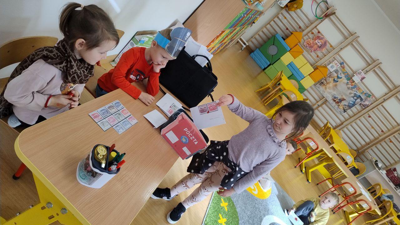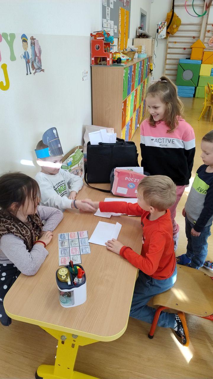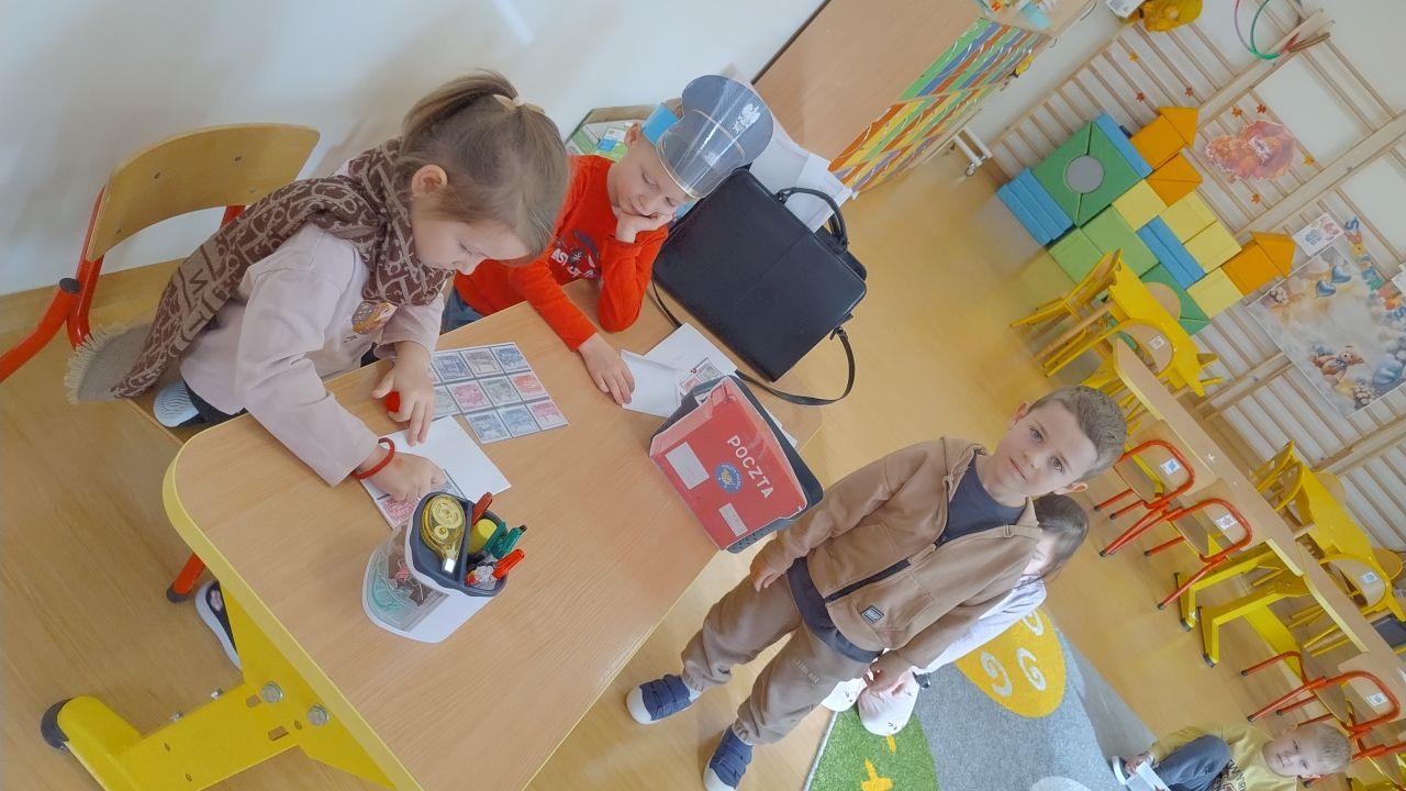 W sali przedszkolnej zaaranżowaliśmy prawdziwy mini-urząd pocztowy! Była pracownica poczty, która przybijała pieczątki, był listonosz odbierający przesyłki, a dzieci wrzucały swoje listy do skrzynki pocztowej. Nie zabrakło również scenki wypłaty emerytury -Pan Listonosz zadbał o każdy szczegół!