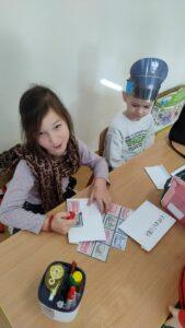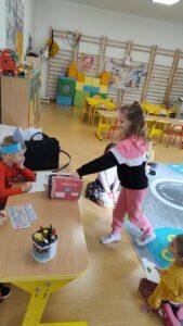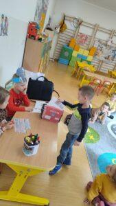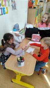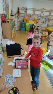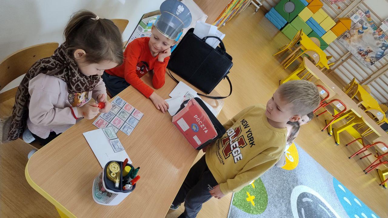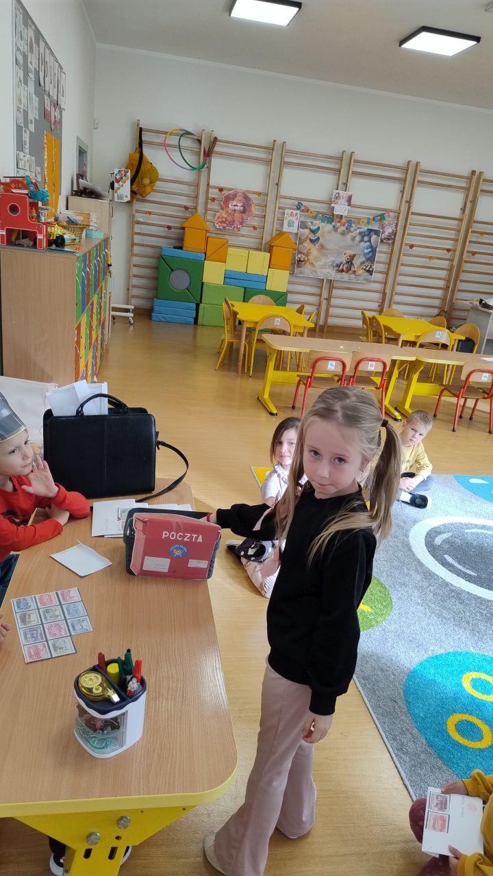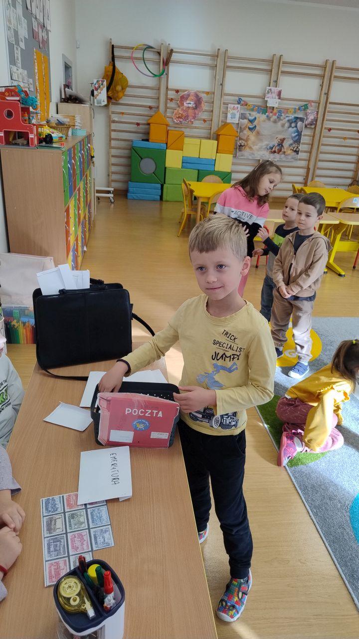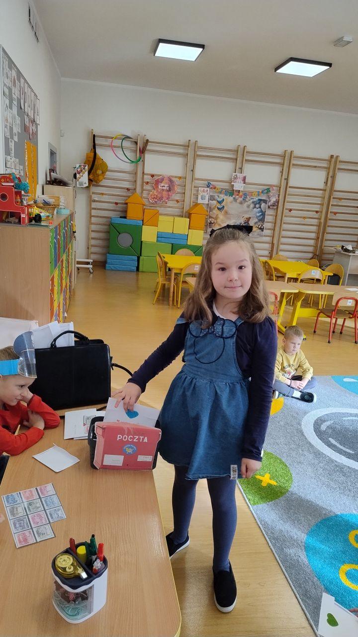 W sali przedszkolnej zaaranżowaliśmy prawdziwy mini-urząd pocztowy! Była pracownica poczty, która przybijała pieczątki, był listonosz odbierający przesyłki, a dzieci wrzucały swoje listy do skrzynki pocztowej. Nie zabrakło również scenki wypłaty emerytury -Pan Listonosz zadbał o każdy szczegół!
