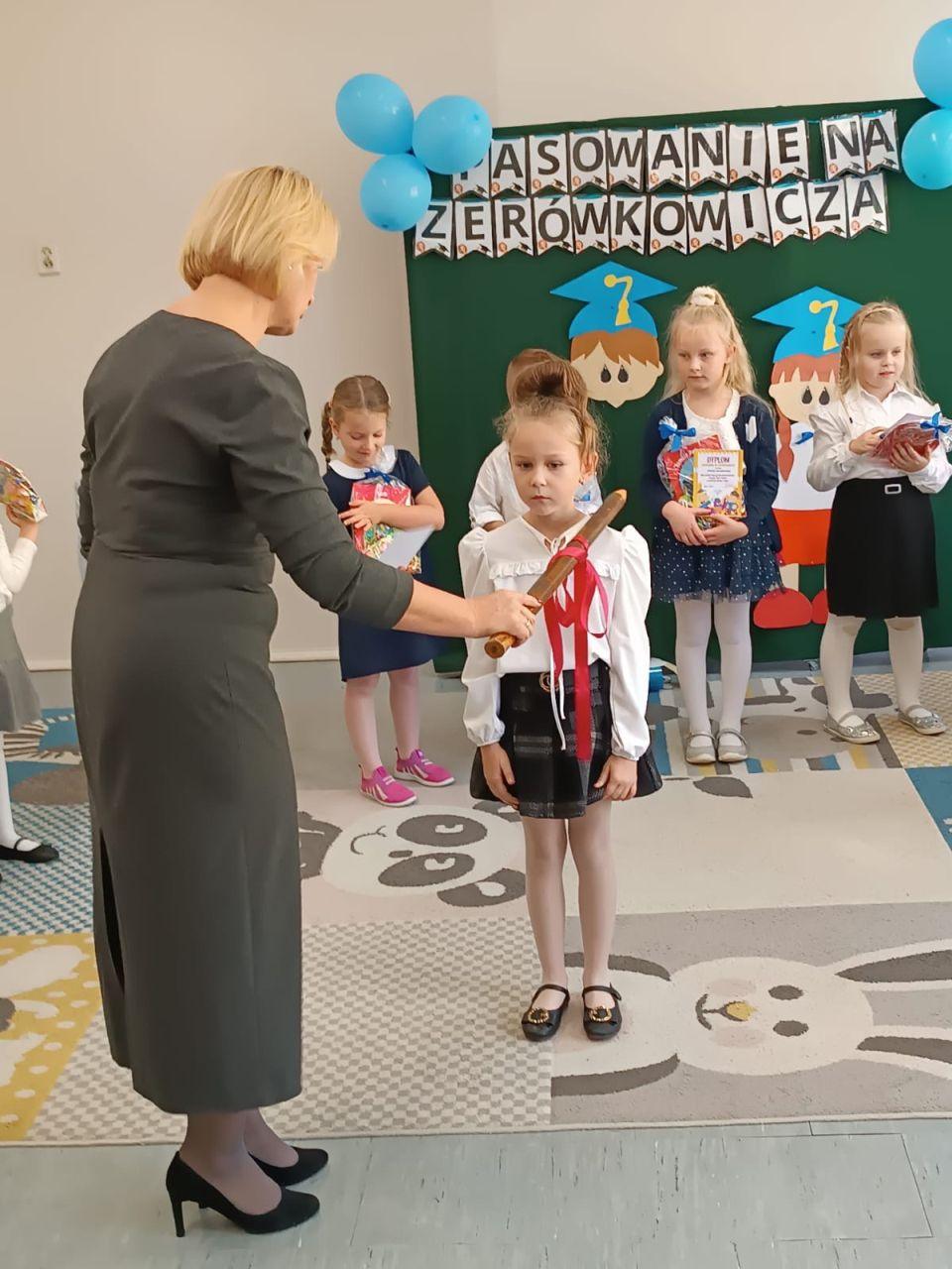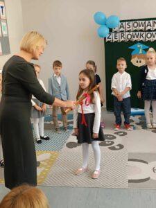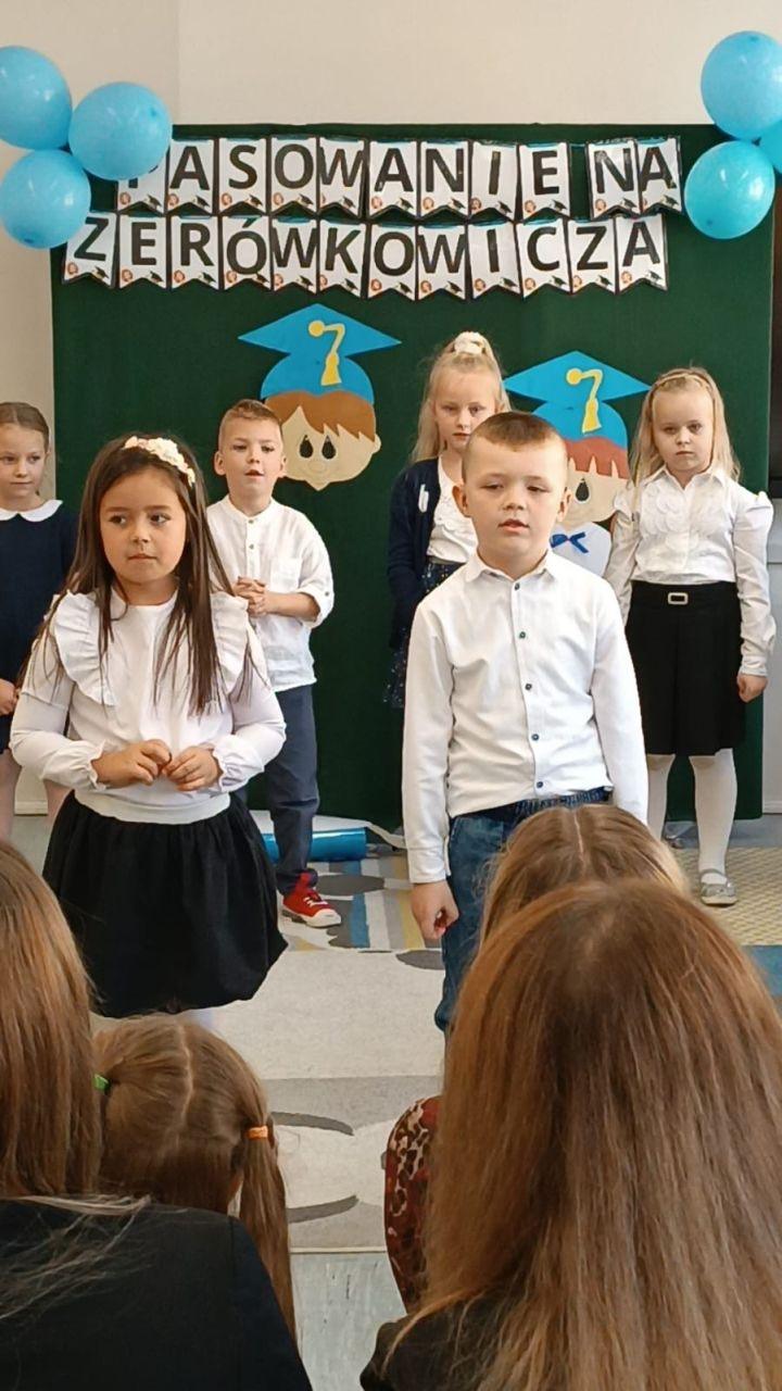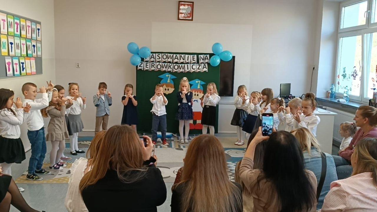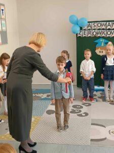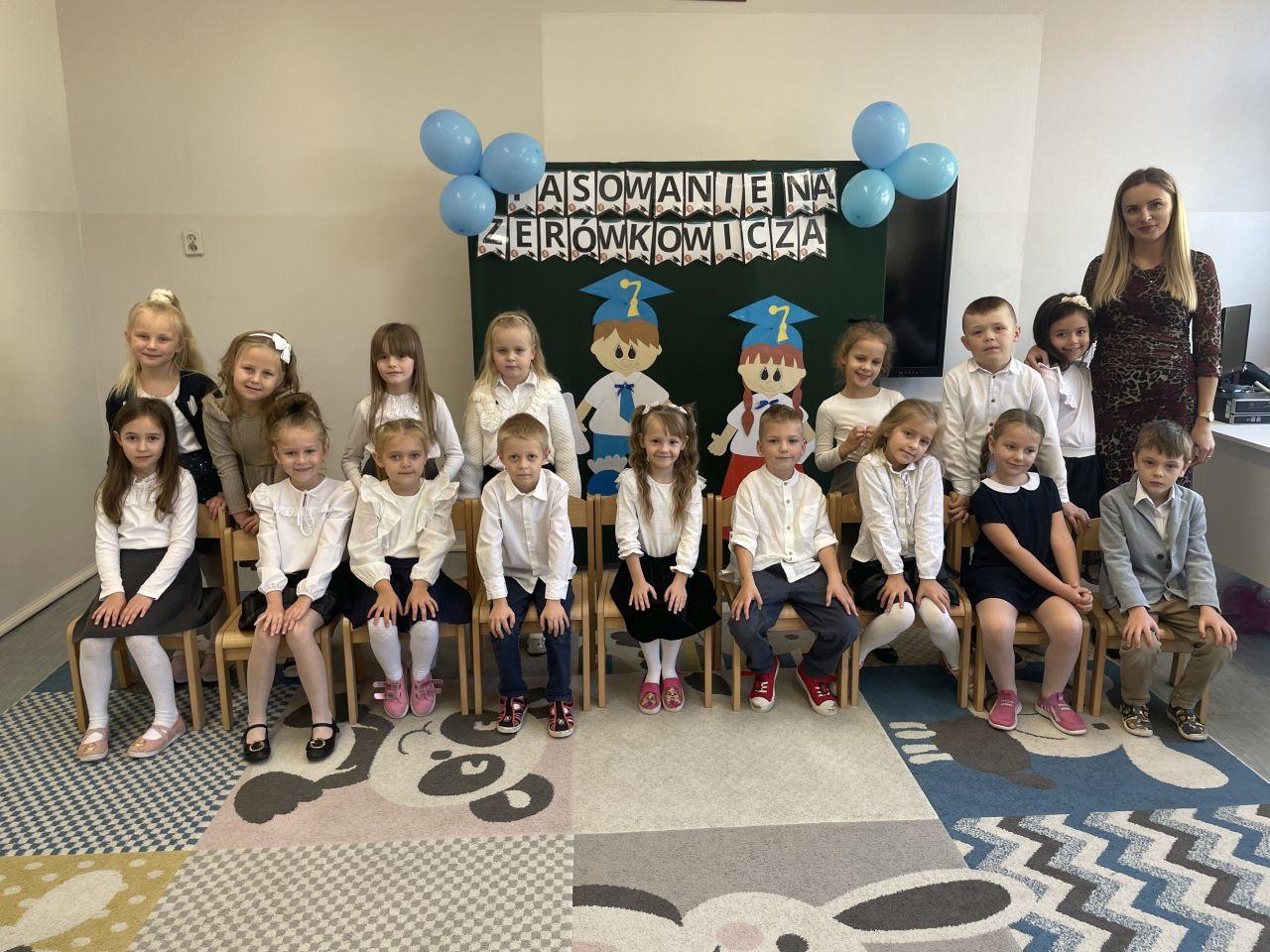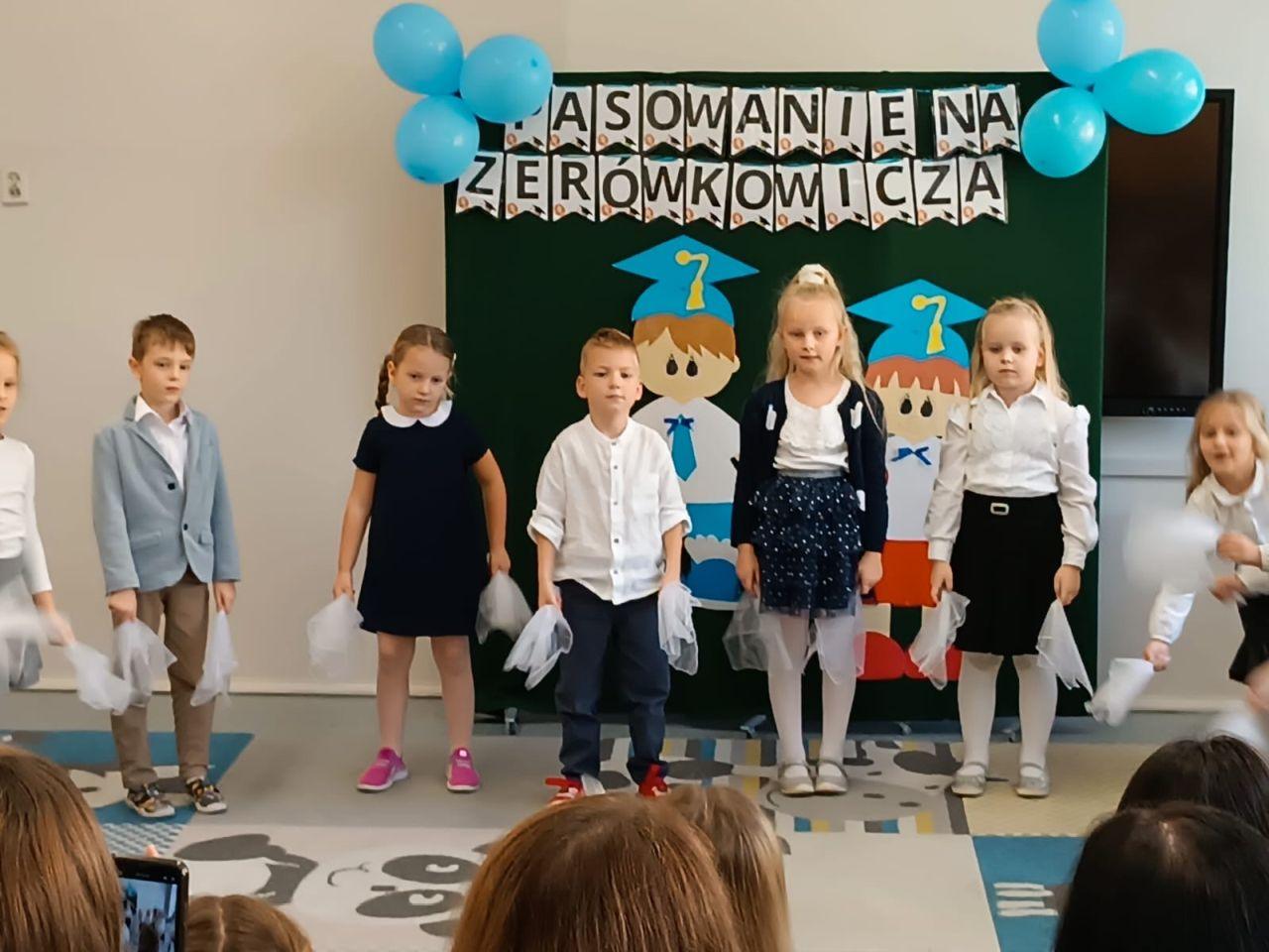 Dzień 24 października 2024 roku pozostanie na długo w pamięci dzieci uczęszczających do zerówki. Właśnie tego dnia w gronie najbliższych odbyło się Pasowanie na Zerówkowicza. Dzieci z grupy 0B zaprezentowały swoje umiejętności recytatorskie, wokalne oraz taneczne. Po części artystycznej Pani Dyrektor Małgorzata Trelka oraz Pani Wicedyrektor Agnieszka Czerwińska dokonały uroczystego Pasowania na Zerówkowicza. Dzieci obiecały, że będą dbały o dobre imię swojej Grupy i Szkoły, a swoim zachowaniem będą sprawiać radość rodzicom