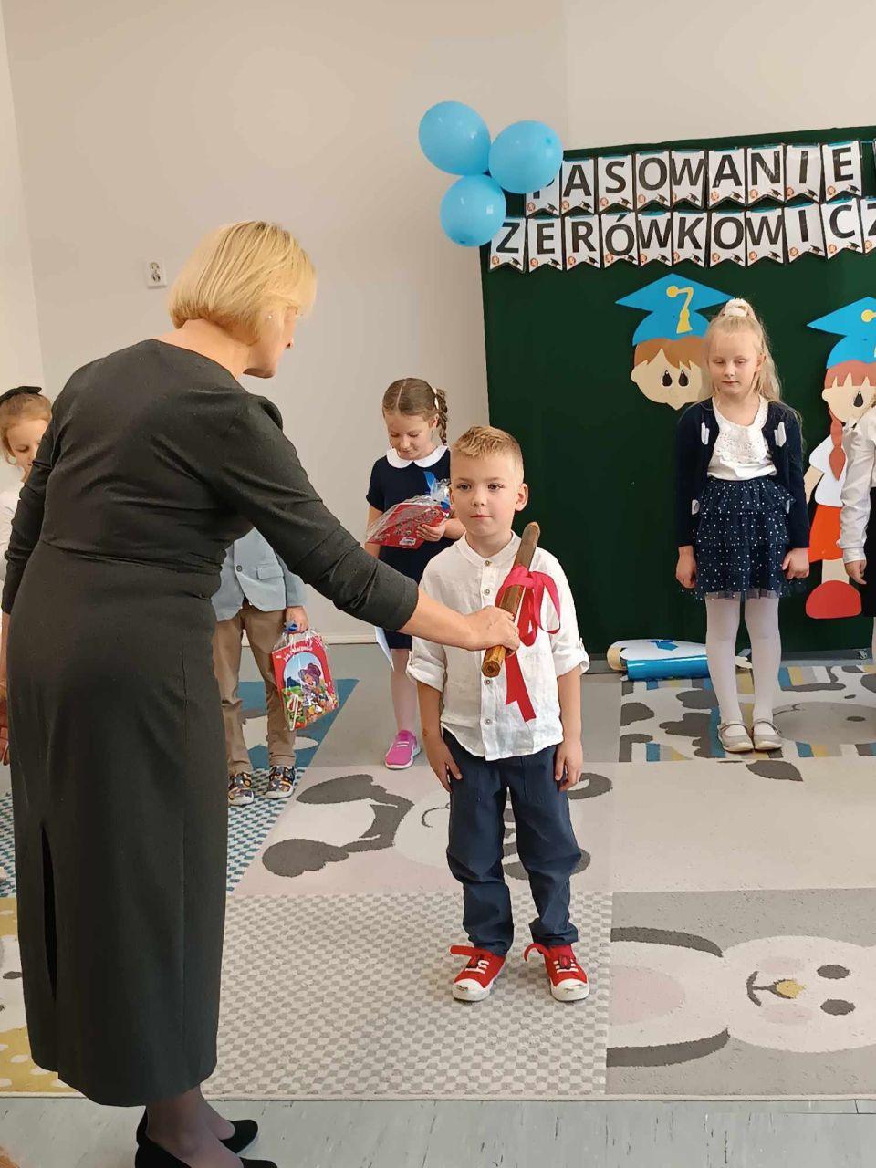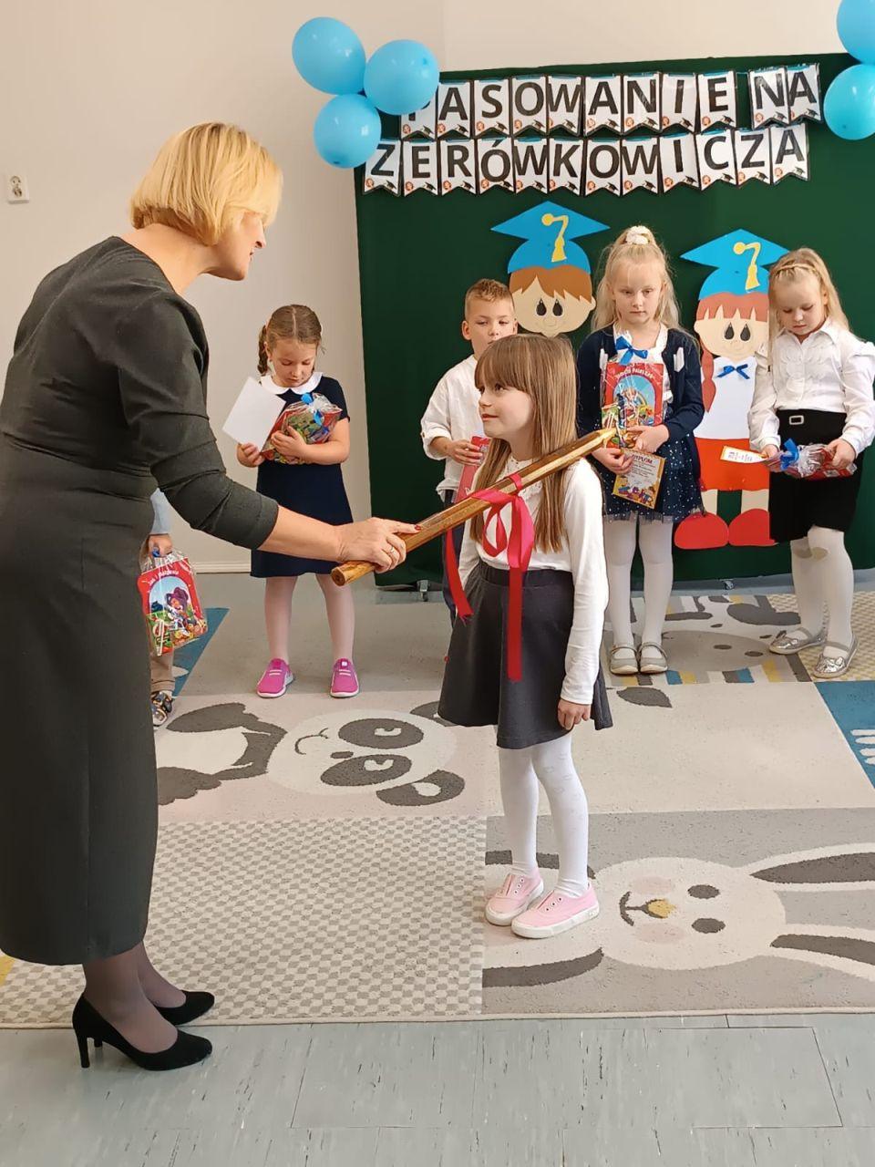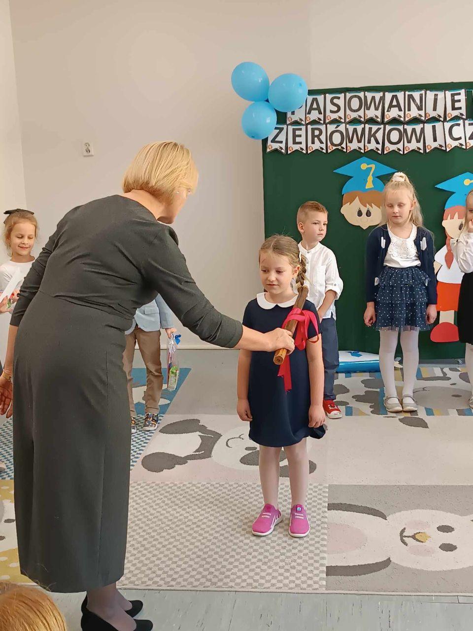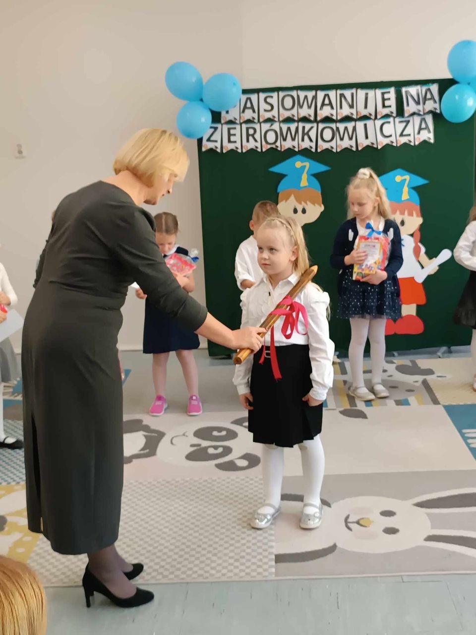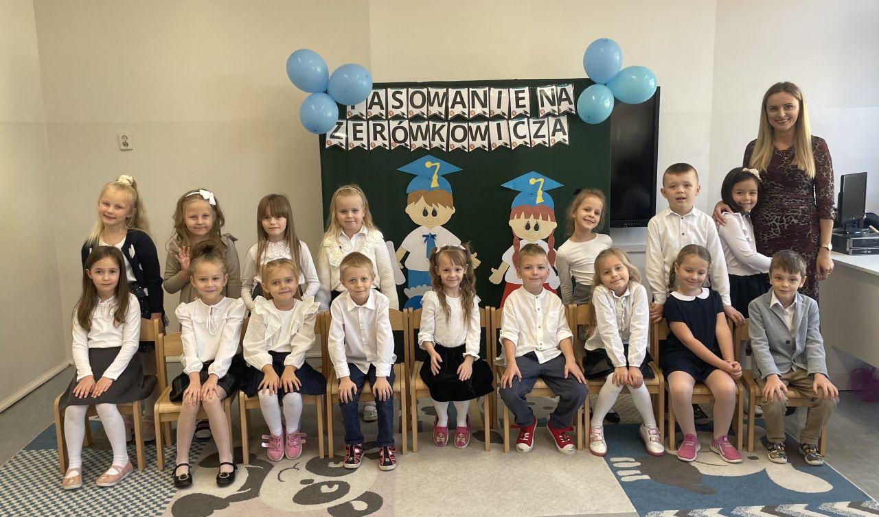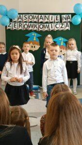 Dzień 24 października 2024 roku pozostanie na długo w pamięci dzieci uczęszczających do zerówki. Właśnie tego dnia w gronie najbliższych odbyło się Pasowanie na Zerówkowicza. Dzieci z grupy 0B zaprezentowały swoje umiejętności recytatorskie, wokalne oraz taneczne. Po części artystycznej Pani Dyrektor Małgorzata Trelka oraz Pani Wicedyrektor Agnieszka Czerwińska dokonały uroczystego Pasowania na Zerówkowicza. Dzieci obiecały, że będą dbały o dobre imię swojej Grupy i Szkoły, a swoim zachowaniem będą sprawiać radość rodzicom