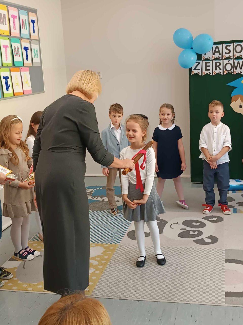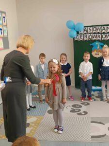 Dzień 24 października 2024 roku pozostanie na długo w pamięci dzieci uczęszczających do zerówki. Właśnie tego dnia w gronie najbliższych odbyło się Pasowanie na Zerówkowicza. Dzieci z grupy 0B zaprezentowały swoje umiejętności recytatorskie, wokalne oraz taneczne. Po części artystycznej Pani Dyrektor Małgorzata Trelka oraz  Pani Wicedyrektor Agnieszka Czerwińska dokonały uroczystego Pasowania na Zerówkowicza. Dzieci obiecały, że będą dbały o dobre imię swojej Grupy i Szkoły, a swoim zachowaniem będą sprawiać radość rodzicom