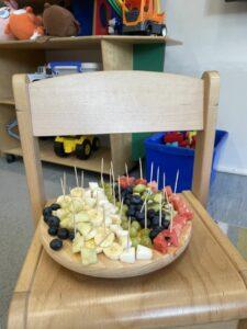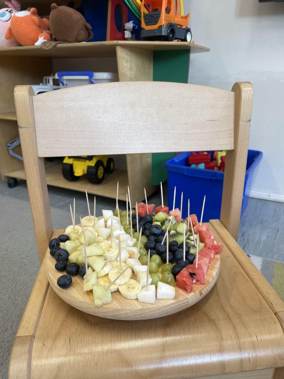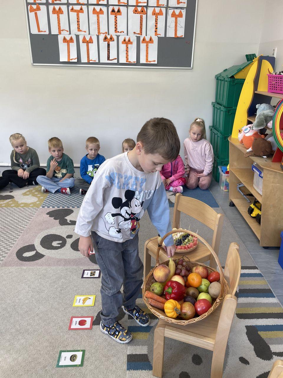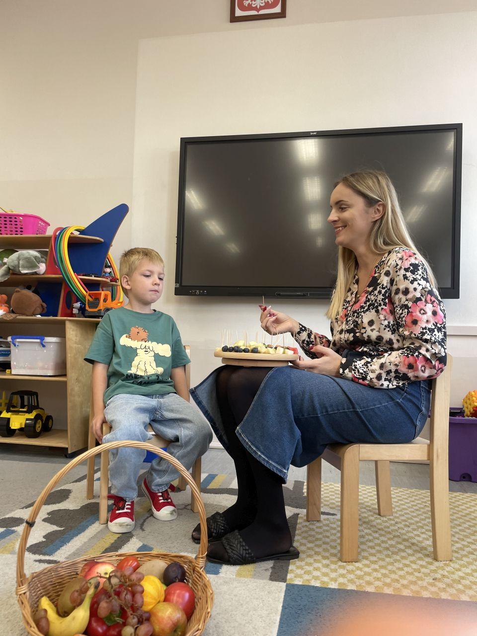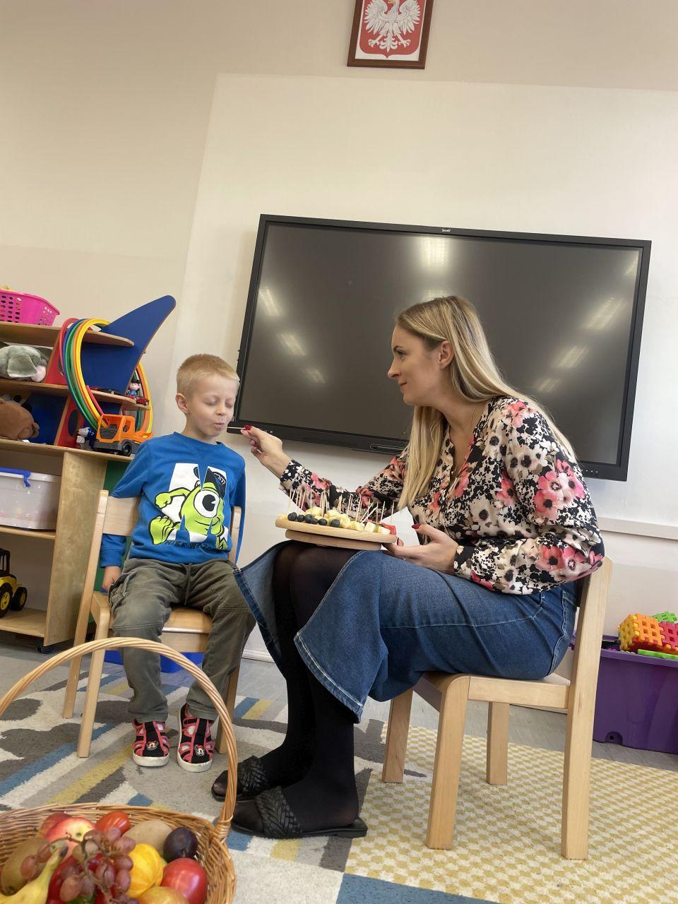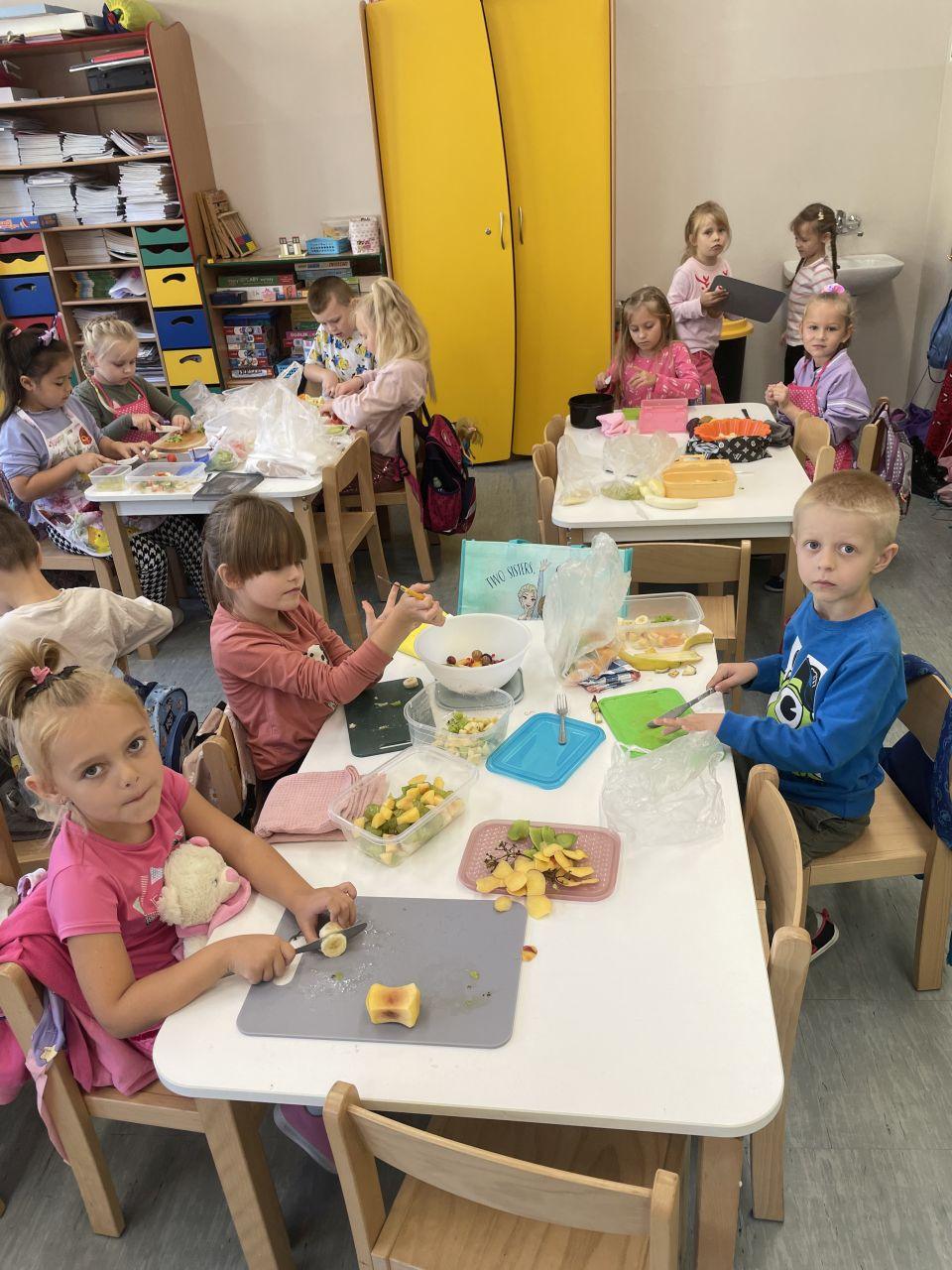 Dzieci z grupy 0B na zajęciach przygotowały pyszną i zdrową sałatkę owocową. Były jabłka, gruszki, banany, śliwki, brzoskwinie, truskawki, borówki, kiwi, winogrona i wiele innych owoców. Zajęcia kulinarne poprzedziła zabawa w rozpoznawanie owoców. Dzieci